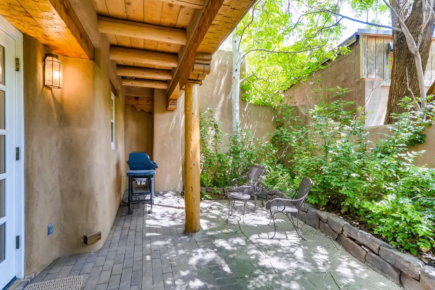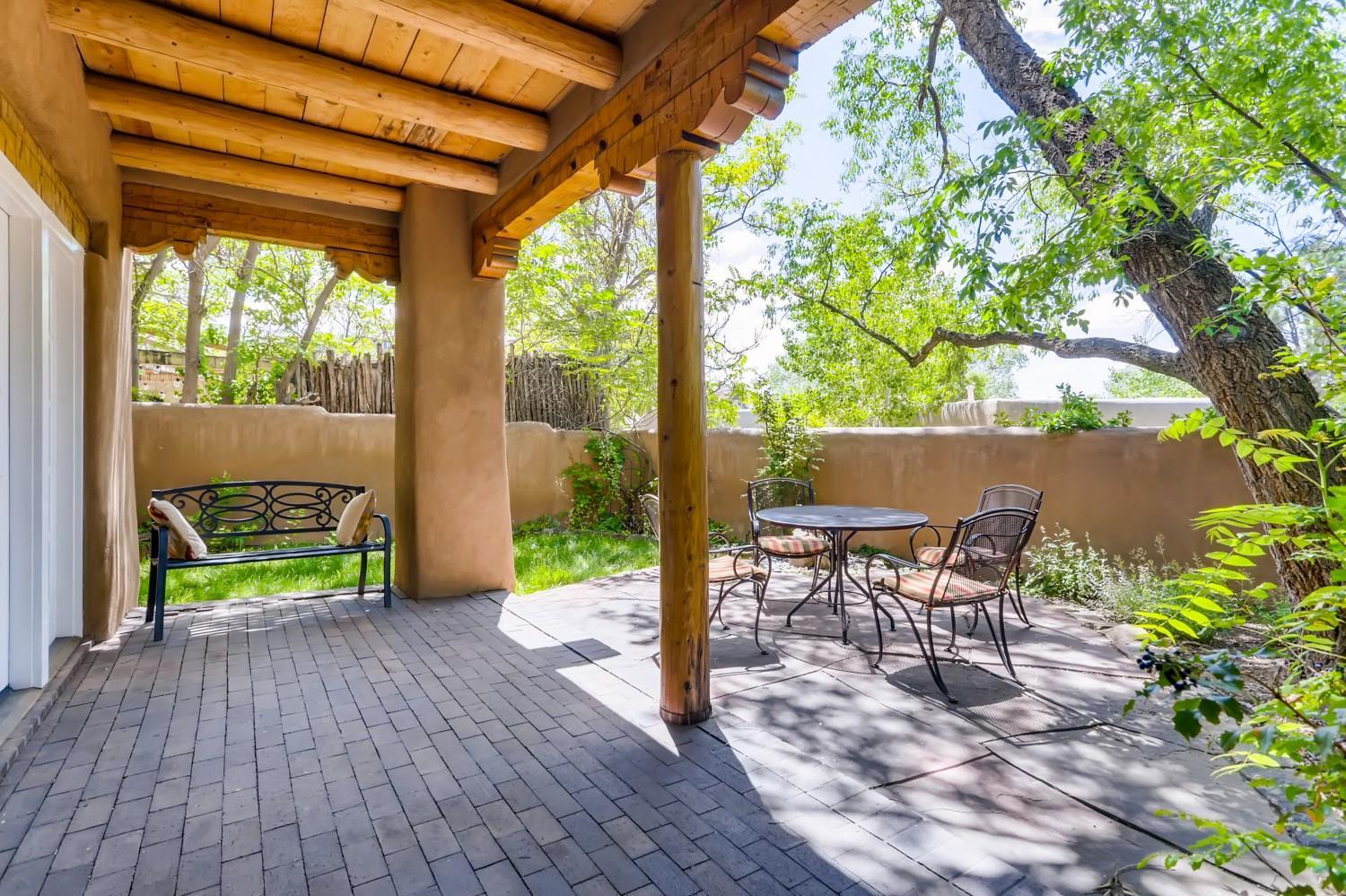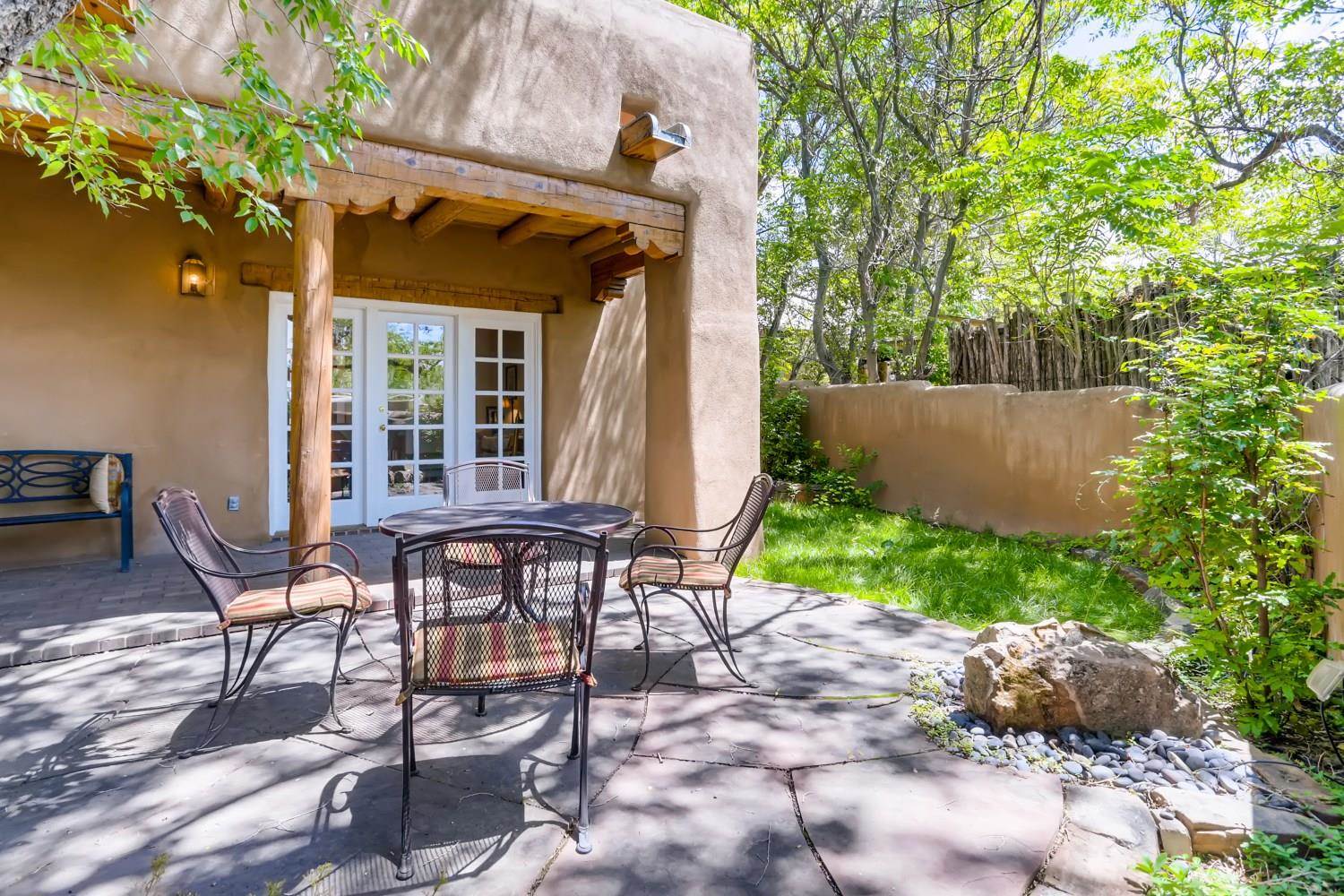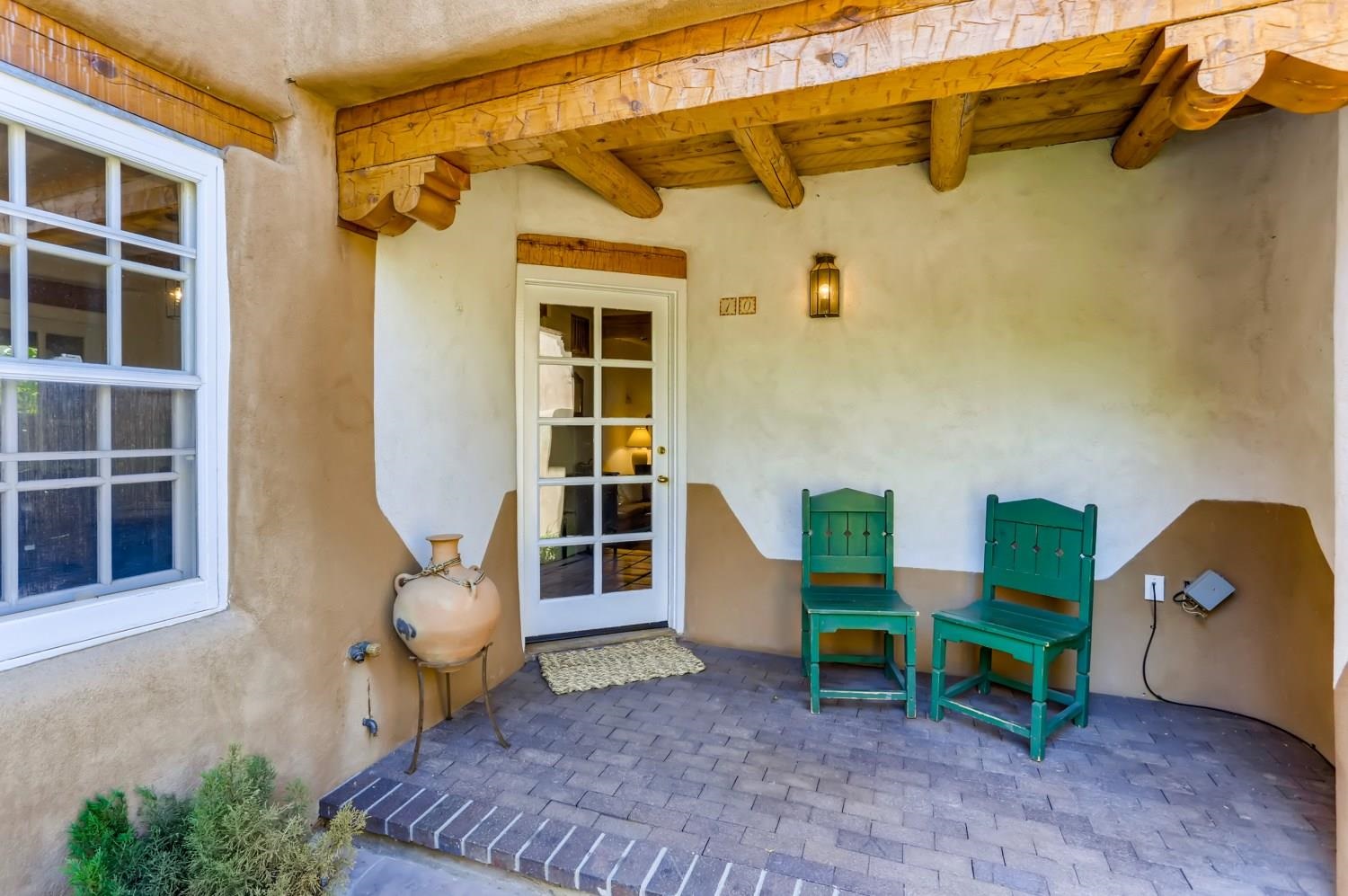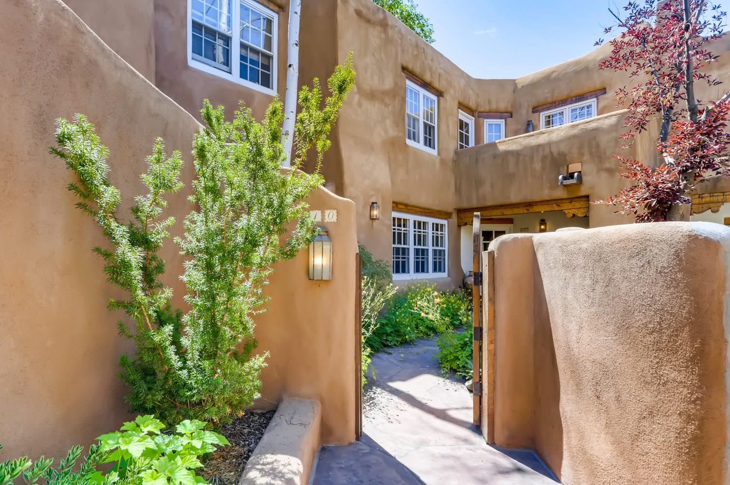 Enter Unit 10 at Campanilla Compound through a gated, landscaped entry garden. Inside find all the features that have long defined gracious Santa Fe homes: Viga ceilings through out, kiva fireplaces in both bedrooms and in the living room, Saltillo tile floors, Talavera in the kitchen and all three baths. French doors open up to a private and spacious back yard. And located in a quiet community just blocks from the Plaza! Intensely managed, including an established and successful rental program. All the best features in a vacation home at one-fourth of the cost. Quarter ownership interest in Unit 10.