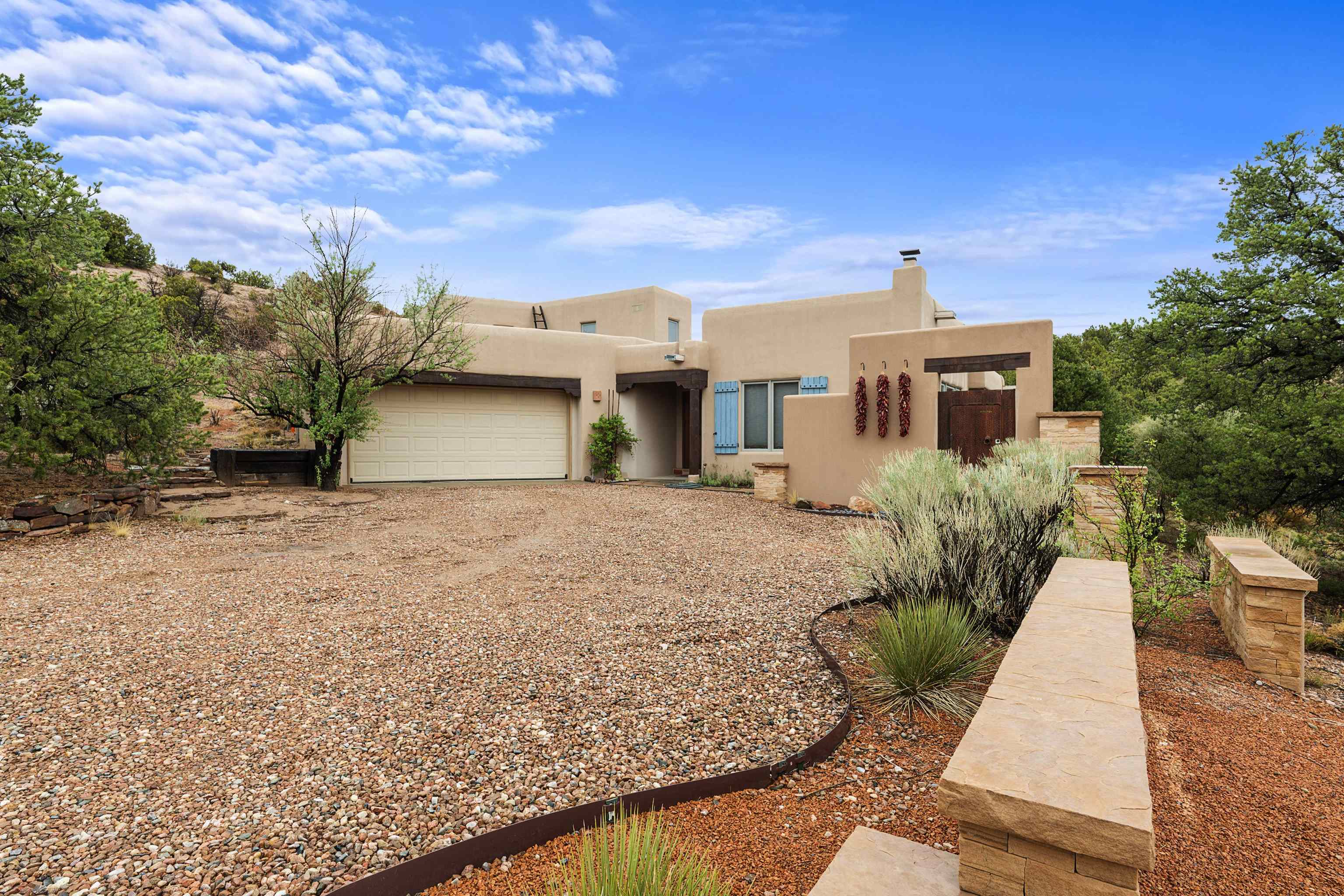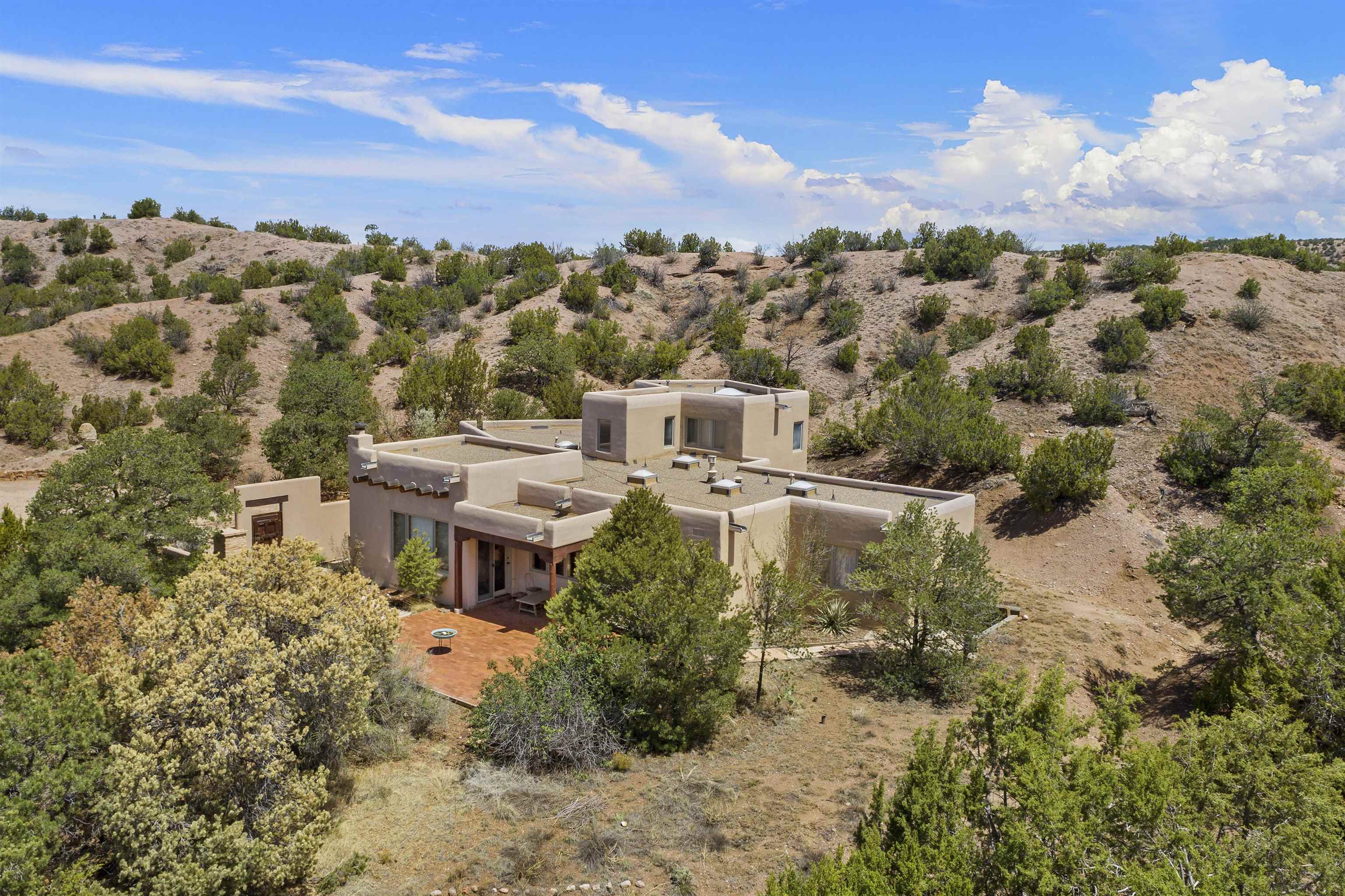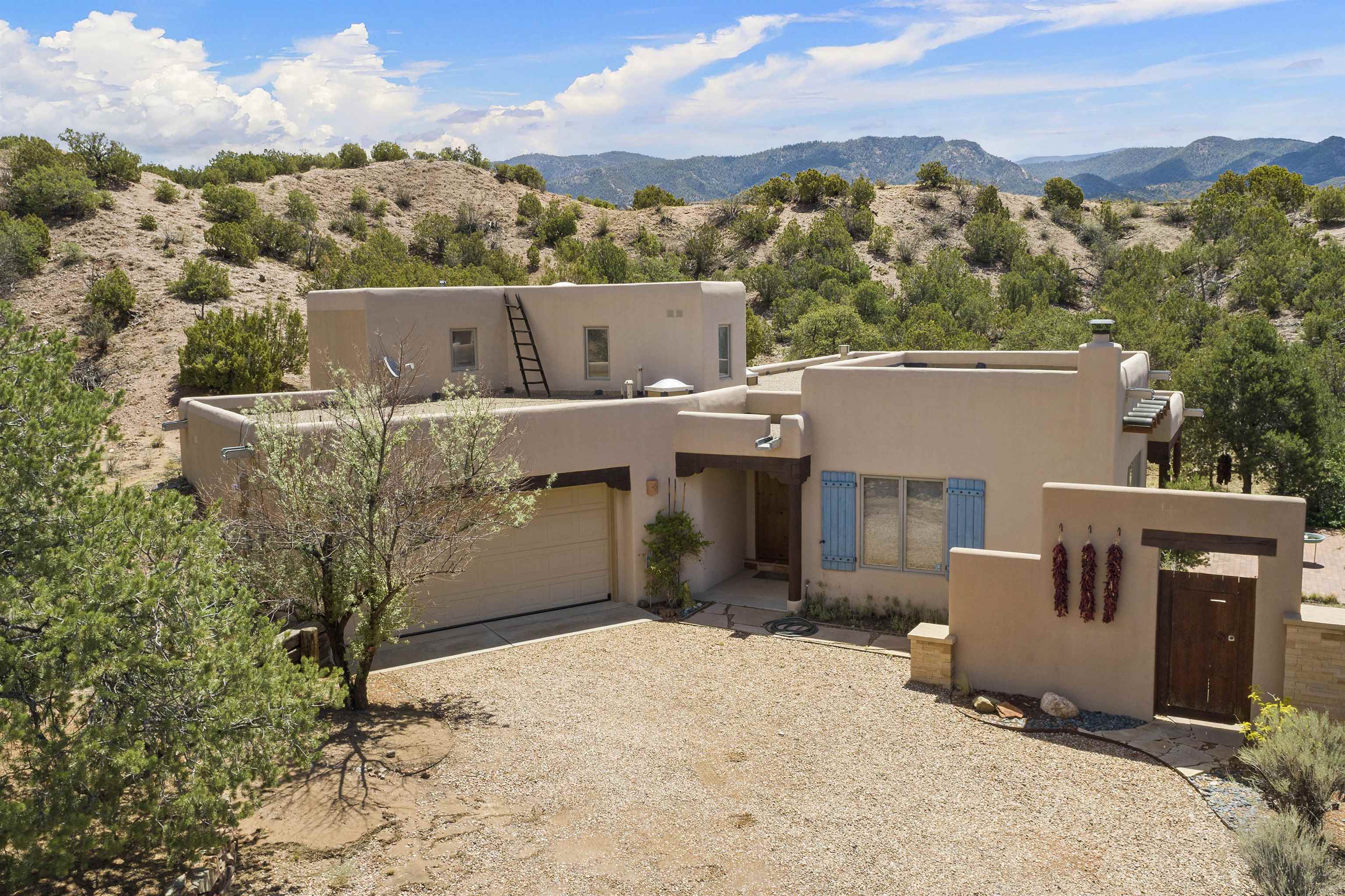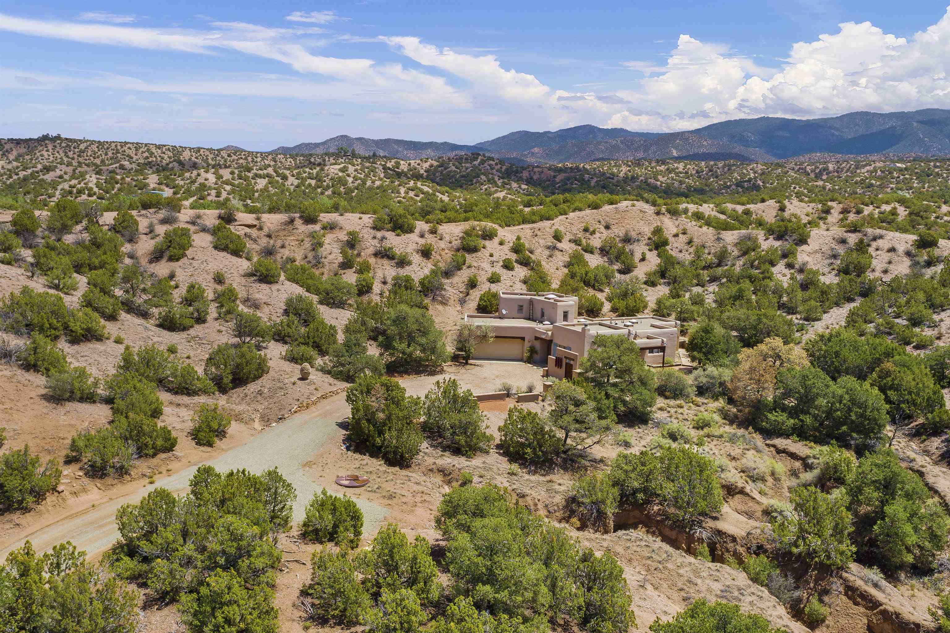 Absolutely charming Los Caminitos property set in the magical rolling hills of Tesuque. The open floor plan allows for ease of entertaining and sweeping views from the living areas. The primary suite is located upstairs from the living areas and guest bedrooms, and offers an elevated view to the mountains. The downstairs guest suite features its own private entry, allowing for privacy and convenience. An additional guest bedroom or office/den allows for additional flexible living. Traditional Santa Fe style and colorful touches abound, all set on 7+ private acres. Los Caminitos offers residents a community clubhouse, pool, and tennis courts, and you are moments away from the Four Seasons Resort and 12 minutes to downtown Santa Fe.
