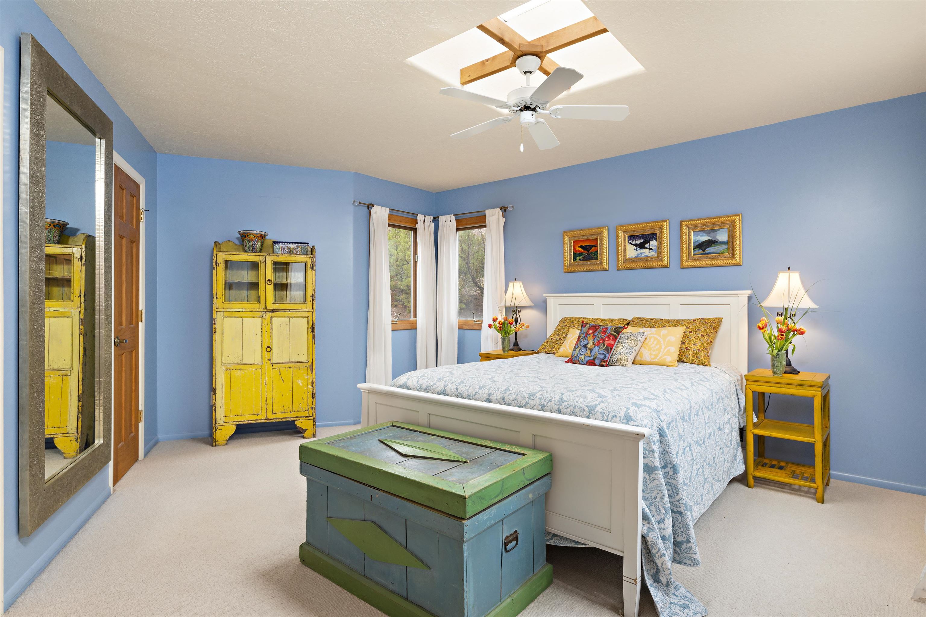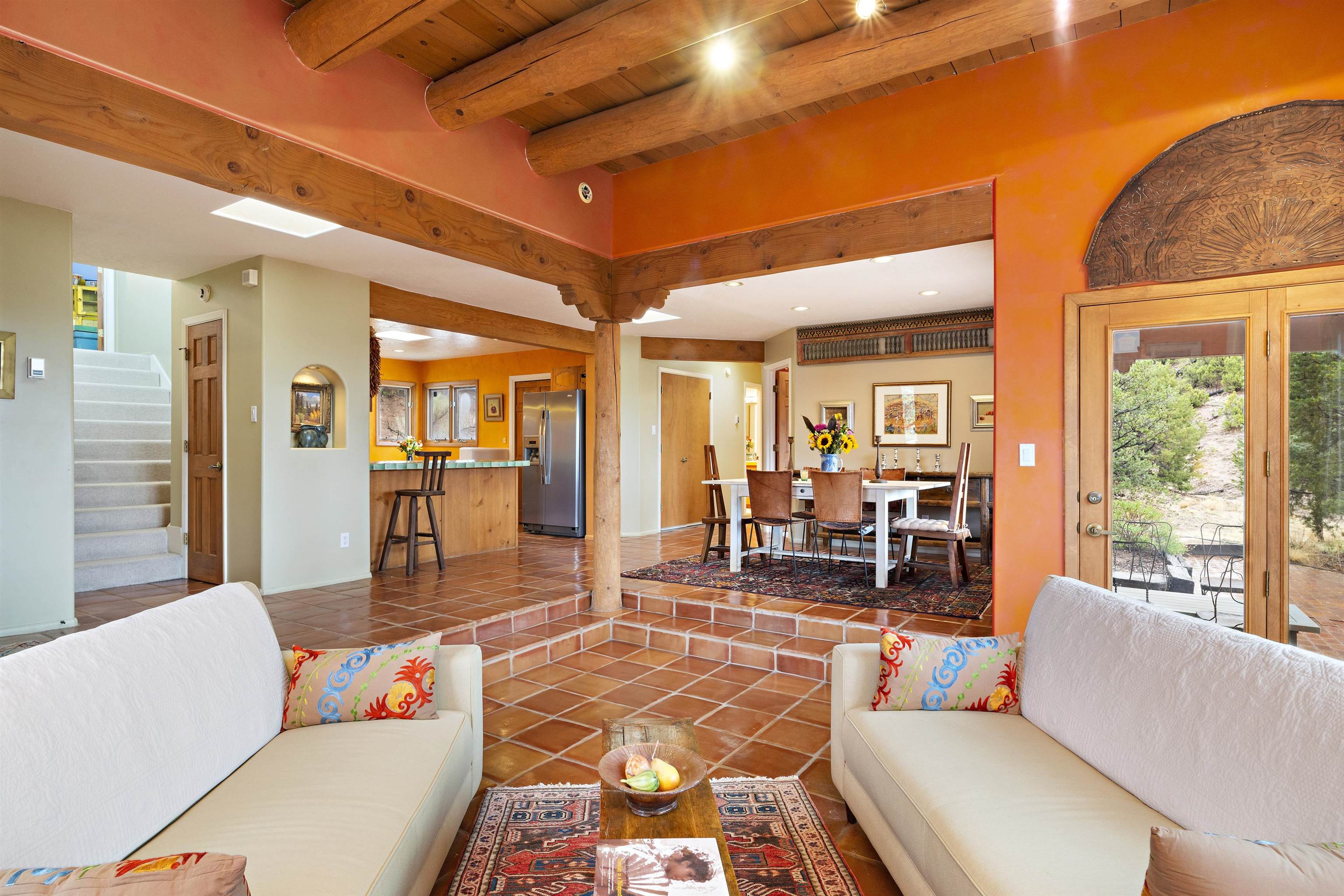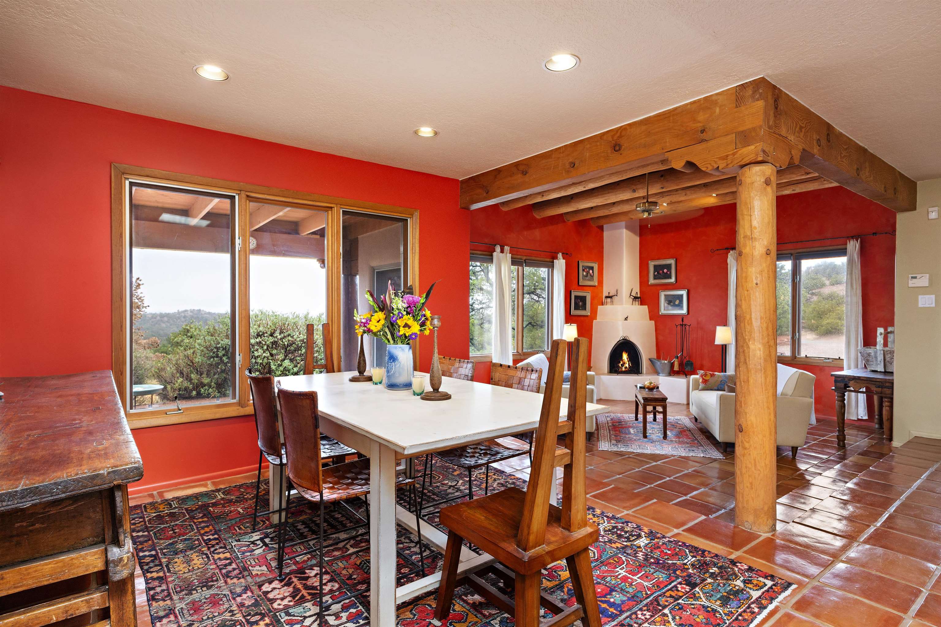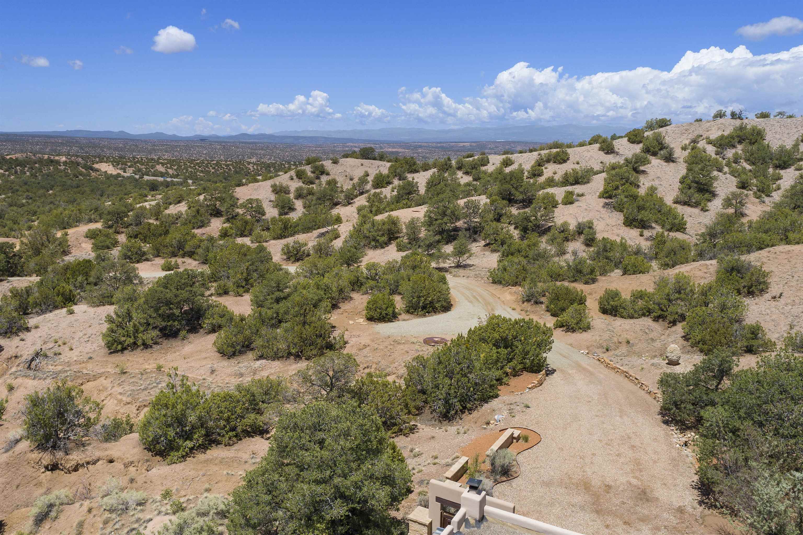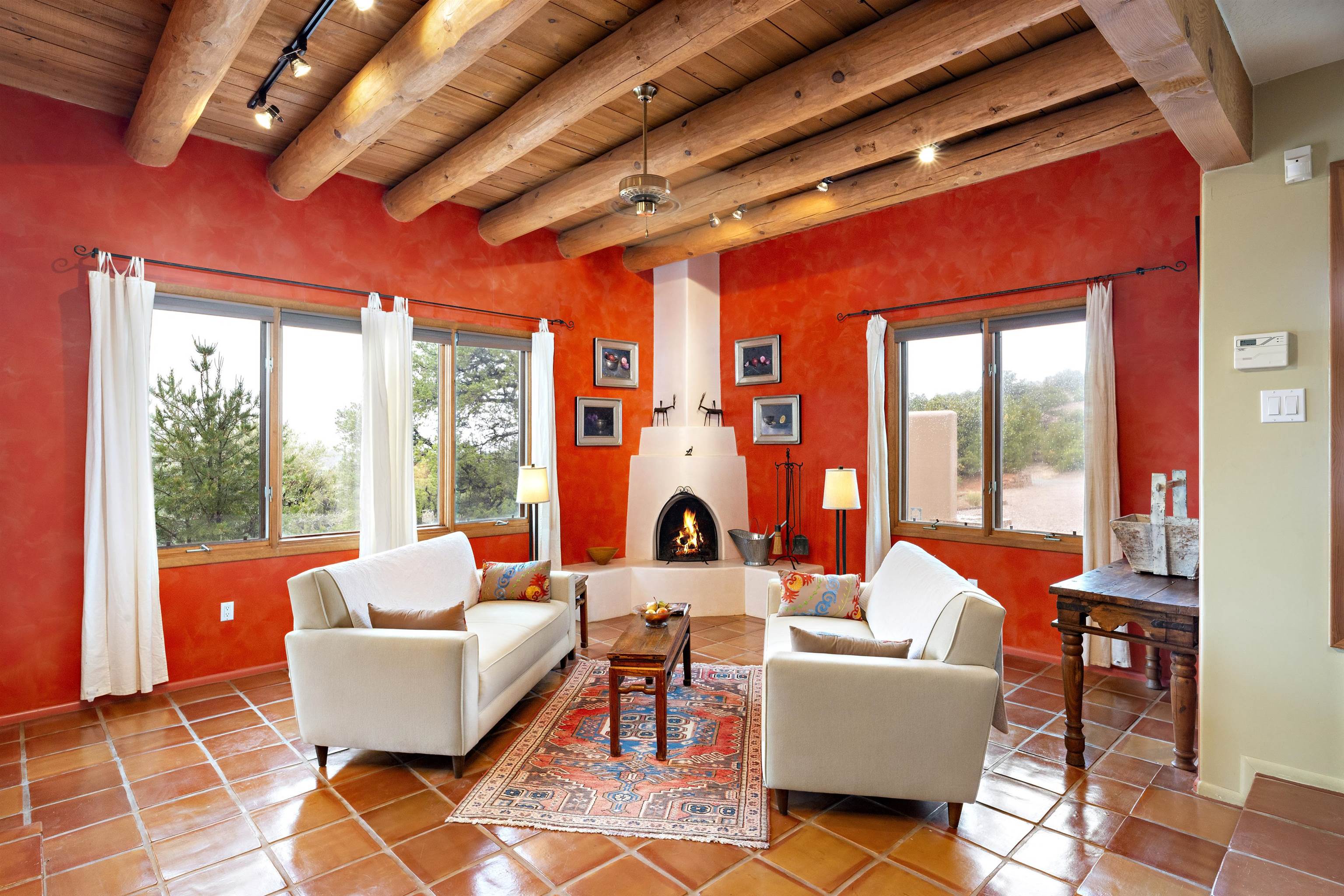 Absolutely charming Los Caminitos property set in the magical rolling hills of Tesuque. The open floor plan allows for ease of entertaining and sweeping views from the living areas. The primary suite is located upstairs from the living areas and guest bedrooms, and offers an elevated view to the mountains. The downstairs guest suite features its own private entry, allowing for privacy and convenience. An additional guest bedroom or office/den allows for additional flexible living. Traditional Santa Fe style and colorful touches abound, all set on 7+ private acres. Los Caminitos offers residents a community clubhouse, pool, and tennis courts, and you are moments away from the Four Seasons Resort and 12 minutes to downtown Santa Fe.
