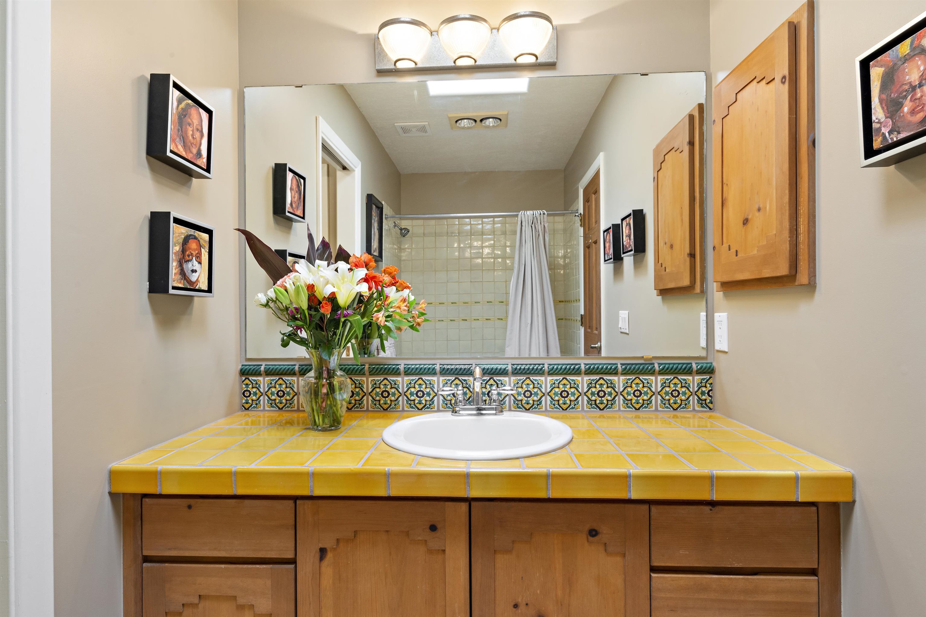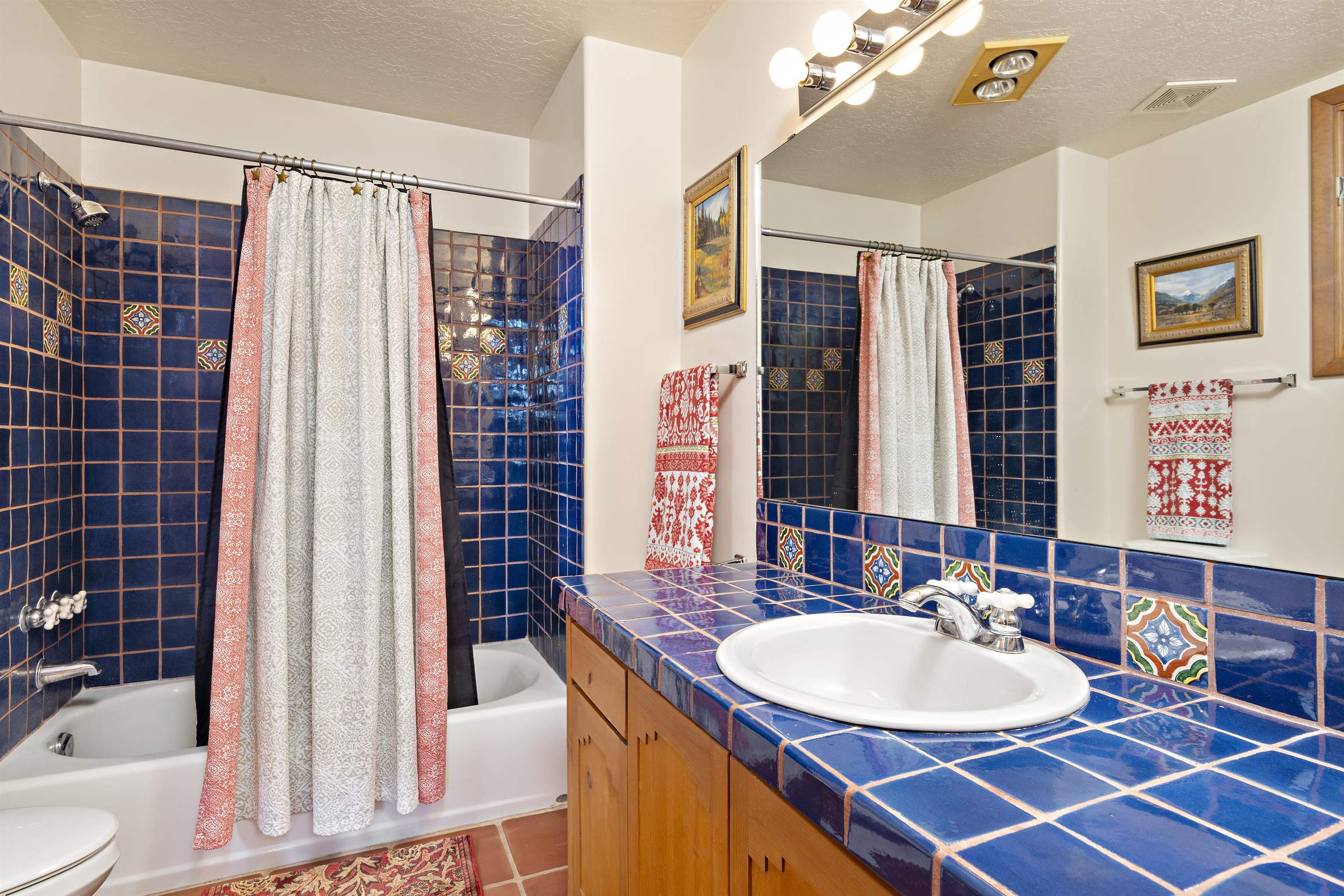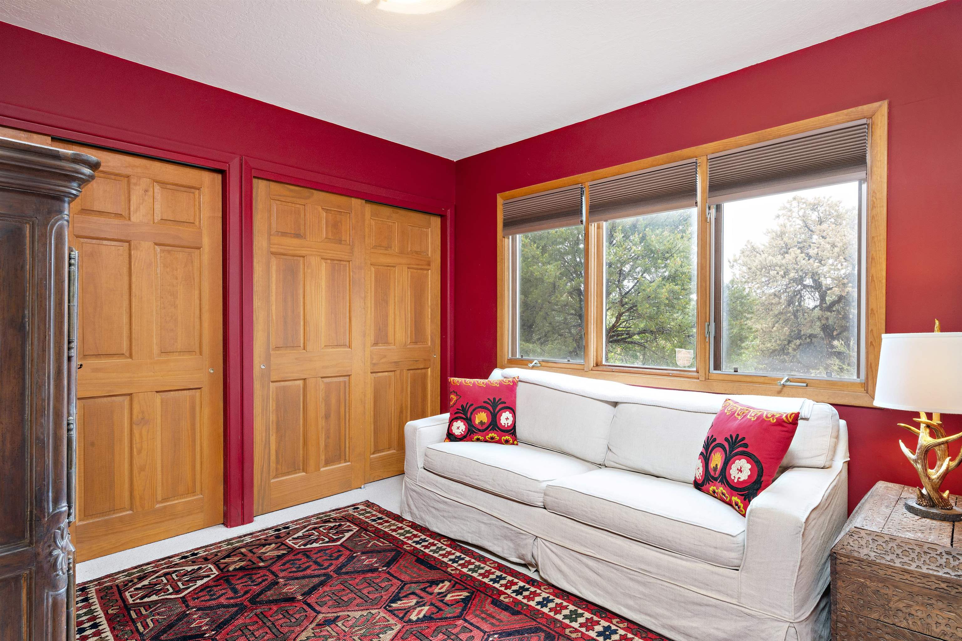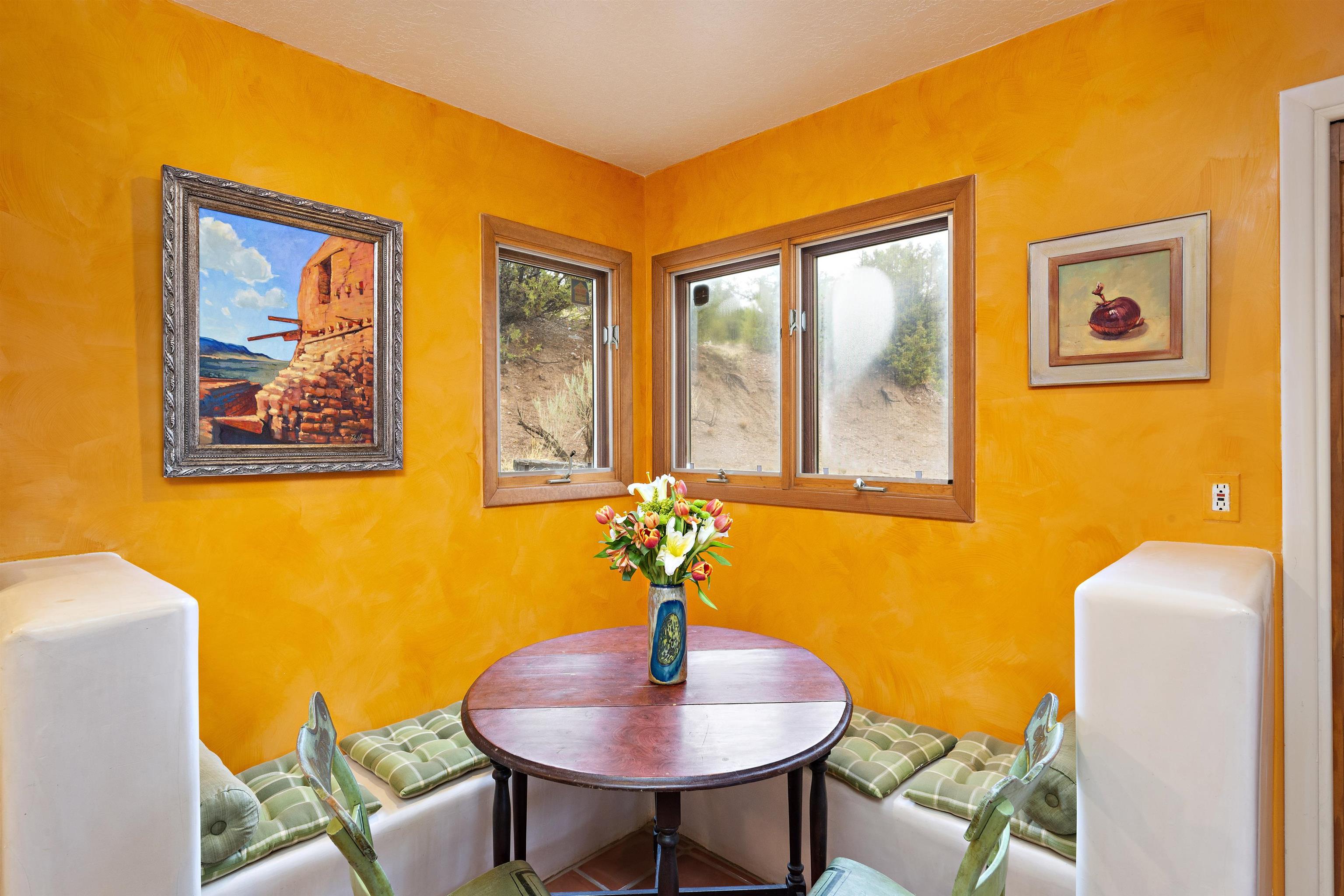 Absolutely charming Los Caminitos property set in the magical rolling hills of Tesuque. The open floor plan allows for ease of entertaining and sweeping views from the living areas. The primary suite is located upstairs from the living areas and guest bedrooms, and offers an elevated view to the mountains. The downstairs guest suite features its own private entry, allowing for privacy and convenience. An additional guest bedroom or office/den allows for additional flexible living. Traditional Santa Fe style and colorful touches abound, all set on 7+ private acres. Los Caminitos offers residents a community clubhouse, pool, and tennis courts, and you are moments away from the Four Seasons Resort and 12 minutes to downtown Santa Fe.