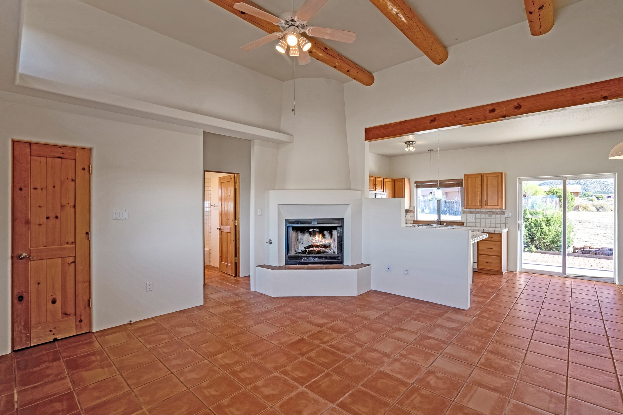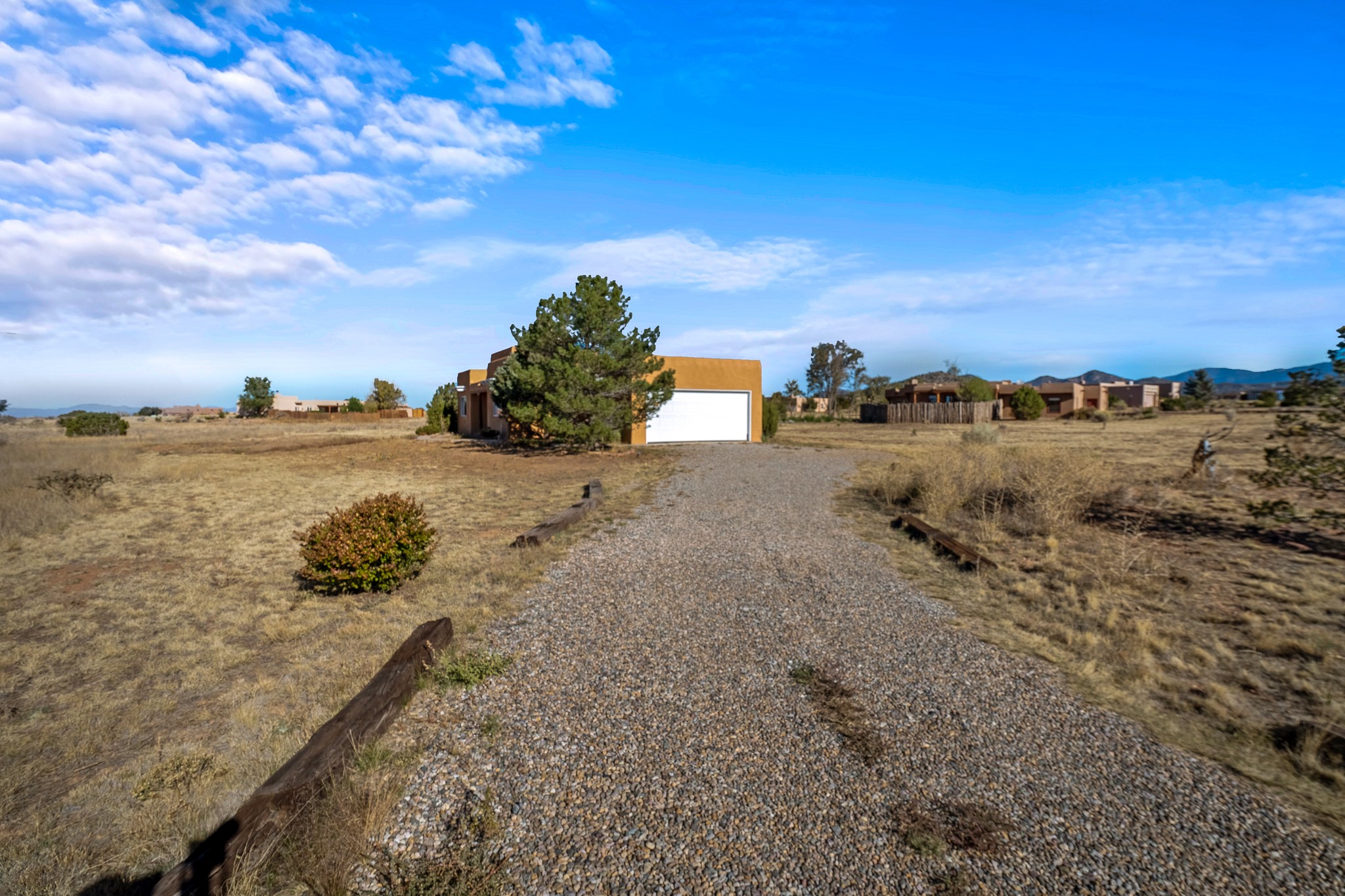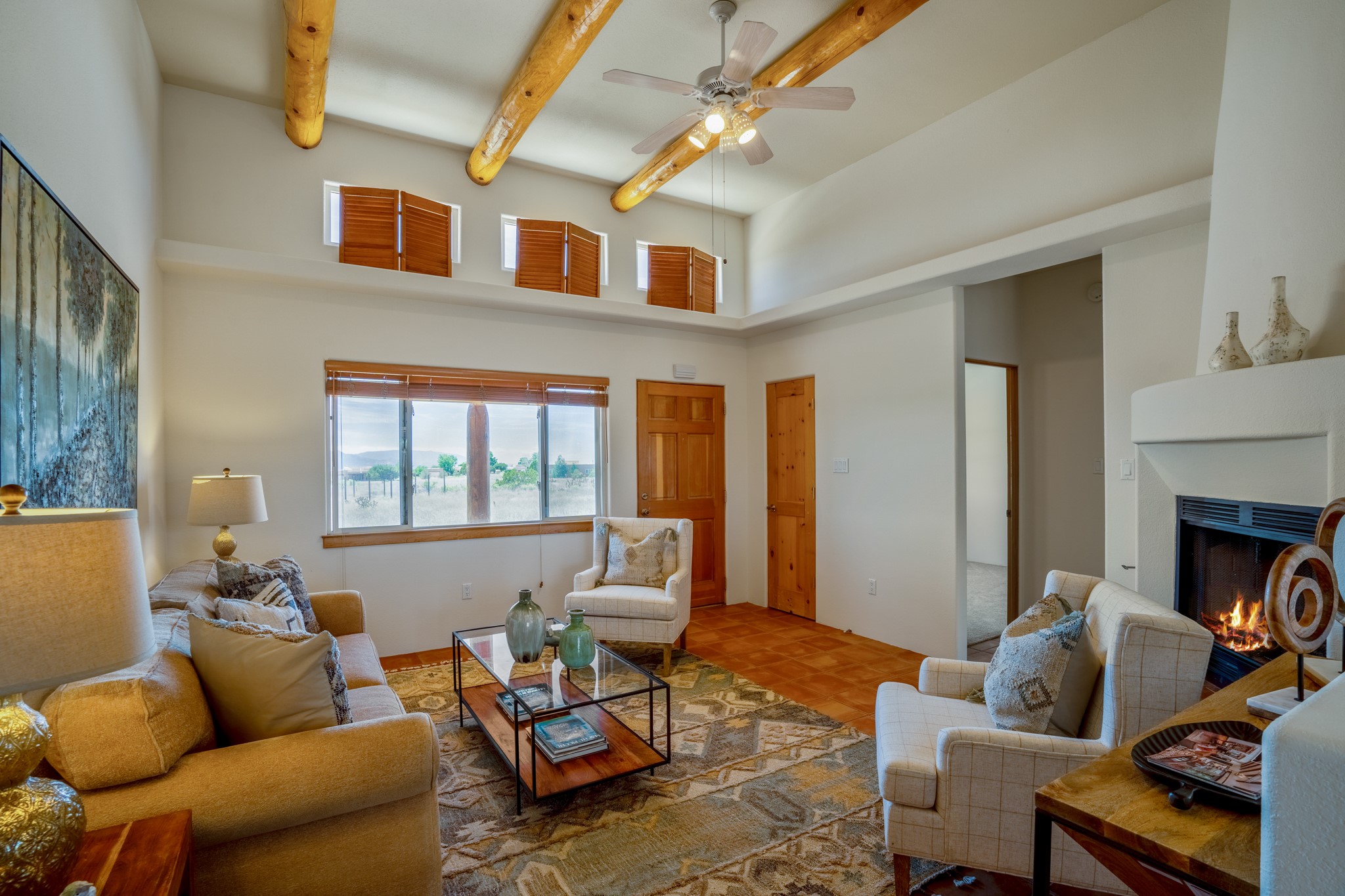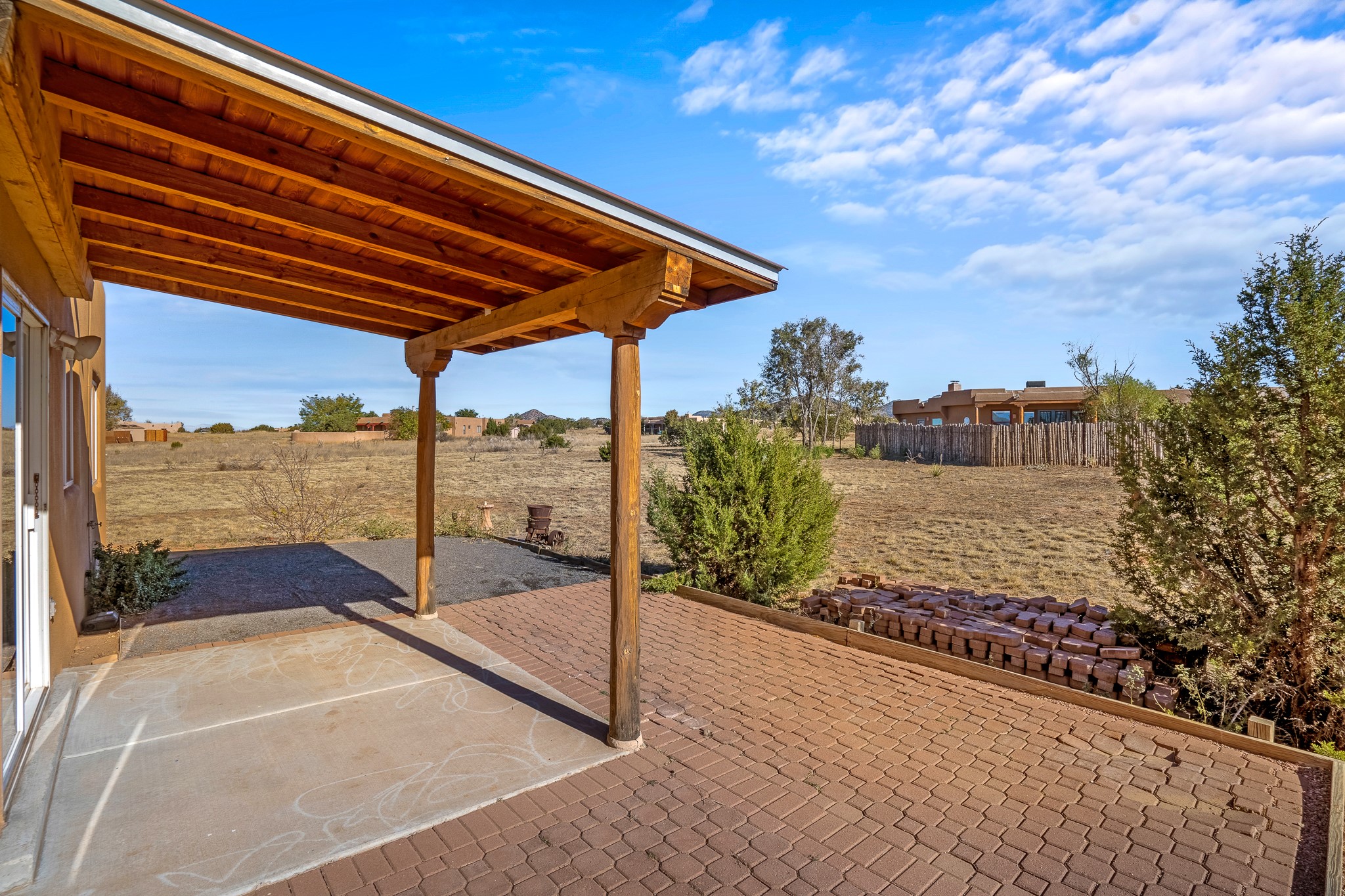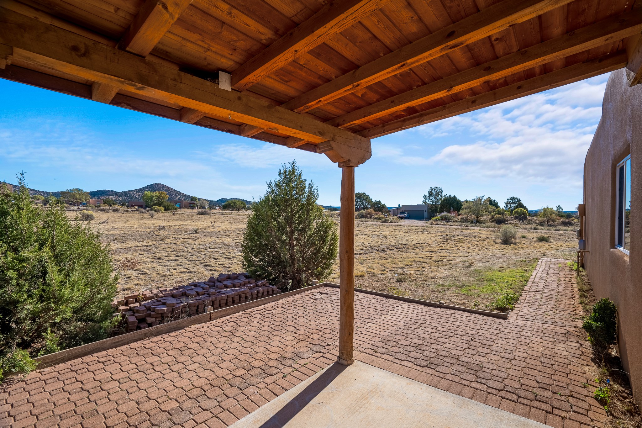 Charming Eldorado property with views and New Mexico flair. This home features high ceilings, vigas, clerestory windows for extra natural light, saltillo tile floors and a kiva wood burning fireplace. There is good separation of space between bedrooms, an eat-in kitchen with a breakfast nook and an island with bar seating. Many upgrades including new hot water heater, new stove, new carpet in bedrooms and freshly painted inside and out. Eldorado offers a commercial center, restaurants, a clubhouse, an outdoor pool,tennis, pickle ball, dog parks, hike/bike paths, parks, 4000 acres of preservation and a thriving active local community all within 13 miles into Santa Fe. This property has easy access to Hwy 285 and I-25.