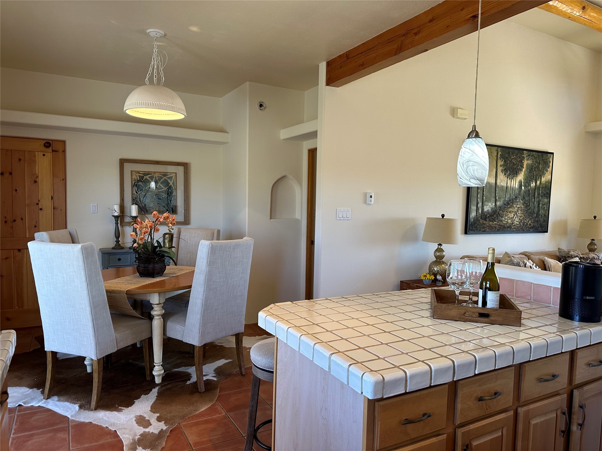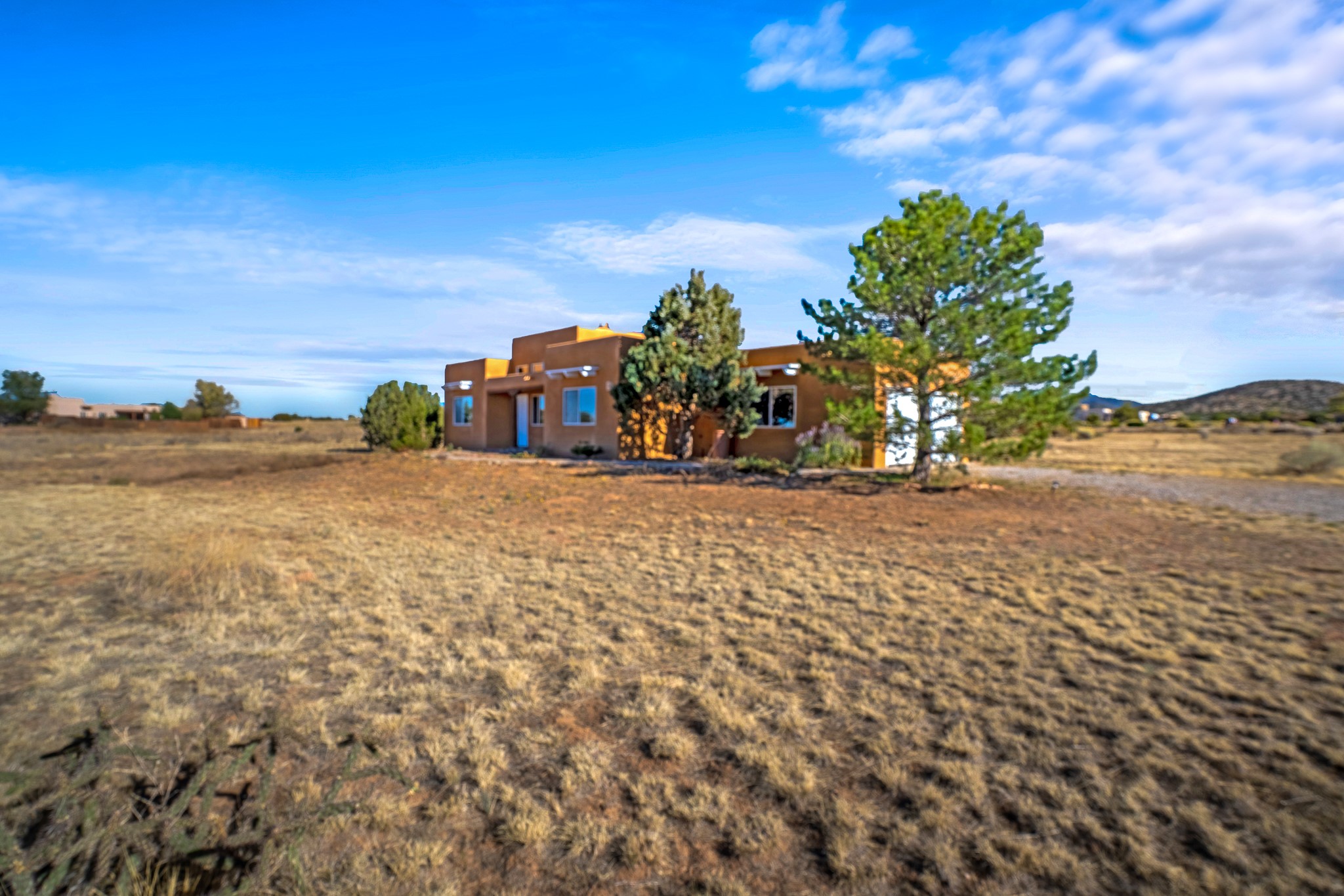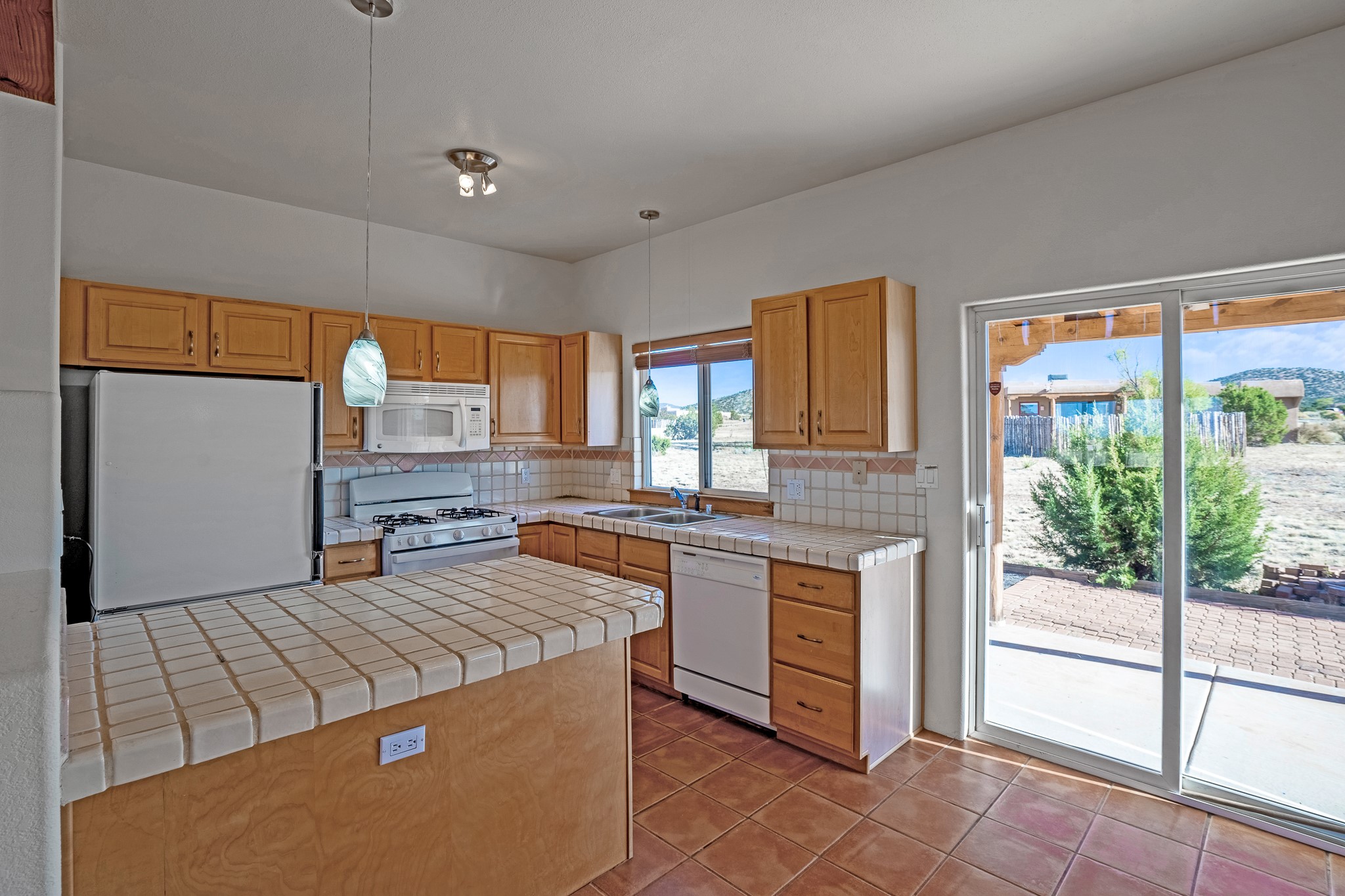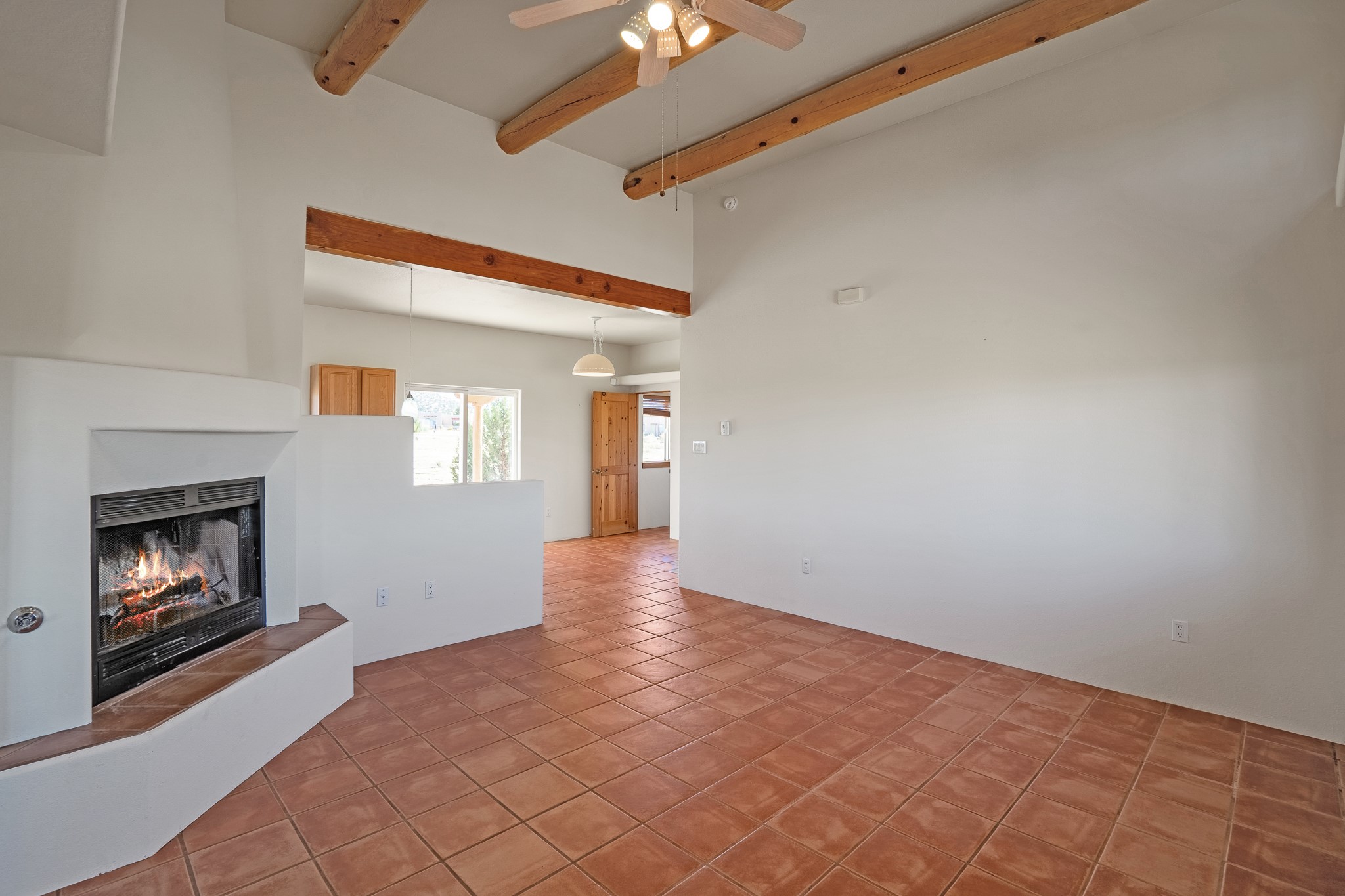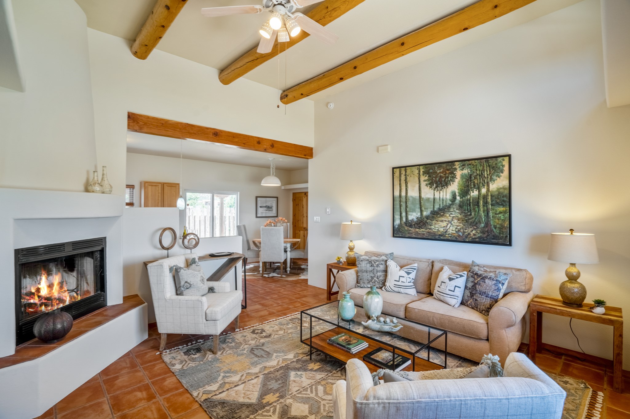 Charming Eldorado property with views and New Mexico flair. This home features high ceilings, vigas, clerestory windows for extra natural light, saltillo tile floors and a kiva wood burning fireplace. There is good separation of space between bedrooms, an eat-in kitchen with a breakfast nook and an island with bar seating. Many upgrades including new hot water heater, new stove, new carpet in bedrooms and freshly painted inside and out. Eldorado offers a commercial center, restaurants, a clubhouse, an outdoor pool,tennis, pickle ball, dog parks, hike/bike paths, parks, 4000 acres of preservation and a thriving active local community all within 13 miles into Santa Fe. This property has easy access to Hwy 285 and I-25.