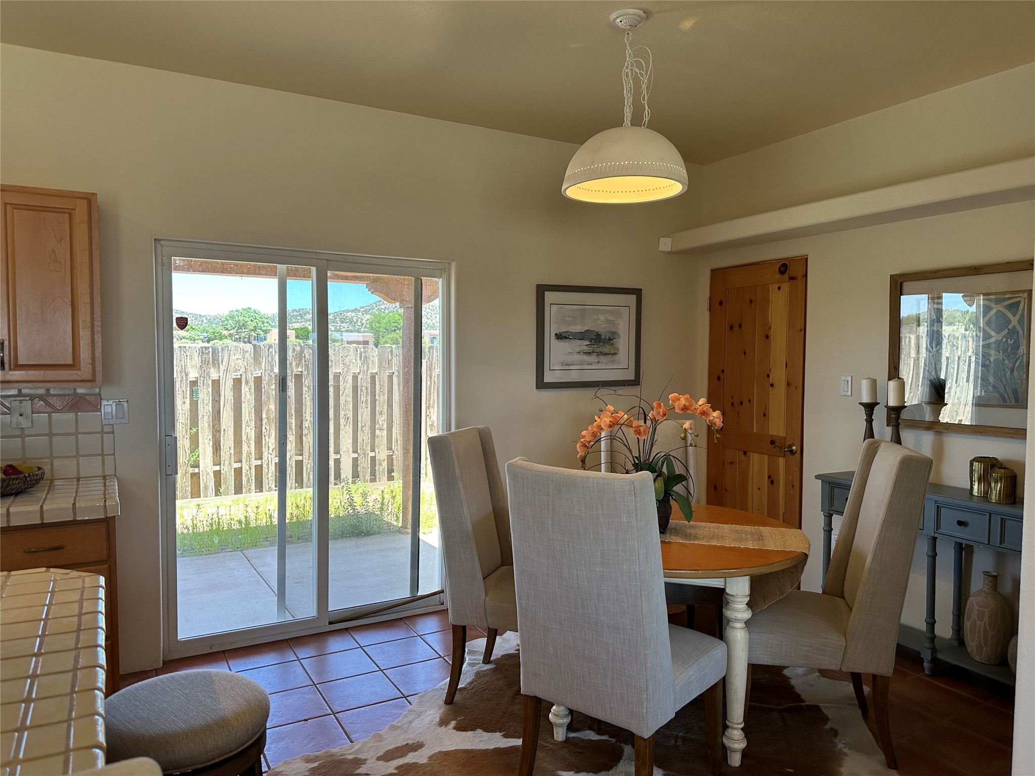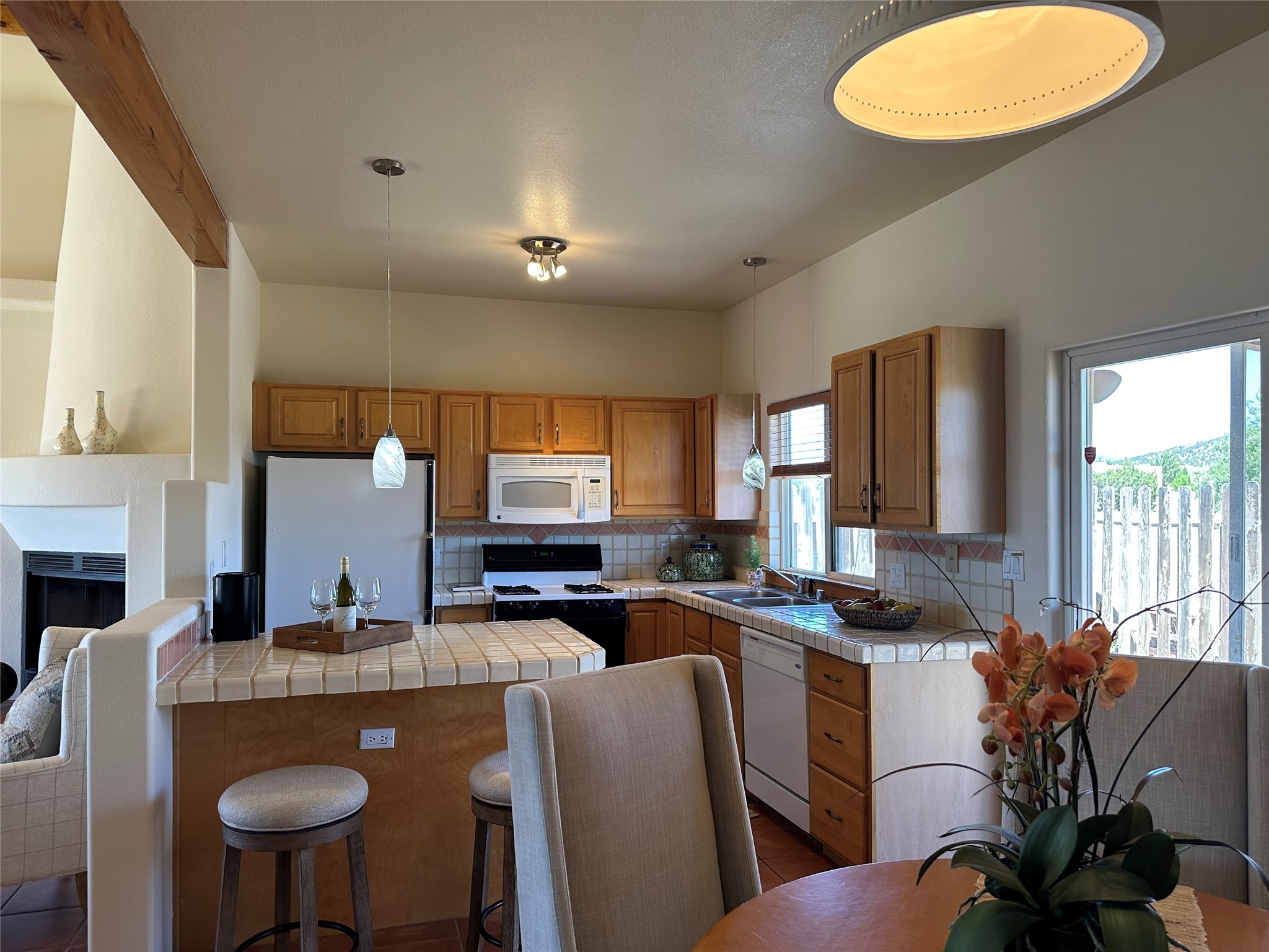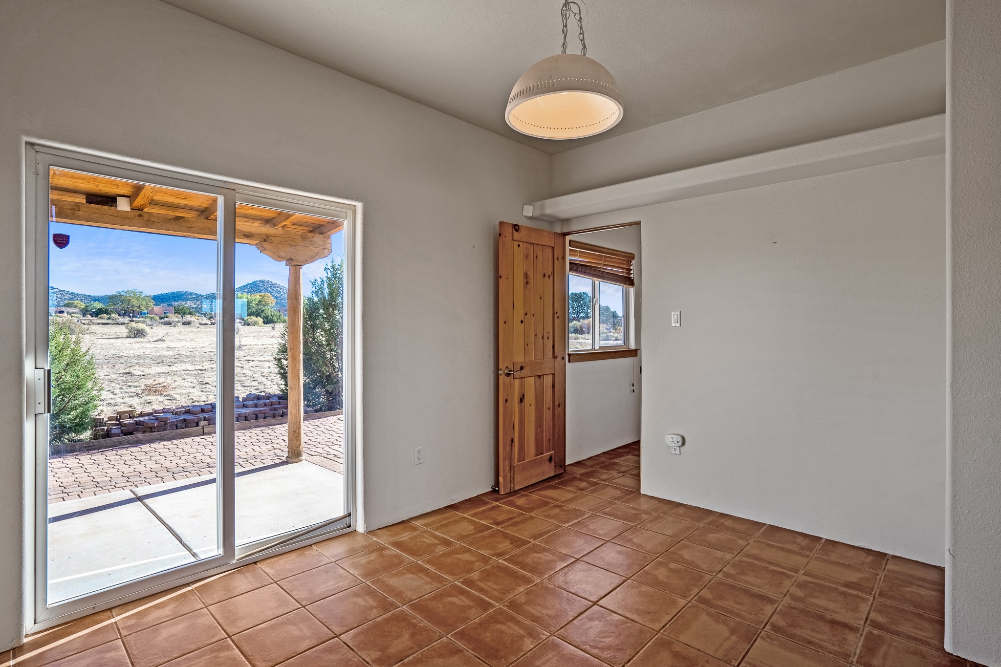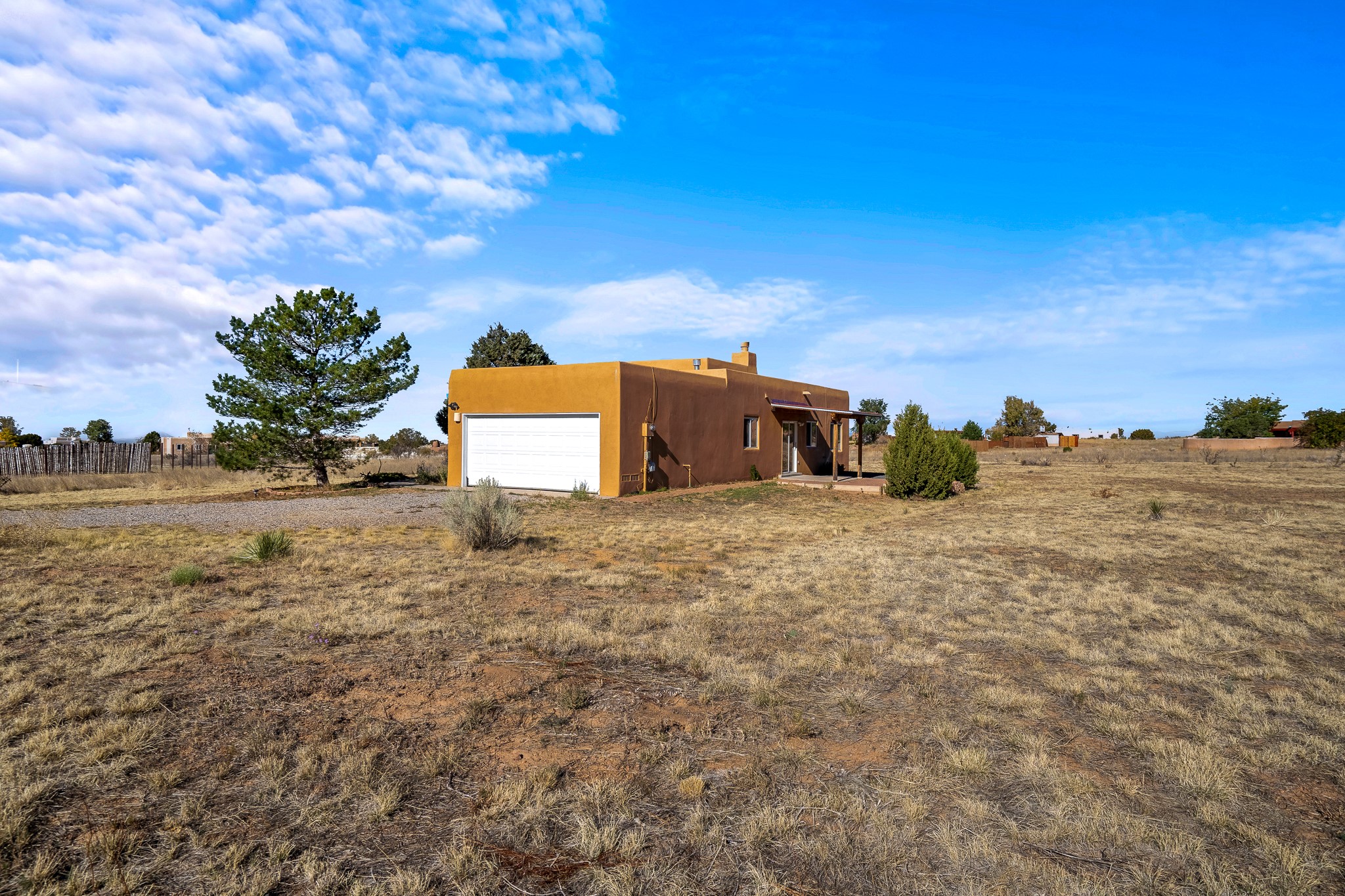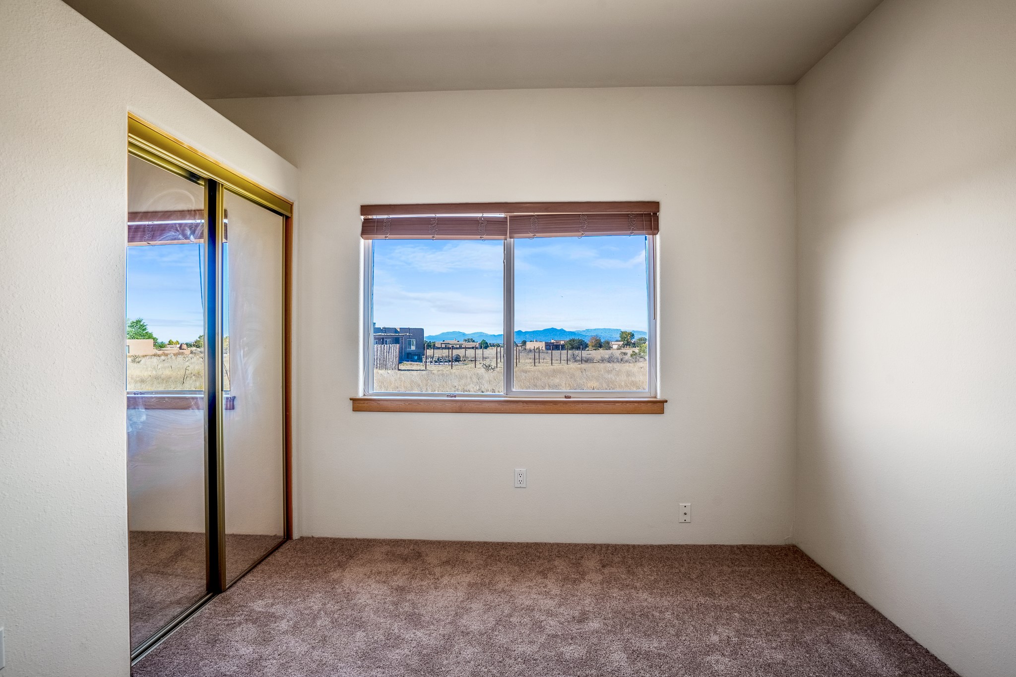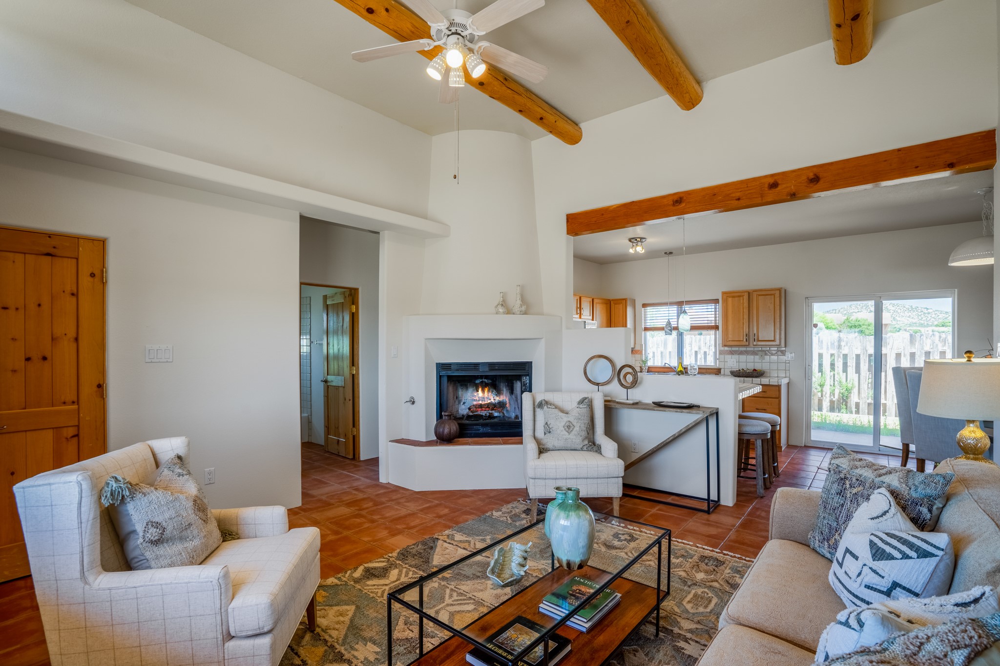 Charming Eldorado property with views and New Mexico flair. This home features high ceilings, vigas, clerestory windows for extra natural light, saltillo tile floors and a kiva wood burning fireplace. There is good separation of space between bedrooms, an eat-in kitchen with a breakfast nook and an island with bar seating. Many upgrades including new hot water heater, new stove, new carpet in bedrooms and freshly painted inside and out. Eldorado offers a commercial center, restaurants, a clubhouse, an outdoor pool,tennis, pickle ball, dog parks, hike/bike paths, parks, 4000 acres of preservation and a thriving active local community all within 13 miles into Santa Fe. This property has easy access to Hwy 285 and I-25.