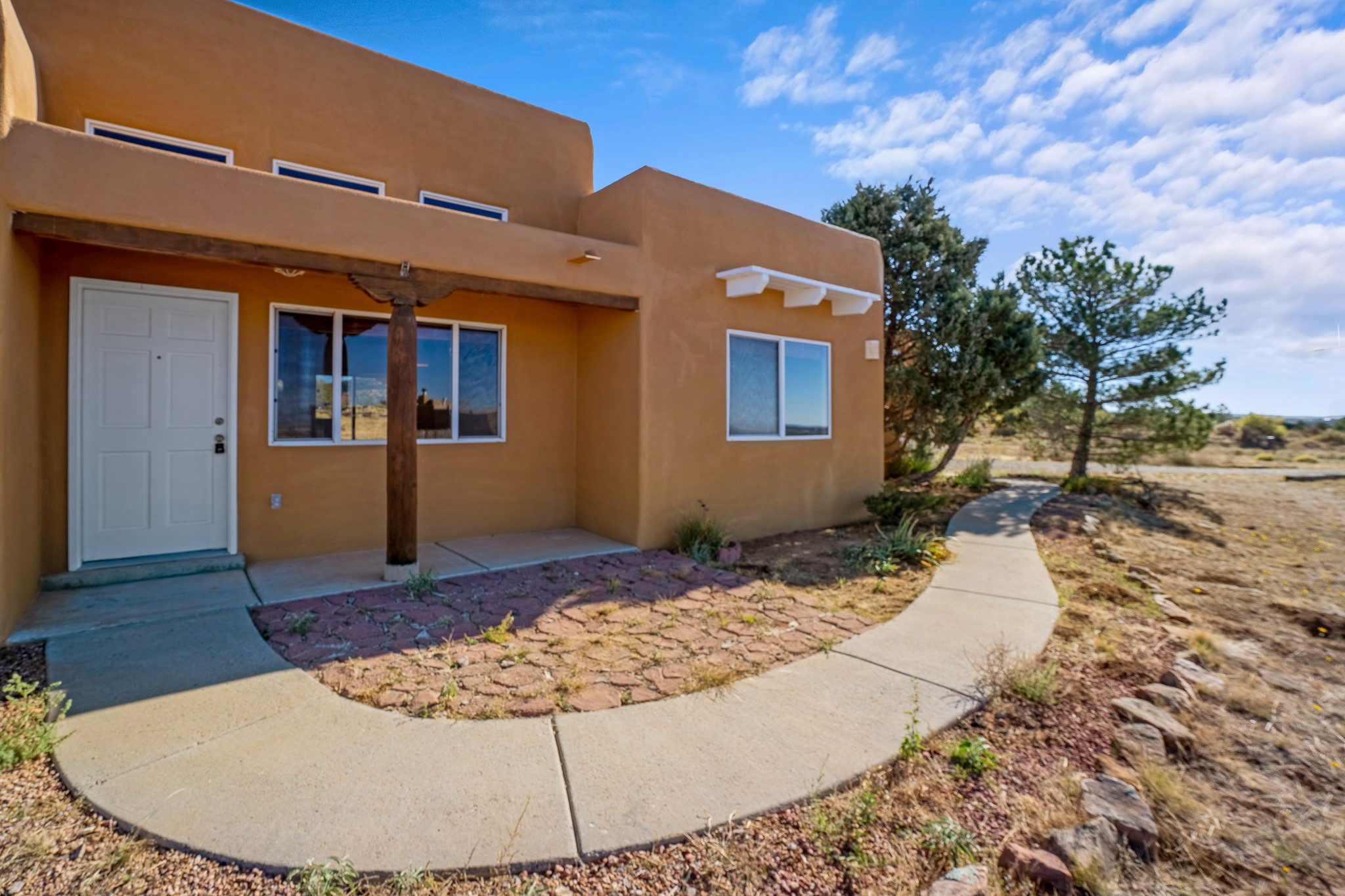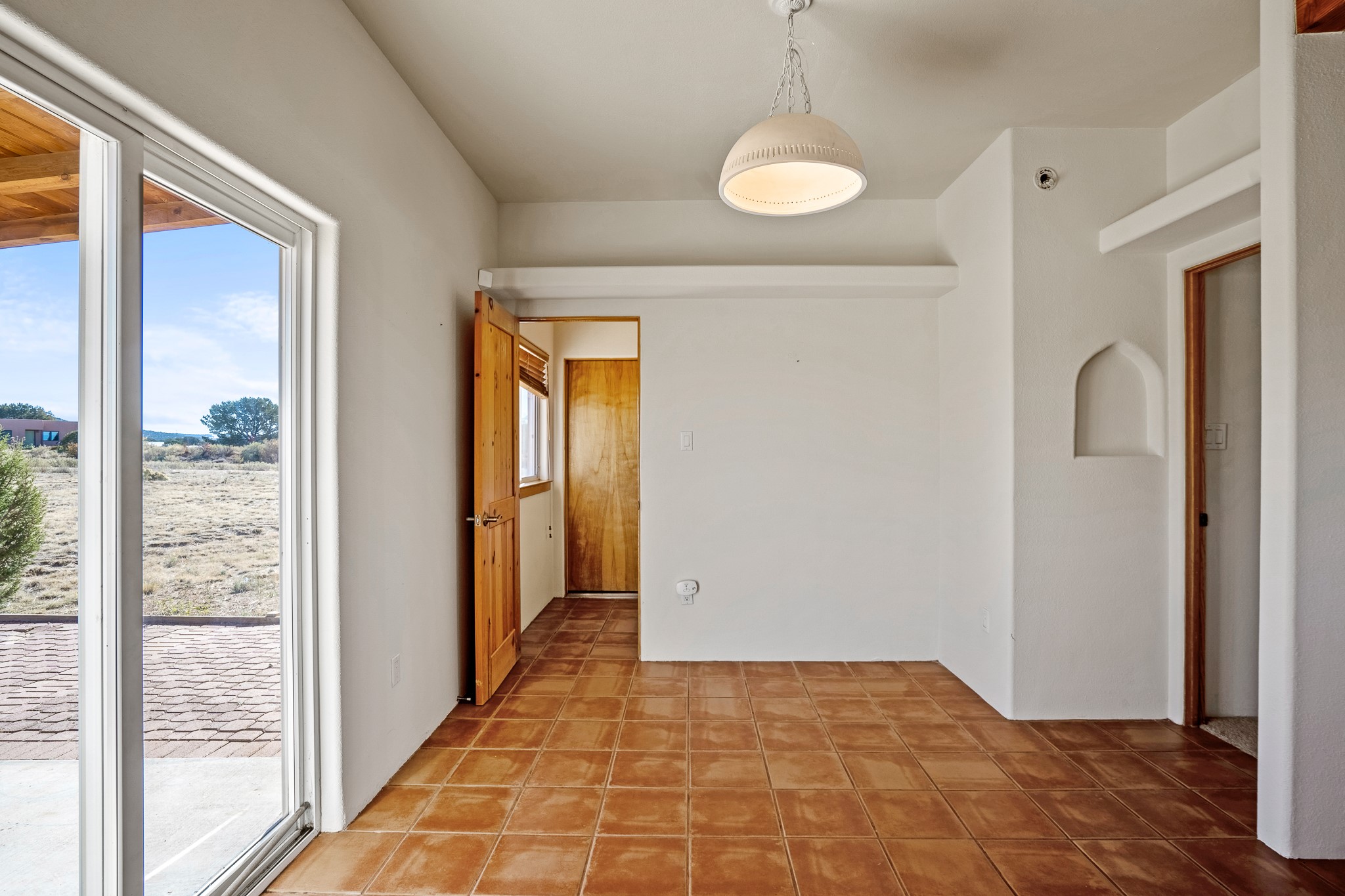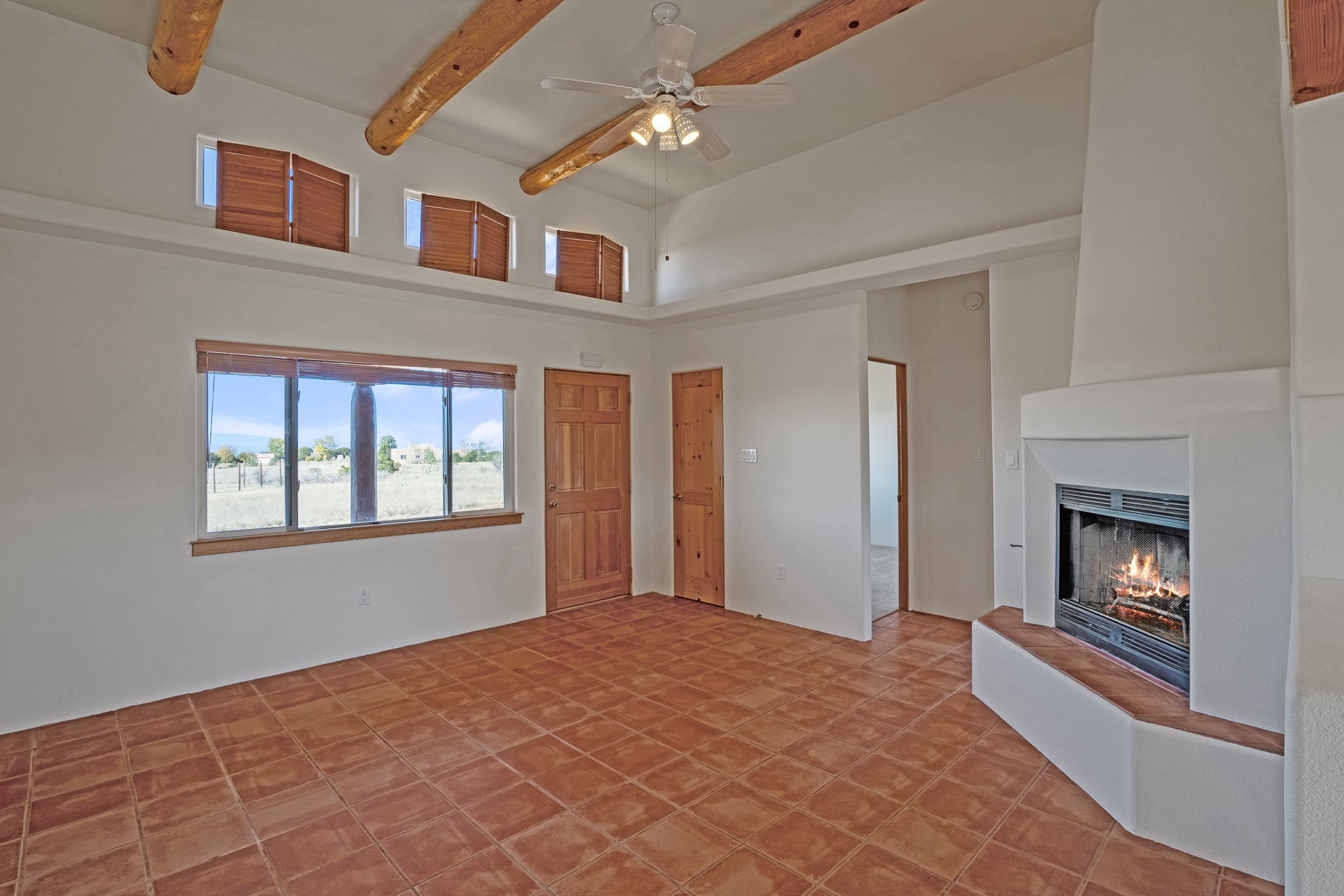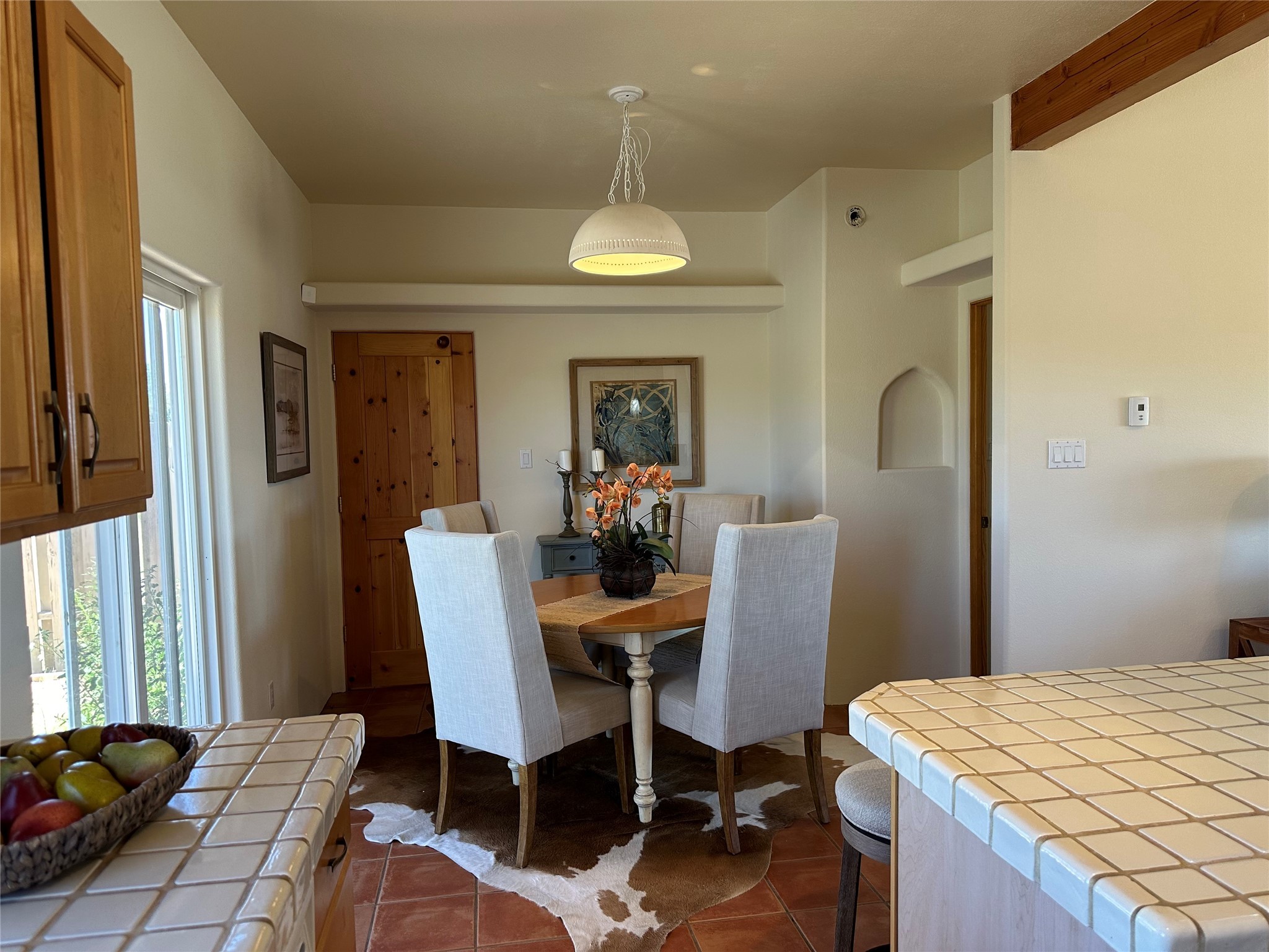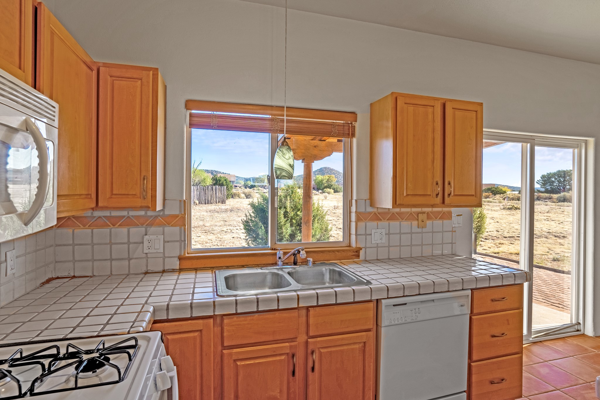 Charming Eldorado property with views and New Mexico flair. This home features high ceilings, vigas, clerestory windows for extra natural light, saltillo tile floors and a kiva wood burning fireplace. There is good separation of space between bedrooms, an eat-in kitchen with a breakfast nook and an island with bar seating. Many upgrades including new hot water heater, new stove, new carpet in bedrooms and freshly painted inside and out. Eldorado offers a commercial center, restaurants, a clubhouse, an outdoor pool,tennis, pickle ball, dog parks, hike/bike paths, parks, 4000 acres of preservation and a thriving active local community all within 13 miles into Santa Fe. This property has easy access to Hwy 285 and I-25.