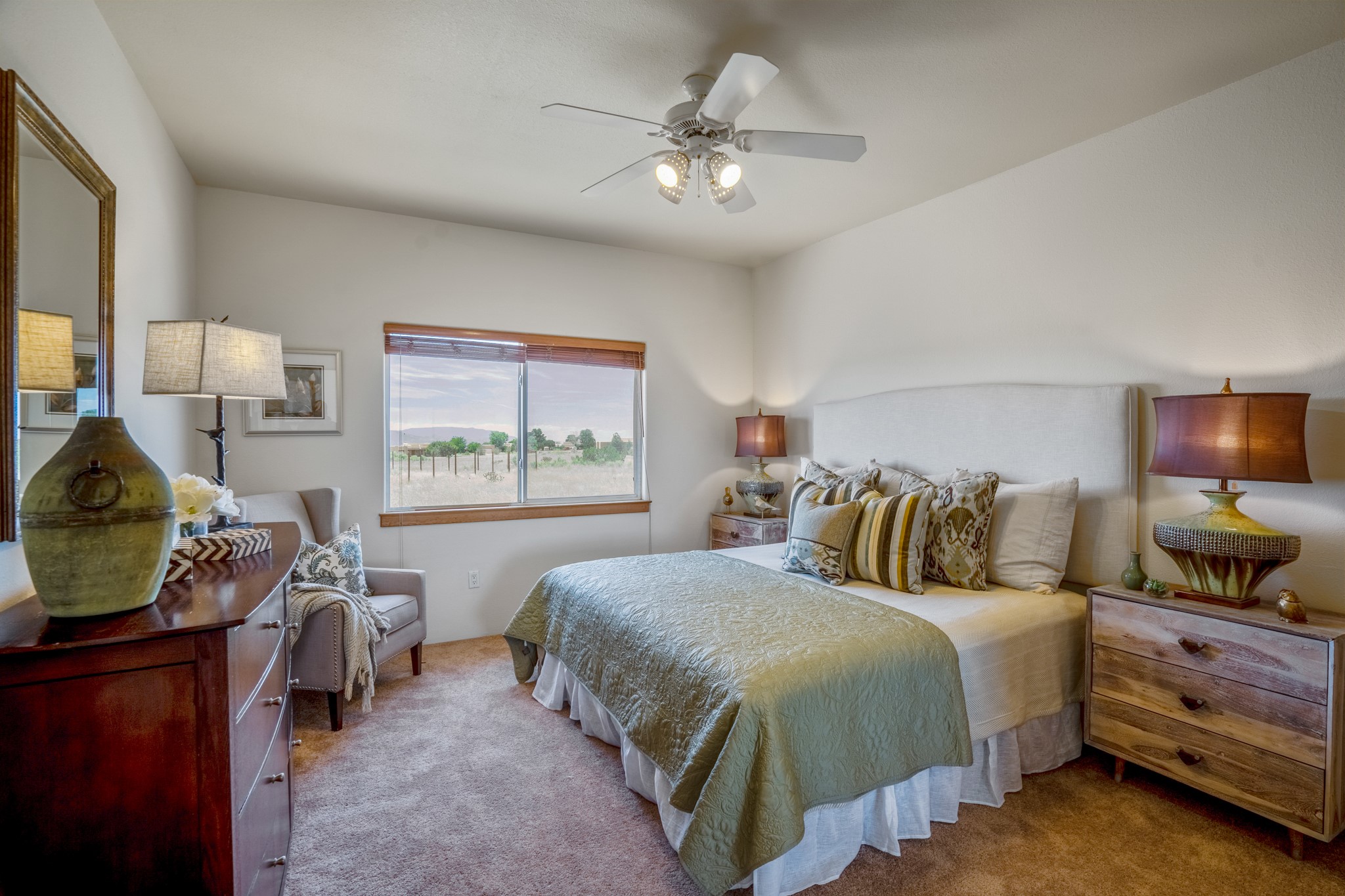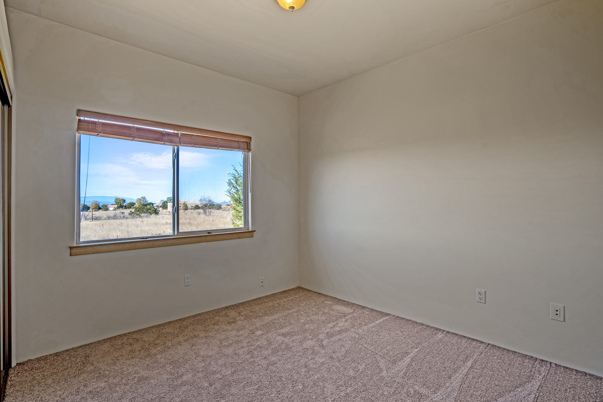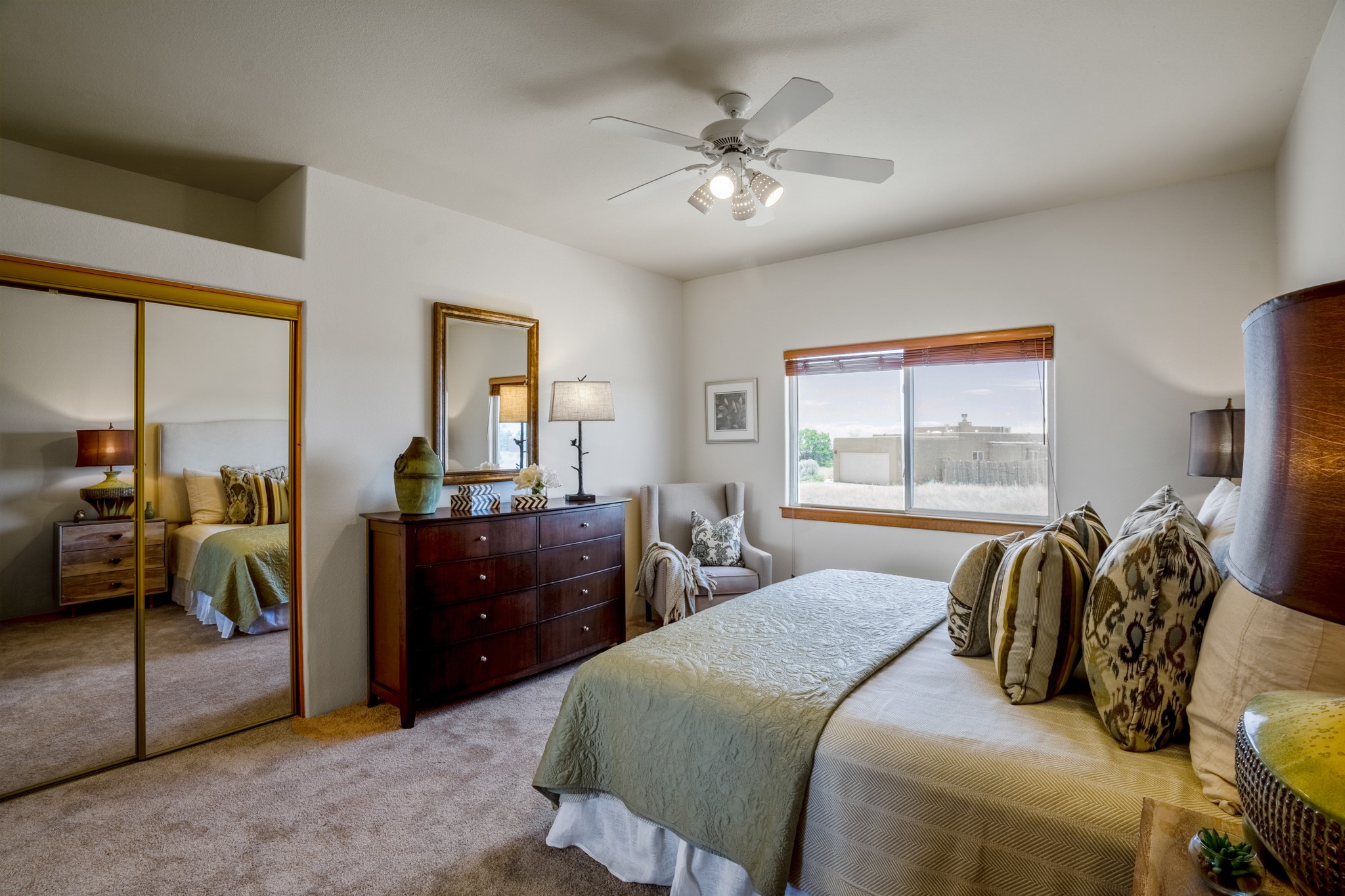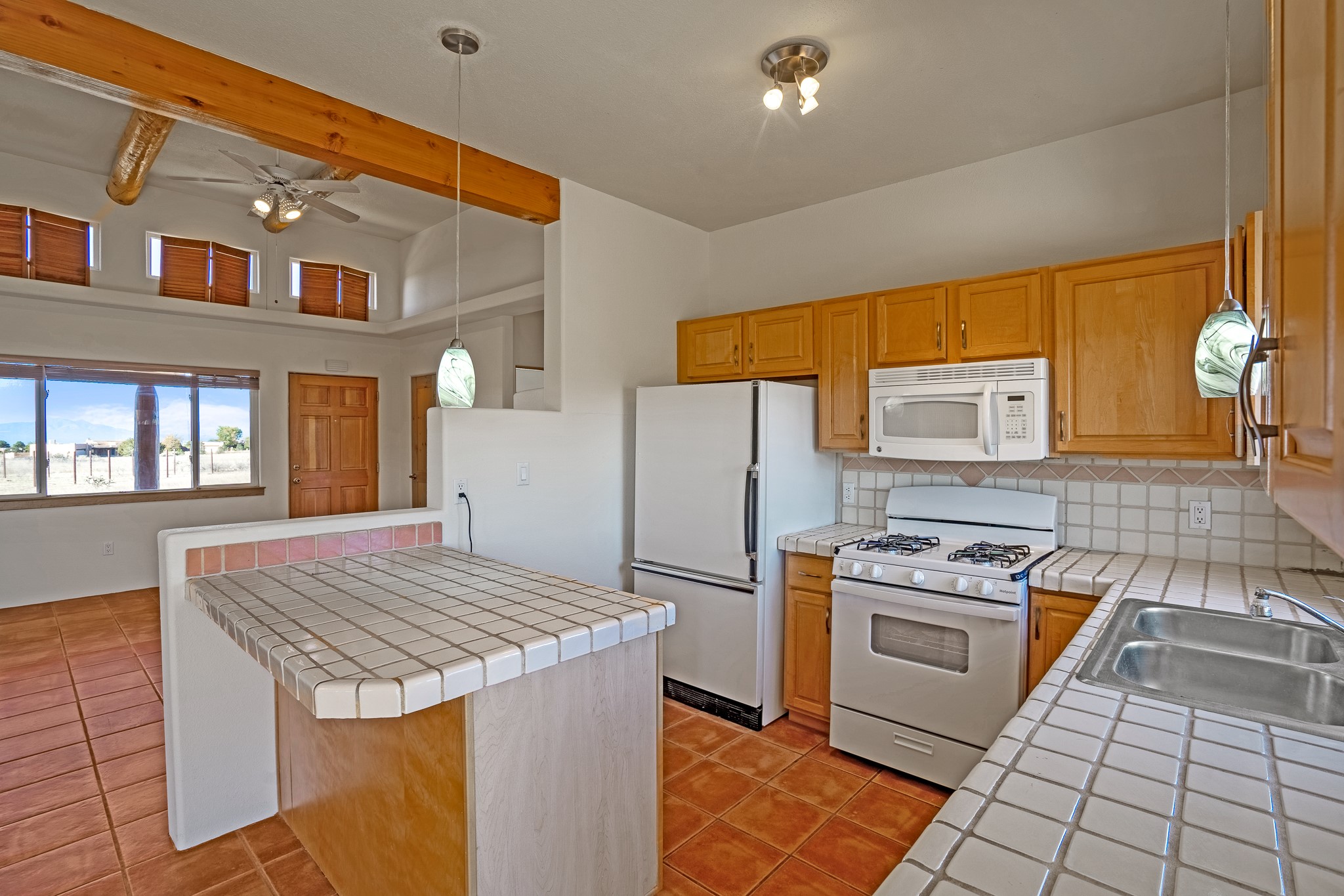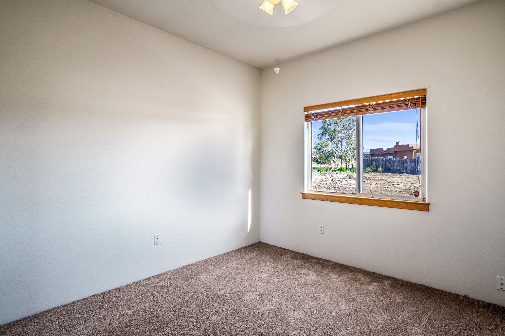 Charming Eldorado property with views and New Mexico flair. This home features high ceilings, vigas, clerestory windows for extra natural light, saltillo tile floors and a kiva wood burning fireplace. There is good separation of space between bedrooms, an eat-in kitchen with a breakfast nook and an island with bar seating. Many upgrades including new hot water heater, new stove, new carpet in bedrooms and freshly painted inside and out. Eldorado offers a commercial center, restaurants, a clubhouse, an outdoor pool,tennis, pickle ball, dog parks, hike/bike paths, parks, 4000 acres of preservation and a thriving active local community all within 13 miles into Santa Fe. This property has easy access to Hwy 285 and I-25.
