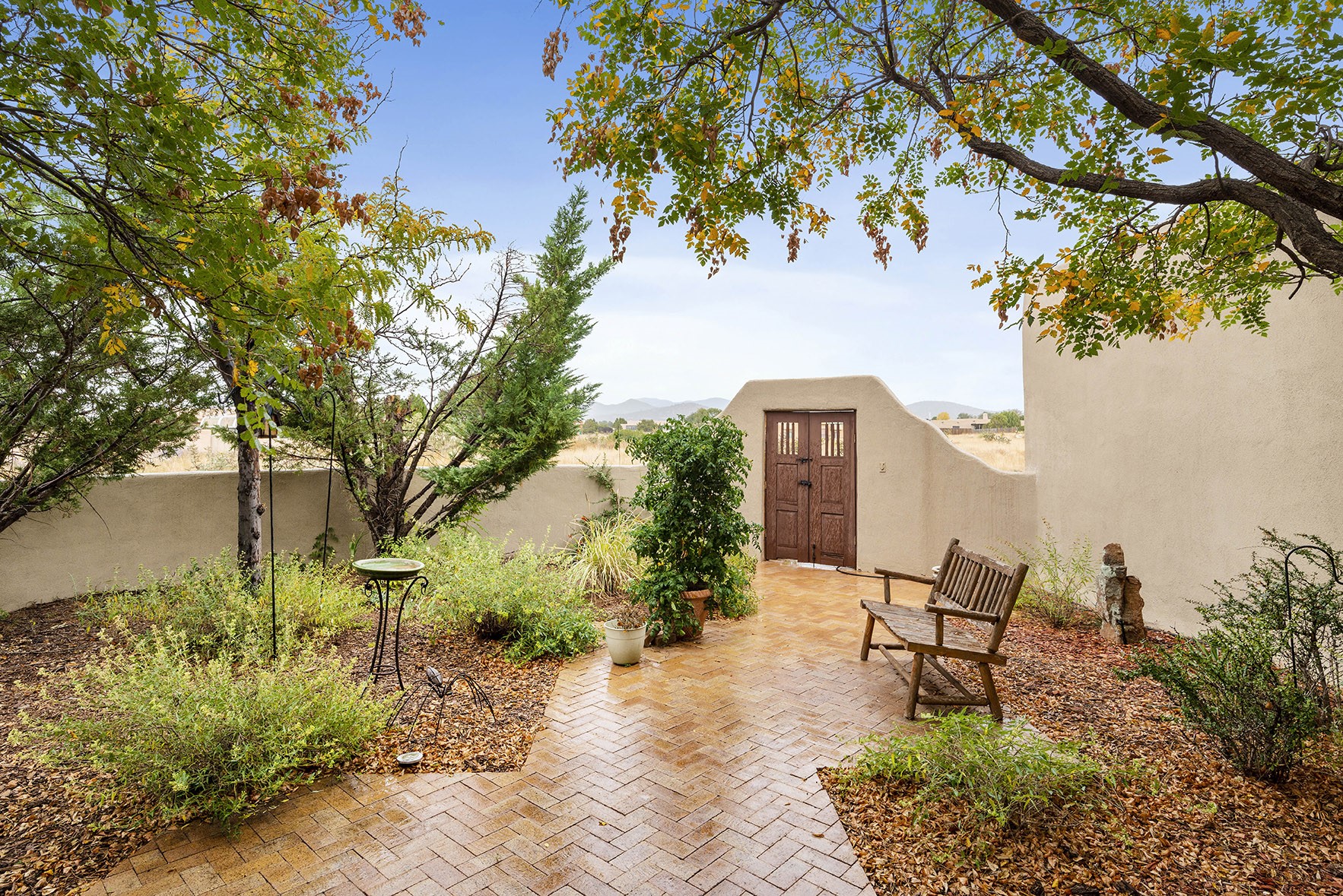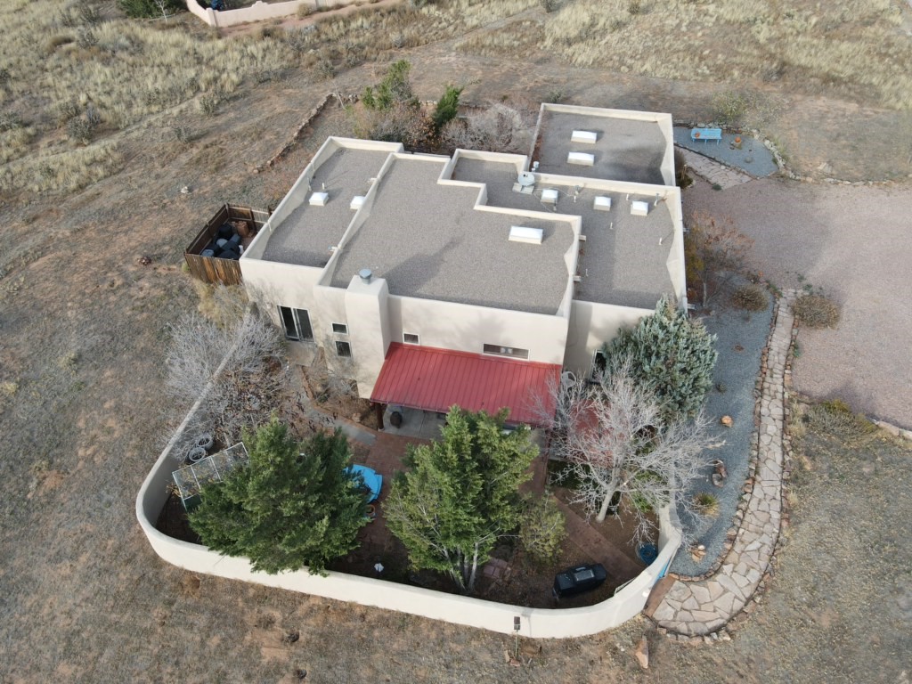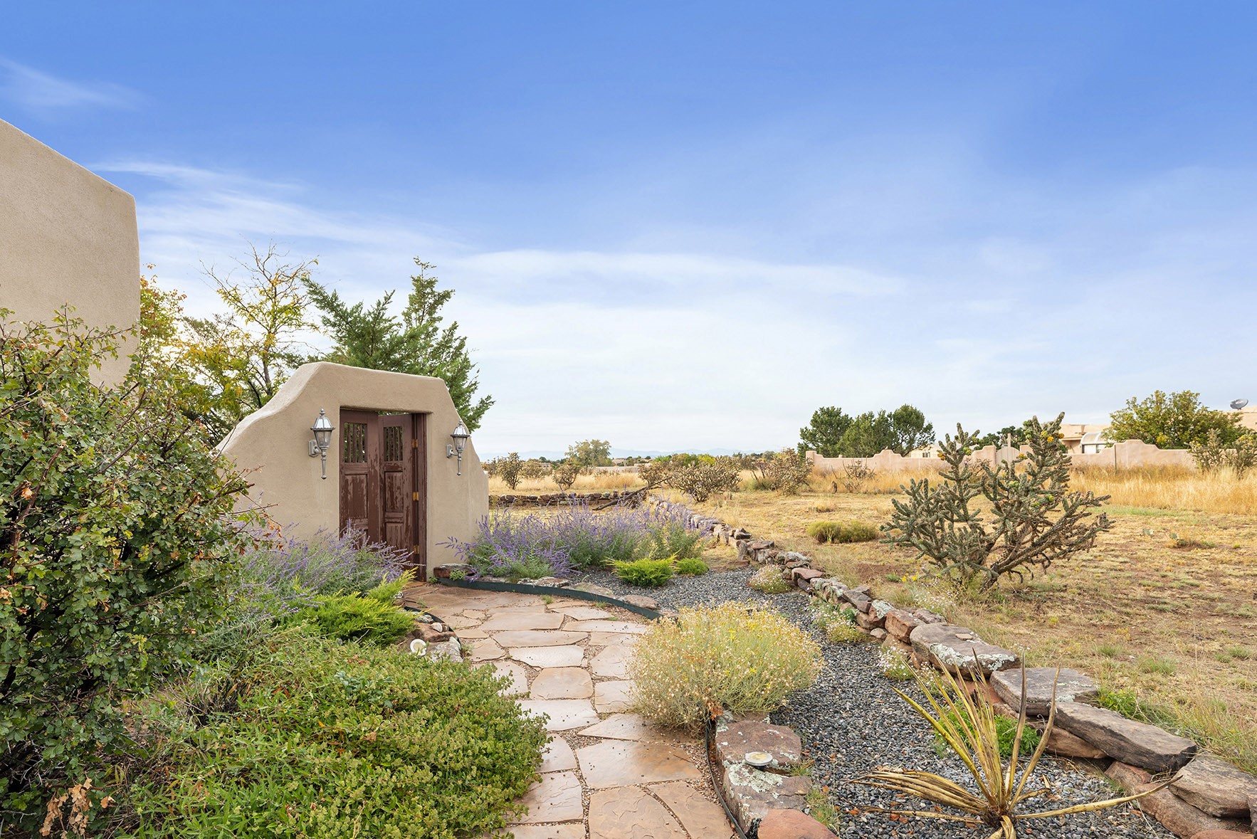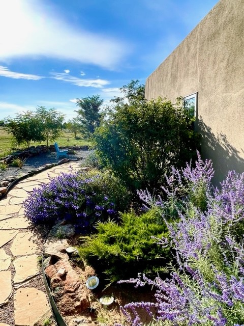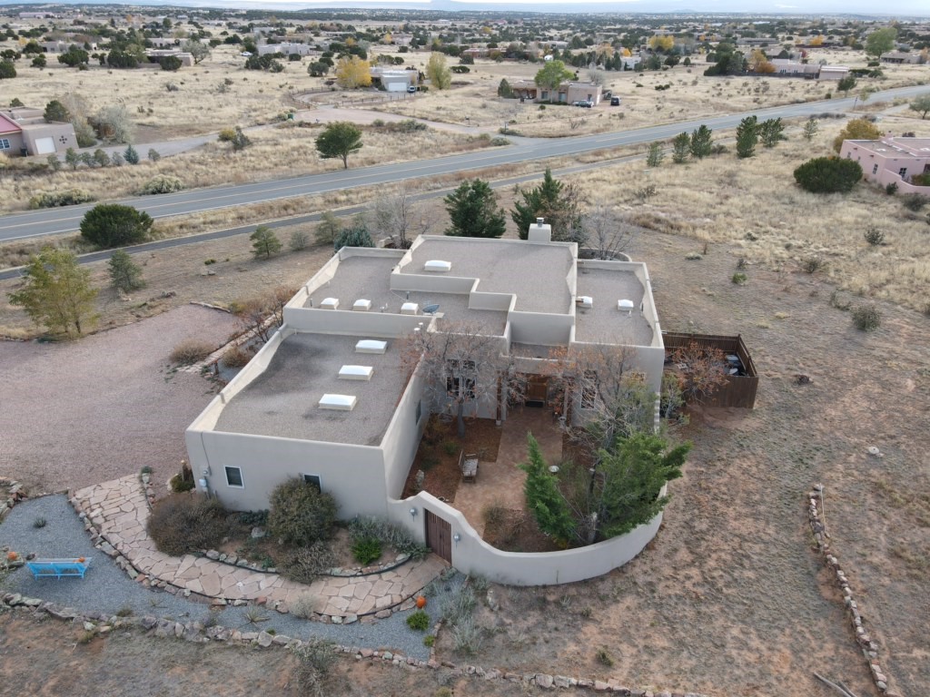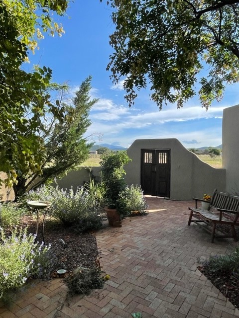 You see the charm of this Eldorado home as soon as you drive up to it. Not one, but two courtyards for beautifully landscaped and private outdoor living space. Enter the house from the front courtyard and you are met with Santa Fe style decorative touches, including vigas and nichos. Everyone remarks on the spacious high ceilings, which are throughout the house. A gas fireplace warms the living room, which opens into the roomy dining area, which in turn leads to the back courtyard (hot tub conveys). The kitchen comes with stainless appliances, including a 5-burner gas stove and hood vent, and lots of counter space and cabinets. The common living areas separate the primary suite from the two guest bedrooms. The primary suite consist of a bedroom that opens onto the back courtyard, spacious walk-in closet, and bathroom with two sinks, separate shower, separate toilet stall, and garden tub. On this end of the house, a large laundry room has extra pantry space and comes with washer and dryer. It leads out to the attached 2-car garage, with insulated walls, 3 skylights, and a huge storeroom. There is additional parking in the circle driveway. Open space around the house reveals the beautiful mountain views. Great location on Avenida Eldorado with easy access to US 285 into Santa Fe and to Eldorado's shopping at the Agora and La Tienda. Right next to Eldorado's extensive walking path system, so you don't need to join the gym! House comes with a 14-month home warranty, start 3/6/23