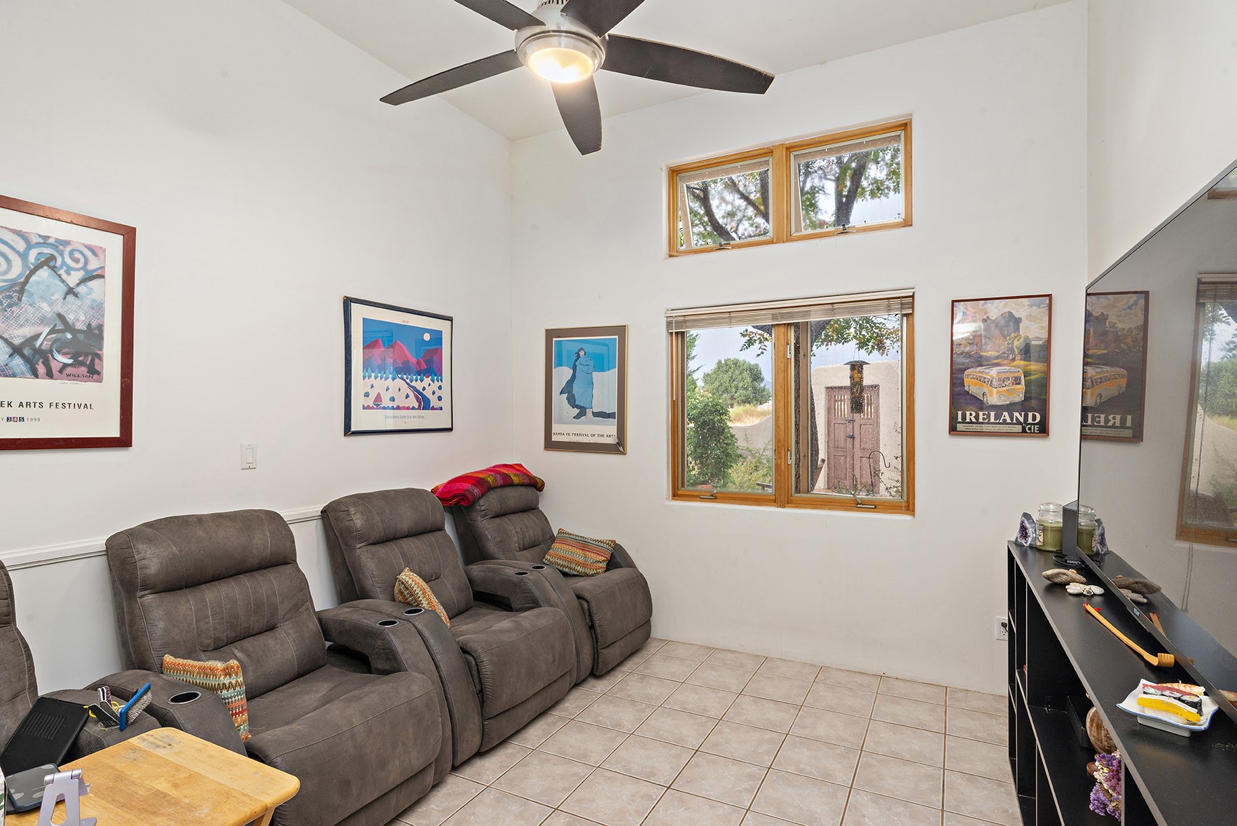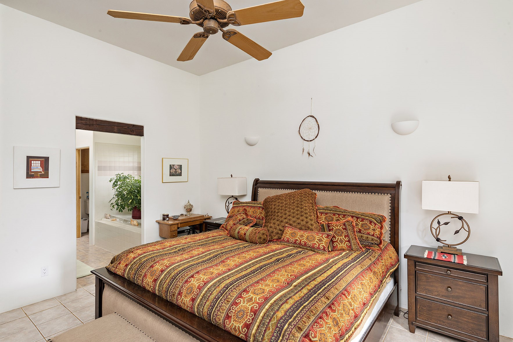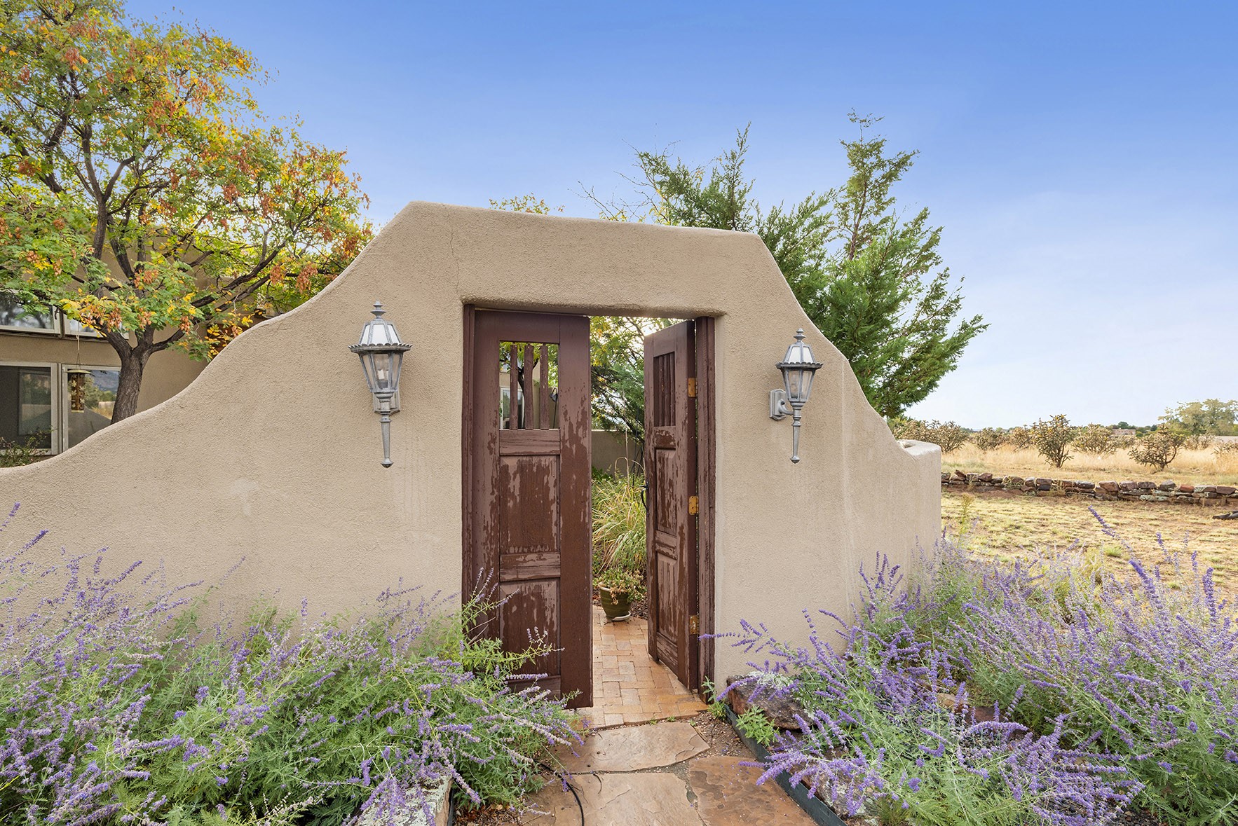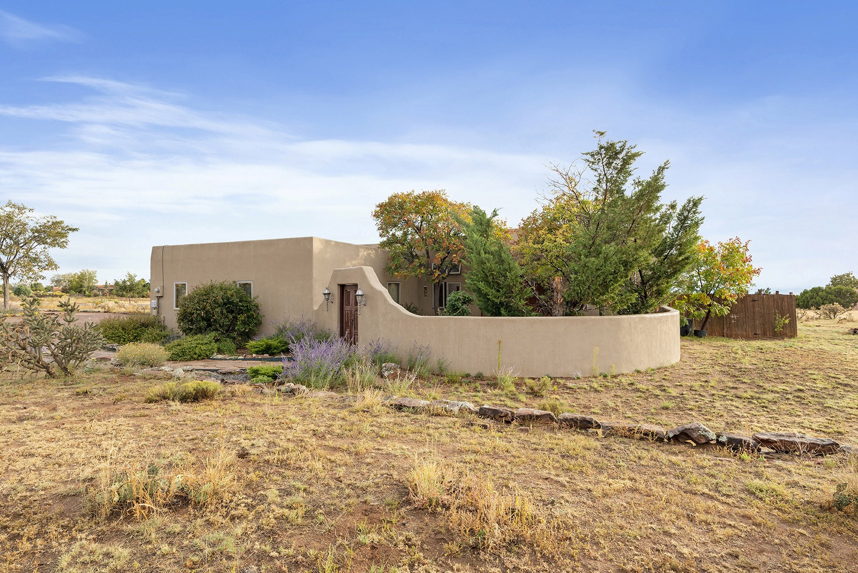 You see the charm of this Eldorado home as soon as you drive up to it. Not one, but two courtyards for beautifully landscaped and private outdoor living space. Enter the house from the front courtyard and you are met with Santa Fe style decorative touches, including vigas and nichos. Everyone remarks on the spacious high ceilings, which are throughout the house. A gas fireplace warms the living room, which opens into the roomy dining area, which in turn leads to the back courtyard (hot tub conveys). The kitchen comes with stainless appliances, including a 5-burner gas stove and hood vent, and lots of counter space and cabinets. The common living areas separate the primary suite from the two guest bedrooms. The primary suite consist of a bedroom that opens onto the back courtyard, spacious walk-in closet, and bathroom with two sinks, separate shower, separate toilet stall, and garden tub. On this end of the house, a large laundry room has extra pantry space and comes with washer and dryer. It leads out to the attached 2-car garage, with insulated walls, 3 skylights, and a huge storeroom. There is additional parking in the circle driveway. Open space around the house reveals the beautiful mountain views. Great location on Avenida Eldorado with easy access to US 285 into Santa Fe and to Eldorado's shopping at the Agora and La Tienda. Right next to Eldorado's extensive walking path system, so you don't need to join the gym! House comes with a 14-month home warranty, start 3/6/23