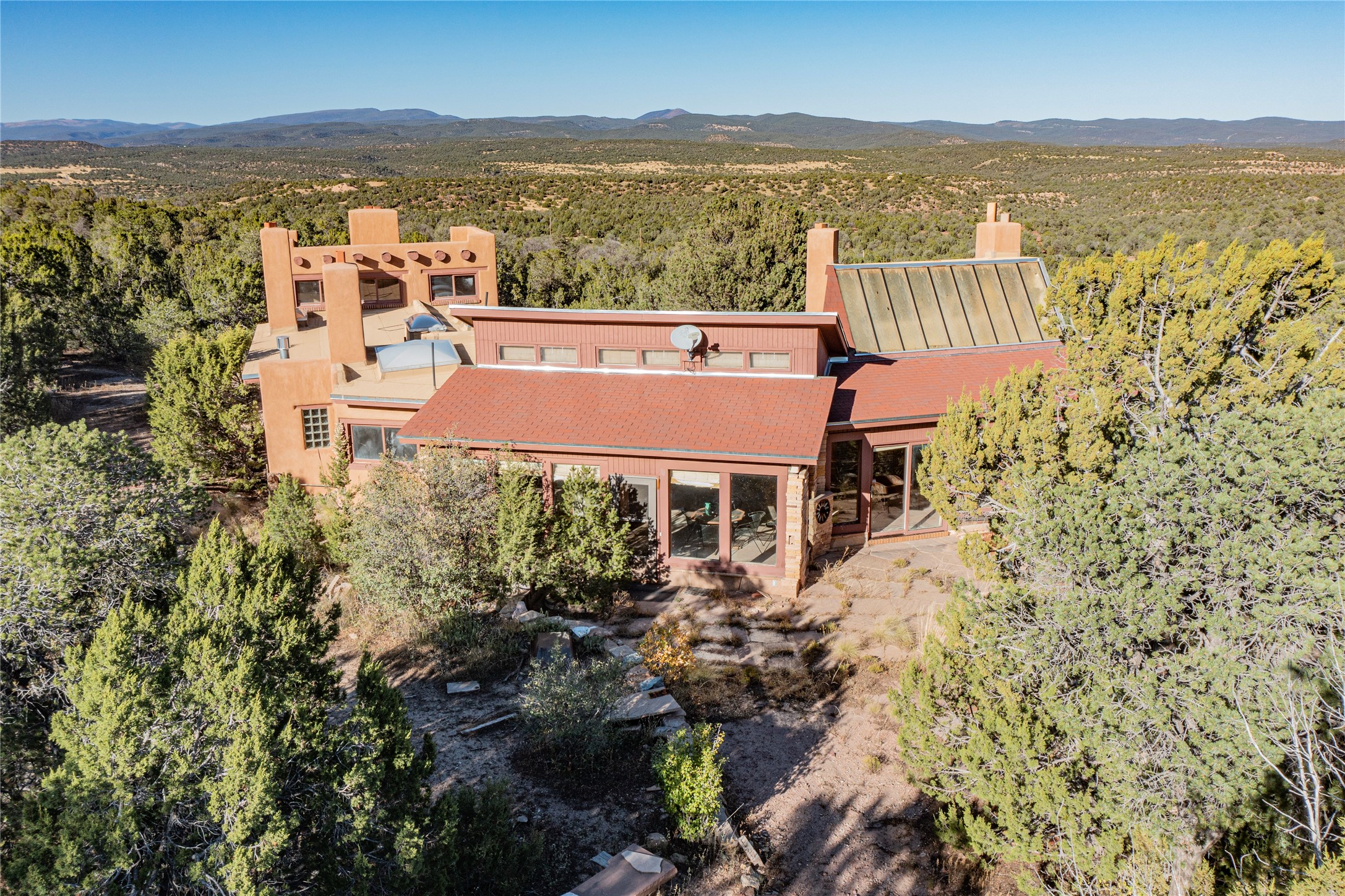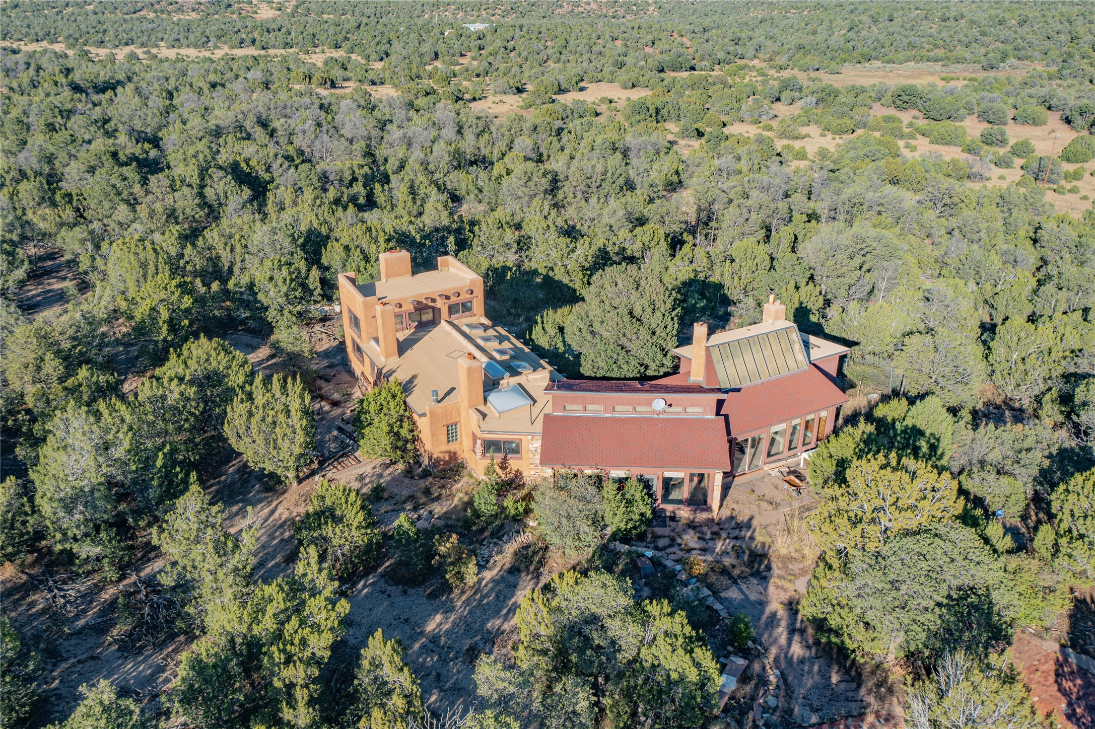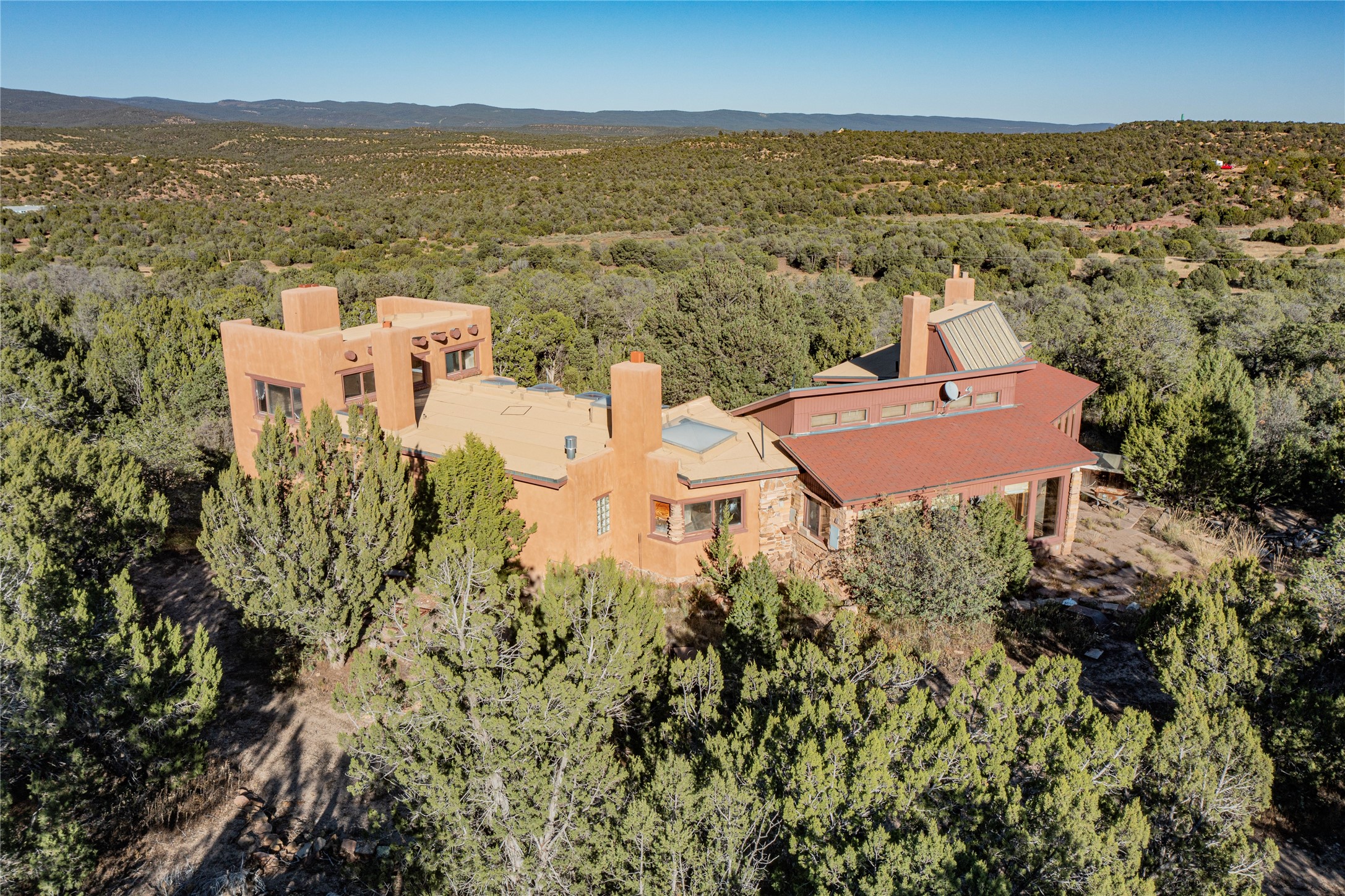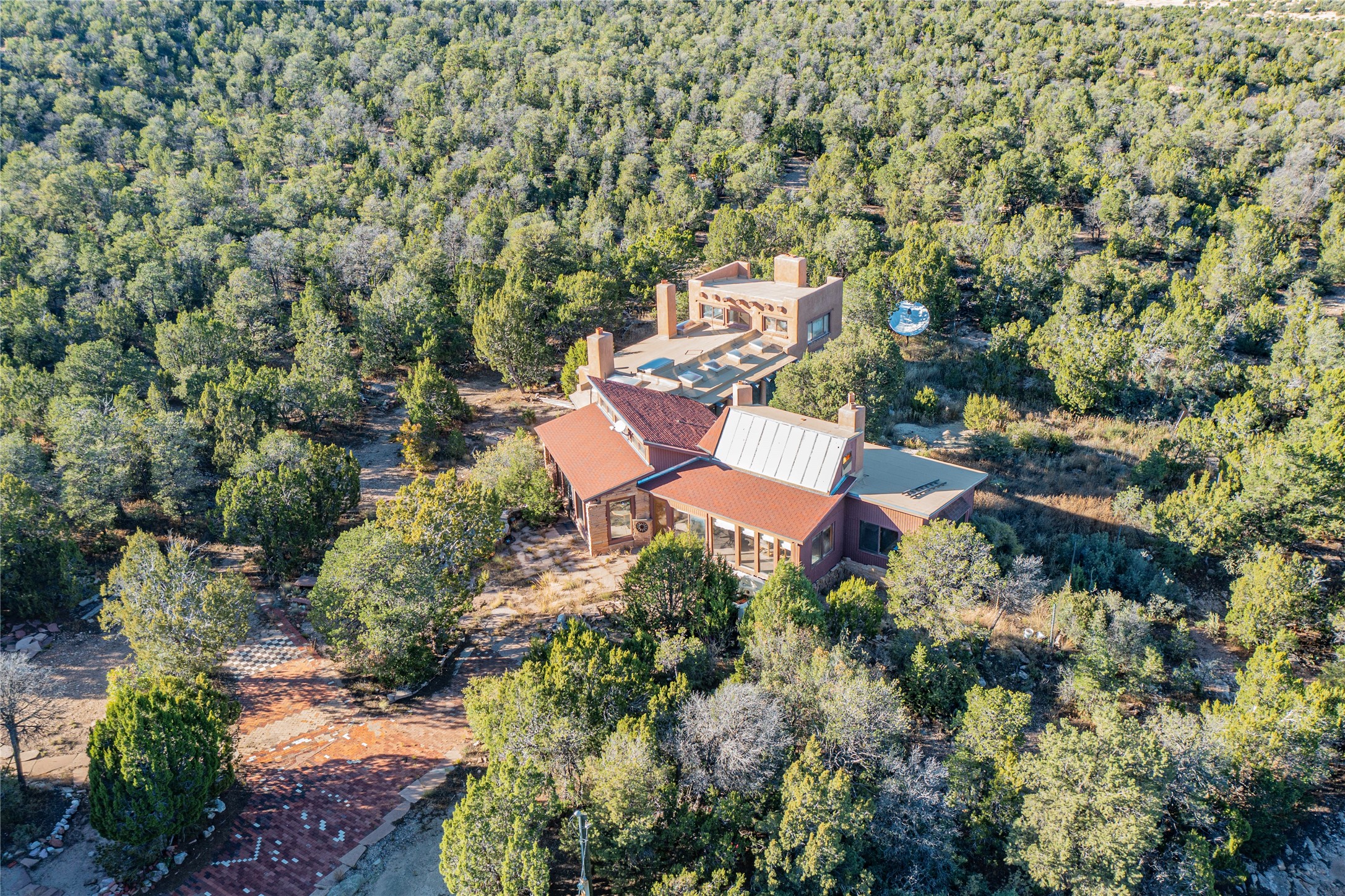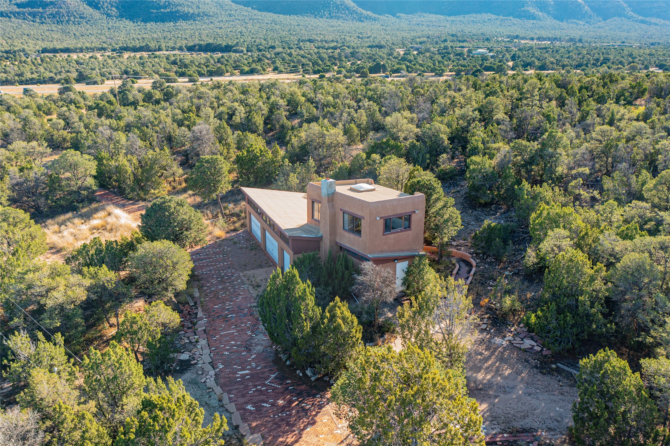 Handyman Special! This property has unlimited potential! If you've ever dreamed of owning your own private forest, this property comes with 42 acres of beautiful land; filled with abundant pine trees, native plants, and plenty of wildlife. This one of a kind, passive solar, private home has a NEW Septic Tank, recently updated roof, ample light, stunning flagstone and brick floors through out, vigas, 3 fireplaces and a wood burning stove and a 5-car garage that would fulfill a car collector's dream. Above the enormous garage there is a 300 sq ft private roof top studio. This home is busting with character and conveniently located 30 minutes from Santa Fe.