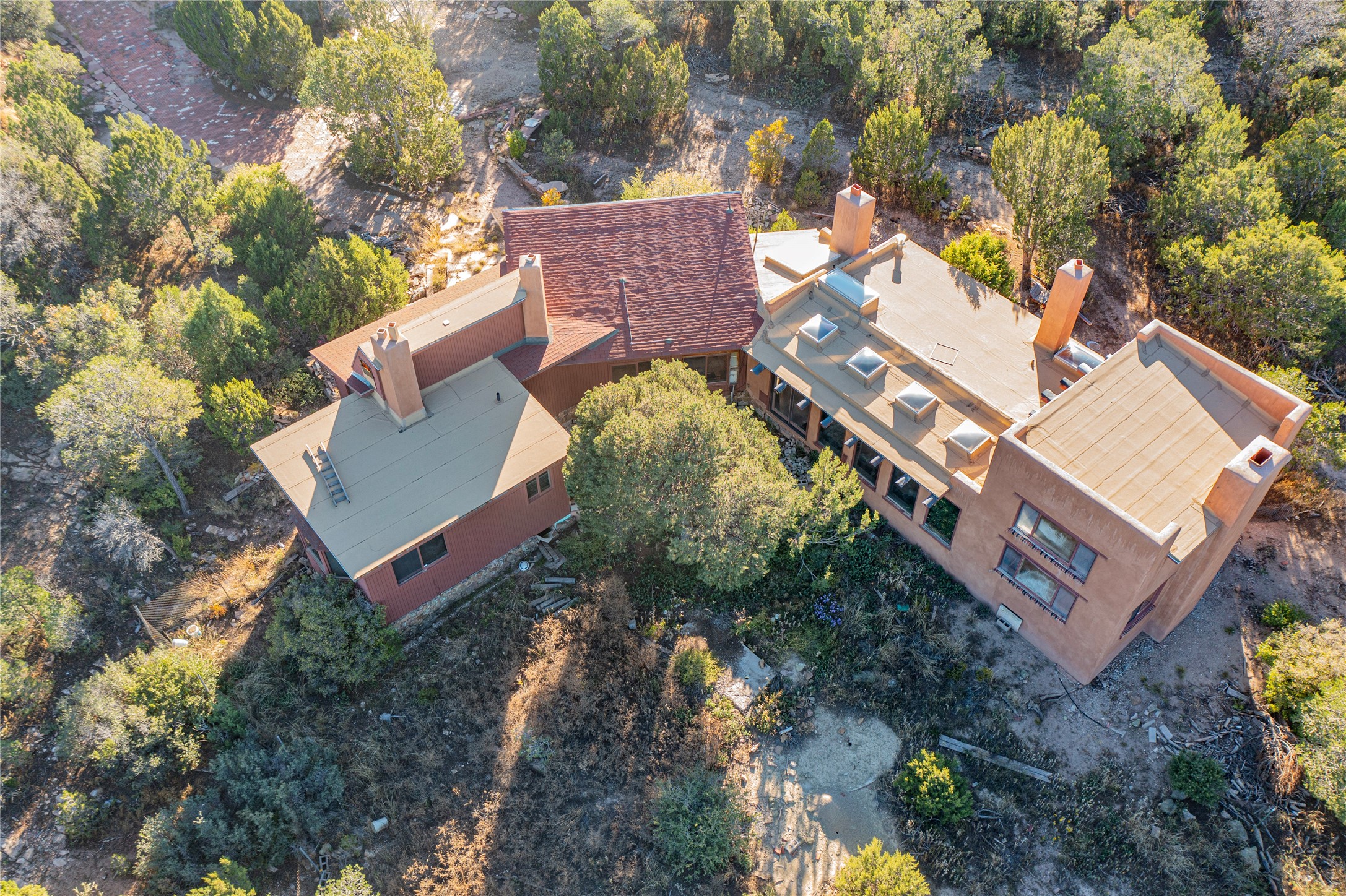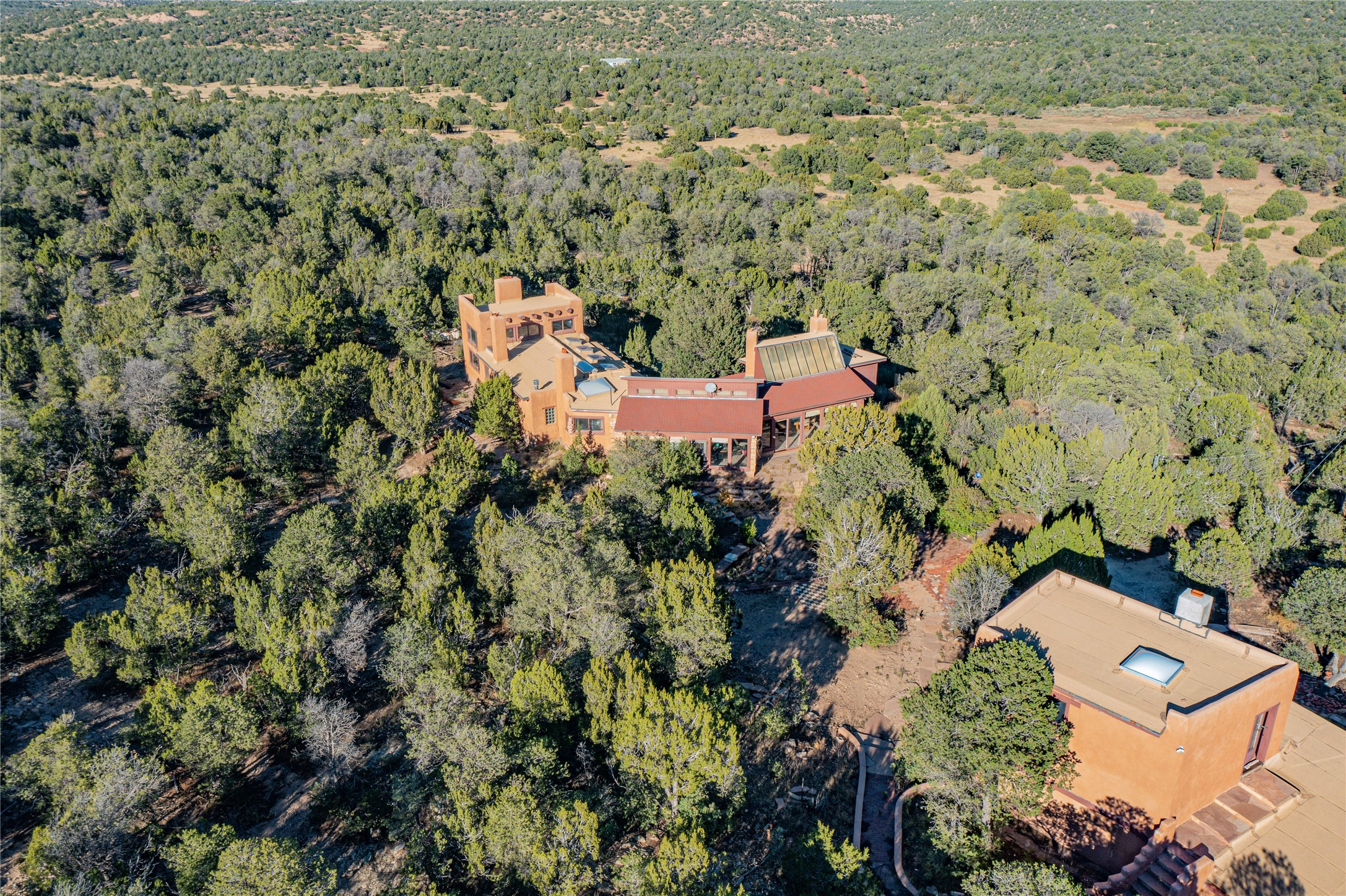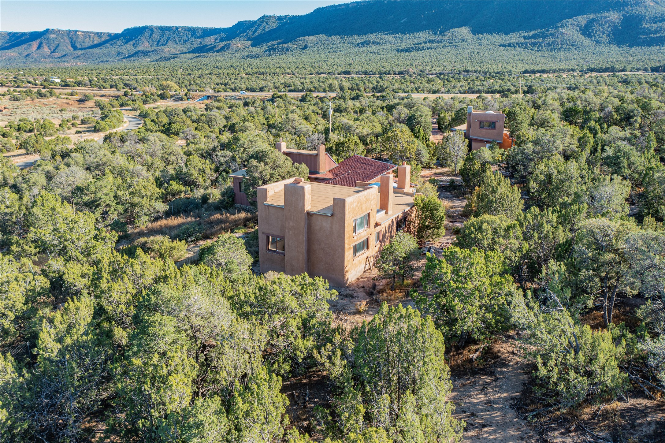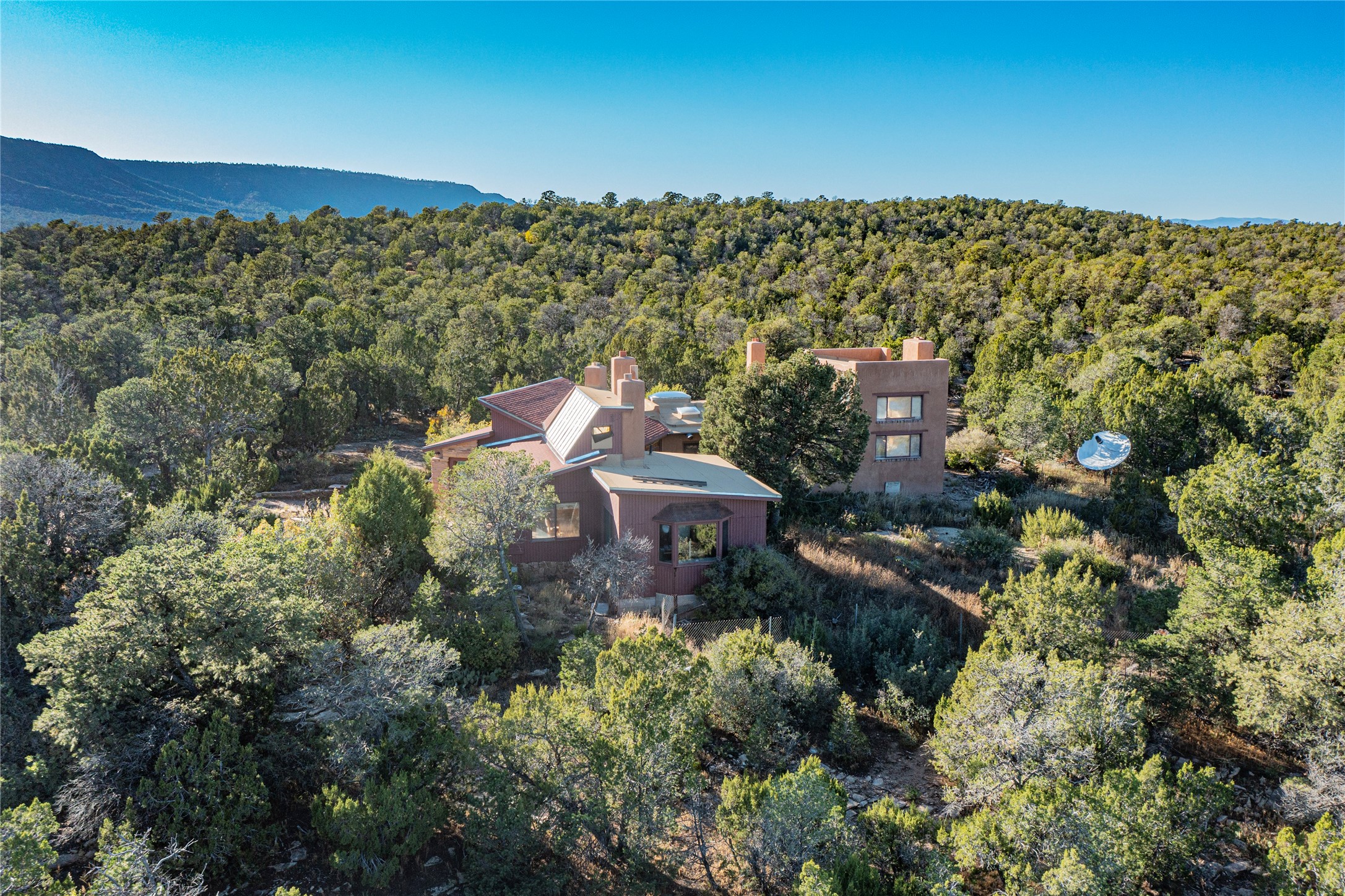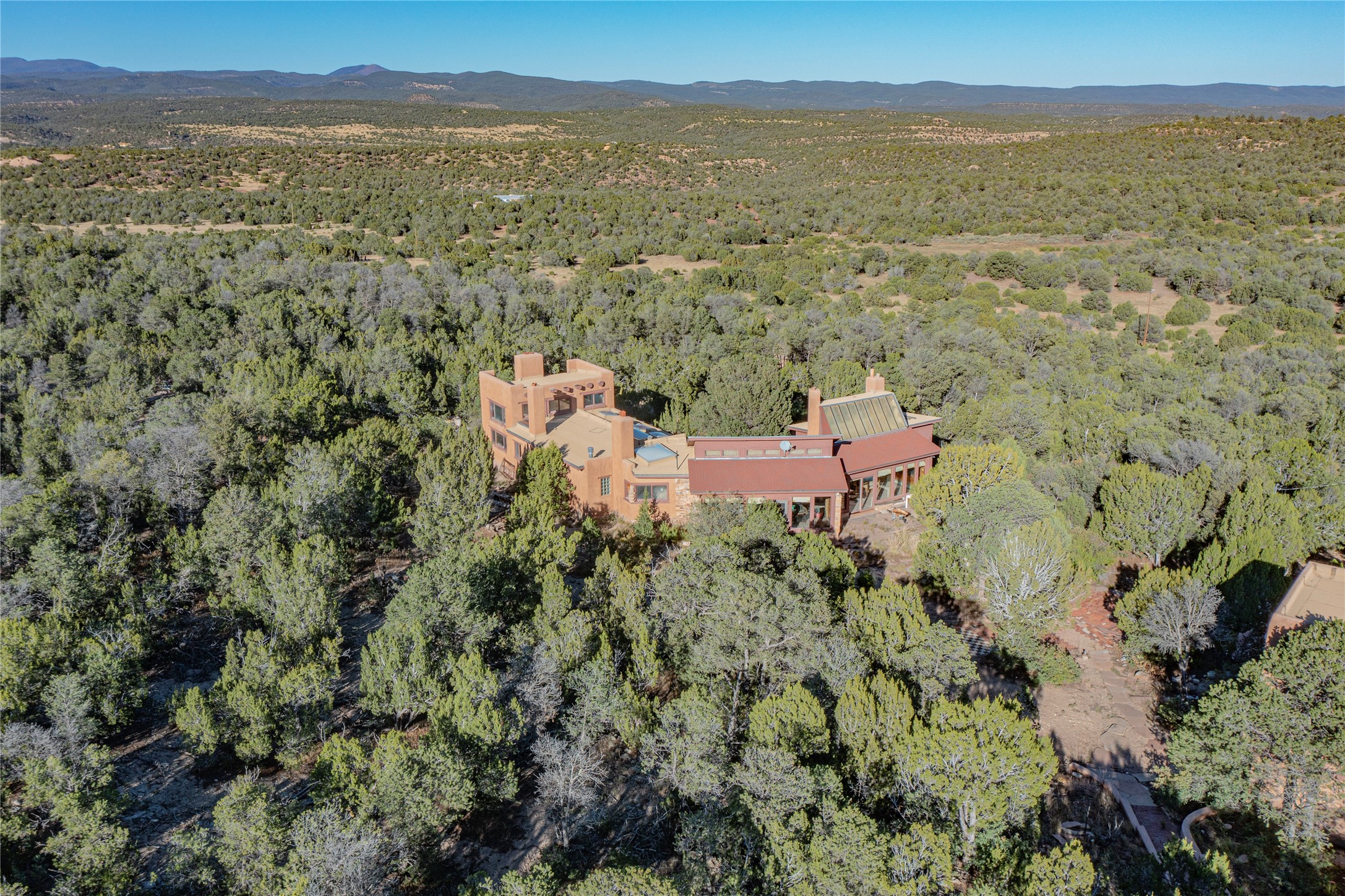 Handyman Special! This property has unlimited potential! If you've ever dreamed of owning your own private forest, this property comes with 42 acres of beautiful land; filled with abundant pine trees, native plants, and plenty of wildlife. This one of a kind, passive solar, private home has a NEW Septic Tank, recently updated roof, ample light, stunning flagstone and brick floors through out, vigas, 3 fireplaces and a wood burning stove and a 5-car garage that would fulfill a car collector's dream. Above the enormous garage there is a 300 sq ft private roof top studio. This home is busting with character and conveniently located 30 minutes from Santa Fe.