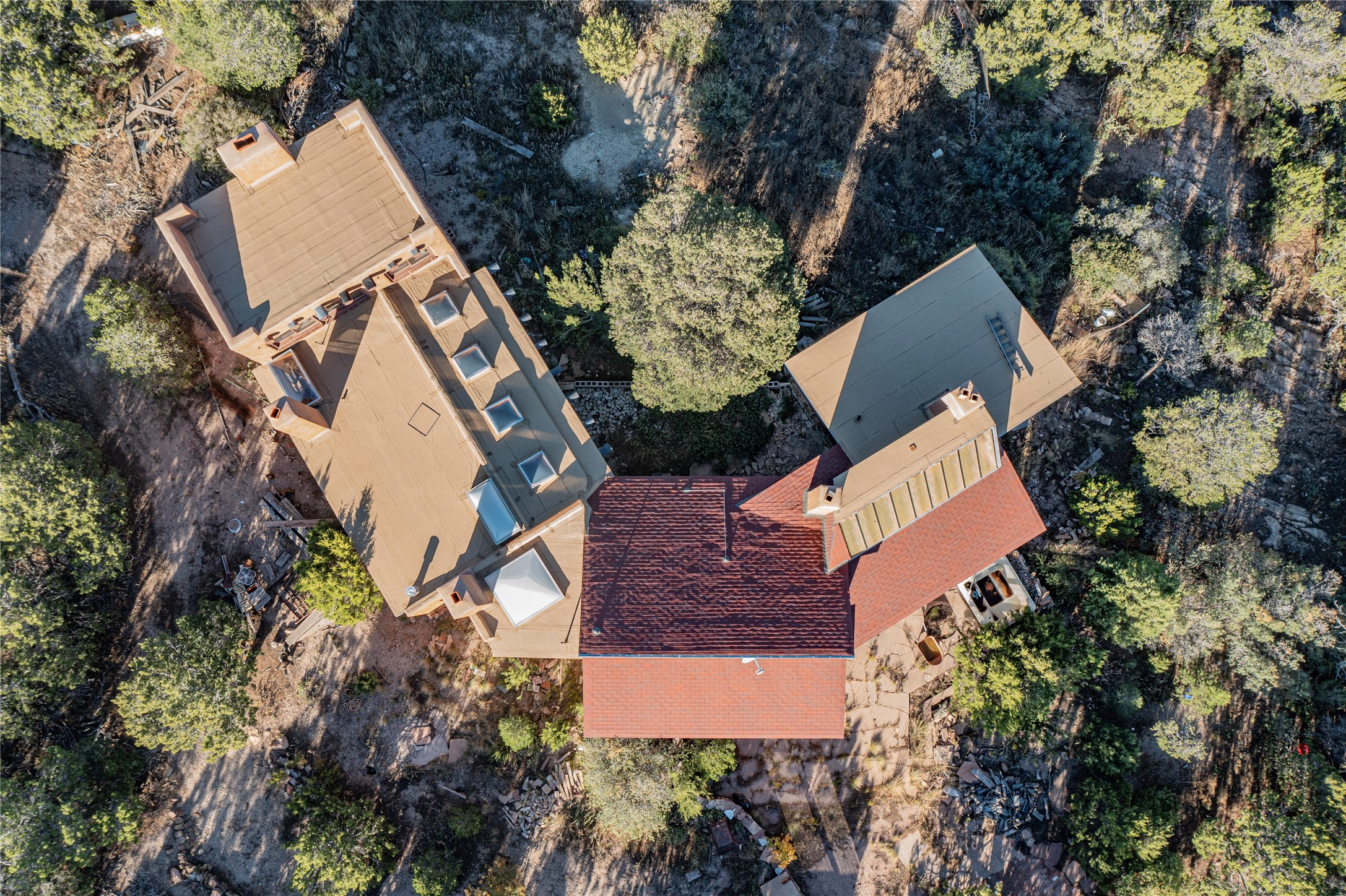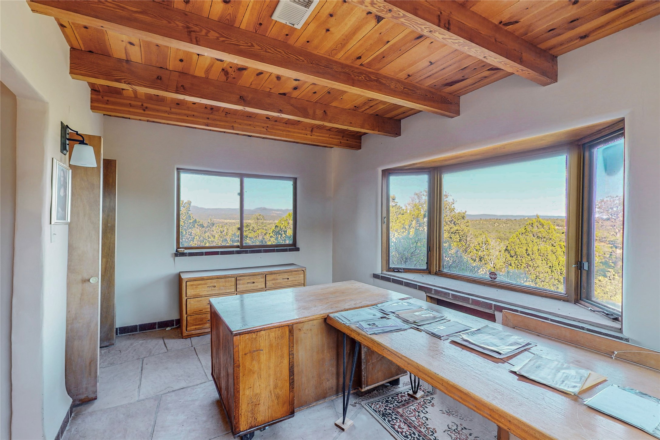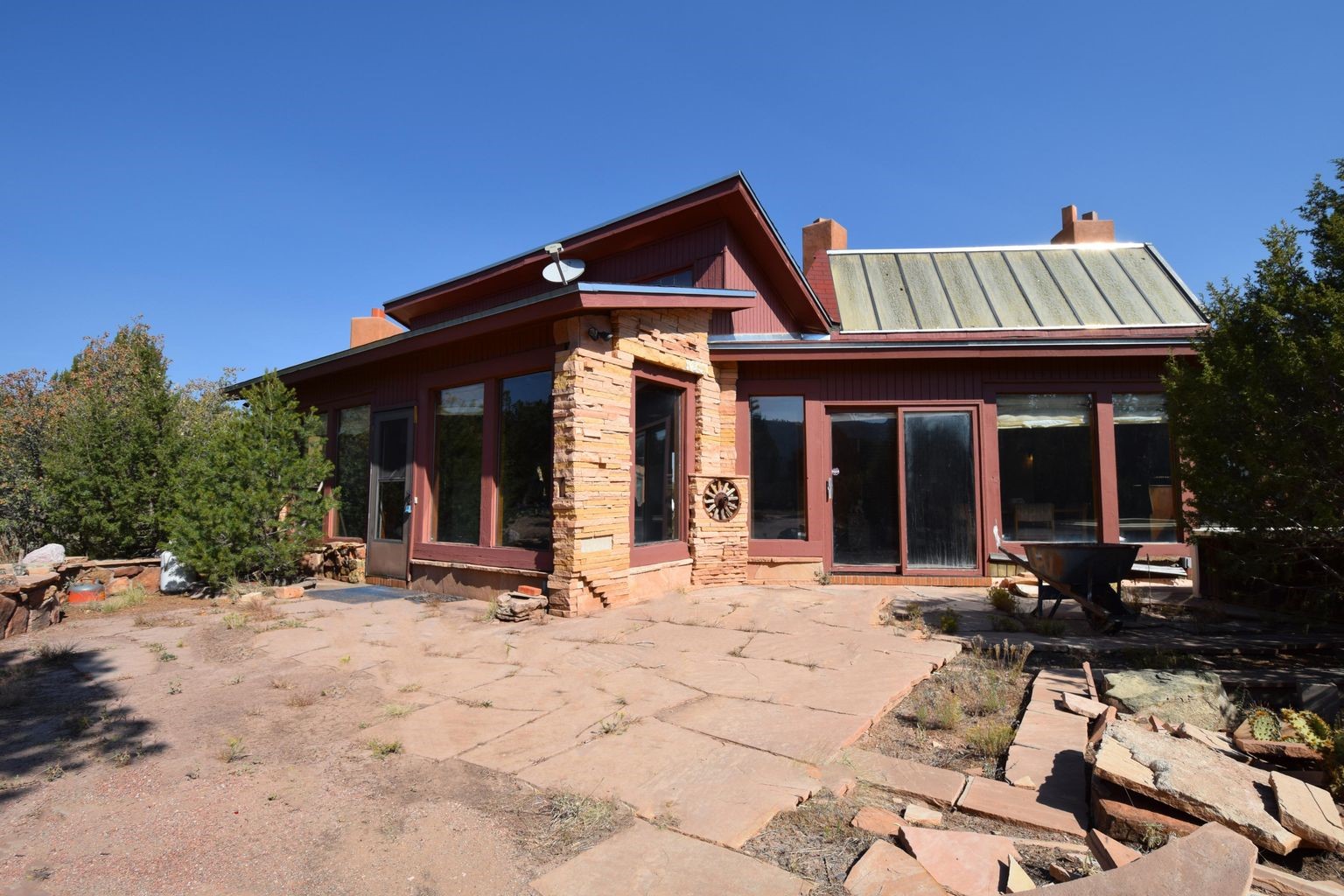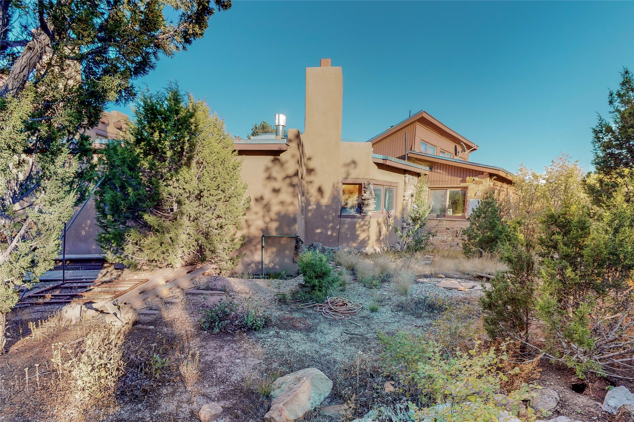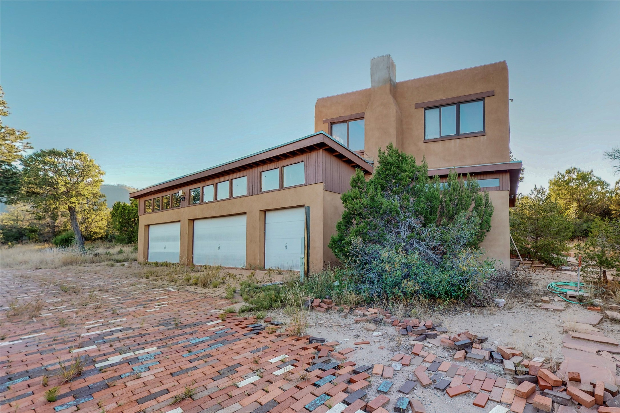 Handyman Special! This property has unlimited potential! If you've ever dreamed of owning your own private forest, this property comes with 42 acres of beautiful land; filled with abundant pine trees, native plants, and plenty of wildlife. This one of a kind, passive solar, private home has a NEW Septic Tank, recently updated roof, ample light, stunning flagstone and brick floors through out, vigas, 3 fireplaces and a wood burning stove and a 5-car garage that would fulfill a car collector's dream. Above the enormous garage there is a 300 sq ft private roof top studio. This home is busting with character and conveniently located 30 minutes from Santa Fe.