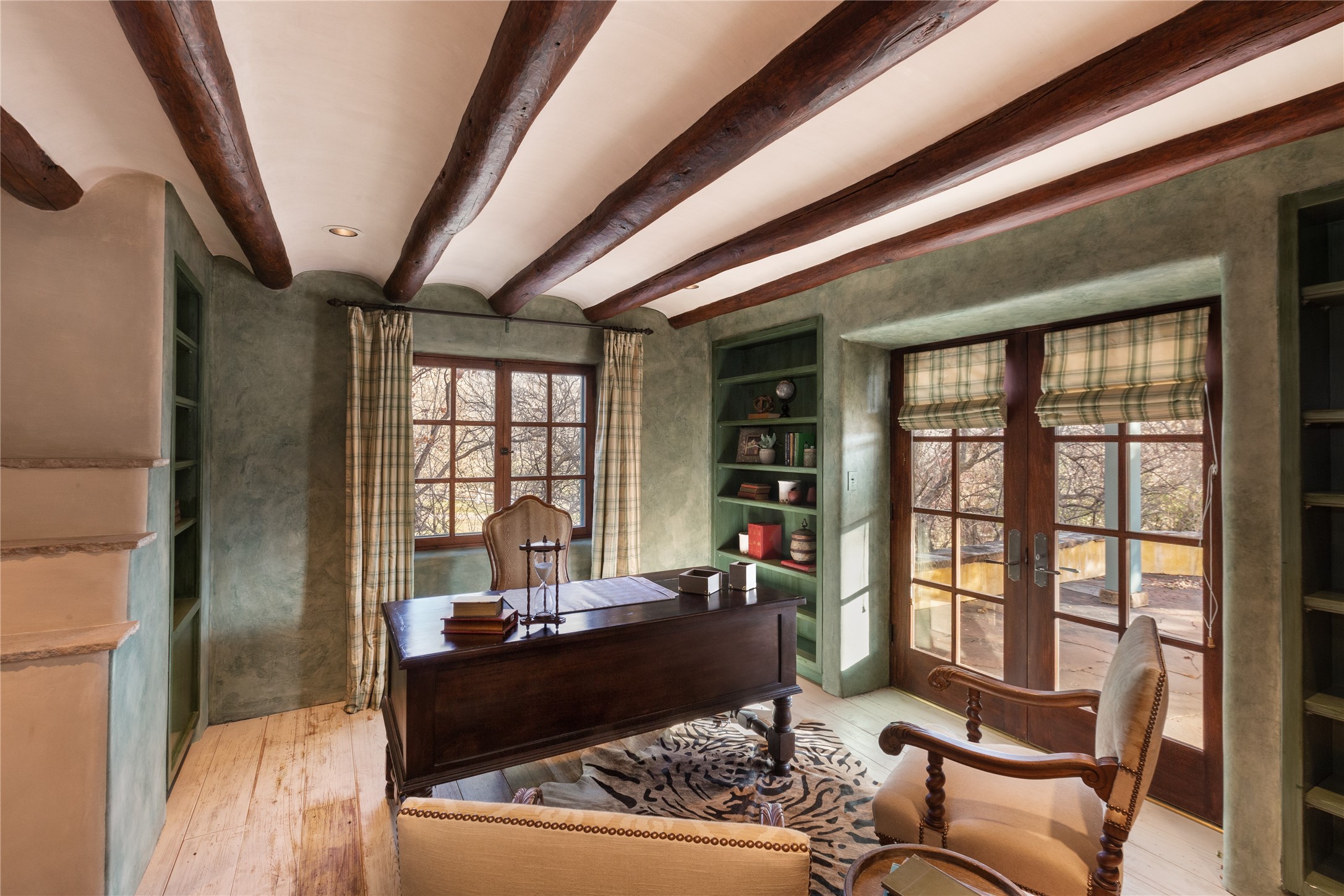 Follow the tree lined lane to this extraordinary verdant park like setting with a European inspired home. This spectacular property could be anywhere in the world and fortunately, it's right here! This 5.625 acre, 7,972 s.f. compound is comprised of 3 dwellings. The main house is 3 bedrooms and 4 baths, guest house has 1 bedroom bath and kitchen, caretaker's quarters with potting room and bath and the turret studio with bath/sauna and view filled upstairs bedroom/office with a private portal. This Territorial French inspired property has lots of light and exquisite details. The impressive kitchen is grand with a 6 burner plus Viking grill cooktop, a double hung Viking oven, Subzero refrigerator and wine cabinet. Stunning features include stone fireplace, stone floors, vaulted beam ceilings and authentic French doors, fixtures windows throughout. The living room is inviting with viga and plaster coved ceilings, custom built in- shelving and cabinetry, wet bar and library. Private well and acequia water rights convey with sale