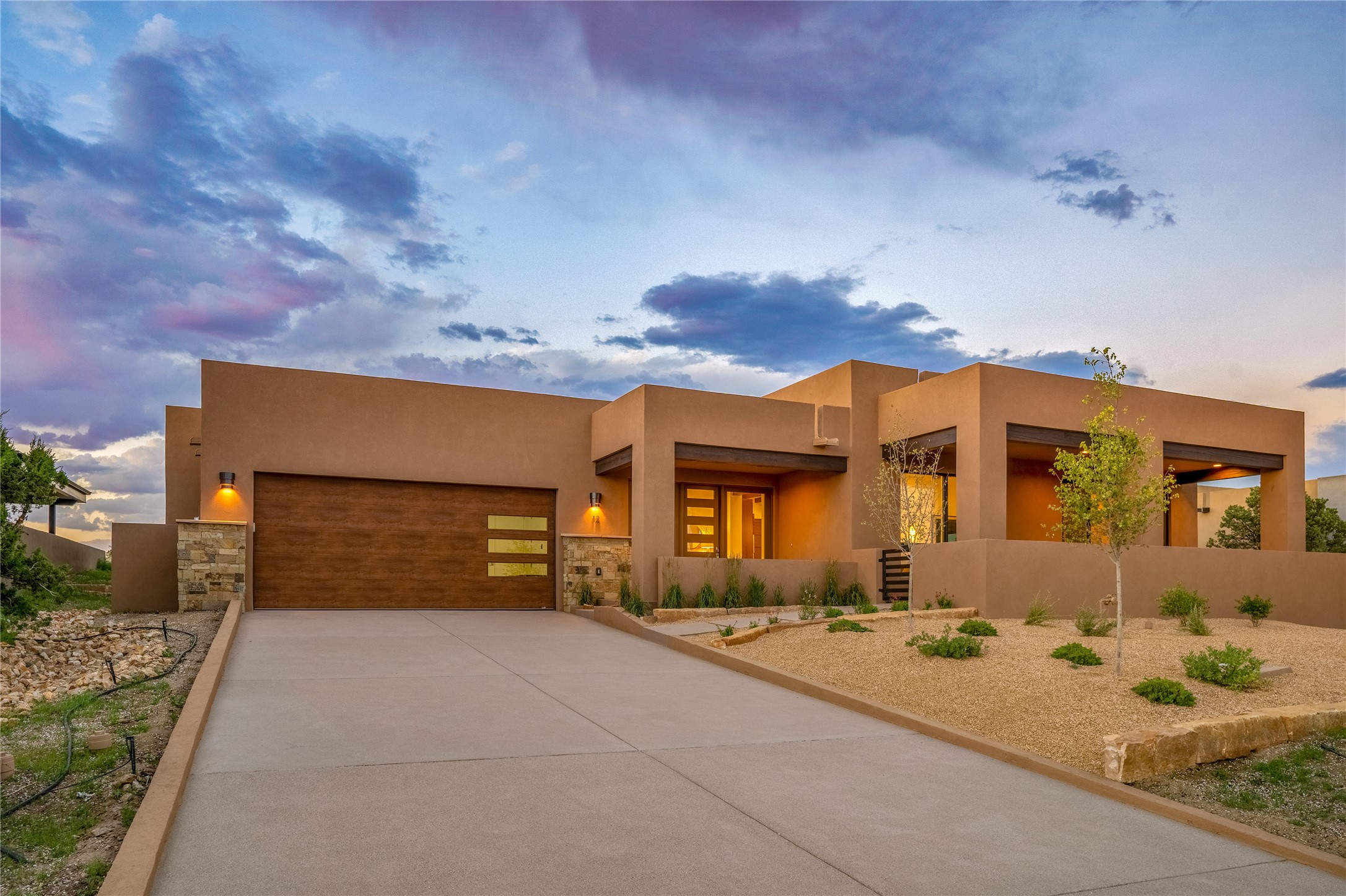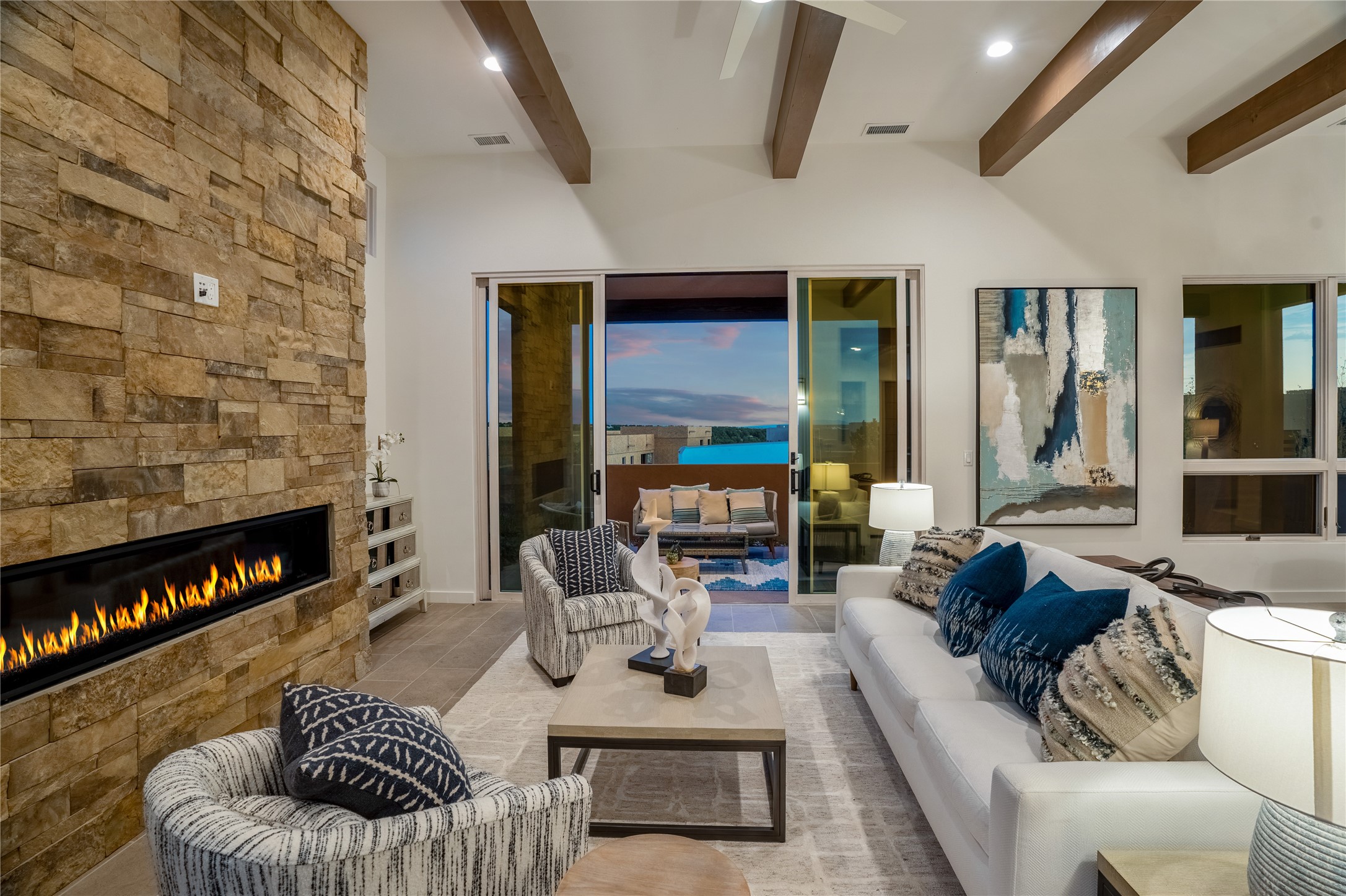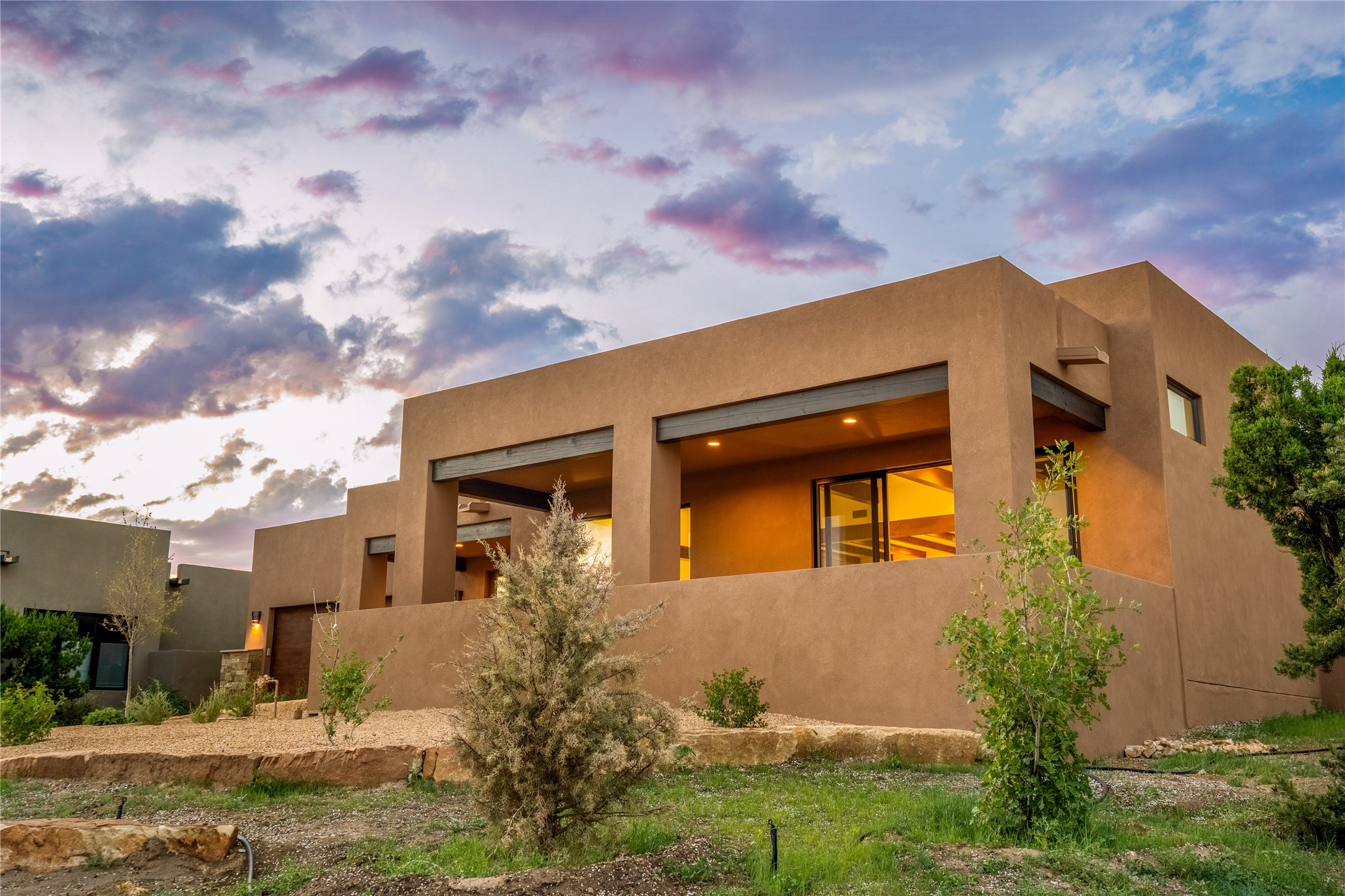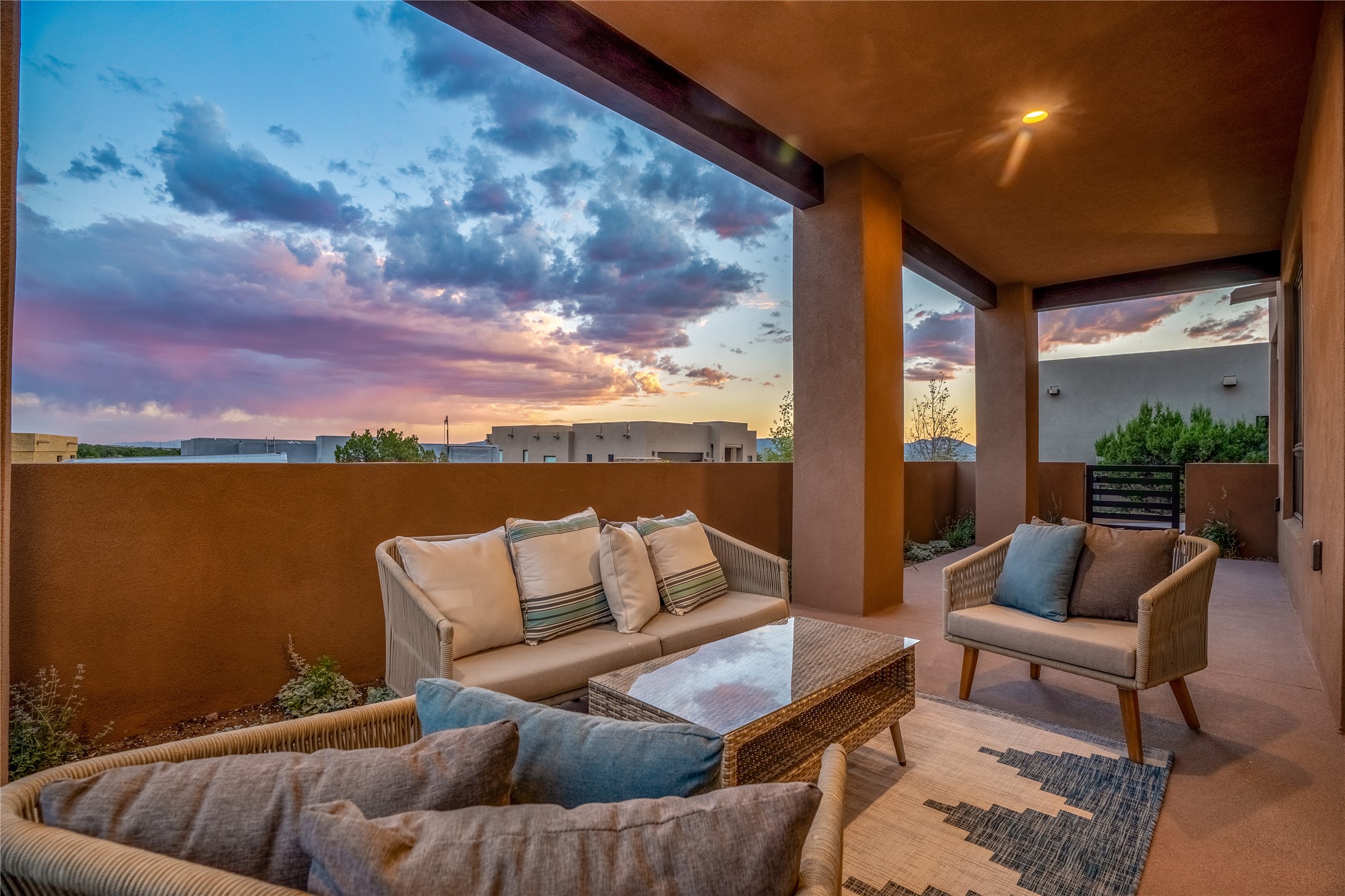 Just completed! Welcome to Valverde's exquisite Sunset floor plan, at 2,495 SF is a seamless blend of Pueblo Revival and Contemporary styles. Near the Las Campanas Sunset Golf Course, you'll enjoy mountain views and 3 outdoor living areas including a trellis covered courtyard patio. Inside you'll find a chef's dream kitchen with stainless steel Viking appliances, quartz countertops, solid wood cabinets, large pantry, all merging elegantly to dining and living areas with a large gas fireplace. The award-winning primary bedroom suite has its own portal, walk-in closet, and bathroom with curbless shower, large tub, and dual sinks. A shared bathroom connects two additional bedrooms/office. HOA fees include road and common area maintenance, 24-hour roaming security, and 24-hour EMTs on site. Membership to The Club at Las Campanas is optional. Club amenities include indoor and outdoor swimming, tennis, fitness facility, equestrian, fine dining, and two Jack Nicklaus Signature Golf Courses.
