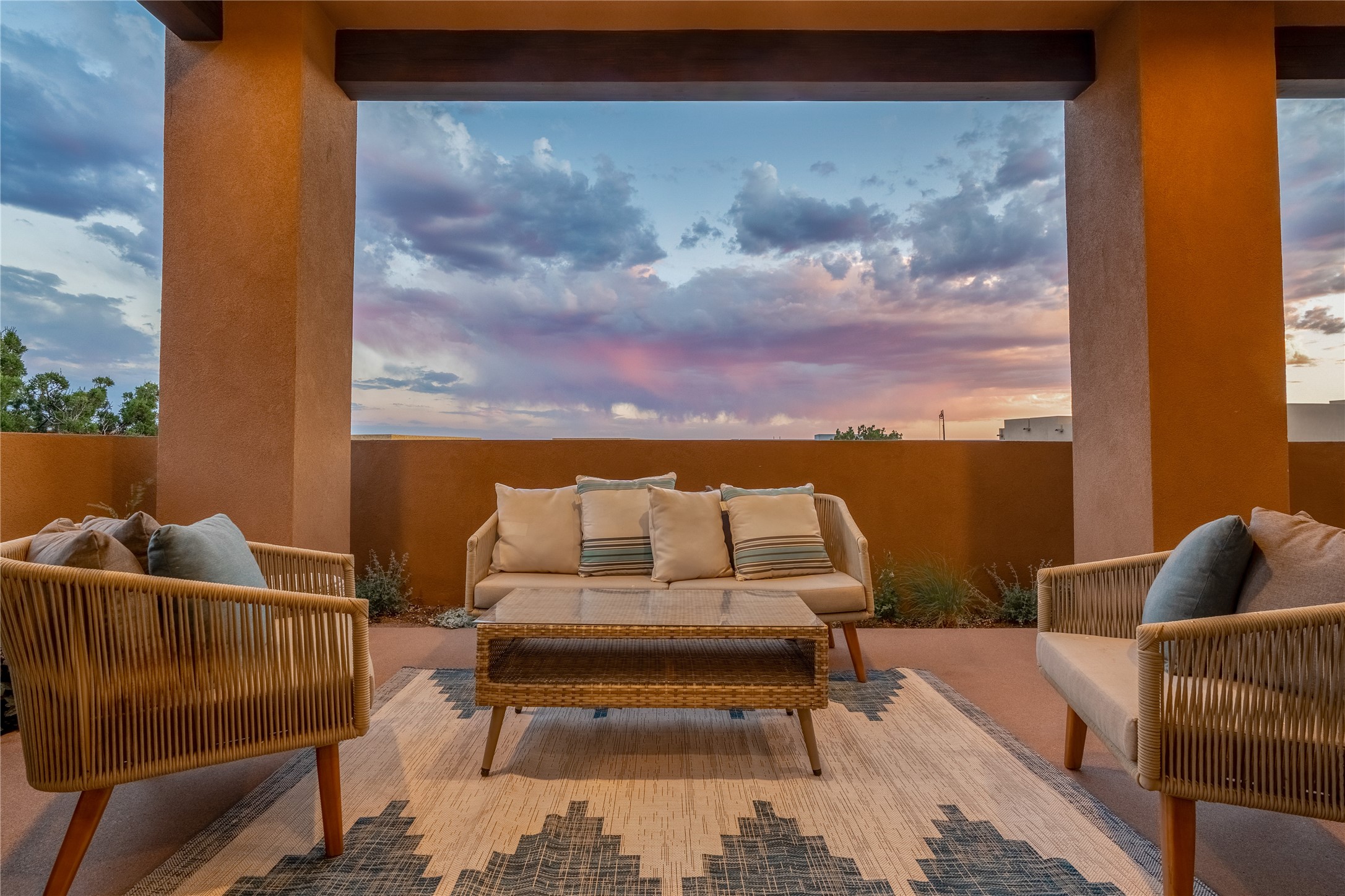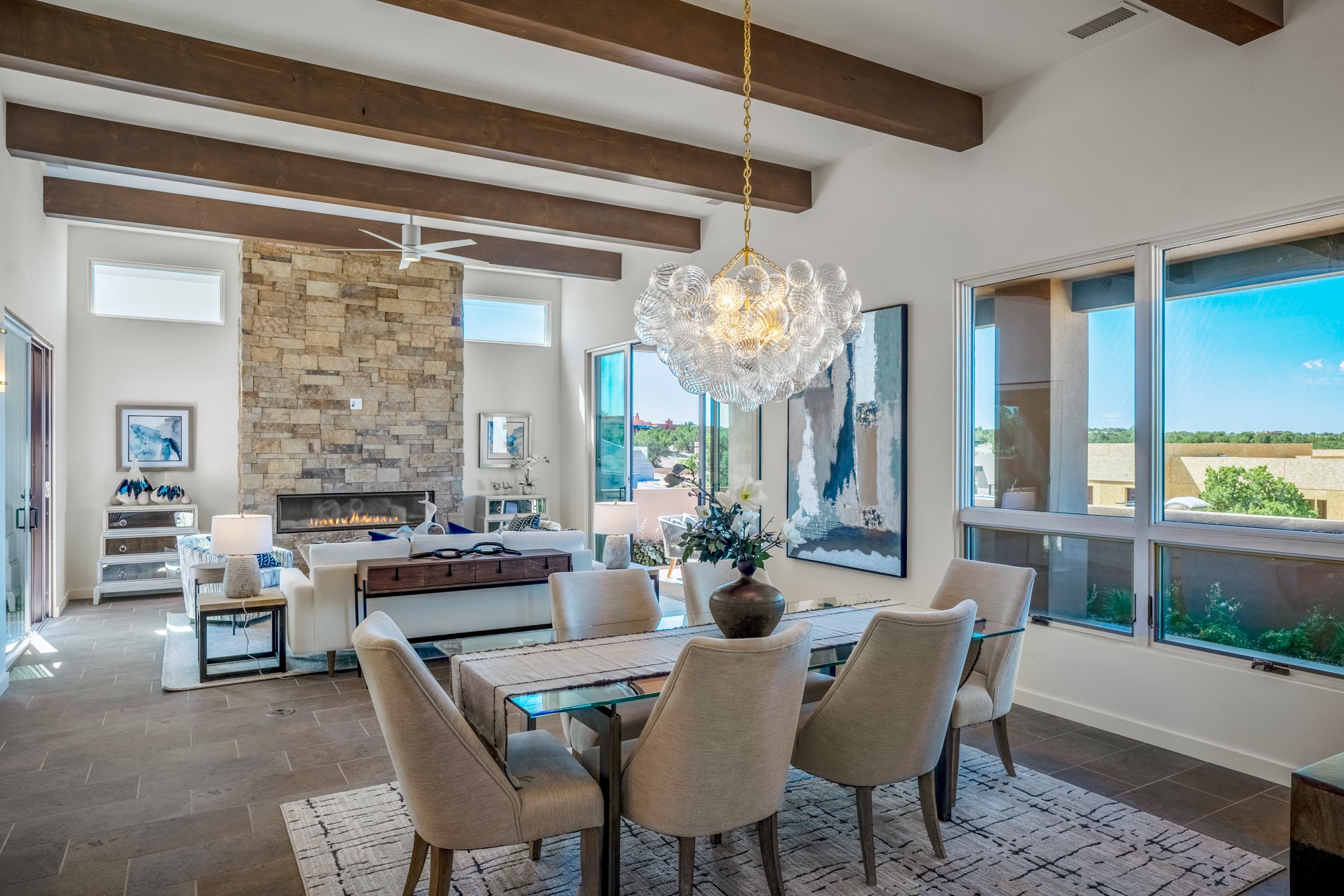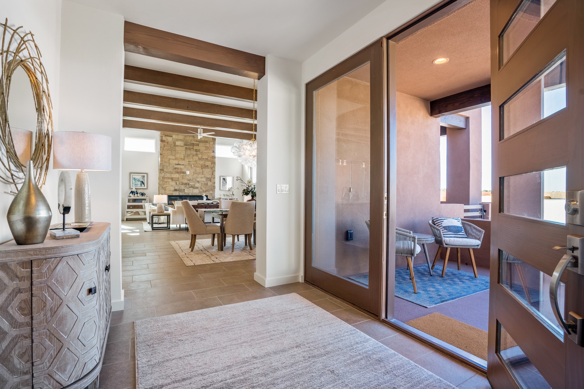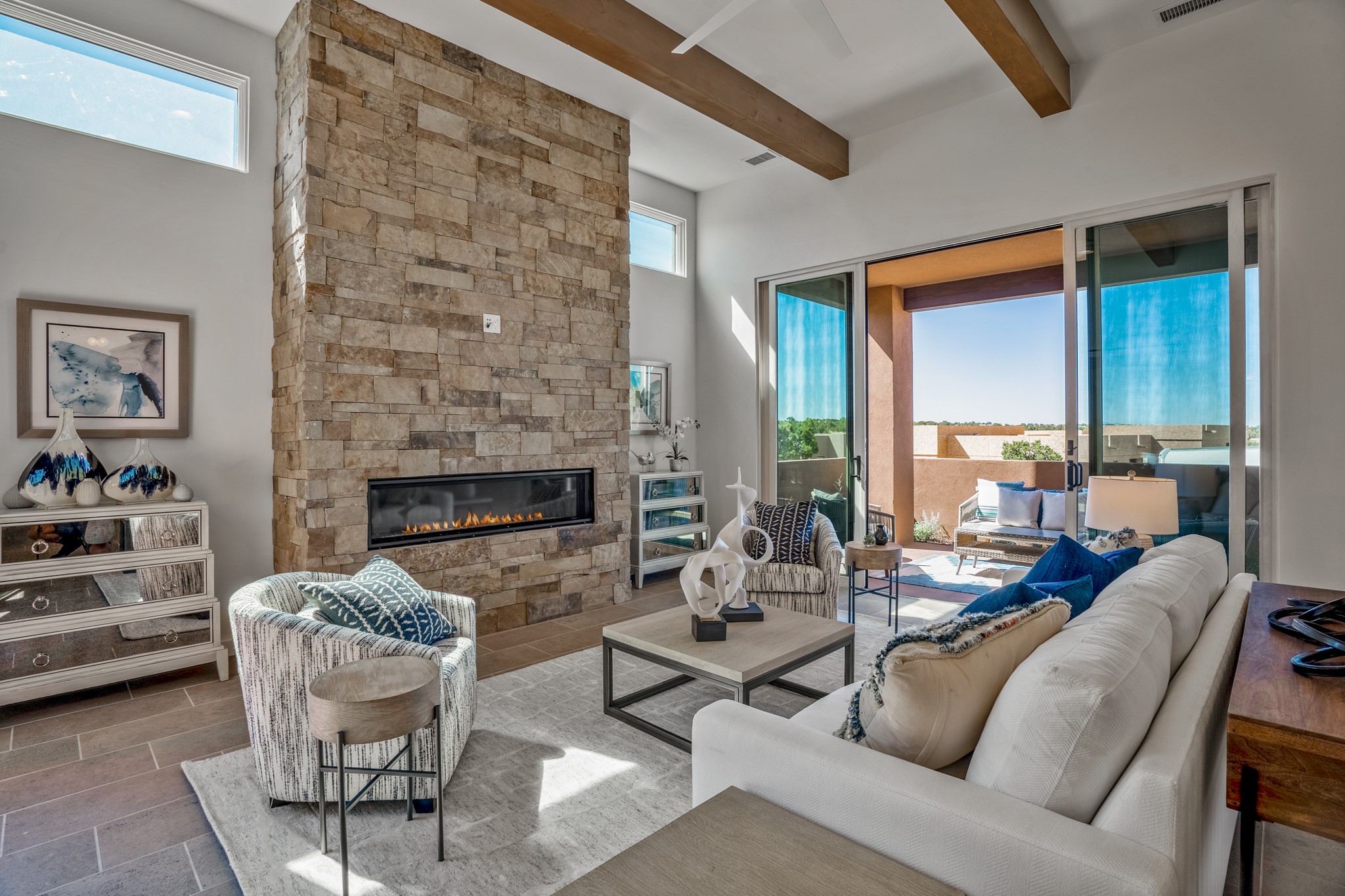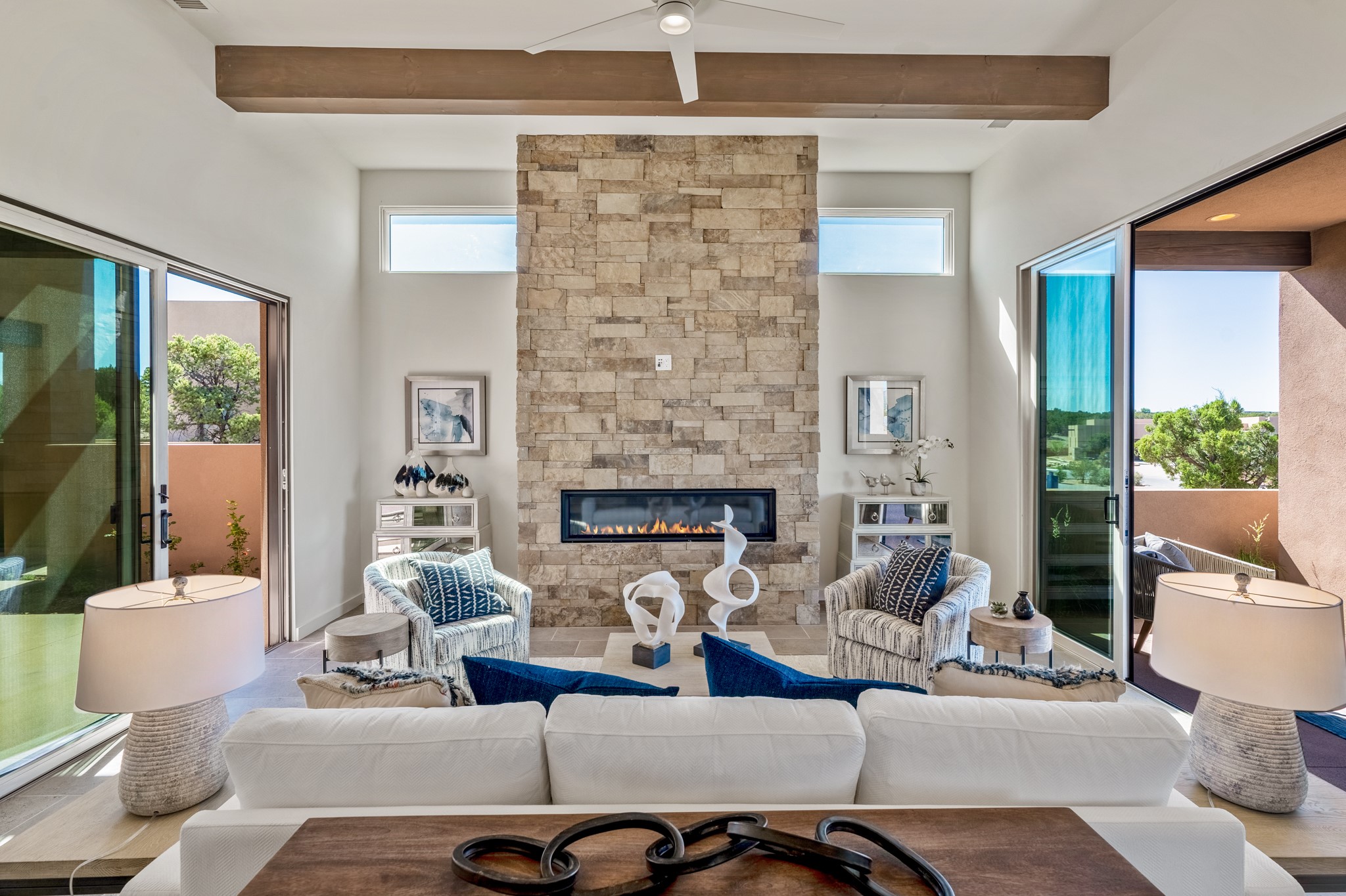 Just completed! Welcome to Valverde's exquisite Sunset floor plan, at 2,495 SF is a seamless blend of Pueblo Revival and Contemporary styles. Near the Las Campanas Sunset Golf Course, you'll enjoy mountain views and 3 outdoor living areas including a trellis covered courtyard patio. Inside you'll find a chef's dream kitchen with stainless steel Viking appliances, quartz countertops, solid wood cabinets, large pantry, all merging elegantly to dining and living areas with a large gas fireplace. The award-winning primary bedroom suite has its own portal, walk-in closet, and bathroom with curbless shower, large tub, and dual sinks. A shared bathroom connects two additional bedrooms/office. HOA fees include road and common area maintenance, 24-hour roaming security, and 24-hour EMTs on site. Membership to The Club at Las Campanas is optional. Club amenities include indoor and outdoor swimming, tennis, fitness facility, equestrian, fine dining, and two Jack Nicklaus Signature Golf Courses.