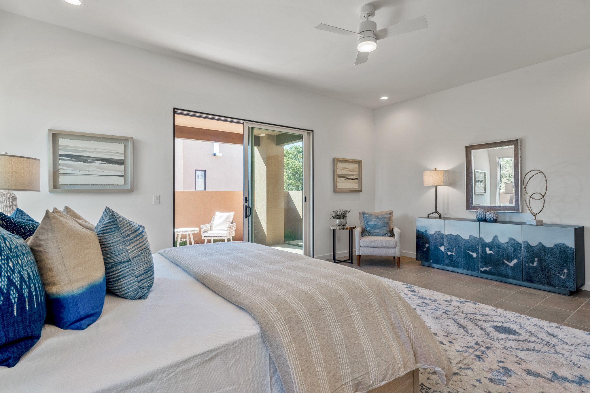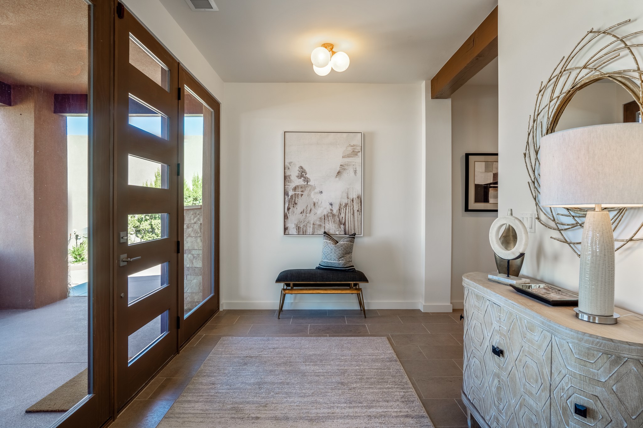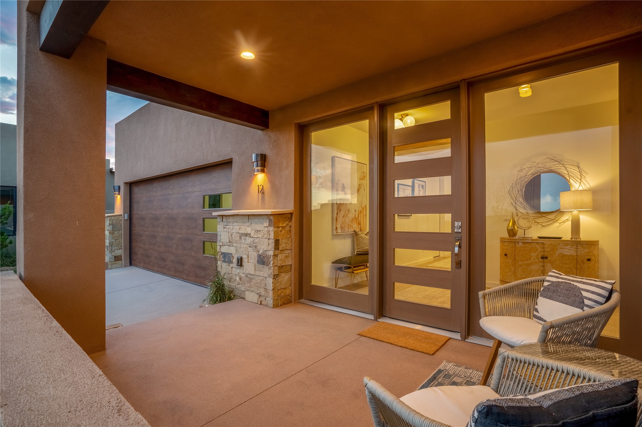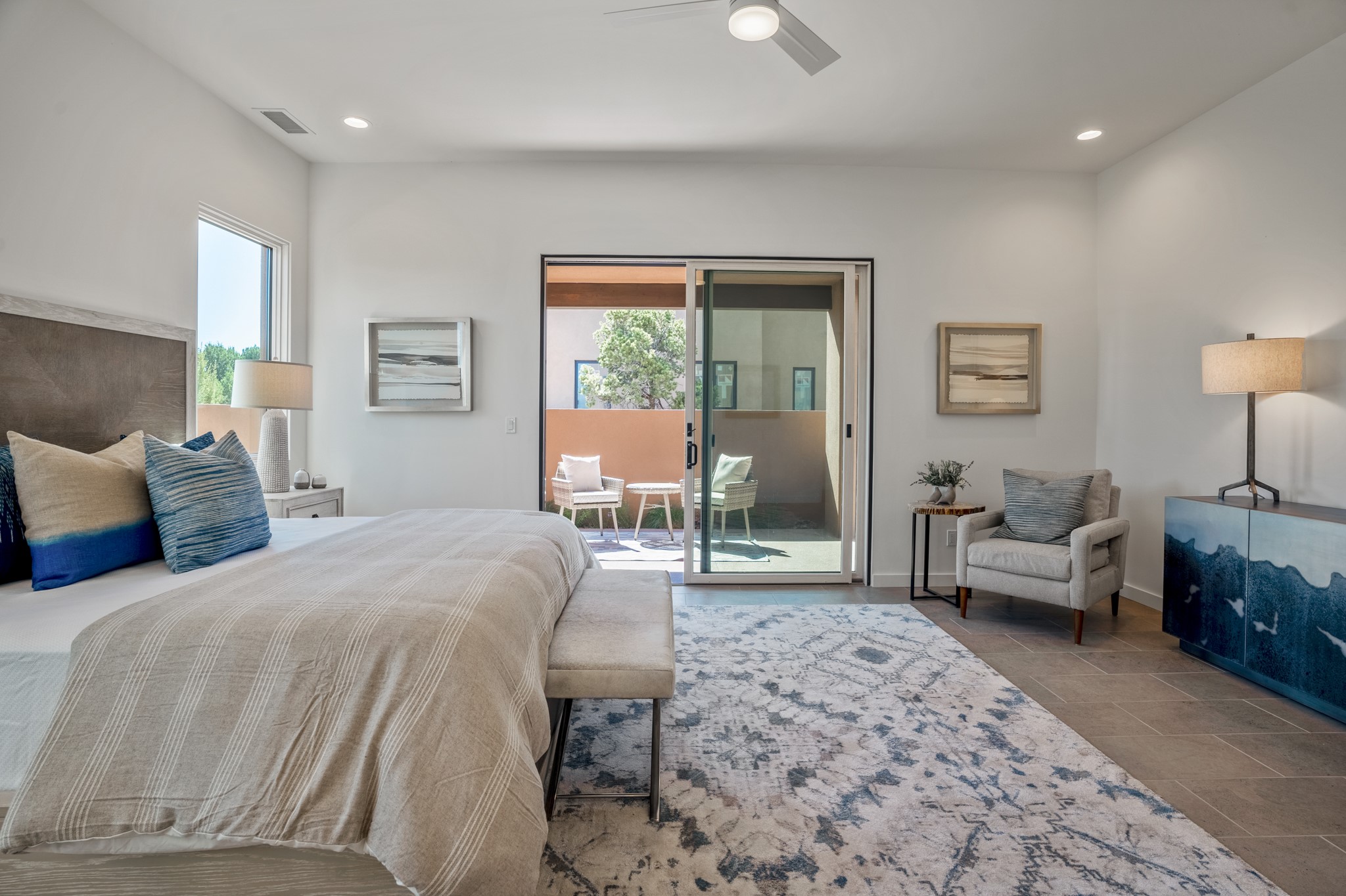 Just completed! Welcome to Valverde's exquisite Sunset floor plan, at 2,495 SF is a seamless blend of Pueblo Revival and Contemporary styles. Near the Las Campanas Sunset Golf Course, you'll enjoy mountain views and 3 outdoor living areas including a trellis covered courtyard patio. Inside you'll find a chef's dream kitchen with stainless steel Viking appliances, quartz countertops, solid wood cabinets, large pantry, all merging elegantly to dining and living areas with a large gas fireplace. The award-winning primary bedroom suite has its own portal, walk-in closet, and bathroom with curbless shower, large tub, and dual sinks. A shared bathroom connects two additional bedrooms/office. HOA fees include road and common area maintenance, 24-hour roaming security, and 24-hour EMTs on site. Membership to The Club at Las Campanas is optional. Club amenities include indoor and outdoor swimming, tennis, fitness facility, equestrian, fine dining, and two Jack Nicklaus Signature Golf Courses.