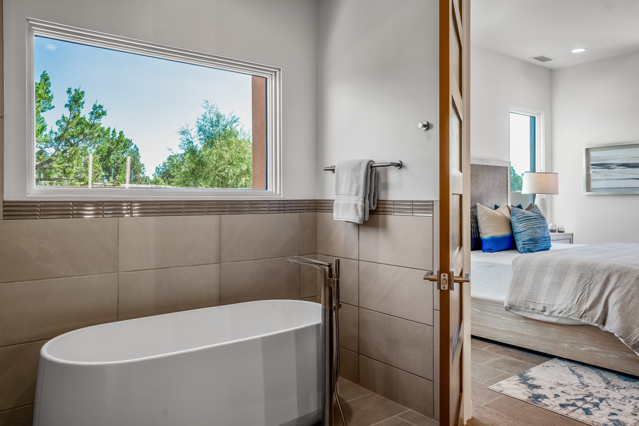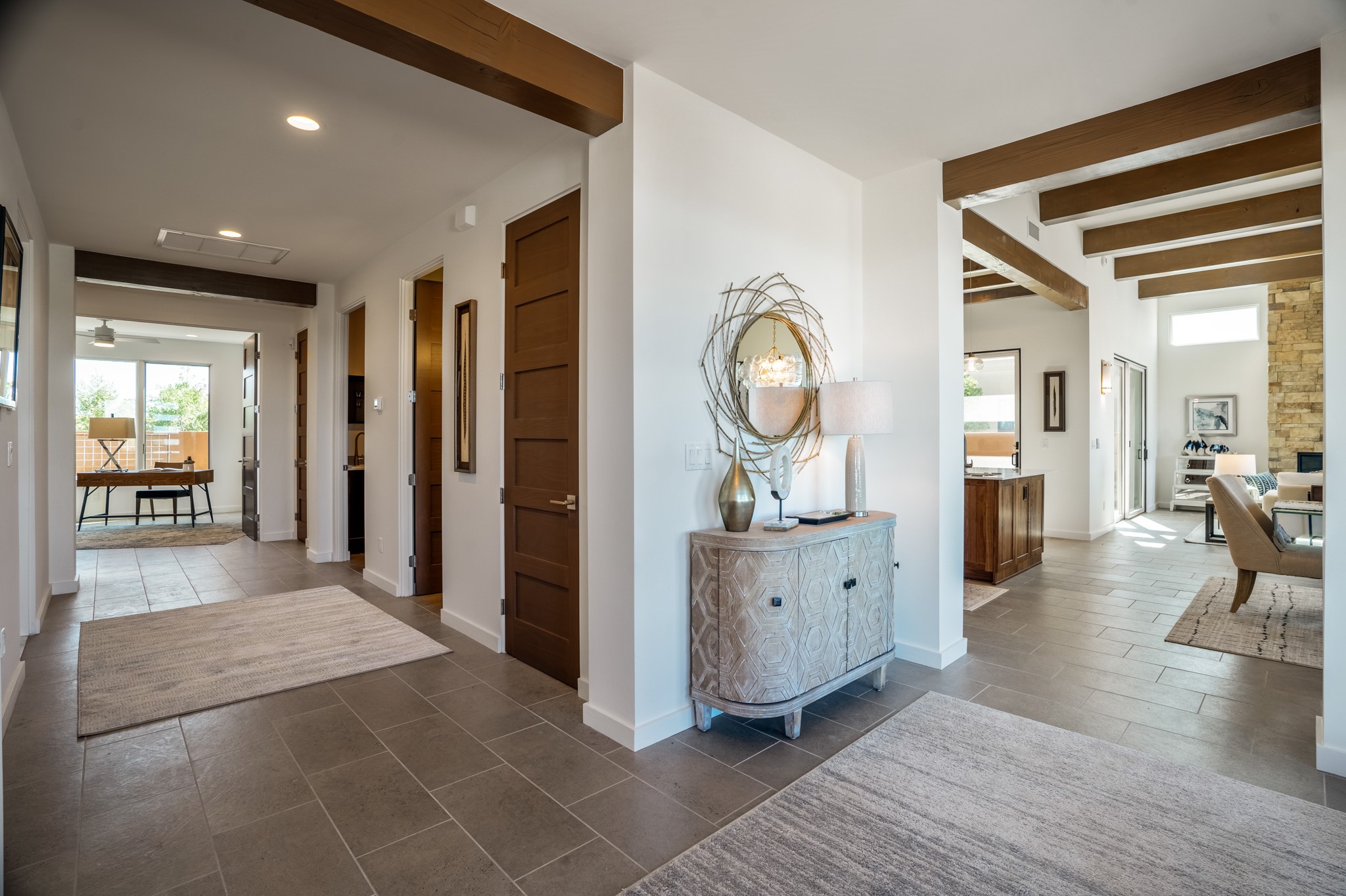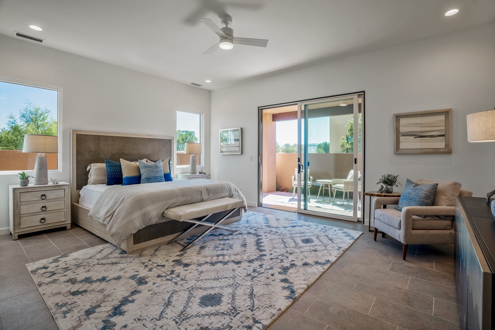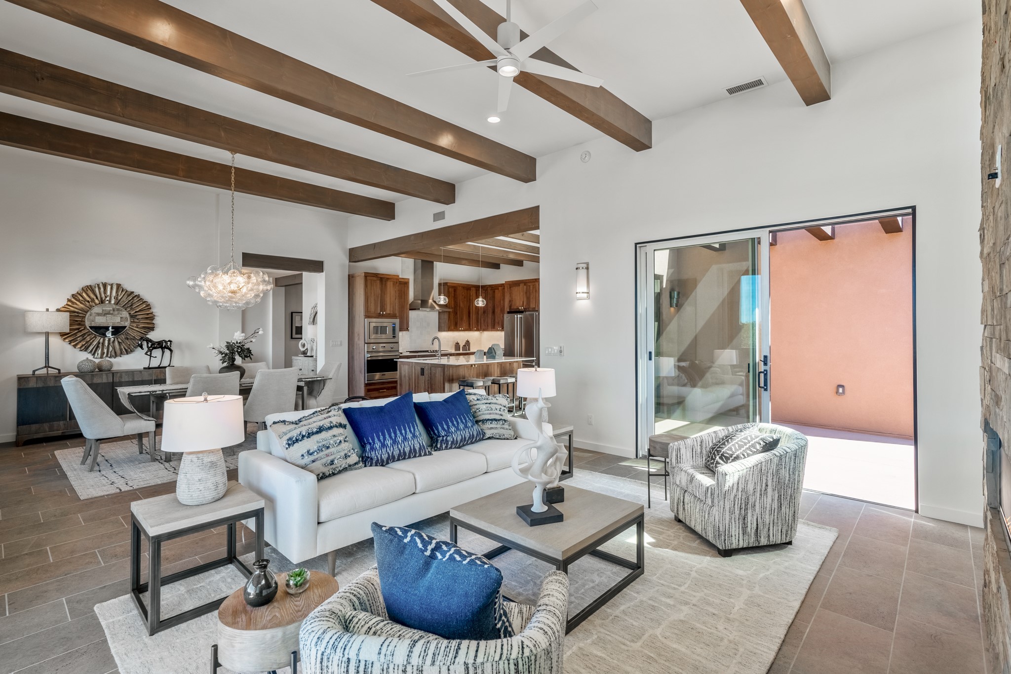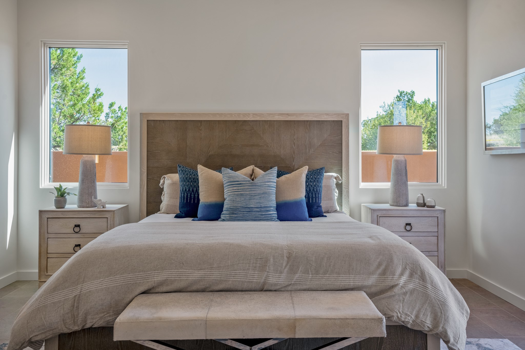 Just completed! Welcome to Valverde's exquisite Sunset floor plan, at 2,495 SF is a seamless blend of Pueblo Revival and Contemporary styles. Near the Las Campanas Sunset Golf Course, you'll enjoy mountain views and 3 outdoor living areas including a trellis covered courtyard patio. Inside you'll find a chef's dream kitchen with stainless steel Viking appliances, quartz countertops, solid wood cabinets, large pantry, all merging elegantly to dining and living areas with a large gas fireplace. The award-winning primary bedroom suite has its own portal, walk-in closet, and bathroom with curbless shower, large tub, and dual sinks. A shared bathroom connects two additional bedrooms/office. HOA fees include road and common area maintenance, 24-hour roaming security, and 24-hour EMTs on site. Membership to The Club at Las Campanas is optional. Club amenities include indoor and outdoor swimming, tennis, fitness facility, equestrian, fine dining, and two Jack Nicklaus Signature Golf Courses.