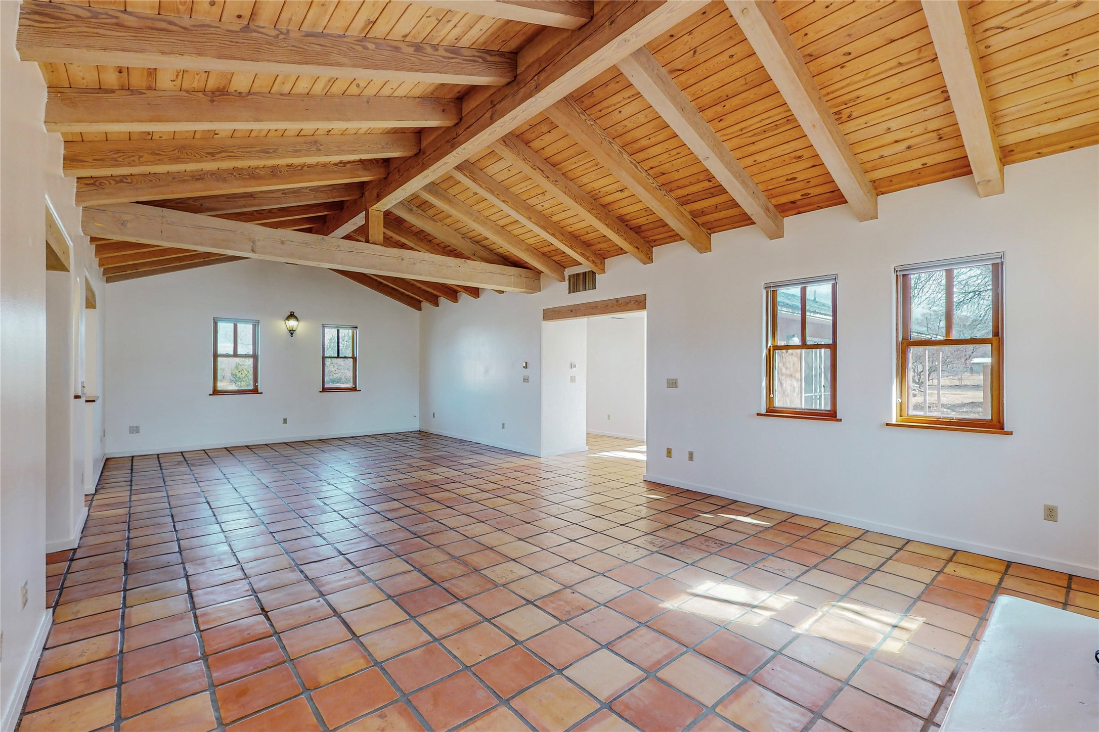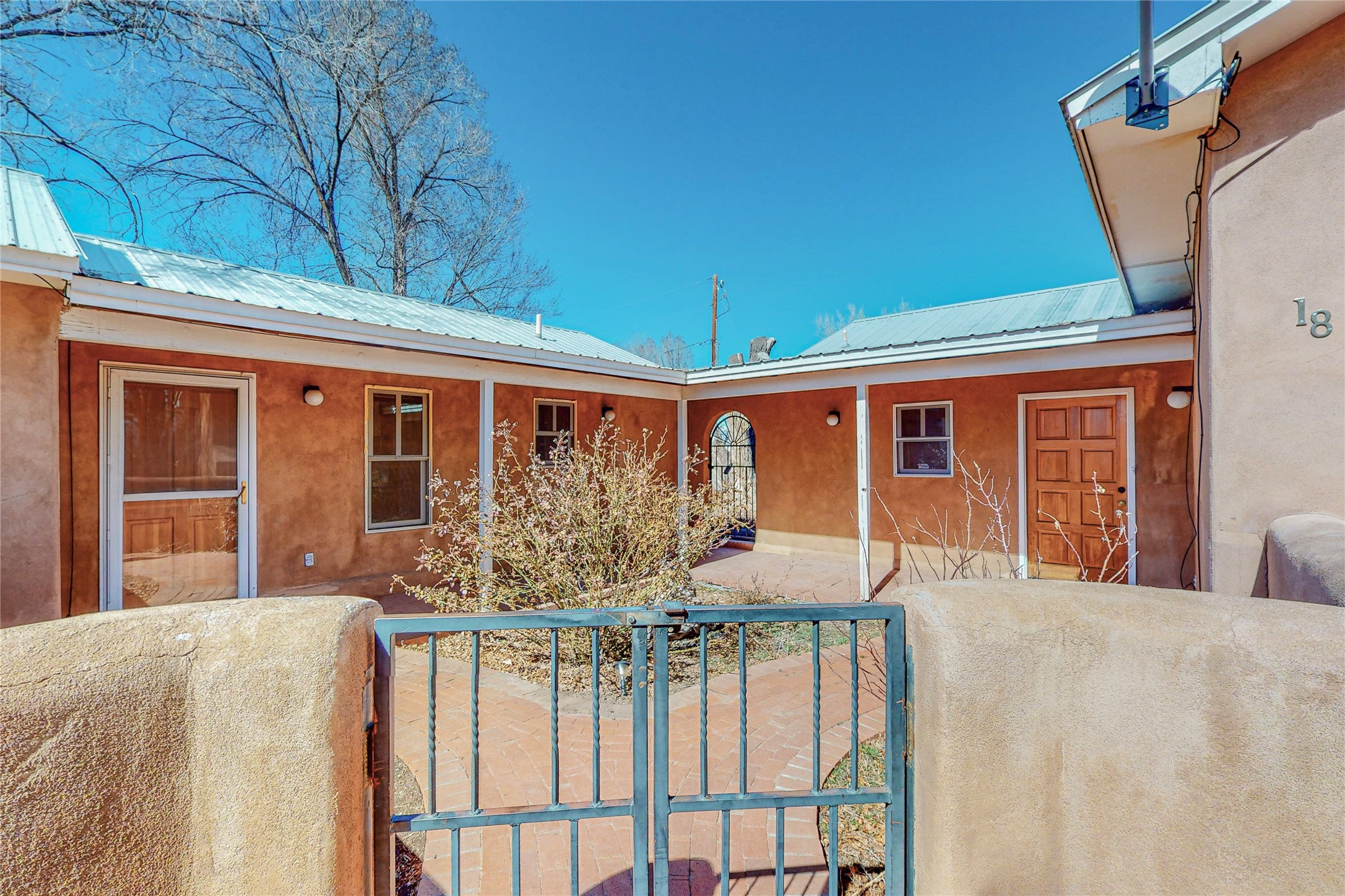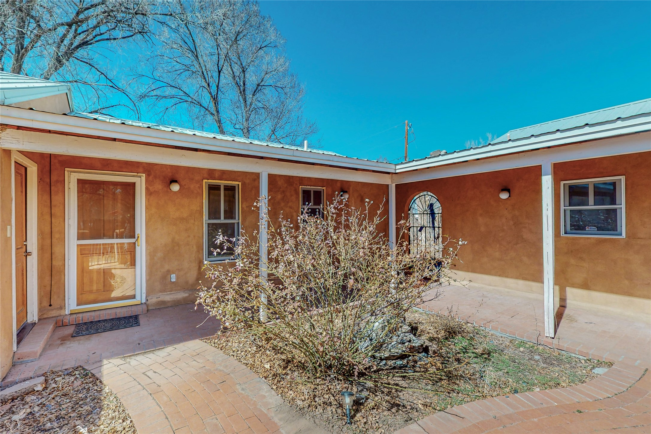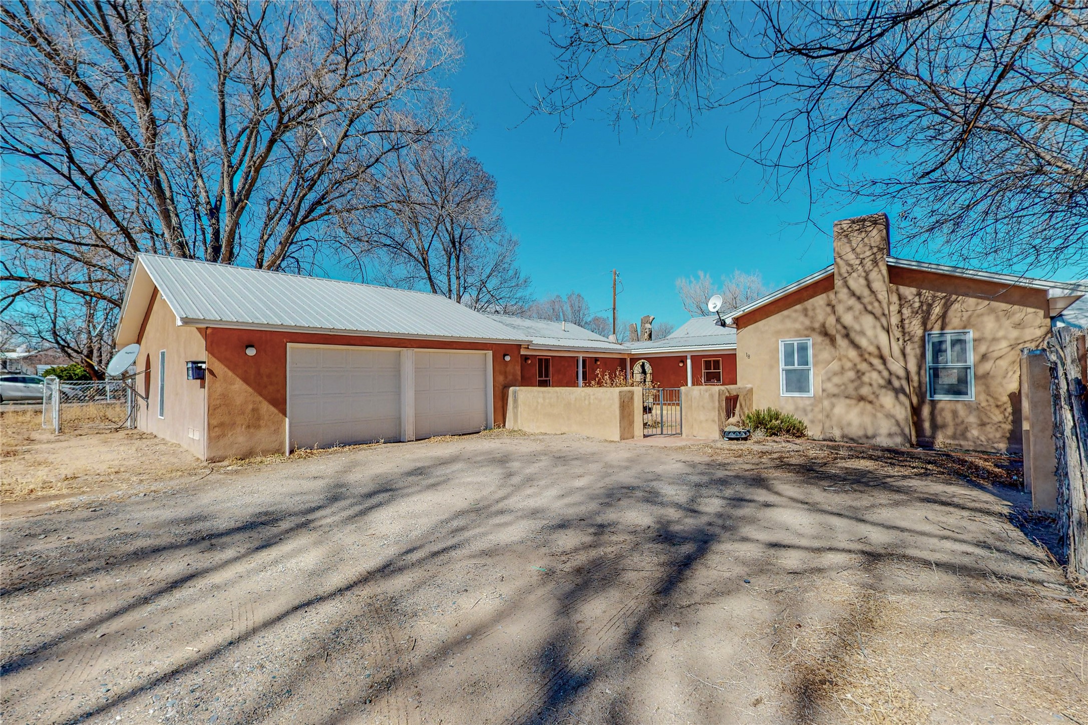 Smack dab in the middle between Santa Fe and Los Alamos, and set way back on the lot, is this Northern New Mexican pitched metal roof charmer. In a quiet rural Sombrillo setting, this custom built home has an oversized 2-car garage and one bedroom guest house on a 1/2 acre with a private well which makes this a horticulturists' delight! Walled and gated courtyard leads to the front L-shaped portal with beamed ceiling and brick floors. Gracious open concept Living/Dining Room with Cathedral vaulted beamed ceiling, saltillo tile floors and fireplace. Kitchen and the large utility room is adjacent. Wide sun drenched hallway could easily be a sitting area/office or solarium and leads to the newly carpeted ensuite Master and guest bedroom. Tons of natural light and windows. New HVAC in house and guest house. Plenty of off-street parking for your vehicles, boats and an RV or two.