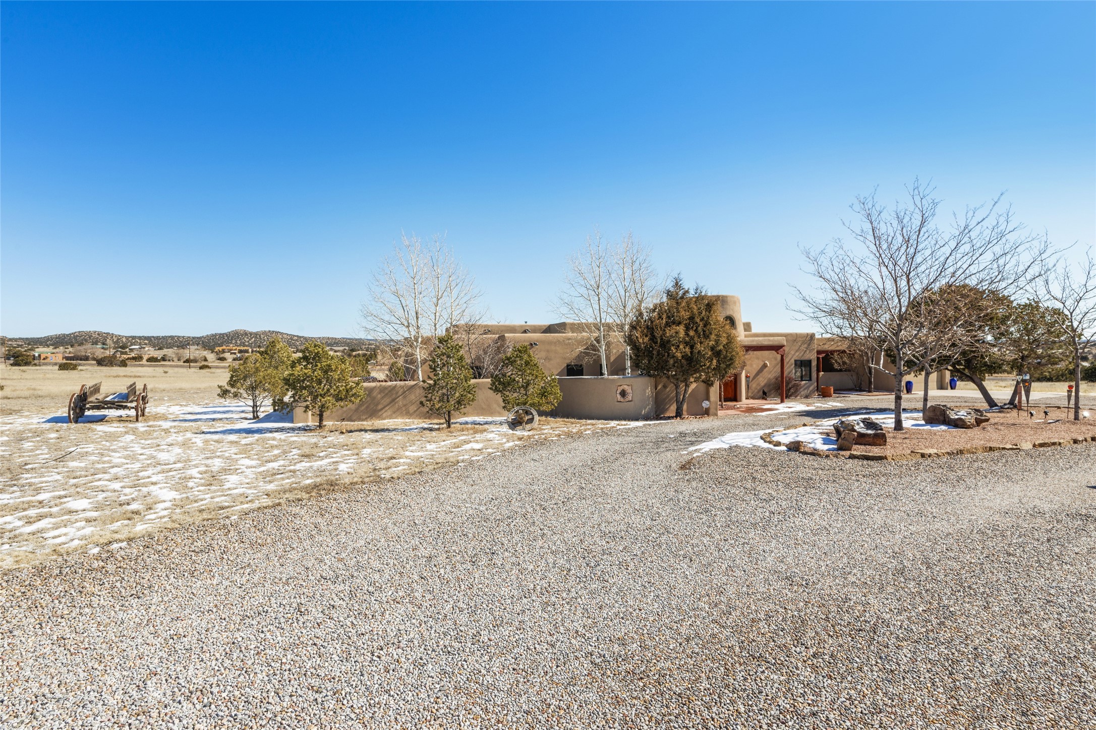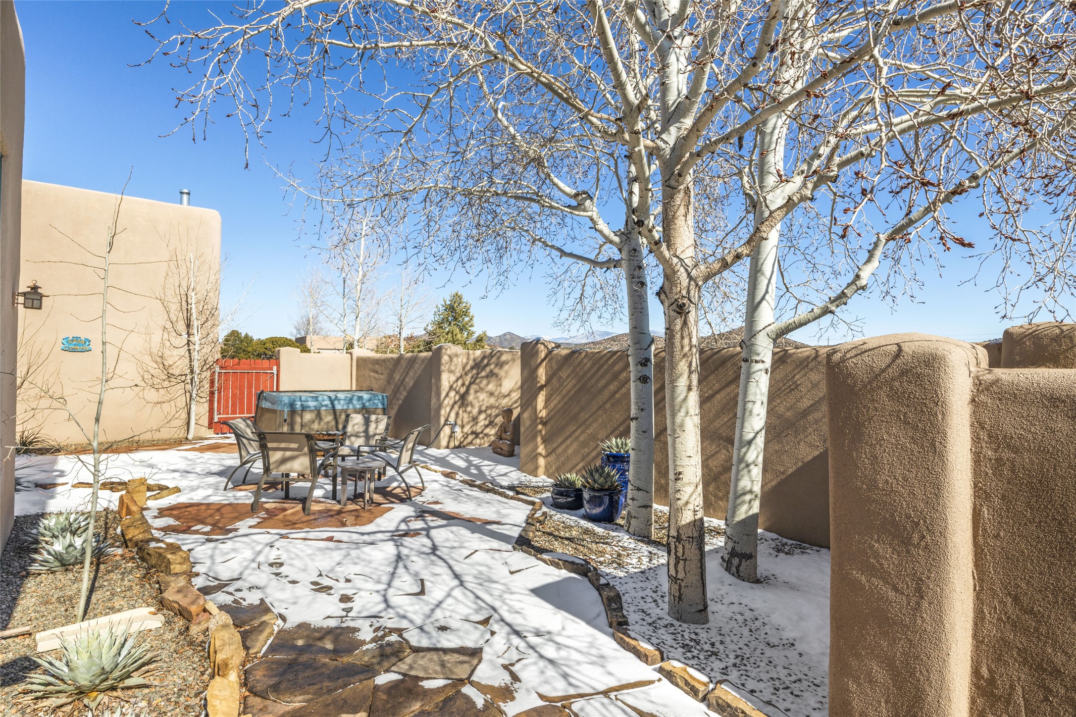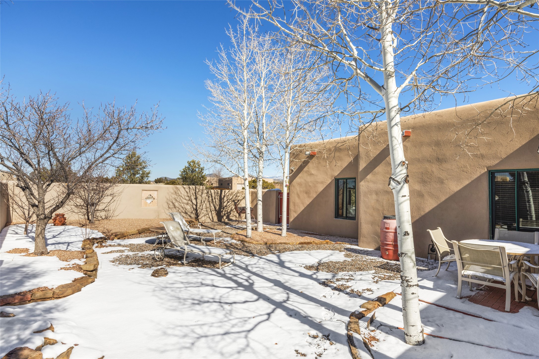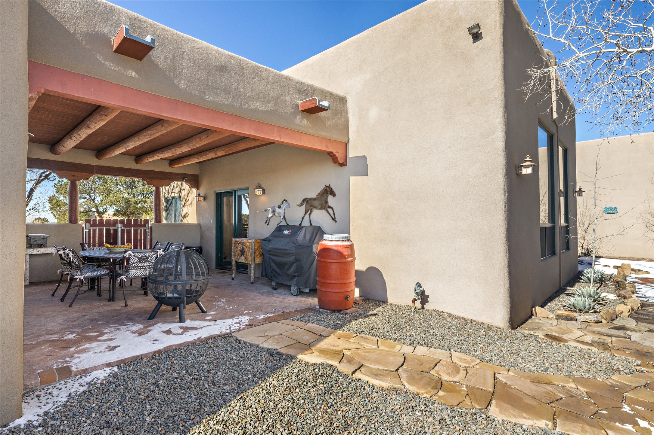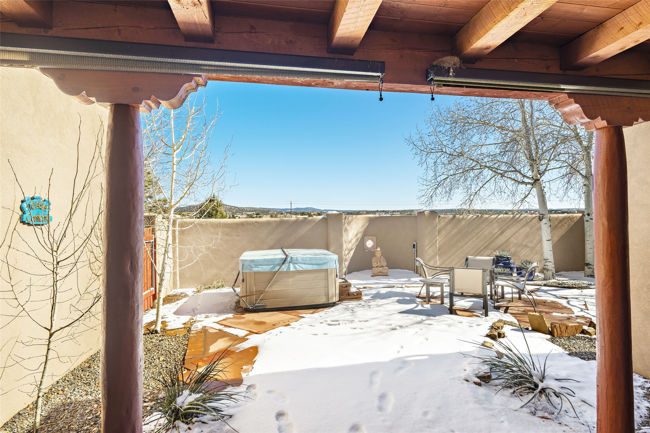 CASA CONTENTA. Named by the owners, this gorgeous La Paz at Eldorado property is sited on nearly 3 acres with a fully updated kitchen in 2021. Double ovens, island with storage and built-in recycle center and spice rack. Spacious shelved pantry. Matte porcelain counters and backsplash. Custom cabinets go all the way to the ceiling. Lots of generous drawers - all soft close. Dramatic and formal entry with diamond plaster in public areas and brick floors throughout. Three mini-splits provide cooling for primary bedroom, open kitchen, living and dining areas and fully outfitted gym. **All gym equipment conveys with the property. The primary bedroom is quite spacious with 12' ceilings, luxurious whirlpool tub, double sinks, a steam shower, towel warmer and walk-in closet. A den/office with pocket doors is a perfect second living area or could be a 4th bedroom. There is a tremendous amount of well-thought out storage in this home. Walled front and back courtyards with mature and happy Aspen trees. NO STEPS, NO KITEC, NO CARPET. There is a fully outfitted gym behind the garage which could be studio or workshop space. All this on a paved road too! Do some real stargazing from the hot tub. LG washer and dryer stay with the property. New Lochinar boiler in 2021. Newish stucco. Security system. Finished 2-car garage with epoxy floor. A small finished third-bay garage can be flex space.