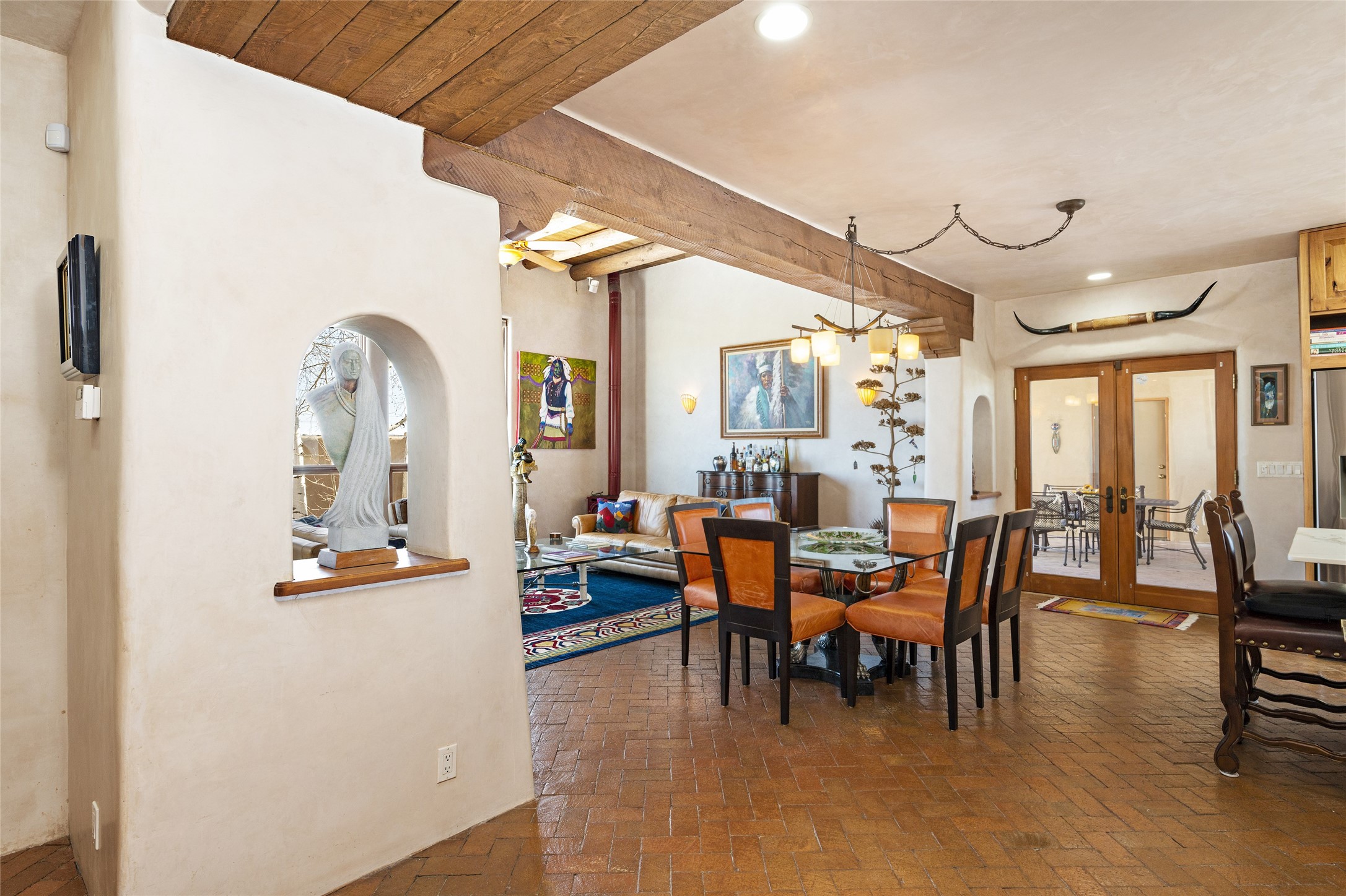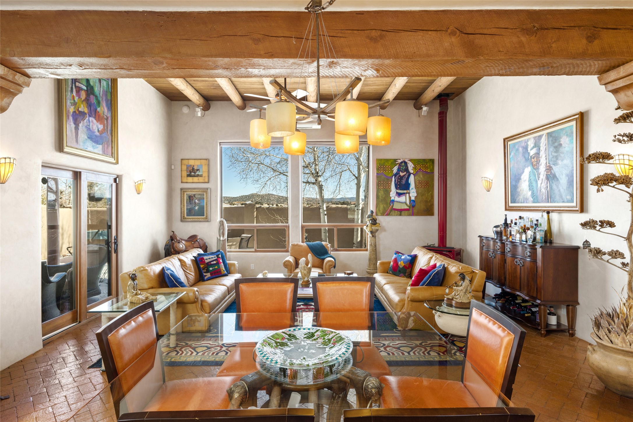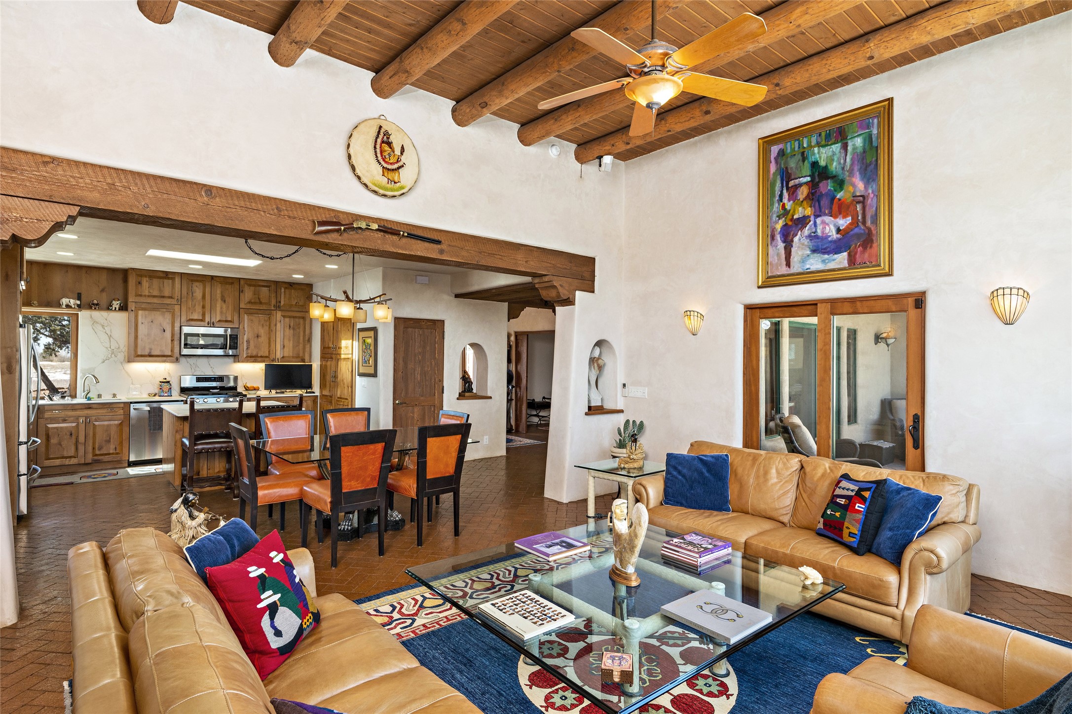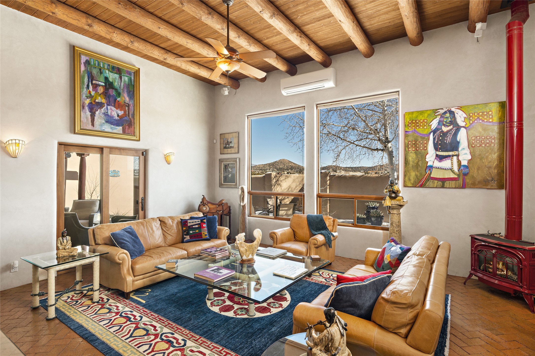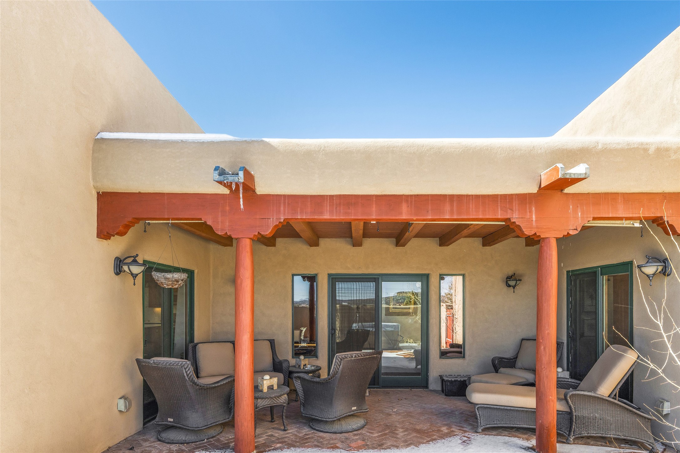 CASA CONTENTA. Named by the owners, this gorgeous La Paz at Eldorado property is sited on nearly 3 acres with a fully updated kitchen in 2021. Double ovens, island with storage and built-in recycle center and spice rack. Spacious shelved pantry. Matte porcelain counters and backsplash. Custom cabinets go all the way to the ceiling. Lots of generous drawers - all soft close. Dramatic and formal entry with diamond plaster in public areas and brick floors throughout. Three mini-splits provide cooling for primary bedroom, open kitchen, living and dining areas and fully outfitted gym. **All gym equipment conveys with the property. The primary bedroom is quite spacious with 12' ceilings, luxurious whirlpool tub, double sinks, a steam shower, towel warmer and walk-in closet. A den/office with pocket doors is a perfect second living area or could be a 4th bedroom. There is a tremendous amount of well-thought out storage in this home. Walled front and back courtyards with mature and happy Aspen trees. NO STEPS, NO KITEC, NO CARPET. There is a fully outfitted gym behind the garage which could be studio or workshop space. All this on a paved road too! Do some real stargazing from the hot tub. LG washer and dryer stay with the property. New Lochinar boiler in 2021. Newish stucco. Security system. Finished 2-car garage with epoxy floor. A small finished third-bay garage can be flex space.