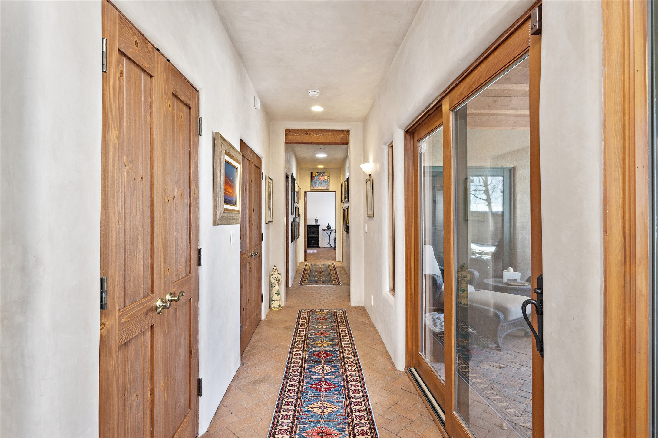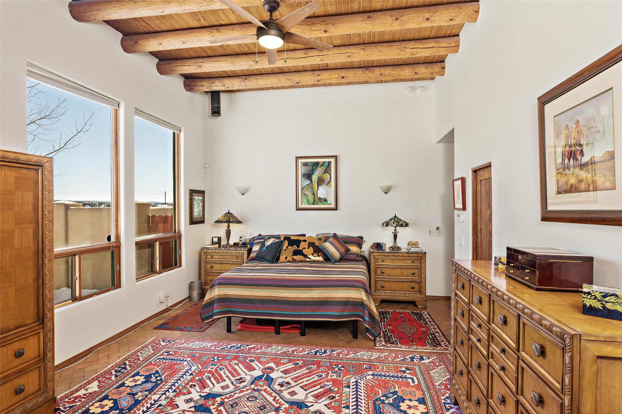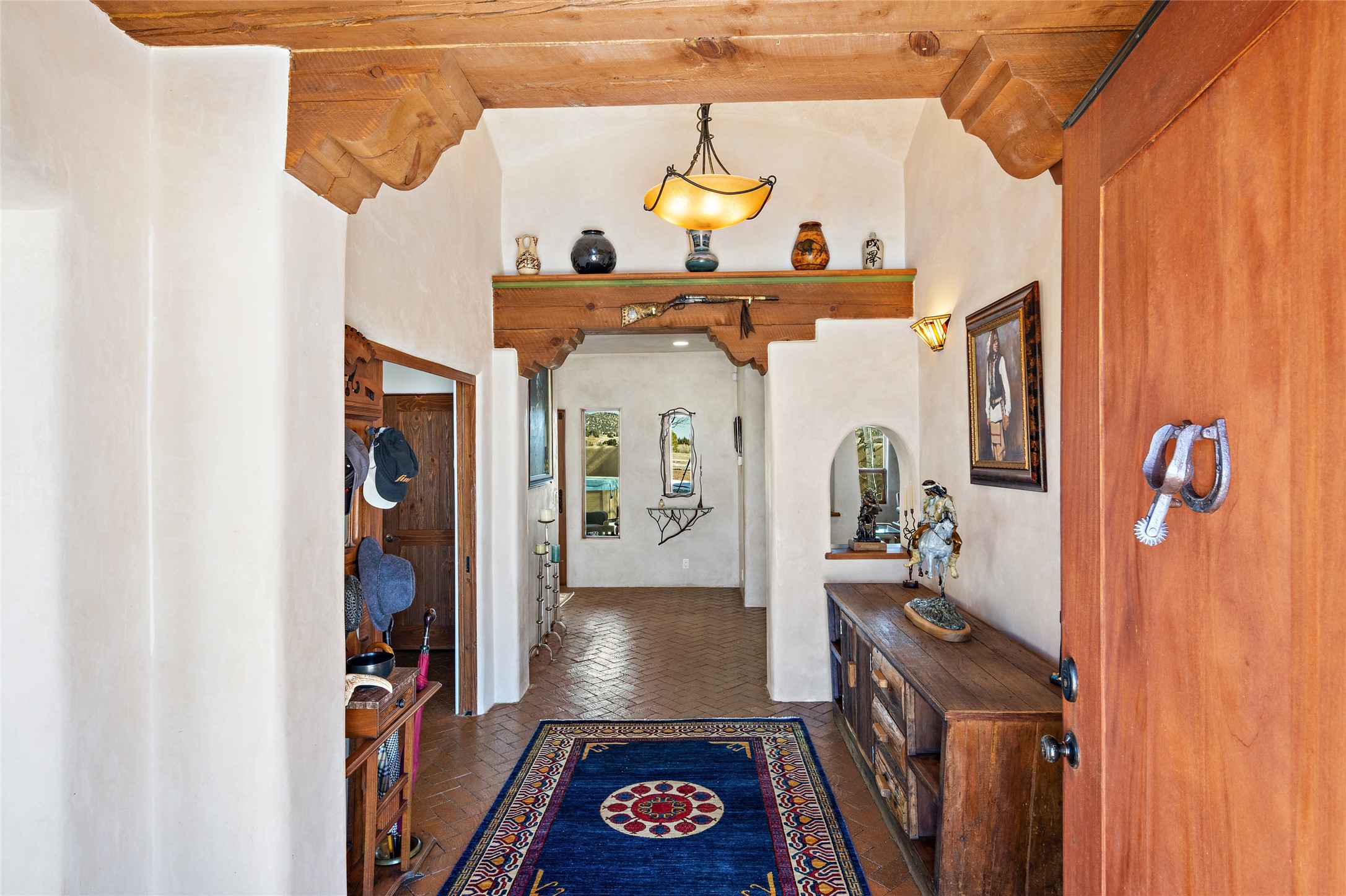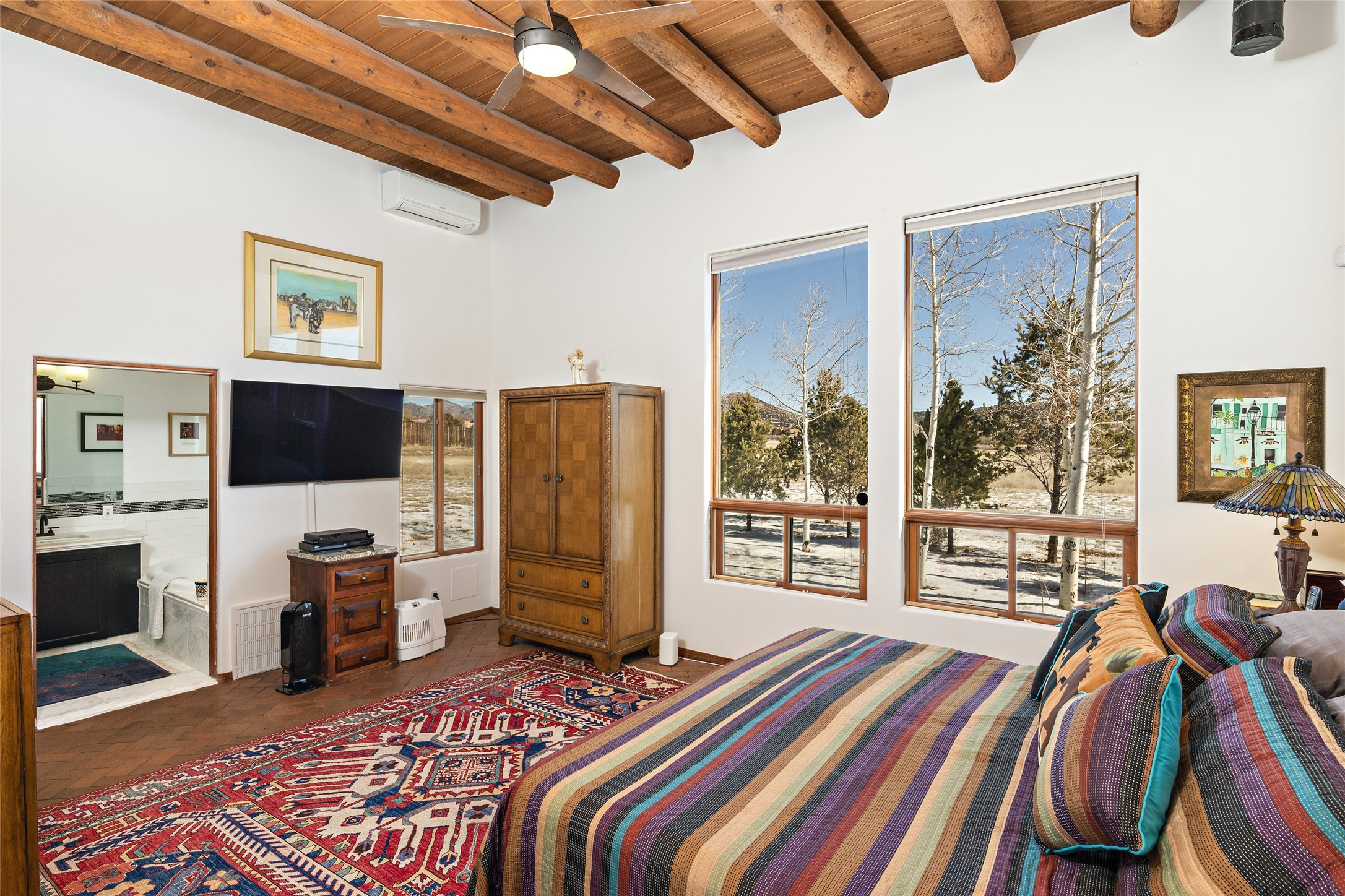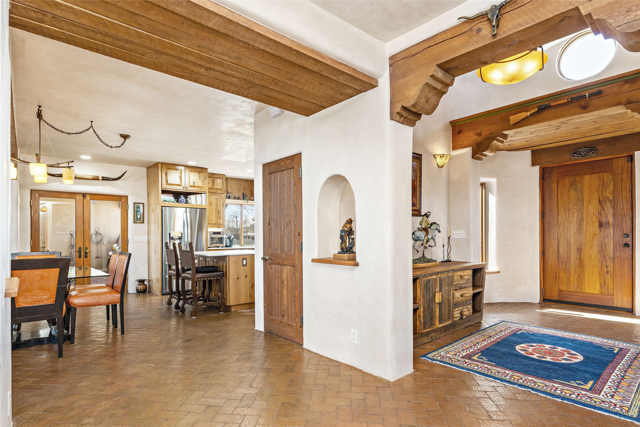CASA CONTENTA. Named by the owners, this gorgeous La Paz at Eldorado property is sited on nearly 3 acres with a fully updated kitchen in 2021. Double ovens, island with storage and built-in recycle center and spice rack. Spacious shelved pantry. Matte porcelain counters and backsplash. Custom cabinets go all the way to the ceiling. Lots of generous drawers - all soft close. Dramatic and formal entry with diamond plaster in public areas and brick floors throughout. Three mini-splits provide cooling for primary bedroom, open kitchen, living and dining areas and fully outfitted gym. **All gym equipment conveys with the property. The primary bedroom is quite spacious with 12' ceilings, luxurious whirlpool tub, double sinks, a steam shower, towel warmer and walk-in closet. A den/office with pocket doors is a perfect second living area or could be a 4th bedroom. There is a tremendous amount of well-thought out storage in this home. Walled front and back courtyards with mature and happy Aspen trees. NO STEPS, NO KITEC, NO CARPET. There is a fully outfitted gym behind the garage which could be studio or workshop space. All this on a paved road too! Do some real stargazing from the hot tub. LG washer and dryer stay with the property. New Lochinar boiler in 2021. Newish stucco. Security system. Finished 2-car garage with epoxy floor. A small finished third-bay garage can be flex space.