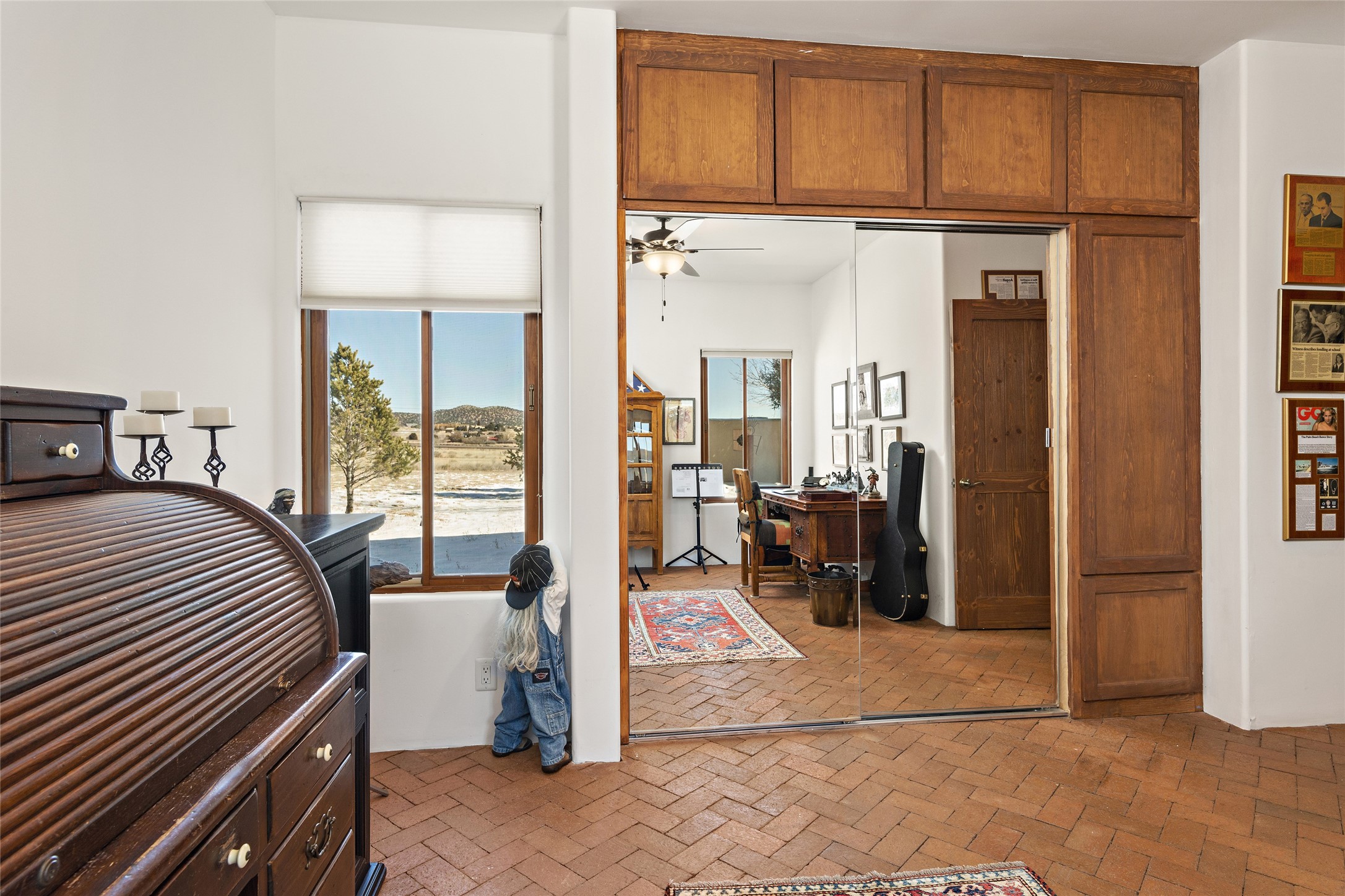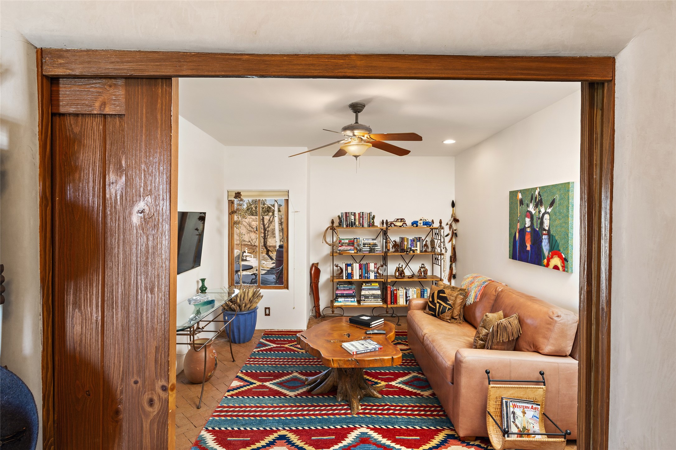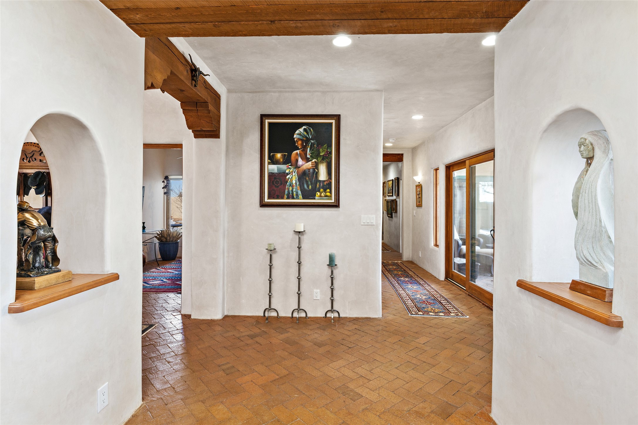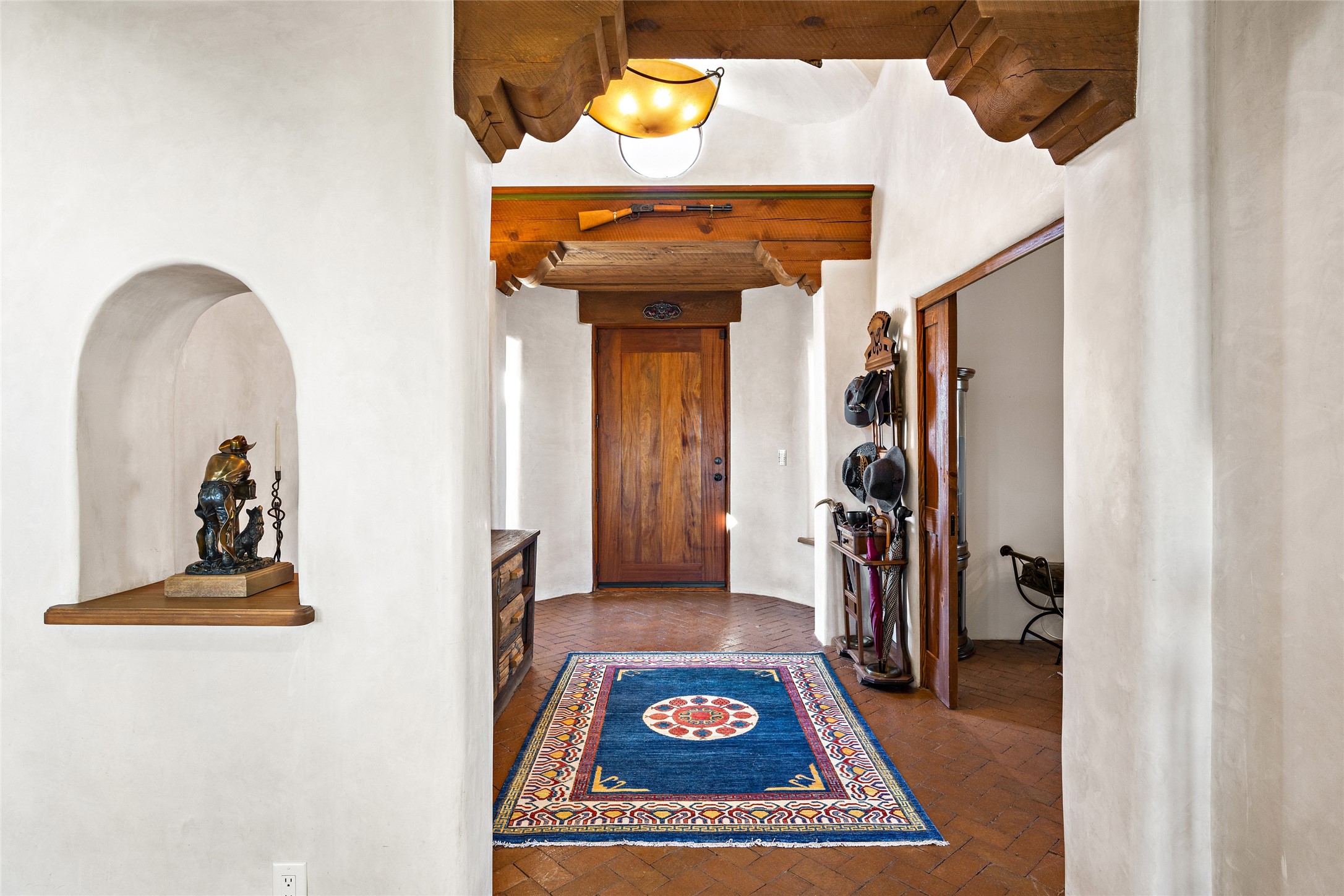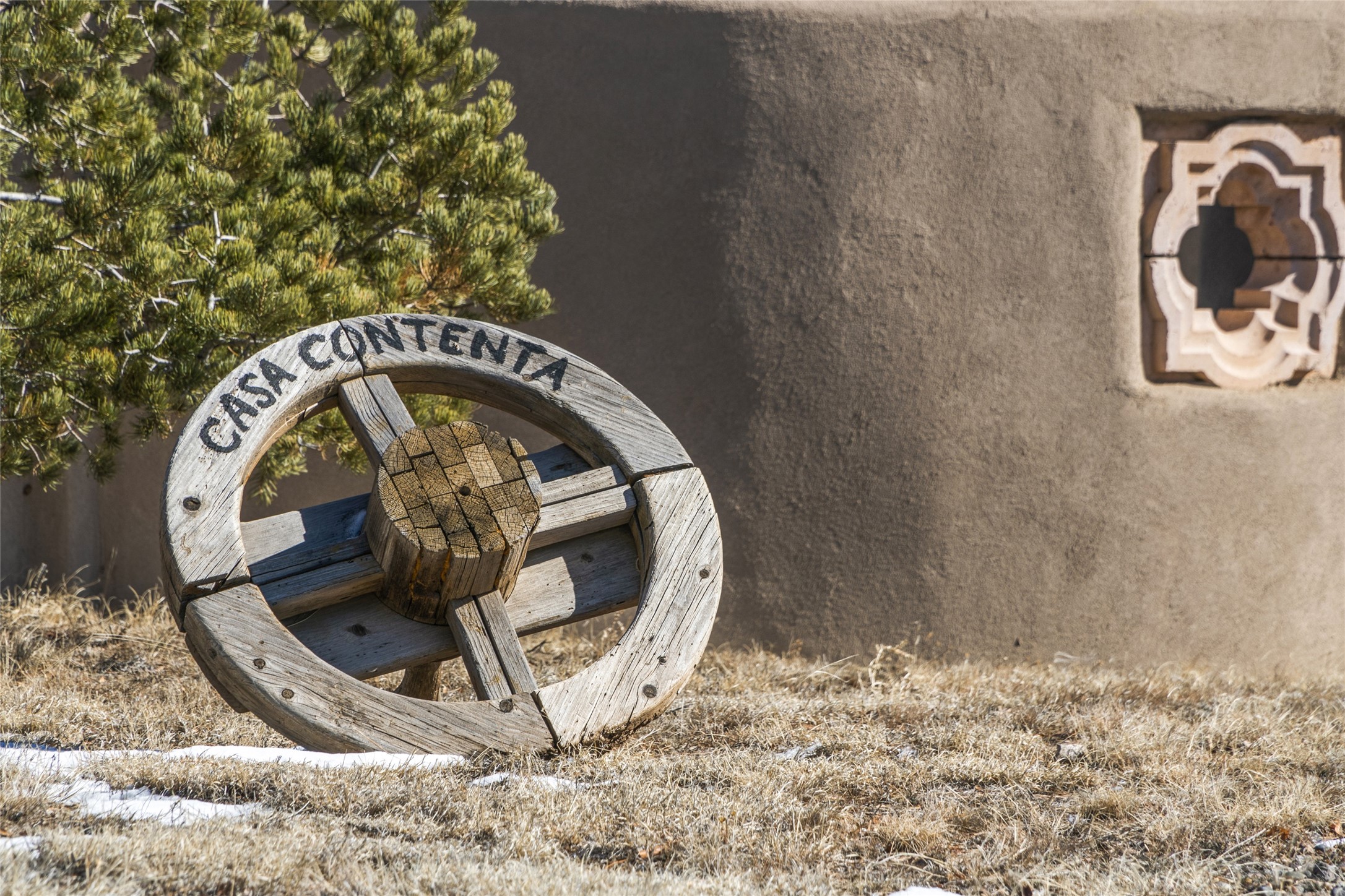 CASA CONTENTA. Named by the owners, this gorgeous La Paz at Eldorado property is sited on nearly 3 acres with a fully updated kitchen in 2021. Double ovens, island with storage and built-in recycle center and spice rack. Spacious shelved pantry. Matte porcelain counters and backsplash. Custom cabinets go all the way to the ceiling. Lots of generous drawers - all soft close. Dramatic and formal entry with diamond plaster in public areas and brick floors throughout. Three mini-splits provide cooling for primary bedroom, open kitchen, living and dining areas and fully outfitted gym. **All gym equipment conveys with the property. The primary bedroom is quite spacious with 12' ceilings, luxurious whirlpool tub, double sinks, a steam shower, towel warmer and walk-in closet. A den/office with pocket doors is a perfect second living area or could be a 4th bedroom. There is a tremendous amount of well-thought out storage in this home. Walled front and back courtyards with mature and happy Aspen trees. NO STEPS, NO KITEC, NO CARPET. There is a fully outfitted gym behind the garage which could be studio or workshop space. All this on a paved road too! Do some real stargazing from the hot tub. LG washer and dryer stay with the property. New Lochinar boiler in 2021. Newish stucco. Security system. Finished 2-car garage with epoxy floor. A small finished third-bay garage can be flex space.