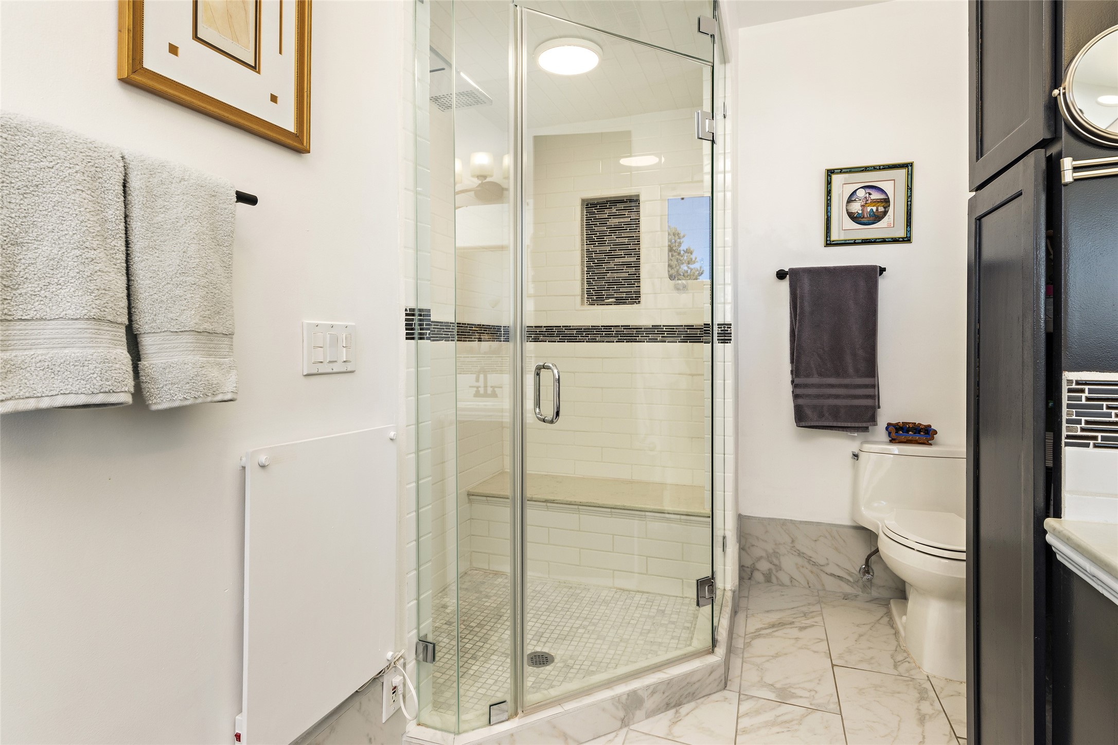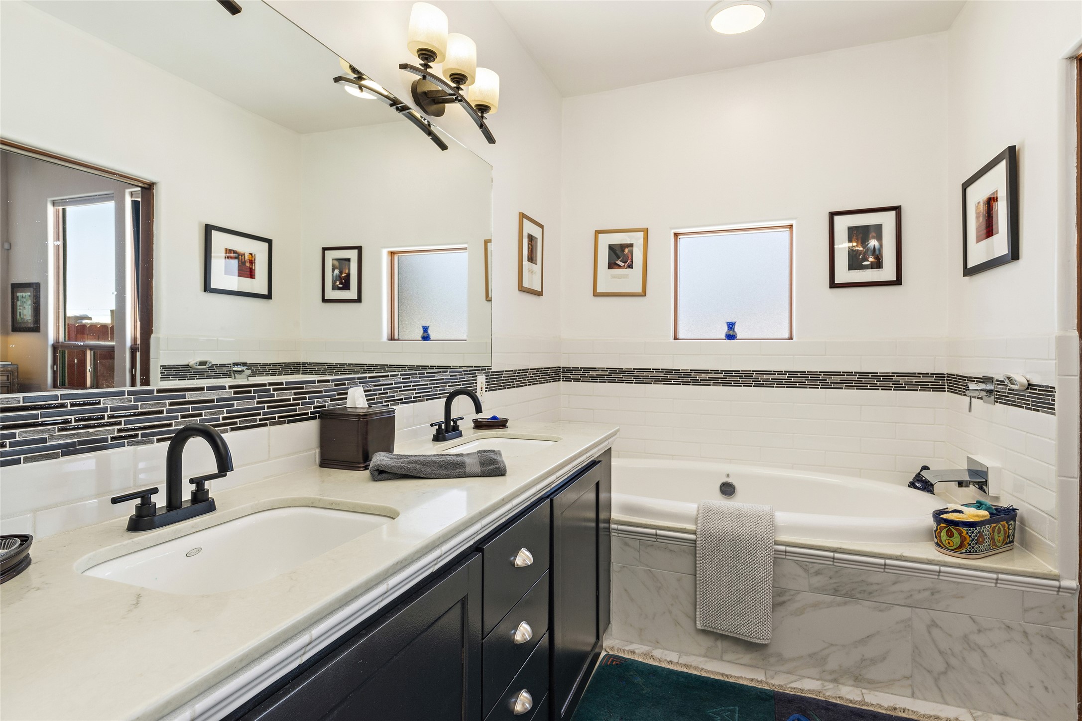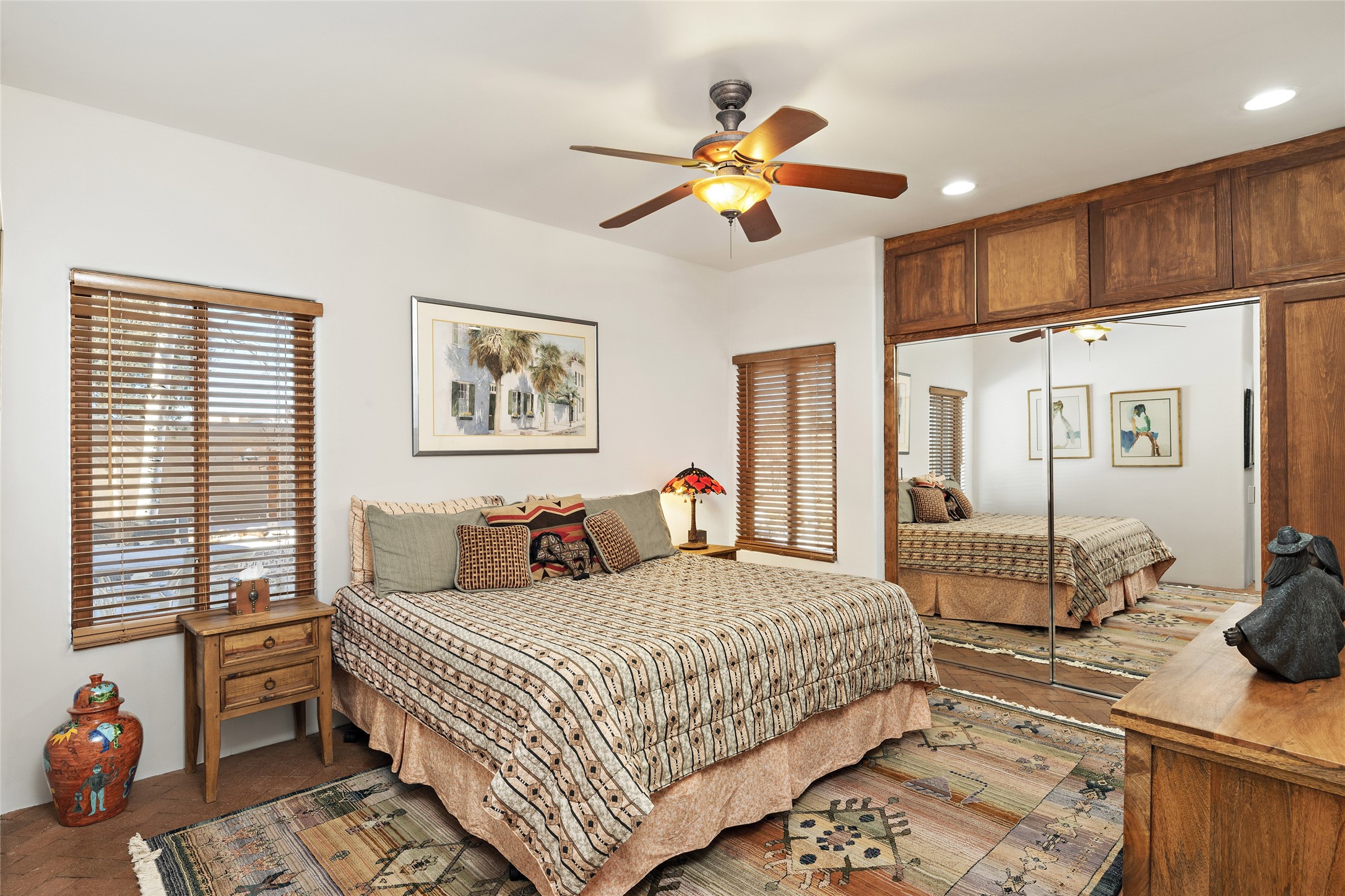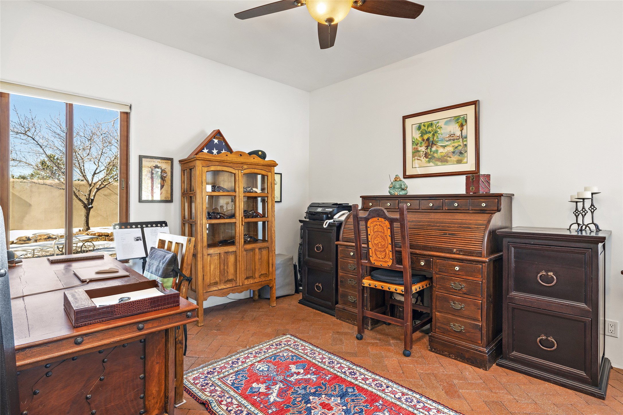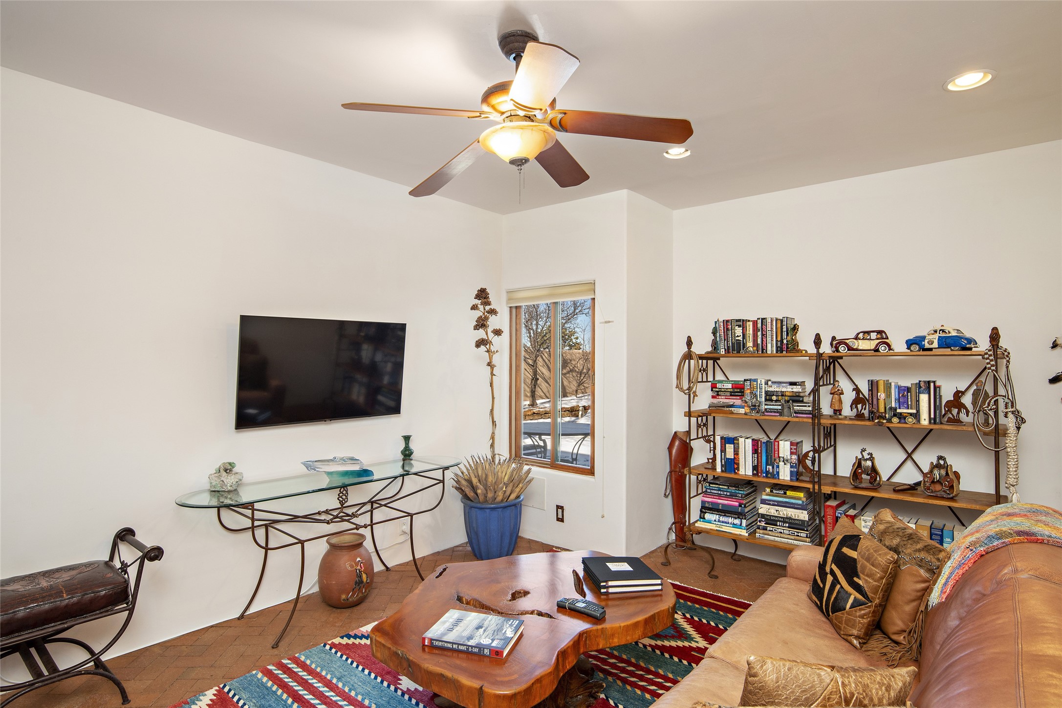 CASA CONTENTA. Named by the owners, this gorgeous La Paz at Eldorado property is sited on nearly 3 acres with a fully updated kitchen in 2021. Double ovens, island with storage and built-in recycle center and spice rack. Spacious shelved pantry. Matte porcelain counters and backsplash. Custom cabinets go all the way to the ceiling. Lots of generous drawers - all soft close. Dramatic and formal entry with diamond plaster in public areas and brick floors throughout. Three mini-splits provide cooling for primary bedroom, open kitchen, living and dining areas and fully outfitted gym. **All gym equipment conveys with the property. The primary bedroom is quite spacious with 12' ceilings, luxurious whirlpool tub, double sinks, a steam shower, towel warmer and walk-in closet. A den/office with pocket doors is a perfect second living area or could be a 4th bedroom. There is a tremendous amount of well-thought out storage in this home. Walled front and back courtyards with mature and happy Aspen trees. NO STEPS, NO KITEC, NO CARPET. There is a fully outfitted gym behind the garage which could be studio or workshop space. All this on a paved road too! Do some real stargazing from the hot tub. LG washer and dryer stay with the property. New Lochinar boiler in 2021. Newish stucco. Security system. Finished 2-car garage with epoxy floor. A small finished third-bay garage can be flex space.