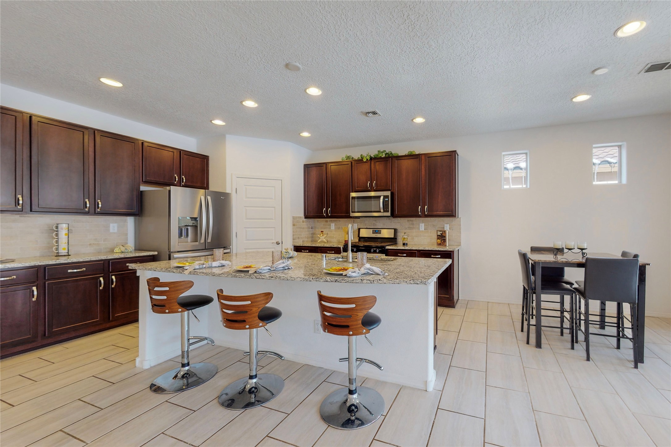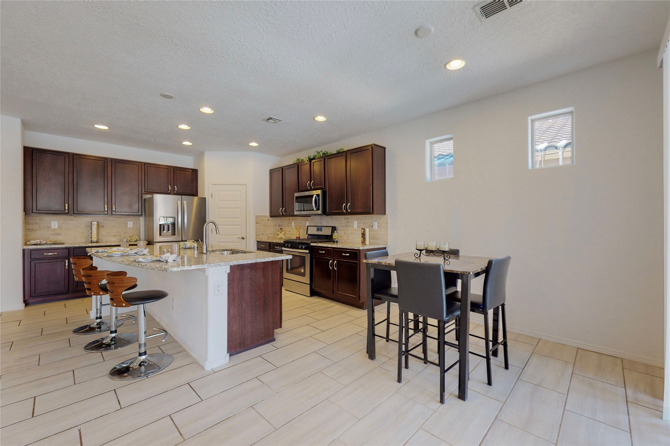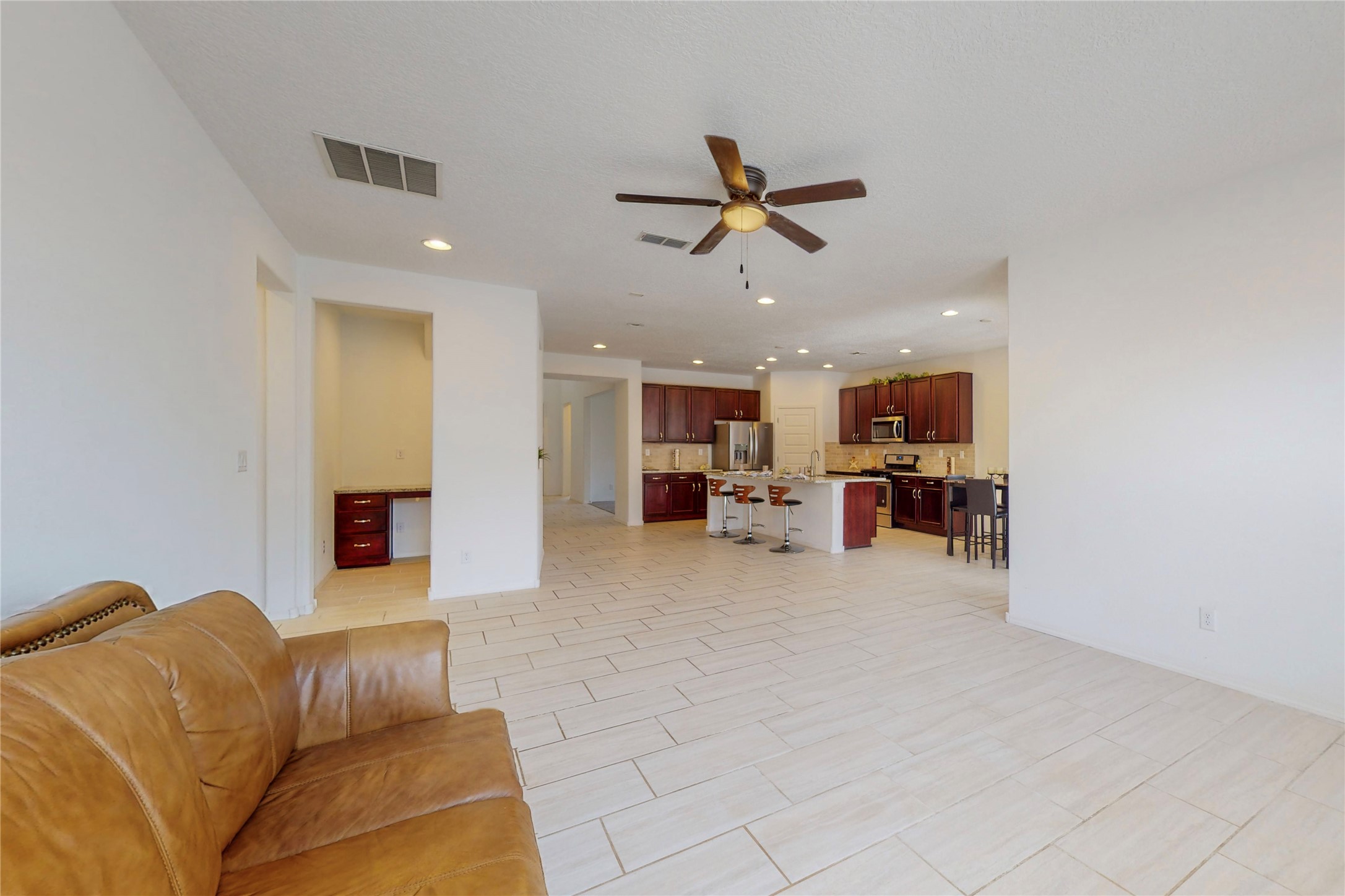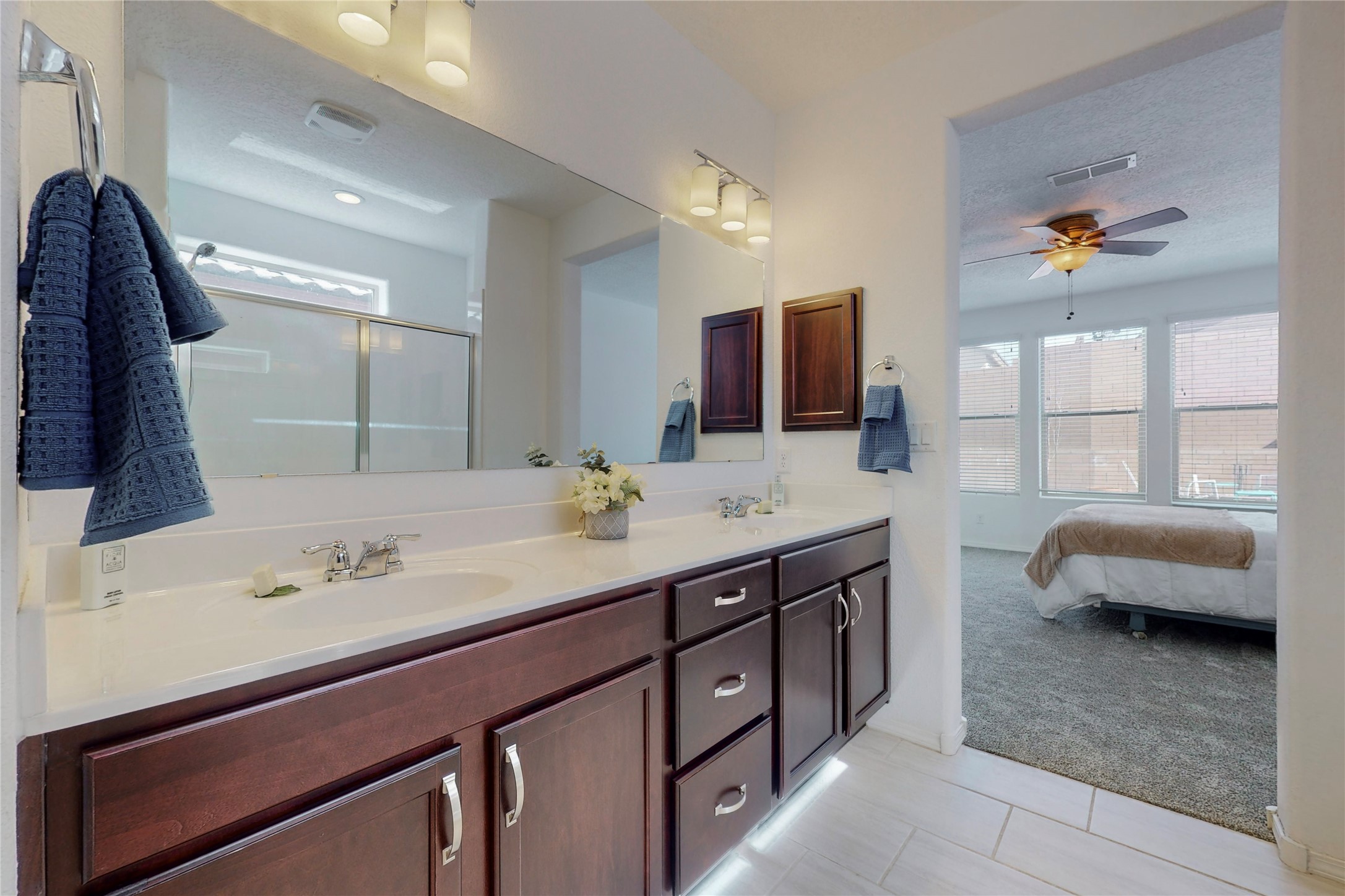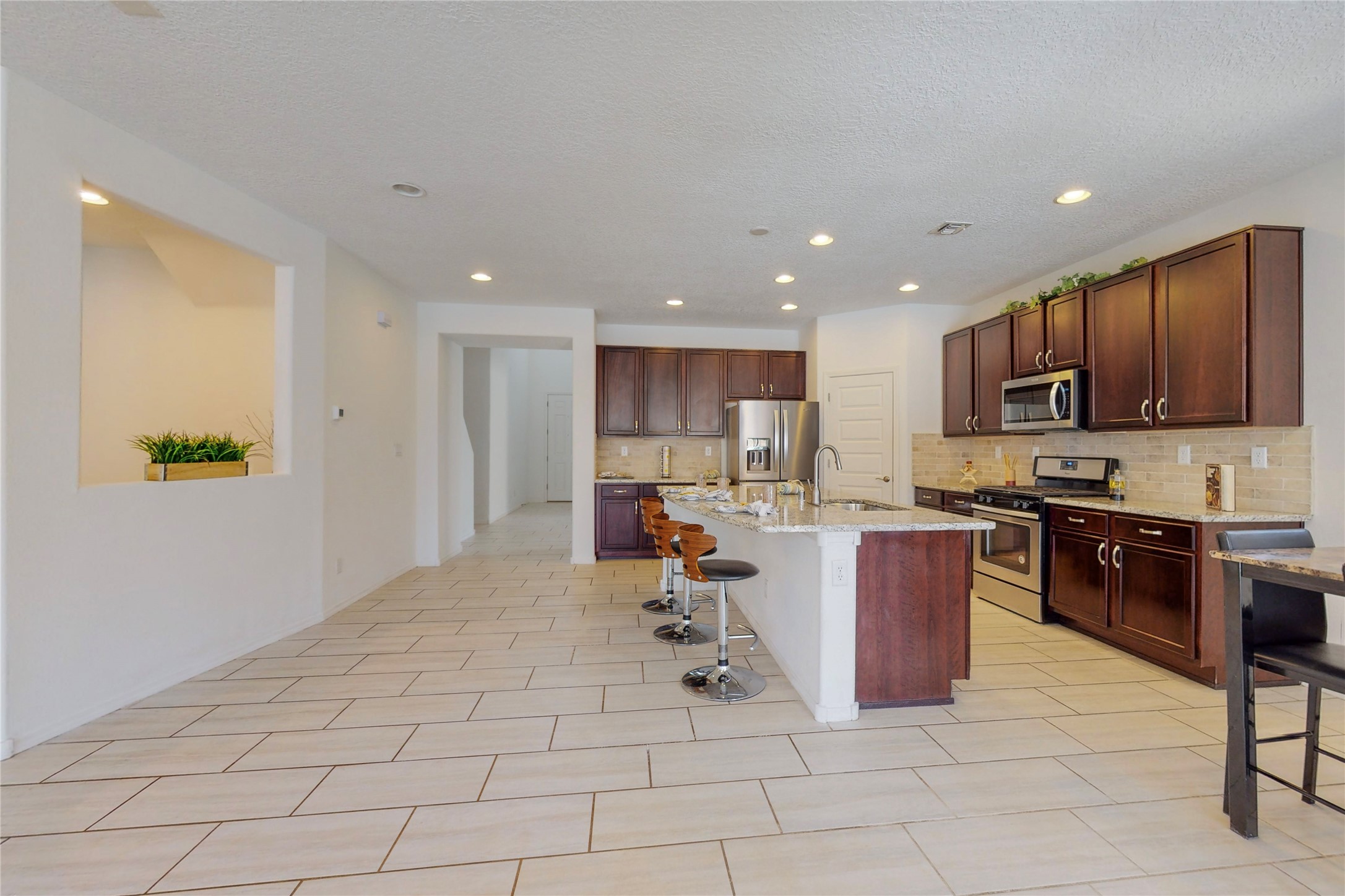 A beautifully landscaped, front yard, that requires minimal maintenance, is very welcoming. One drives up the driveway, with a walkway to the front door. The entrance to the home provides privacy for the open concept floor plan. The kitchen has a large center island with plenty of space to dine, yet there is space for a breakfast nook.There is a separate formal dining room and private office space. The home has two owner suites. One is ground level and the other is upstairs. Both levels have 2 baths and two bedrooms, totaling 4 bedrooms and 4 baths. This is rare. All the floors have ceramic tile except for the bedrooms and closets, along with the upstairs commons area, which all have new carpet. There is natural light throughout the house. The backyard is good sized with a porch, perfect for outside dining. The built in fire pit provides an amazing opportunity to visit around, a nice cozy fire and maybe even roast some marshmallows. This home offers so much space to enjoy life together, inside and outside or separately in one's private bedroom. The two car garage has an epoxy finish. This home is move in ready for a family of any age.