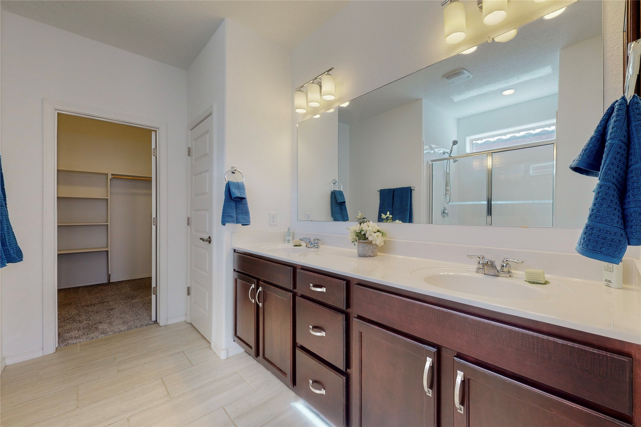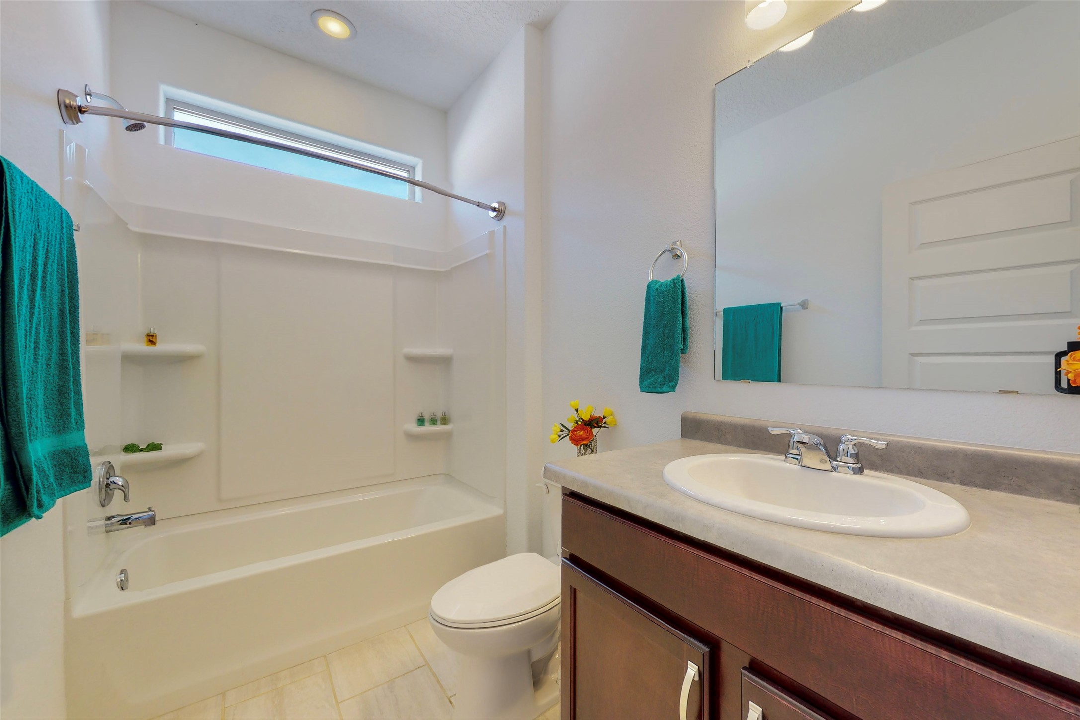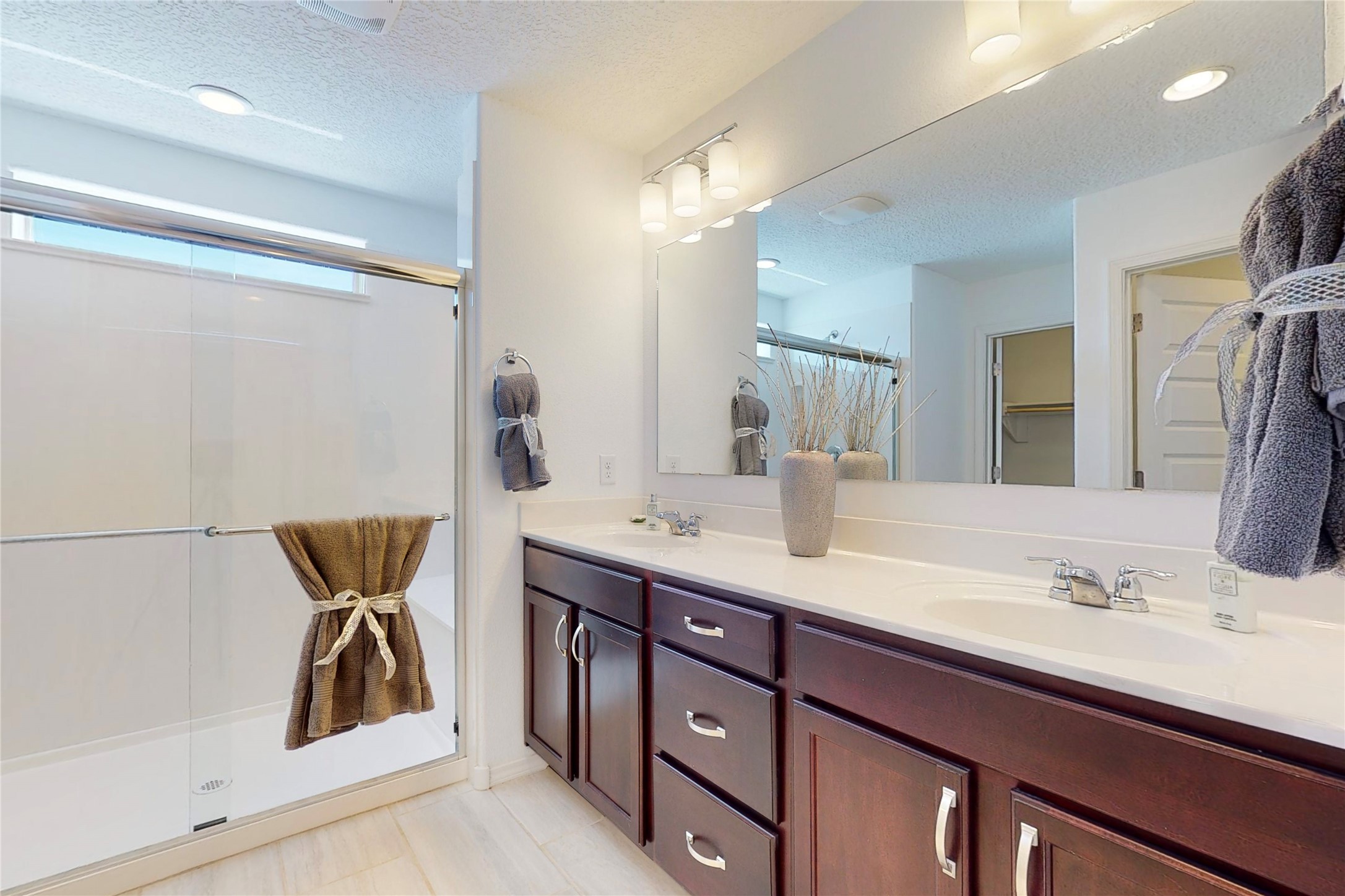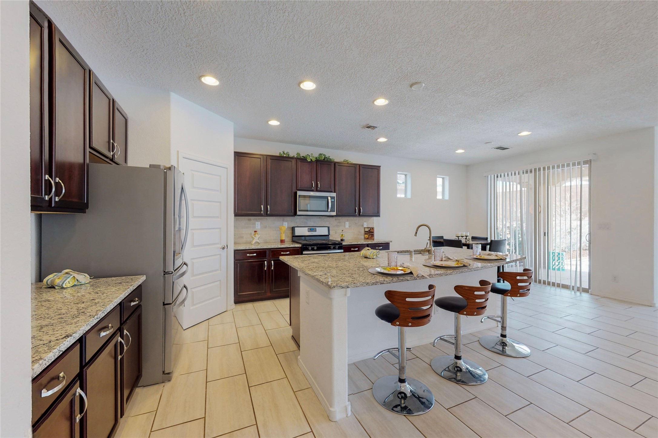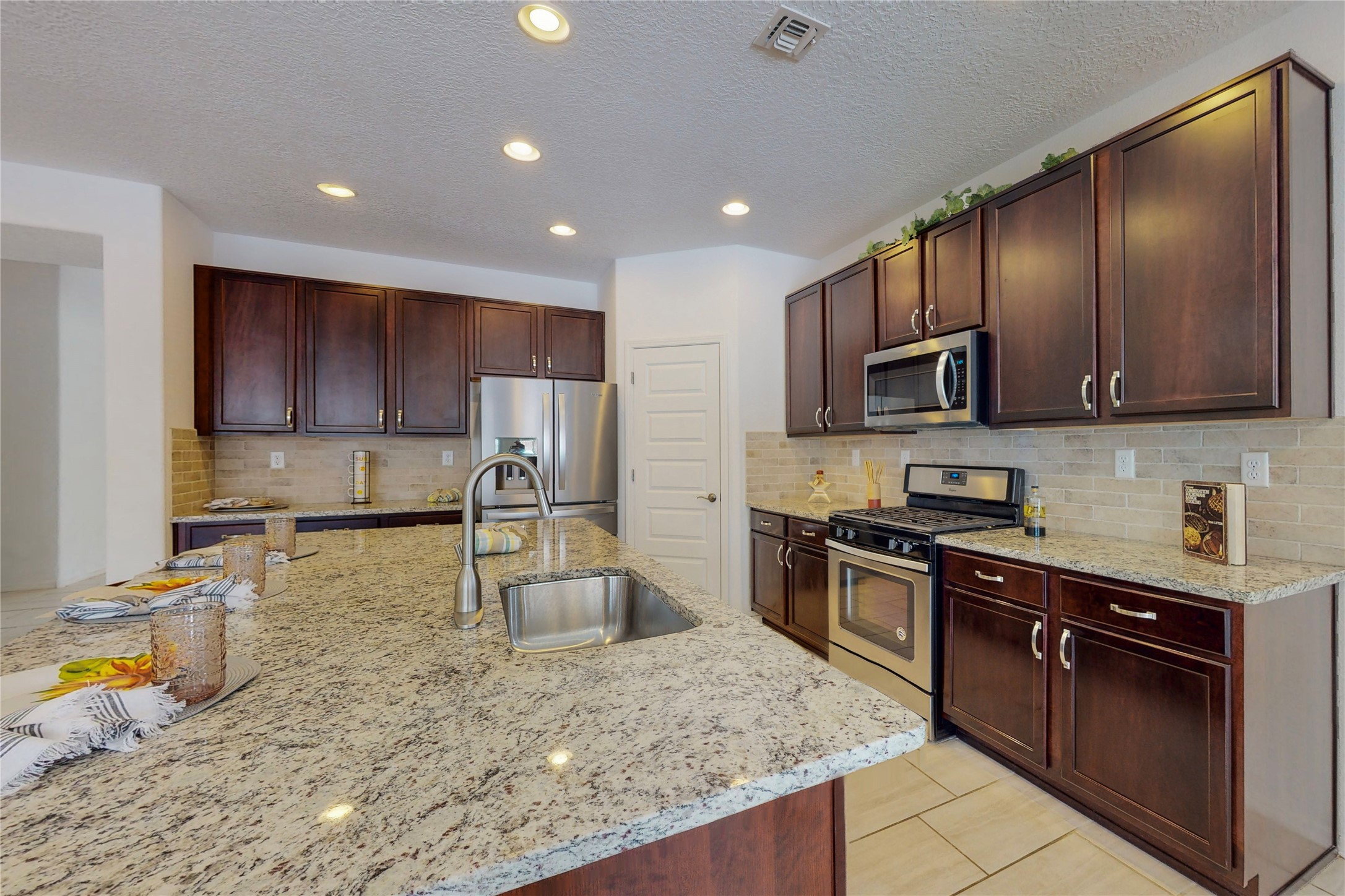 A beautifully landscaped, front yard, that requires minimal maintenance, is very welcoming. One drives up the driveway, with a walkway to the front door. The entrance to the home provides privacy for the open concept floor plan. The kitchen has a large center island with plenty of space to dine, yet there is space for a breakfast nook.There is a separate formal dining room and private office space. The home has two owner suites. One is ground level and the other is upstairs. Both levels have 2 baths and two bedrooms, totaling 4 bedrooms and 4 baths. This is rare. All the floors have ceramic tile except for the bedrooms and closets, along with the upstairs commons area, which all have new carpet. There is natural light throughout the house. The backyard is good sized with a porch, perfect for outside dining. The built in fire pit provides an amazing opportunity to visit around, a nice cozy fire and maybe even roast some marshmallows. This home offers so much space to enjoy life together, inside and outside or separately in one's private bedroom. The two car garage has an epoxy finish. This home is move in ready for a family of any age.