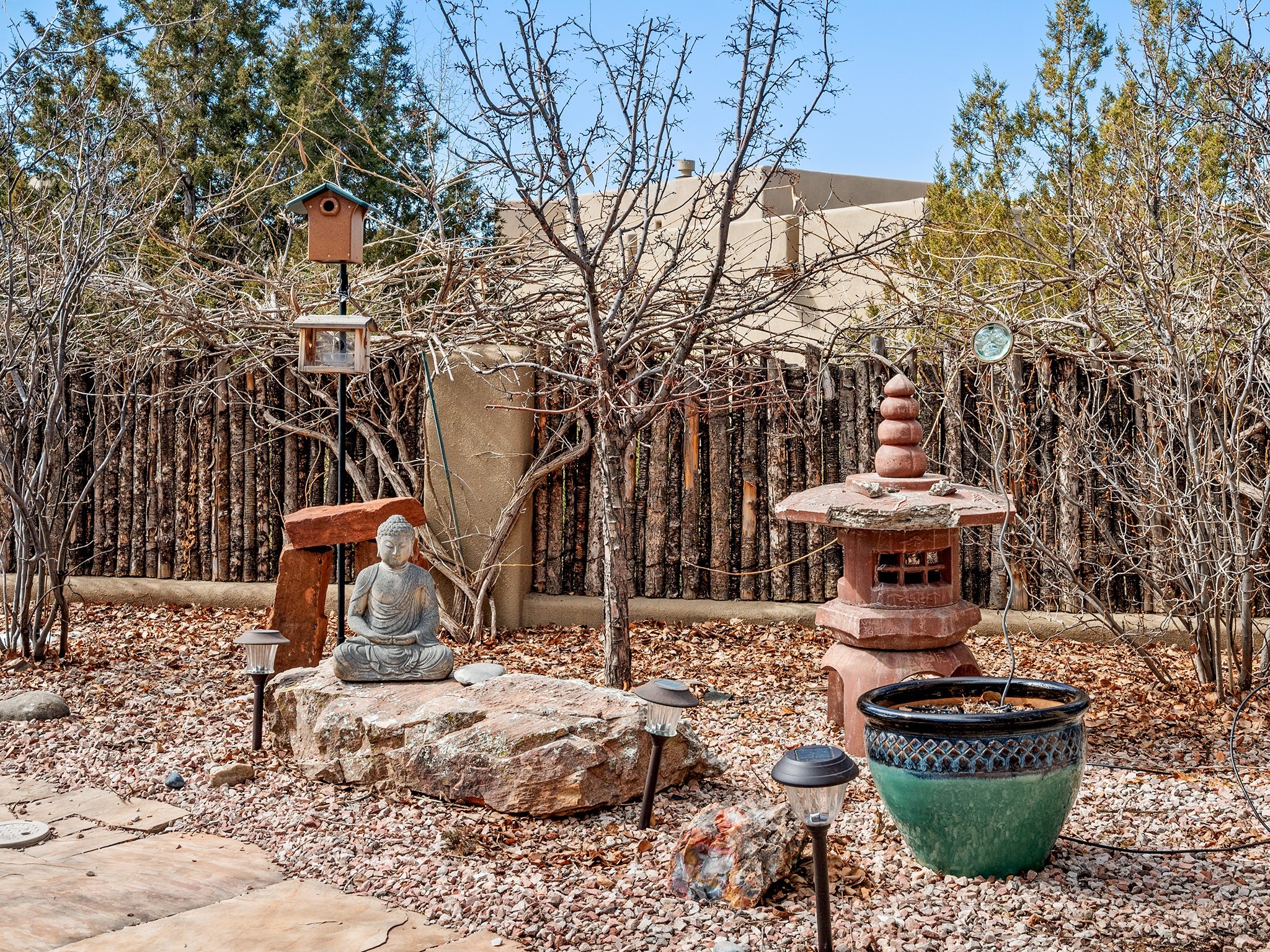Kitek in the domestic system has been replaced. This elegant Santa Fe style and guest house in desirable Aldea has it all. 3741 sf. The primary bedroom is nicely separated from the guest bedrooms for total of 4 beds, 3 1/2 baths, oversized 2 car garage, 5 fireplaces, plus living, room, media room, breakfast room and dining room, including a 400/sf guest house. High end finishes include plaster walls, vigas, tile floors and a gas burning Kiva fireplace as a dramatic focal point. The beauty continues into the dining room also has vigas and tile floors and leads to an updated handsome kitchen with lovely wood cabinets, tasteful granite counters and new tile backsplash. There is also a gas range and a new dishwasher and a large walk in pantry. Tucked off of the kitchen is a charming breakfast room with another kiva fireplace. The large media room is perfect for cozy nights by the fireplace. French doors off the living room, and primary suite lead to the portal and private courtyard with bubbling fountain and mature landscaping. Here, there is a casita with 1 bedroom 1 bath and kitchenette with a separate living room and gas burning Kiva fireplace. There is also a nice hot tub and rooftop viewing deck to take in the amazing Santa Fe Sunsets. Continuing in the main house The primary suite also has a kiva fireplace and a large walk in close to you will find a large laundry room with plenty of cabinets, a powder room and 2 more guest bedrooms with a very pretty shared bathroom between them. The garage is an oversized 2 car garage with lots of room for storage. For the mechanical geeks, there are 7 zones for the radiant in floor heat, a water softener, a water filtration system and reverse osmosis under the sink in the kitchen. The house has radiant in floor heat and is ducted with 3 evaporative coolers providing 3 cooling zones. Aldea is an active community with 13 miles of walking trails, a community center, coffee shop, tennis, basketball and a bocce ball court.
