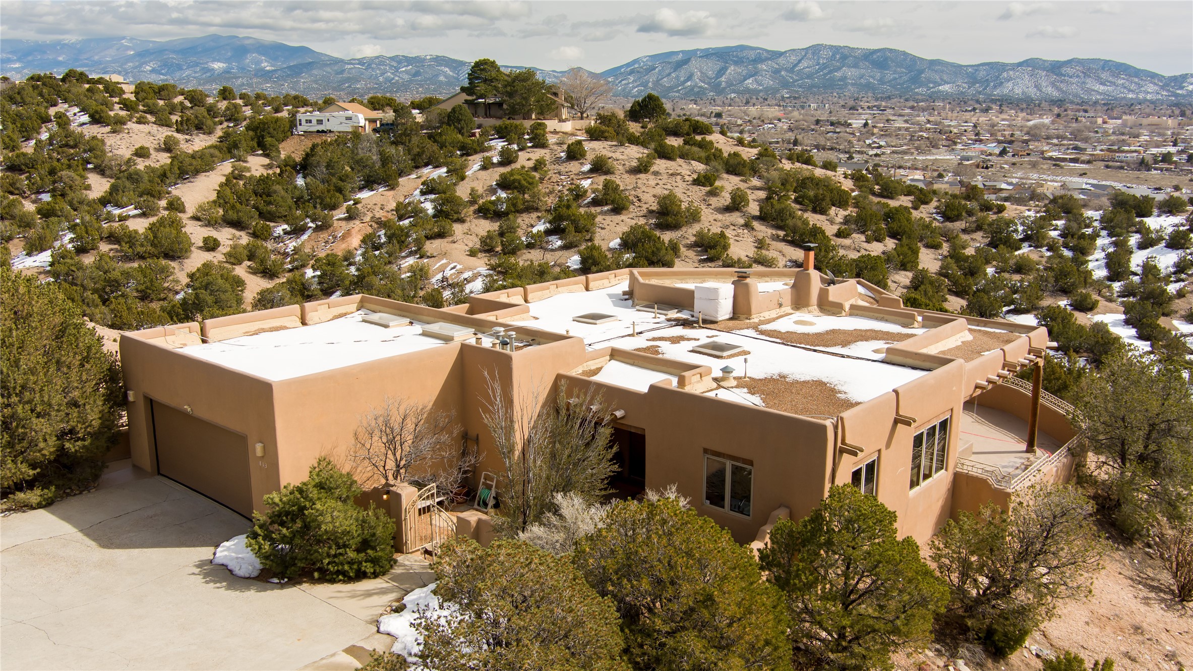 Exquisite custom home in the centrally located Cerro del Sol Subdivision off of West Alameda. Gracious entry, spectacular views, three bedrooms, 2 full baths nestled on 1.75 acres just minutes to the Santa Fe Plaza. Generous sized kitchen opens to living area with cozy corner Kiva Fireplace and large windows for natural light through-out the day. The kitchen/ dining area offers access to the wrap-around portal, an inviting space for entertaining and outdoor dining. High ceilings with Vigas and wood ceilings in living room and primary bedroom. The ample primary bedroom features a second Kiva Fireplace, built-in office area and access to outdoor portal. A large spa inspired bath with double sinks, large jacuzzi tub, separate steam shower and walk-in closet is part of the primary suite. Additional features include stainless steel kitchen appliances, ample cabinetry and closets, in-floor radiant heat, laundry room with new washer/dryer. A second portal located off guest bedrooms offers additional outdoor enjoyment. Attached oversized finished garage and very private driveway. Cerro del Sol has a very low HOA of $75 per year! There are three steps from the kitchen to the living area and 3 steps from the living area to the bedroom suite. Home has been inspected prior to listing.