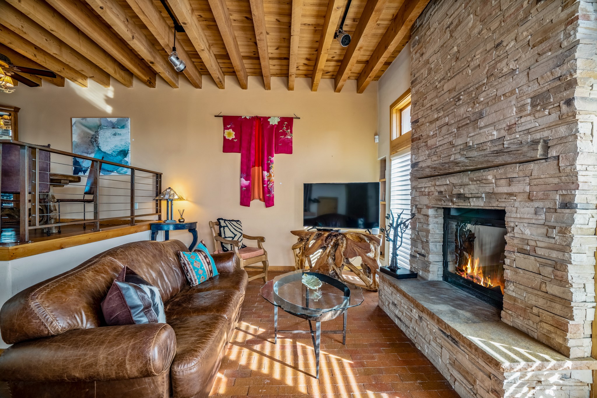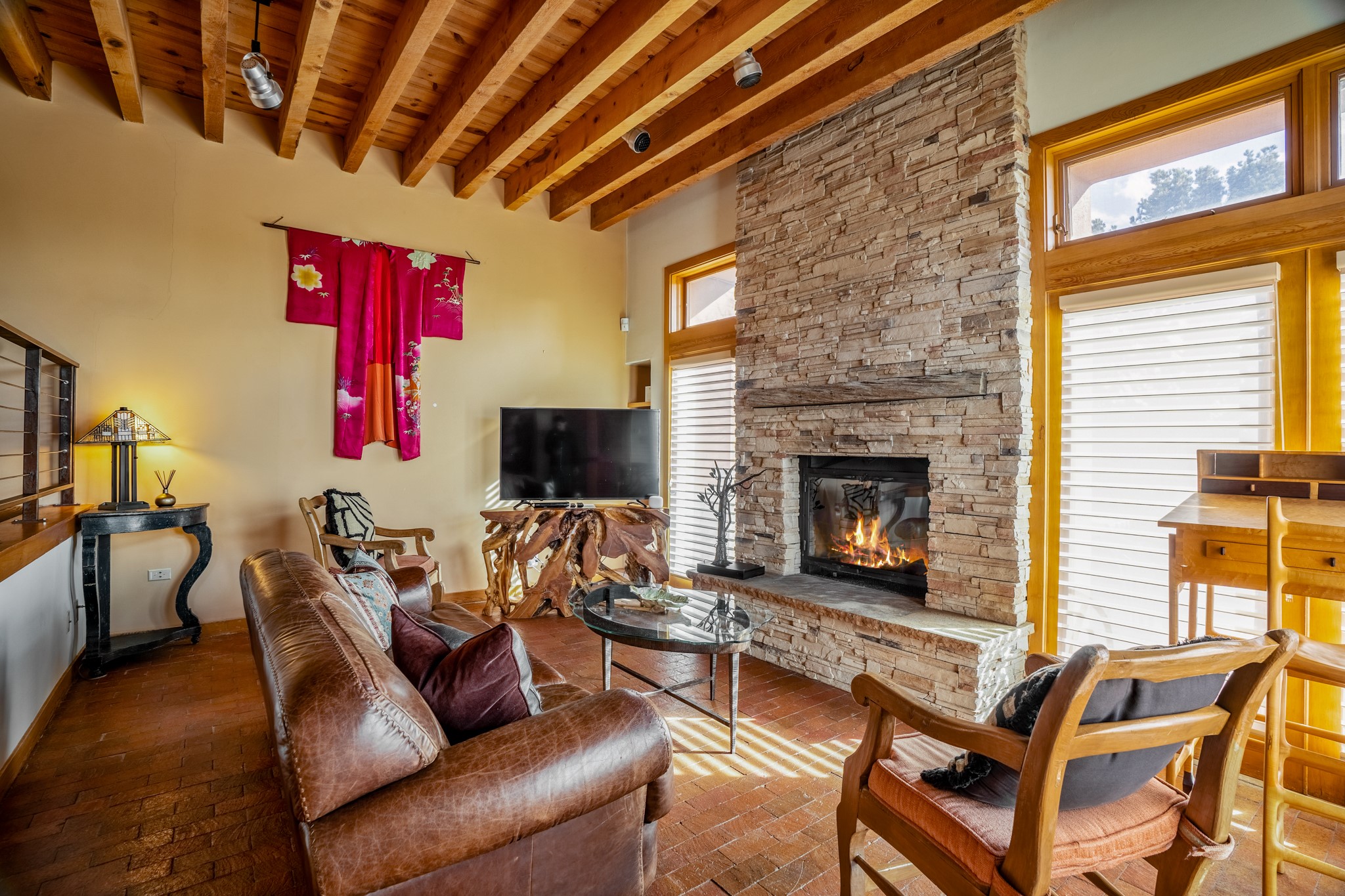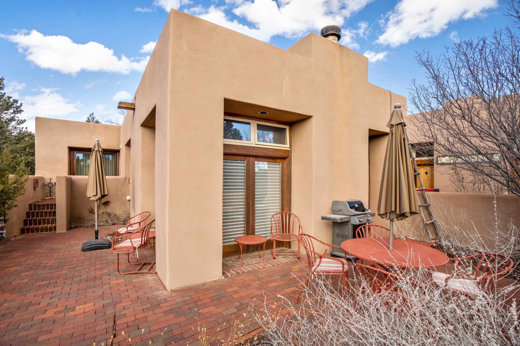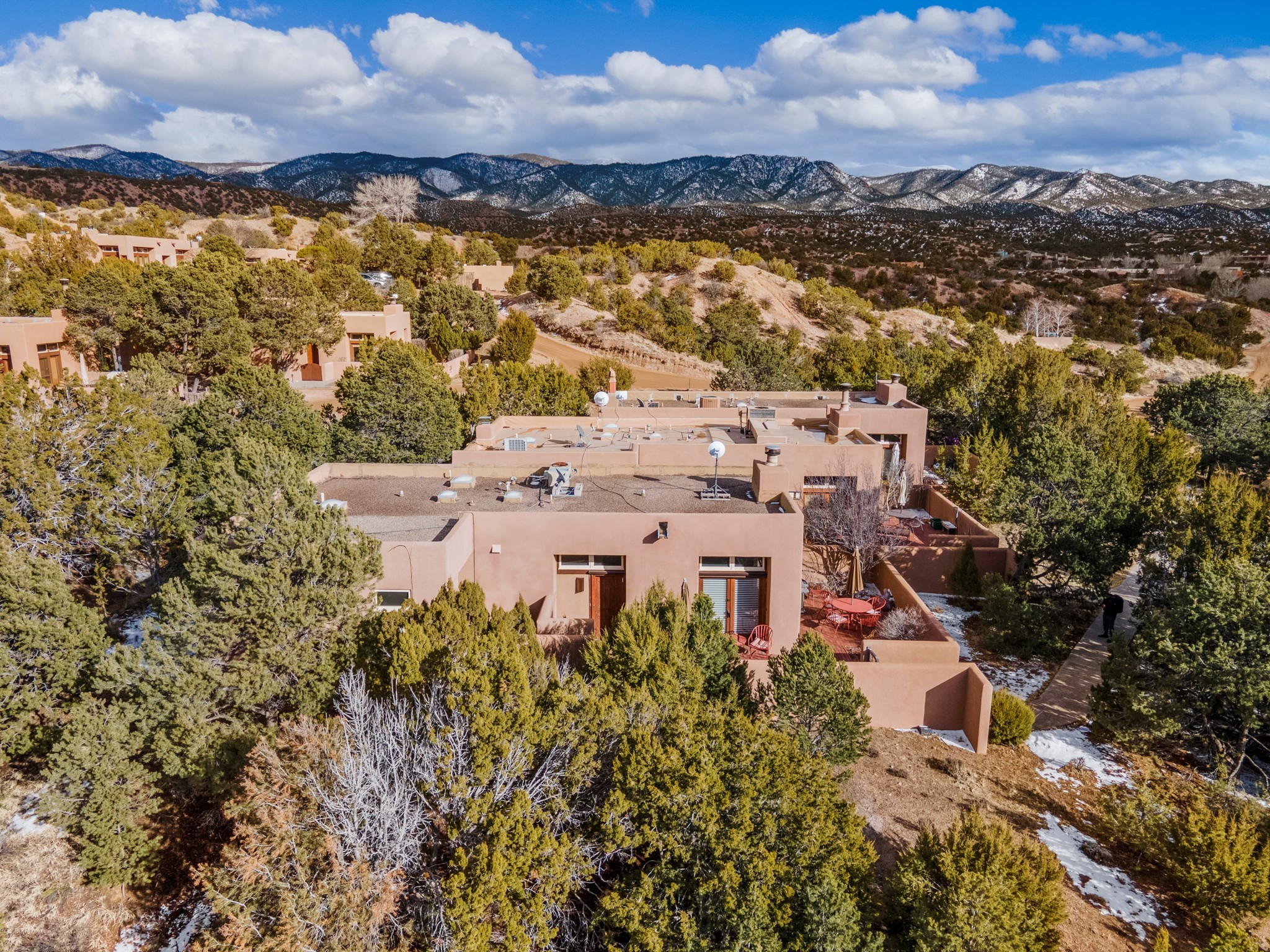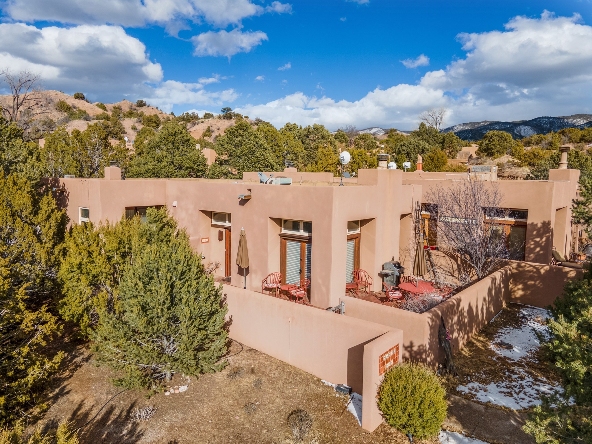 Sweet as can be condo in the ever popular Pueblo Encantado across from the Four Seasons in Tesuque. Views and Privacy from this updated 2 beds 2 full baths end unit condo. There are Brick floors in the common areas. The living room has a large stone fireplace to cozy up next to while the snow falls across the Santa Fe Dessert. The primary suite also has a wood burning kiva fireplace for Santa Fe ambiance on romantic evenings. The kitchen has been updated from the original including the cabinets, beautiful quartx counters , tile back splashes and nice stainless steel appliances. Both of the bathrooms have also been tastefully remodeled with new vanities and tile and glass showers. There is a wrap around portal to enjoy the sunsets and night skies with you family and friends. These units are often used as second homes and investment properties. There is a swimming pool, club house and on site management. THe house has Forced air and AC.