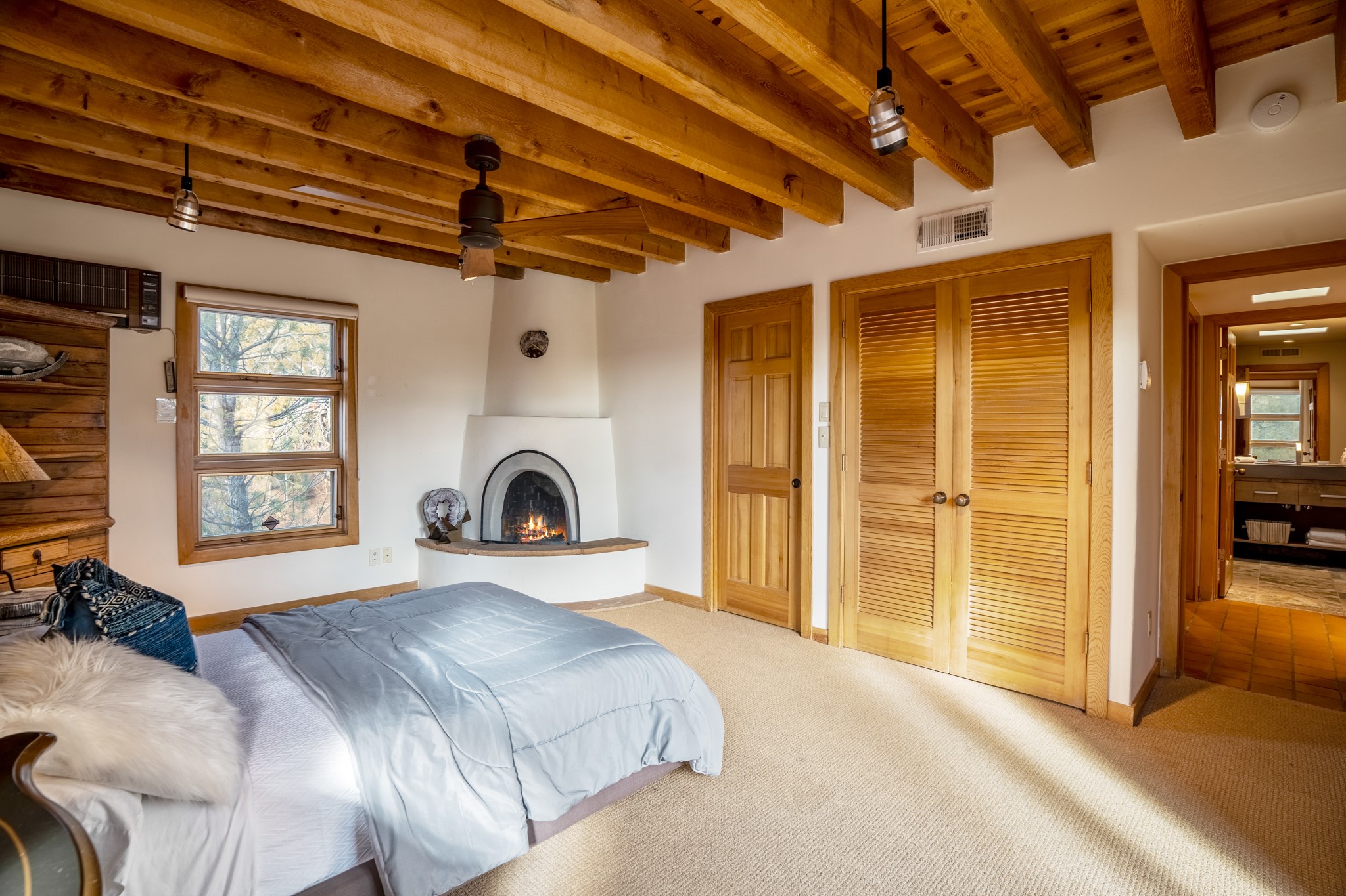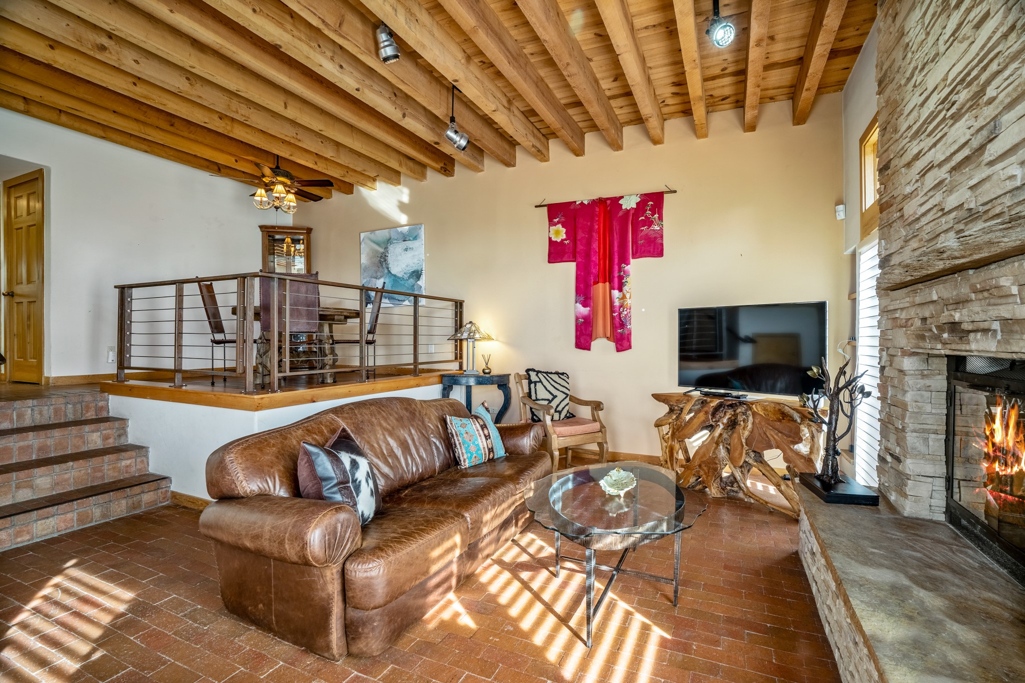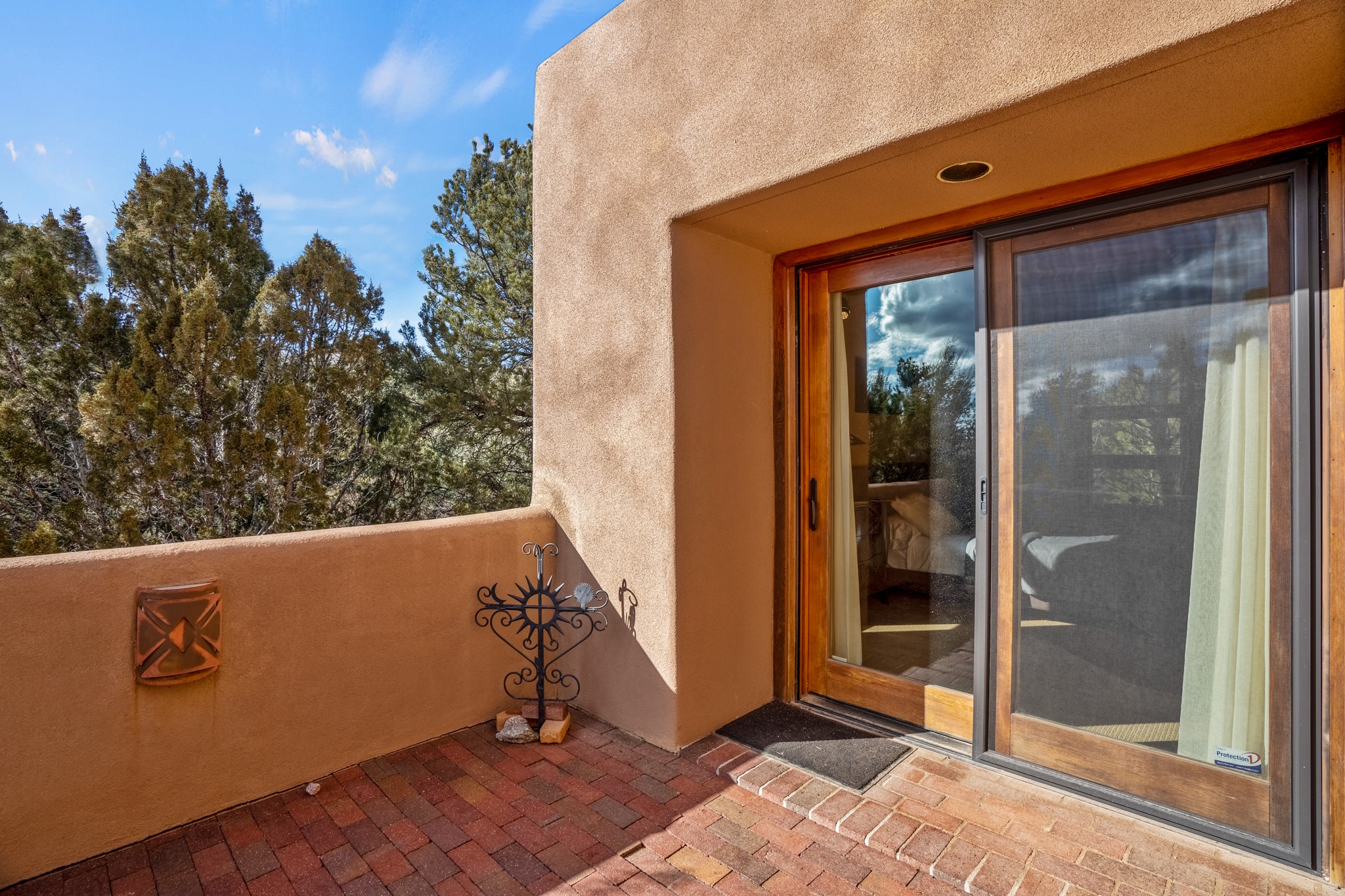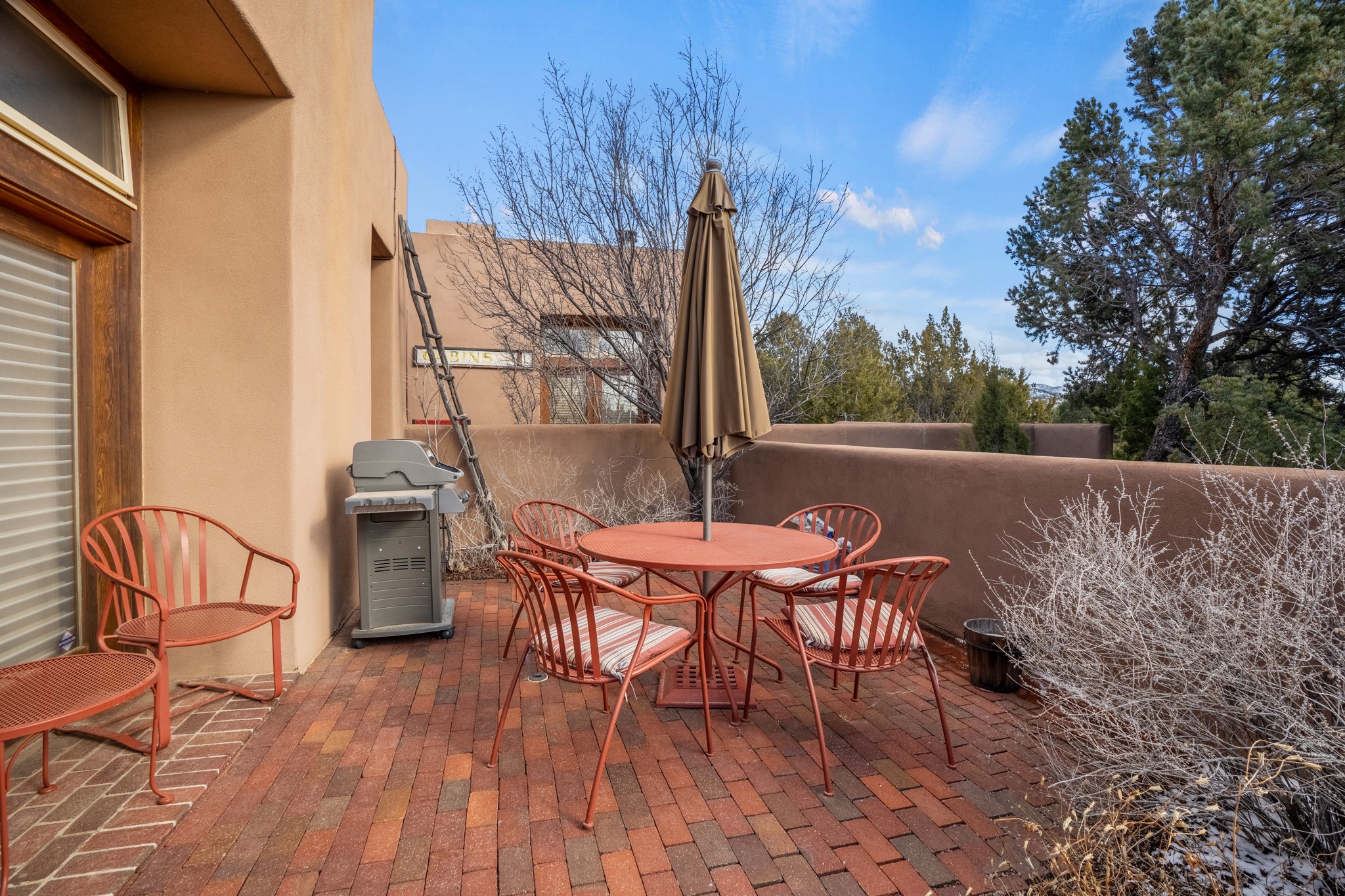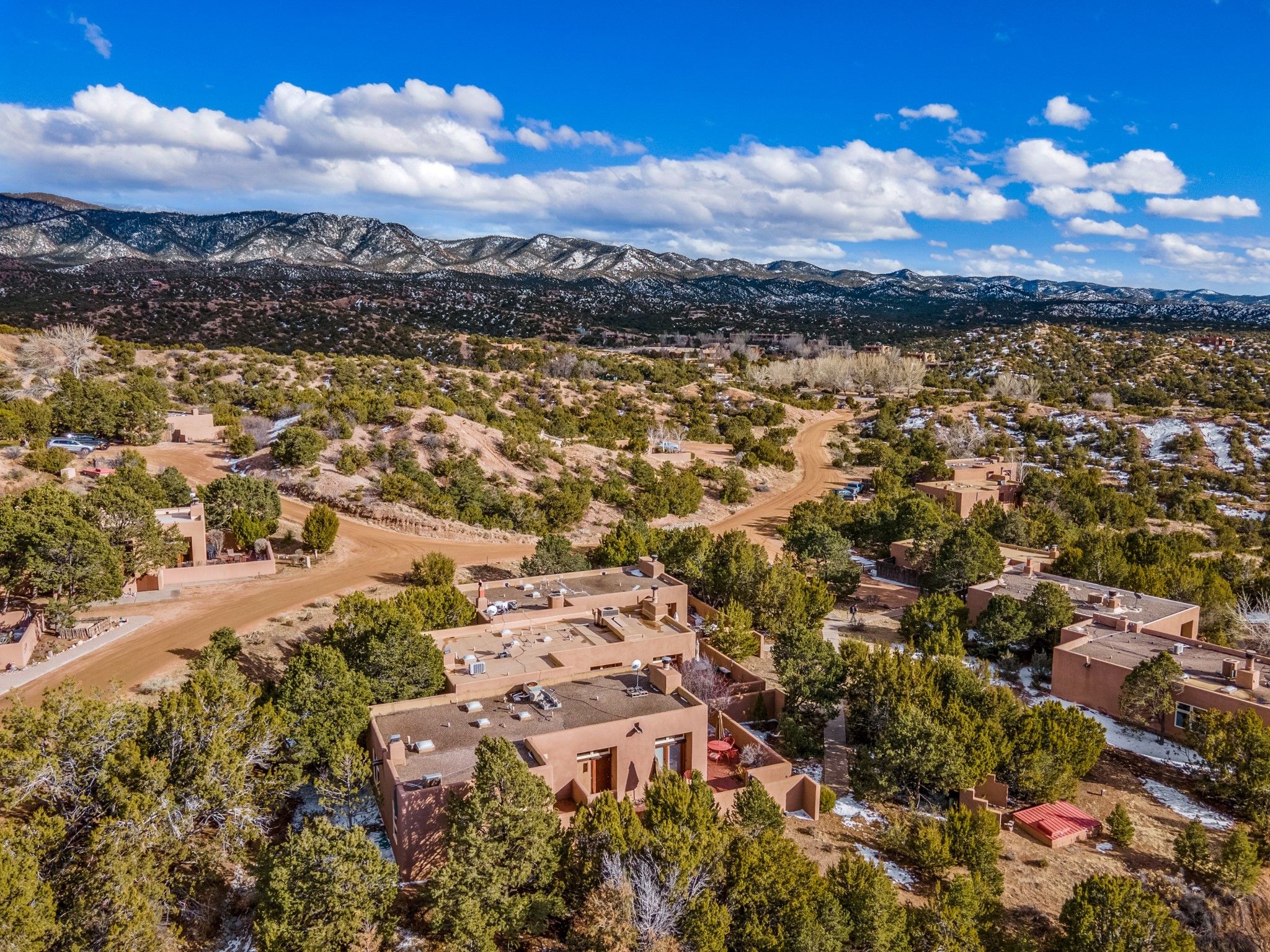 Sweet as can be condo in the ever popular Pueblo Encantado across from the Four Seasons in Tesuque. Views and Privacy from this updated 2 beds 2 full baths end unit condo. There are Brick floors in the common areas. The living room has a large stone fireplace to cozy up next to while the snow falls across the Santa Fe Dessert. The primary suite also has a wood burning kiva fireplace for Santa Fe ambiance on romantic evenings. The kitchen has been updated from the original including the cabinets, beautiful quartx counters , tile back splashes and nice stainless steel appliances. Both of the bathrooms have also been tastefully remodeled with new vanities and tile and glass showers. There is a wrap around portal to enjoy the sunsets and night skies with you family and friends. These units are often used as second homes and investment properties. There is a swimming pool, club house and on site management. THe house has Forced air and AC.