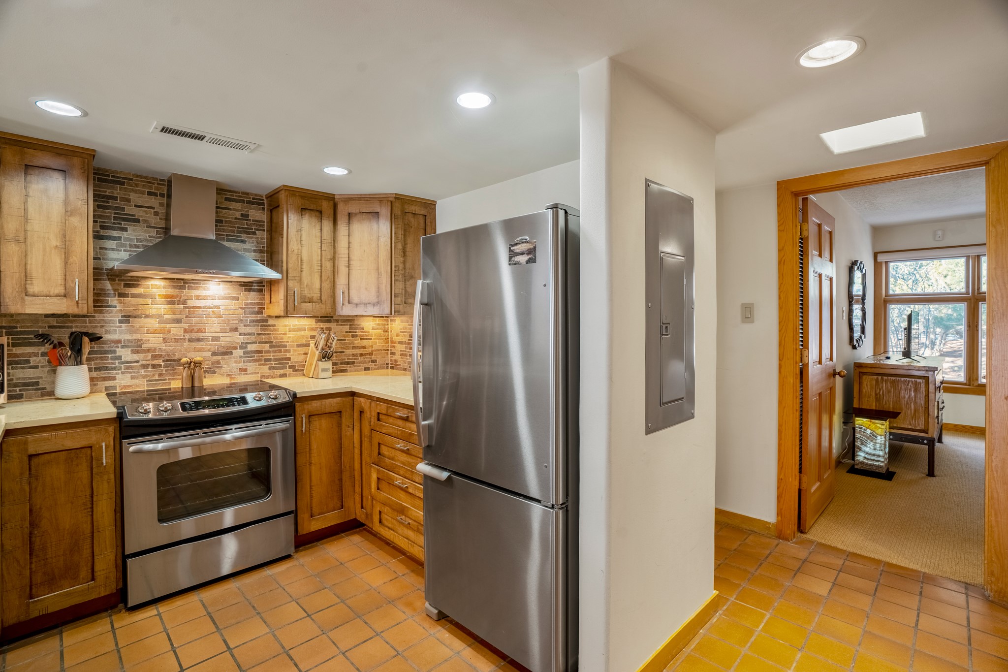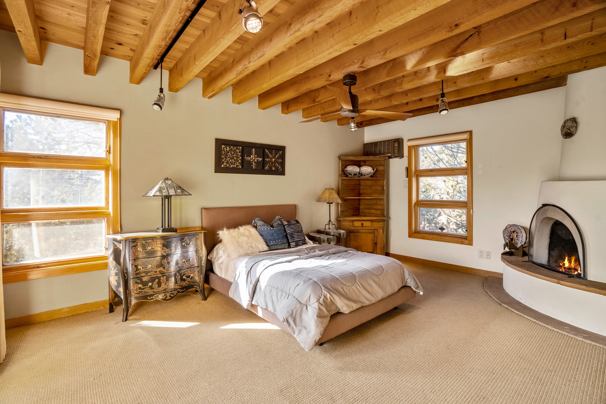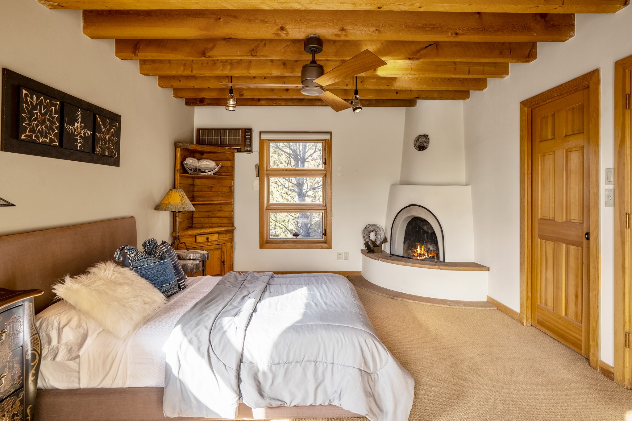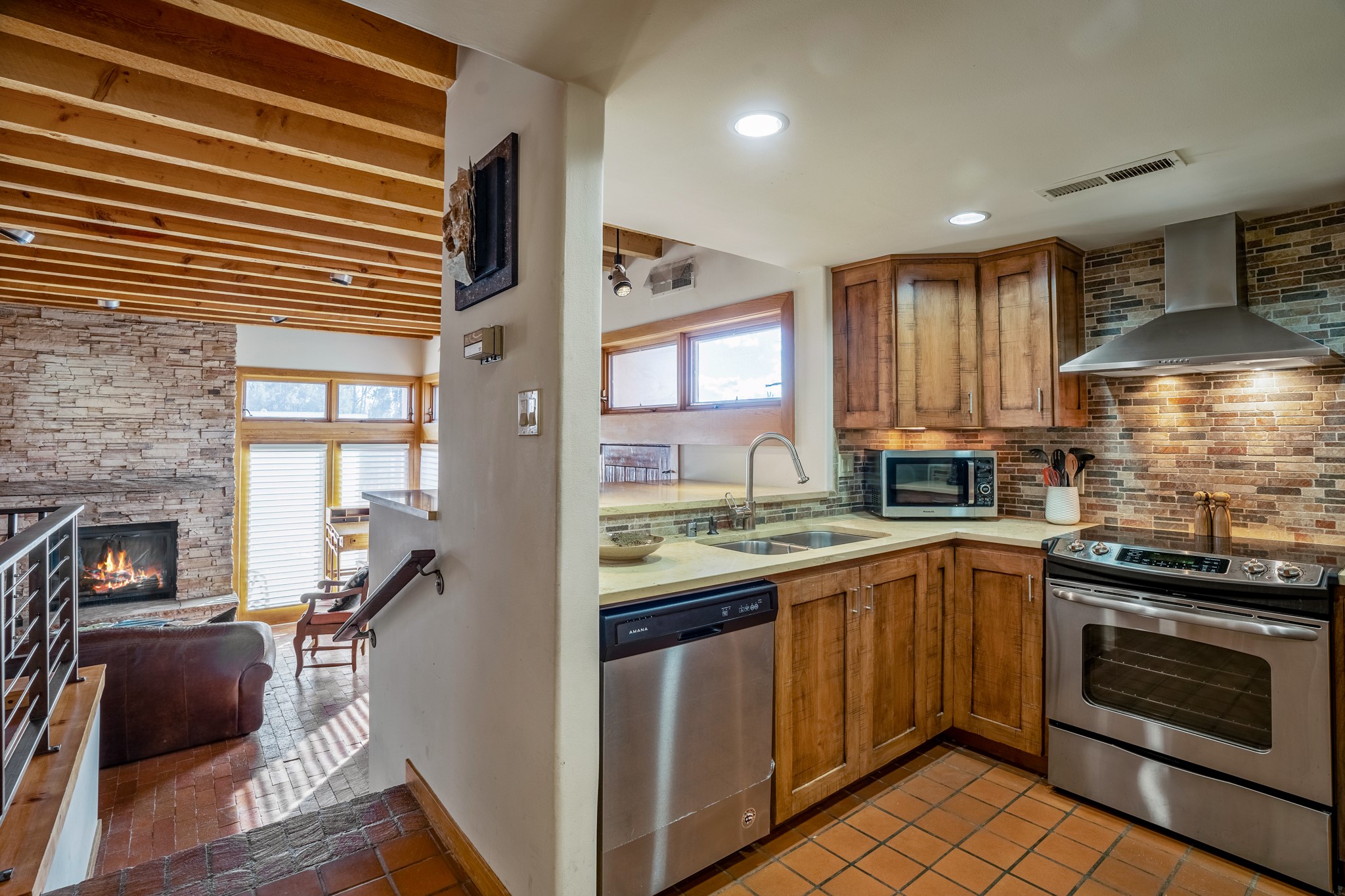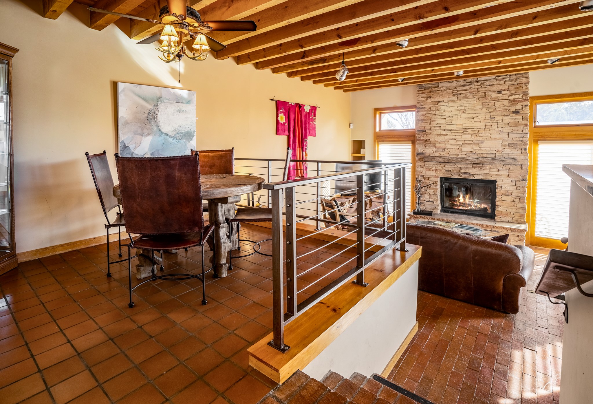 Sweet as can be condo in the ever popular Pueblo Encantado across from the Four Seasons in Tesuque. Views and Privacy from this updated 2 beds 2 full baths end unit condo. There are Brick floors in the common areas. The living room has a large stone fireplace to cozy up next to while the snow falls across the Santa Fe Dessert. The primary suite also has a wood burning kiva fireplace for Santa Fe ambiance on romantic evenings. The kitchen has been updated from the original including the cabinets, beautiful quartx counters , tile back splashes and nice stainless steel appliances. Both of the bathrooms have also been tastefully remodeled with new vanities and tile and glass showers. There is a wrap around portal to enjoy the sunsets and night skies with you family and friends. These units are often used as second homes and investment properties. There is a swimming pool, club house and on site management. THe house has Forced air and AC.