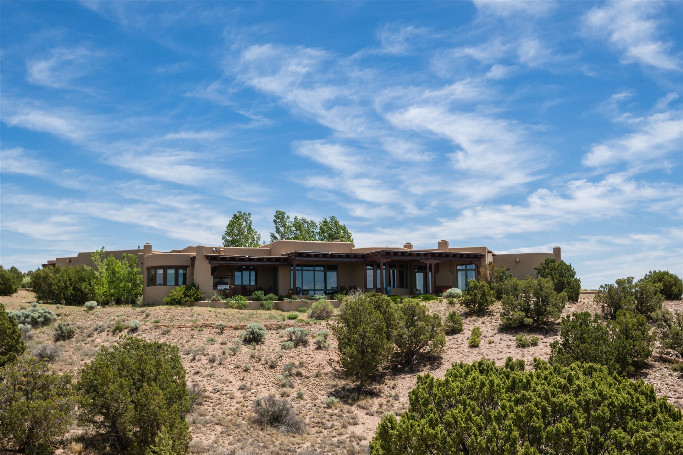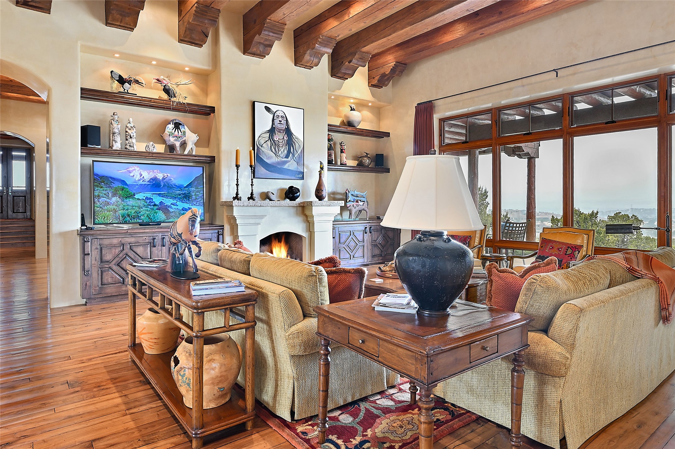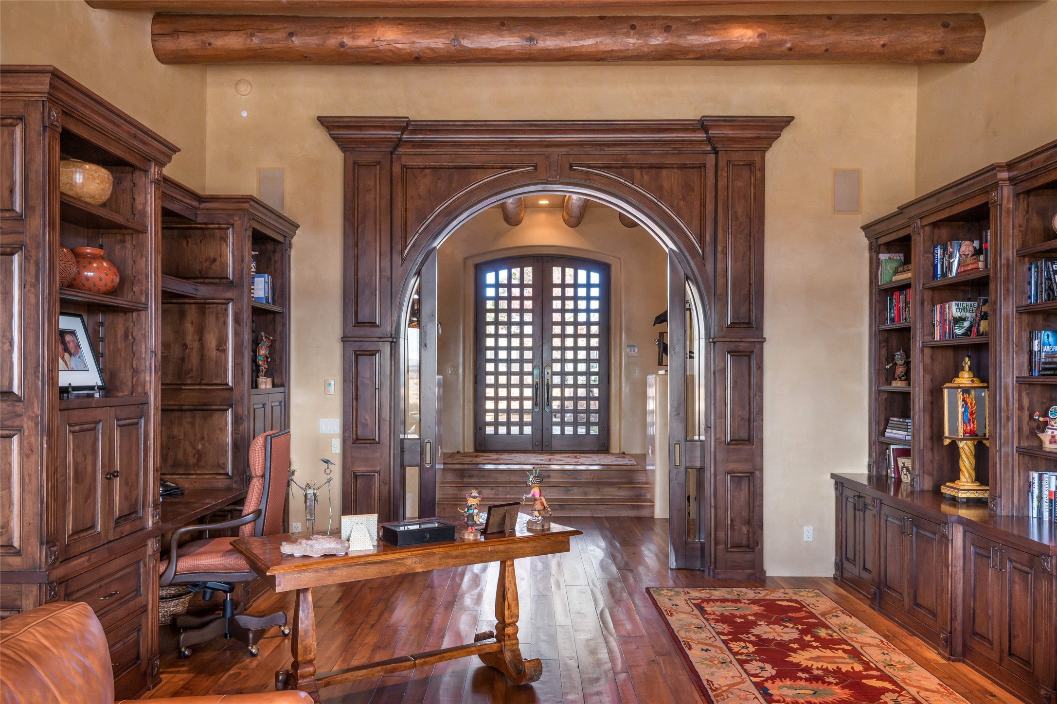 This sophisticated oasis in Las Campanas is both meticulous and inviting. Beginning with a manicured courtyard, the 6,735-square-foot residence features lovely hickory floors, hand-troweled plaster walls, sturdy beams and vigas with corbels, regal archways, limestone and ceramic tilework, and custom millwork and cabinetry. A refined but relaxed ambience fills nearly every room, from a handsome library with numerous built-ins and a chic living room with a stone fireplace and a magnificent vista to a welcoming casita with generous space for living, dining, sleeping, relaxing by the fire, or basking in enviable views. The kitchen is simultaneously impressive and charming, with a temperature-controlled wine room, two islands, superior appliances, a walk-in pantry, and a breakfast nook with built-in seating and a kiva fireplace. Just outside are a built-in grill, an alfresco fireplace, and portal space for lounging, dining, or appreciating a mesmerizing vista over the rolling hills, fairways, and rooftops of Las Campanas to the Sangre de Cristos and Jemez Mountains. The serene owner's suite has a fireplace, private portal access, and a luxurious bath with a room-sized walk-in closet, a spa-like shower, and a soaking tub beside a warming kiva fireplace. The two guest suites have walk-in closets, private baths, and access to a portal. Other highlights include an oversized three-car garage, a mudroom and office space, and a large laundry room with thoughtful built-ins.