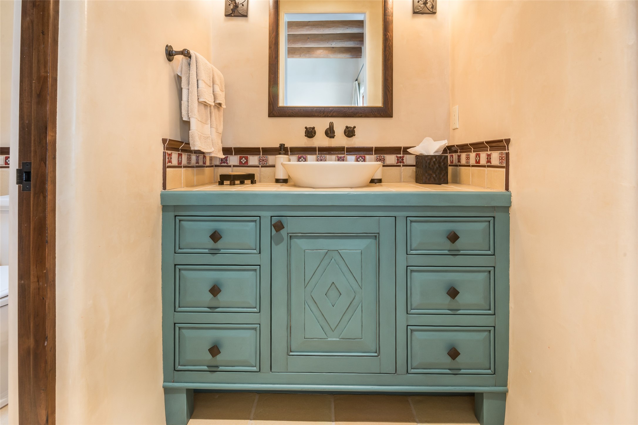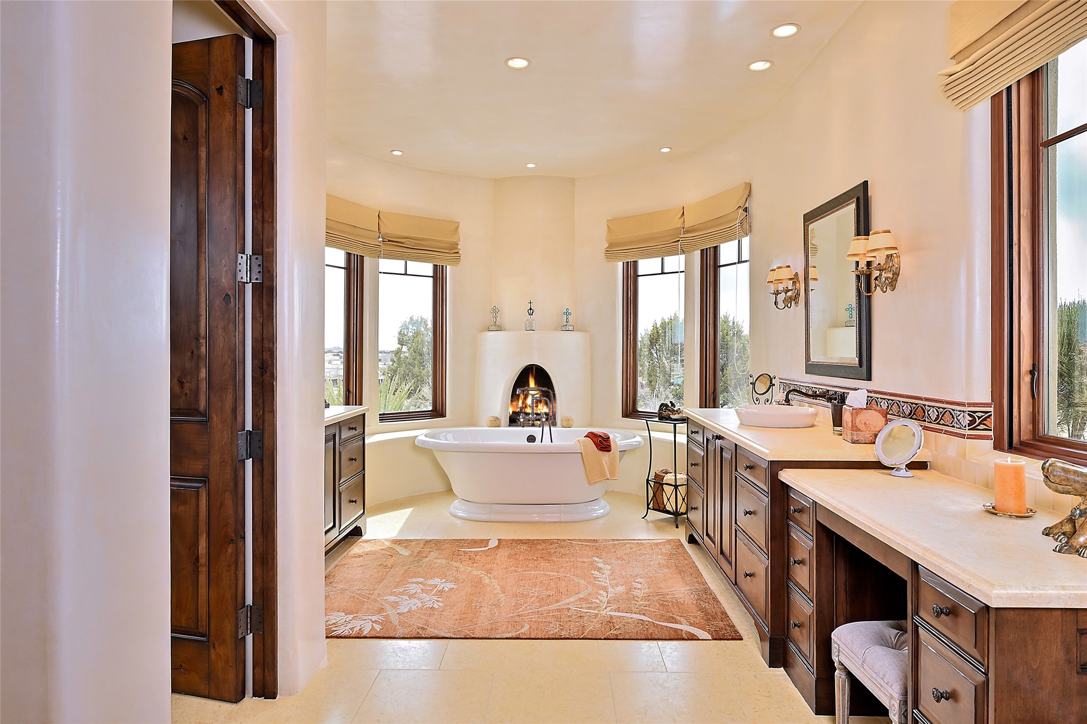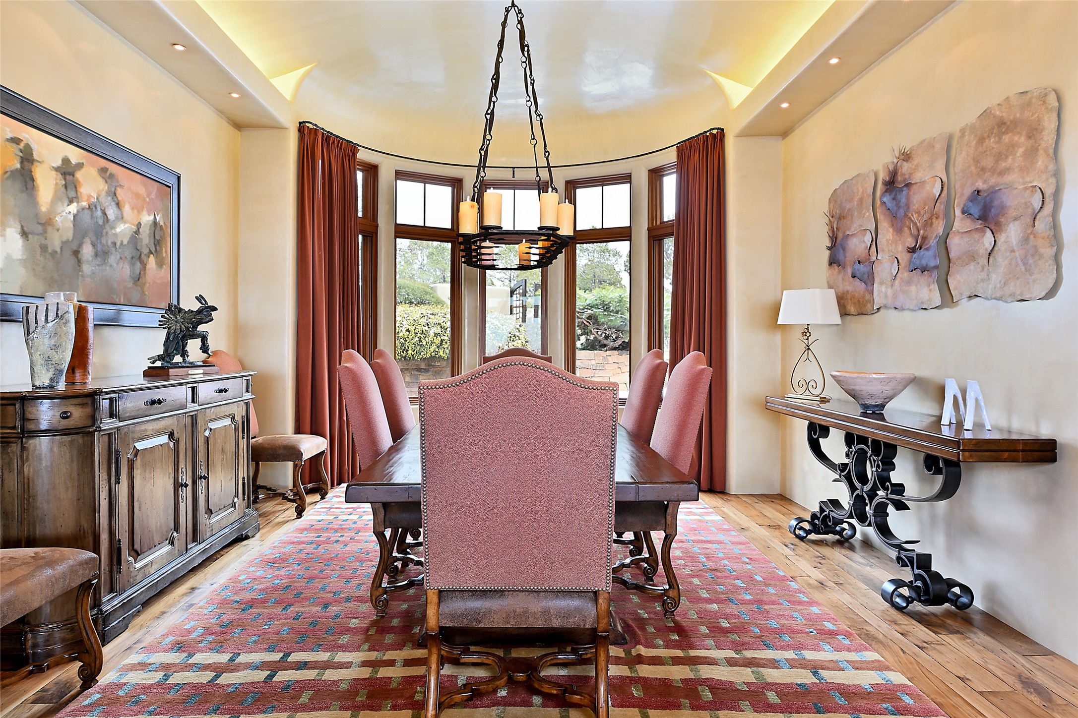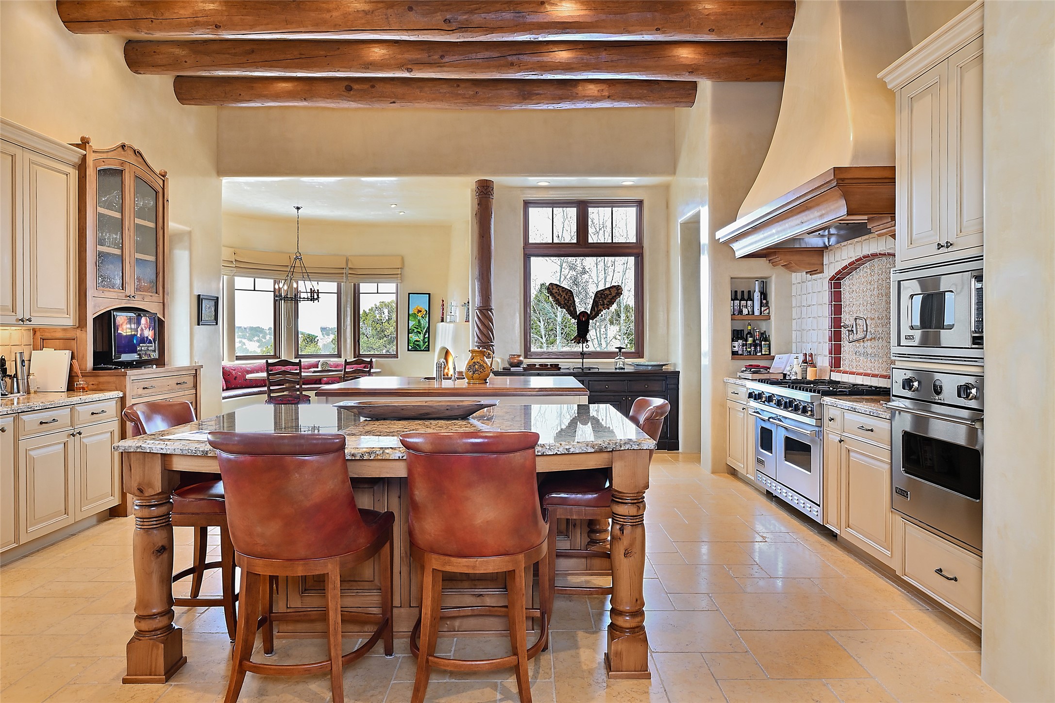 This sophisticated oasis in Las Campanas is both meticulous and inviting. Beginning with a manicured courtyard, the 6,735-square-foot residence features lovely hickory floors, hand-troweled plaster walls, sturdy beams and vigas with corbels, regal archways, limestone and ceramic tilework, and custom millwork and cabinetry. A refined but relaxed ambience fills nearly every room, from a handsome library with numerous built-ins and a chic living room with a stone fireplace and a magnificent vista to a welcoming casita with generous space for living, dining, sleeping, relaxing by the fire, or basking in enviable views. The kitchen is simultaneously impressive and charming, with a temperature-controlled wine room, two islands, superior appliances, a walk-in pantry, and a breakfast nook with built-in seating and a kiva fireplace. Just outside are a built-in grill, an alfresco fireplace, and portal space for lounging, dining, or appreciating a mesmerizing vista over the rolling hills, fairways, and rooftops of Las Campanas to the Sangre de Cristos and Jemez Mountains. The serene owner's suite has a fireplace, private portal access, and a luxurious bath with a room-sized walk-in closet, a spa-like shower, and a soaking tub beside a warming kiva fireplace. The two guest suites have walk-in closets, private baths, and access to a portal. Other highlights include an oversized three-car garage, a mudroom and office space, and a large laundry room with thoughtful built-ins.