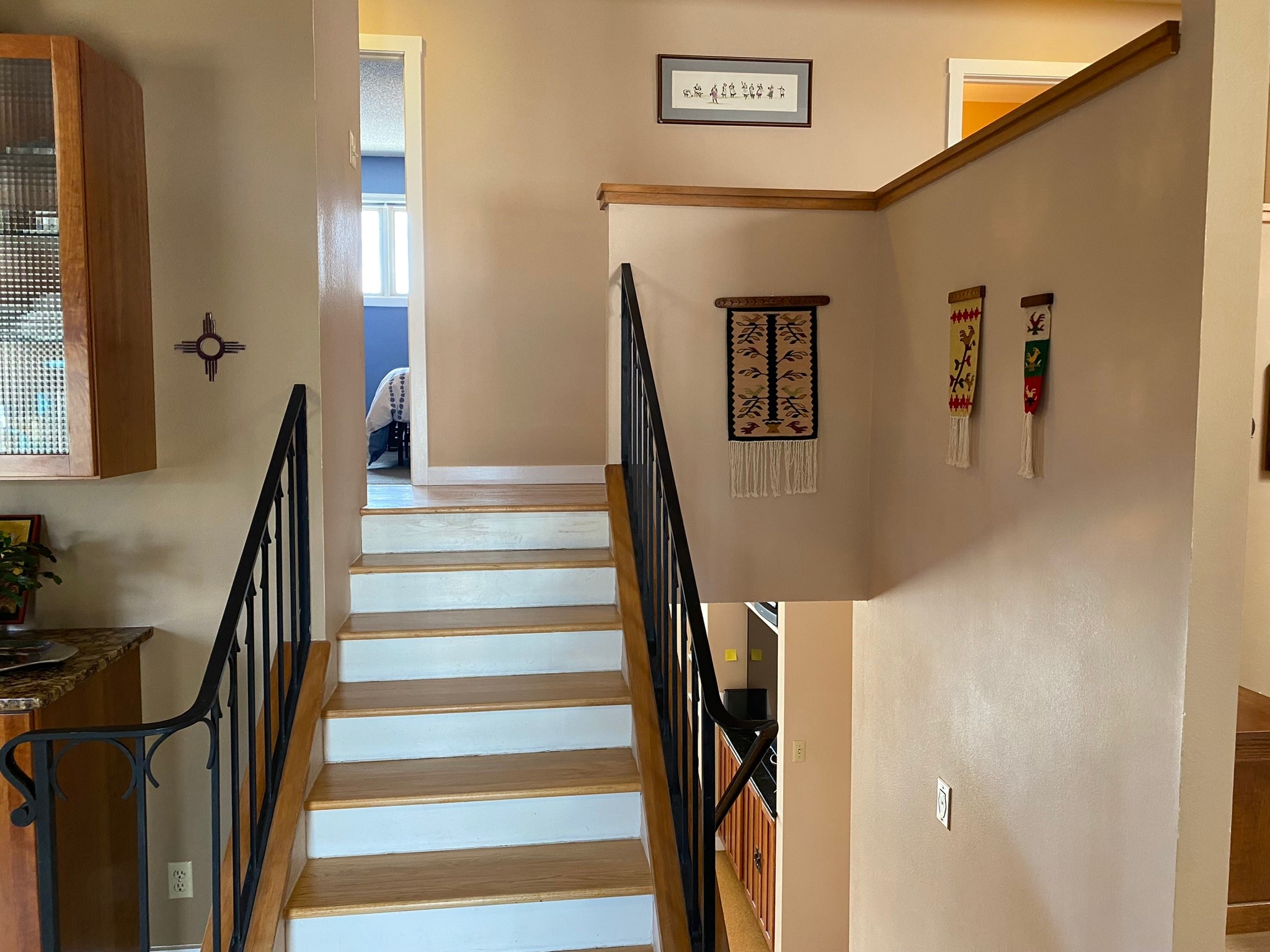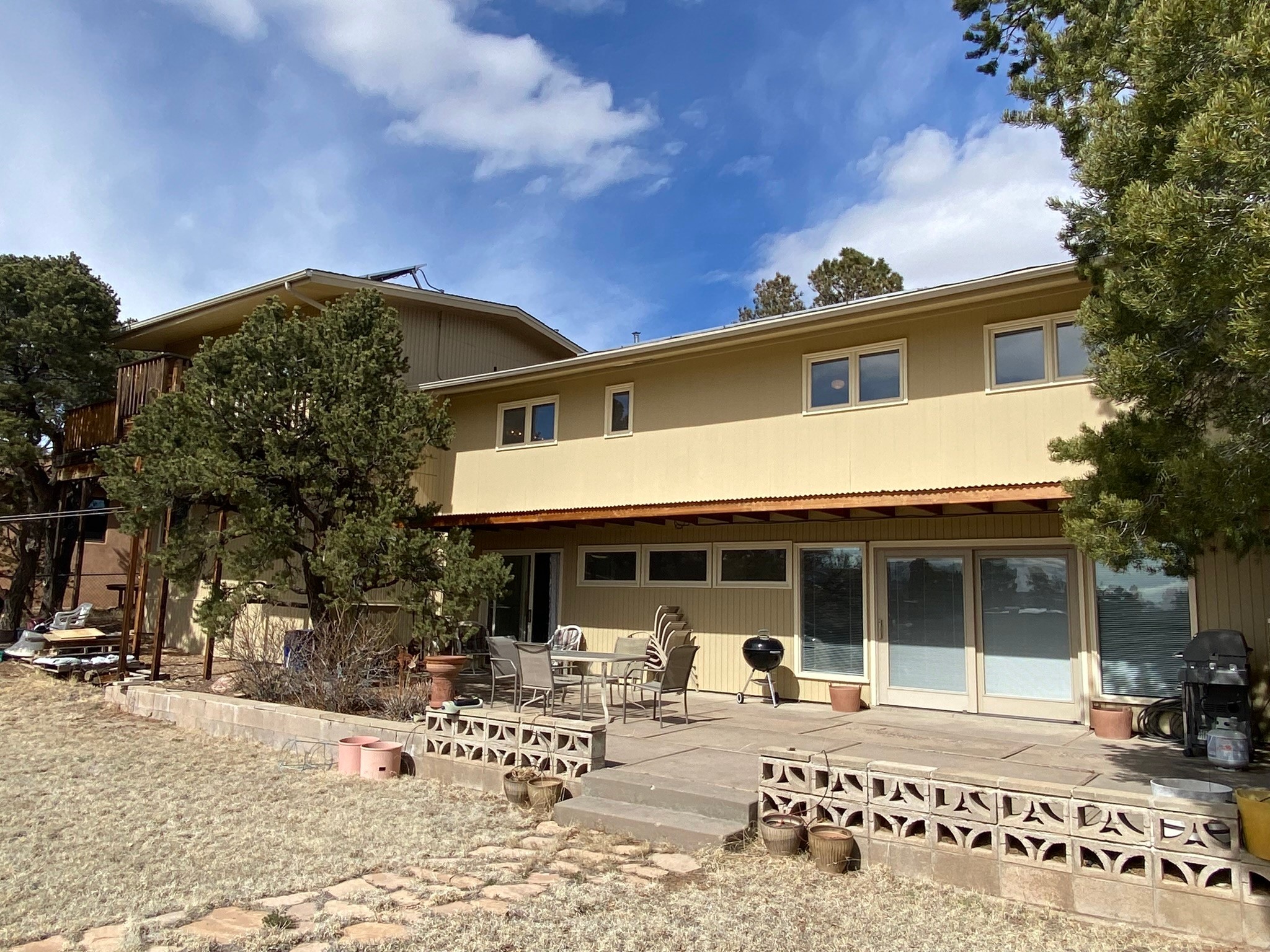 This house has it all! Room to put four cars in the garage, tons and tons of storage, gardening shed, an unfinished basement, drought resistant grass, and a view that goes on for miles! Enter into the beautifully maintained home and immediately see the pride in ownership. To your left you'll find one of two living areas complete with a wood burning fire place. To your right, an updated kitchen boasting granite counter tops and cherry wood cabinets. Upstairs you will find three of four bedrooms including a HUGE primary suite and closet. Two bathrooms service the upstairs bedrooms. Oak floors beneath your feet on main and second floor. Downstairs, on the well maintained cork floors, you'll find an additional bedroom and bathroom, plus a bonus living area, another wood burning fire place and access to the unfinished basement area. And this is just the beginning! The attached garage + shop space can hold 4 cars, could be used as a workshop and garage, tons of opportunity! Step outside and have your breath taken away with views of the Los Alamos Ski Hill, The Sandia Mountains, Sangres, Ortiz and St. Peter's Dome! Solar panels on the roof provide a nice break in the utility bills! In addition, you'll find drought resistant grass, a place for your fire pit, and additional storage for all of your gardening / lawn tools. A