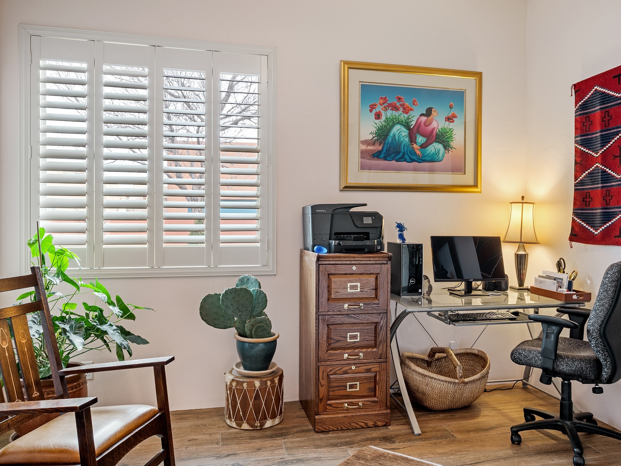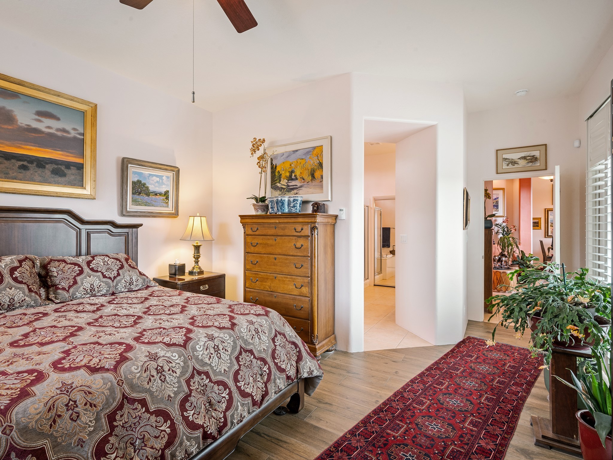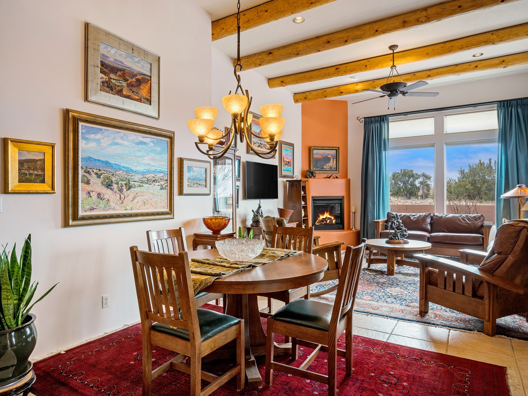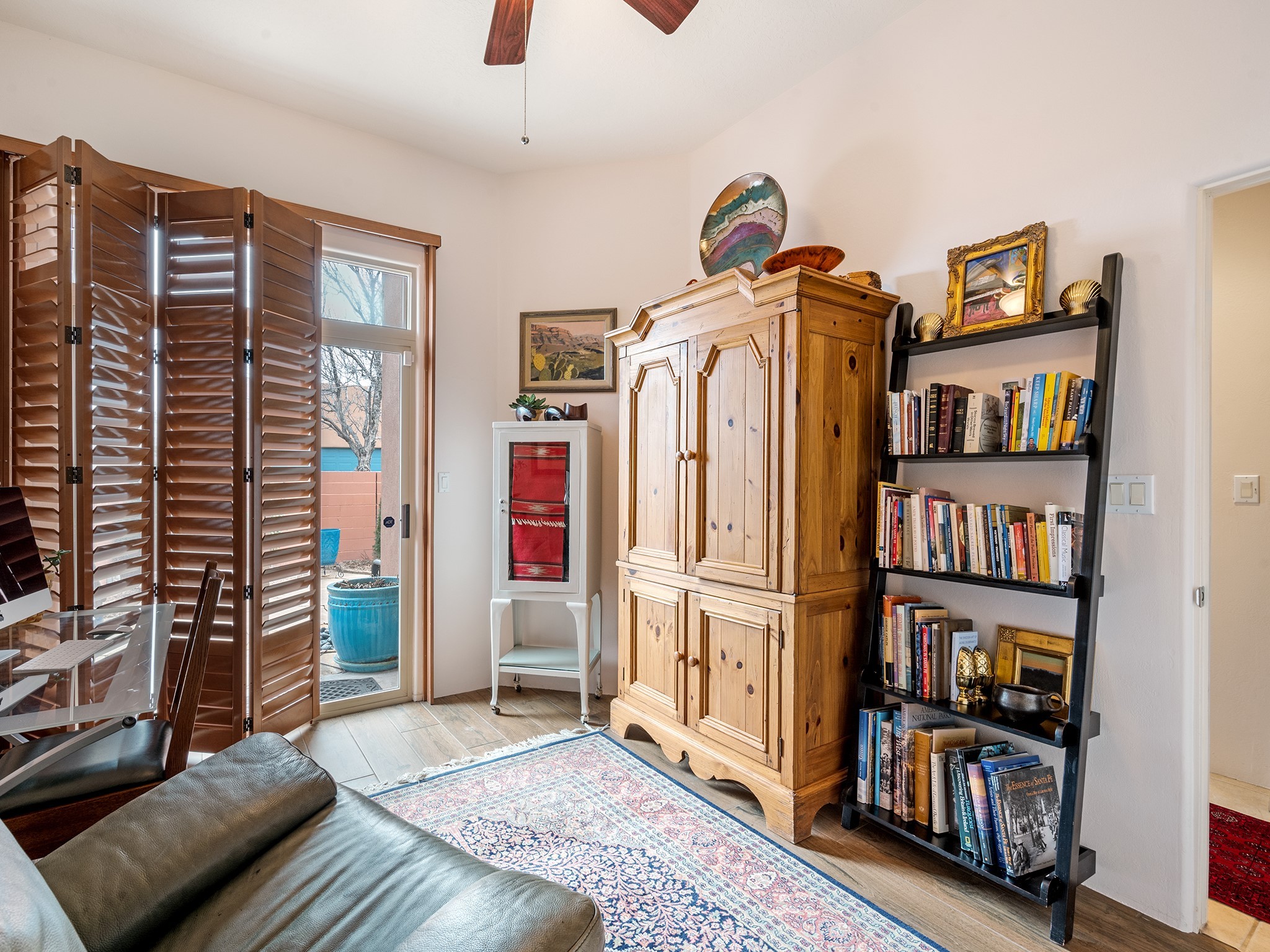 This sweet Rancho Viejo home is "Practically Perfect in Everyway". This 1751, sf 3 bed 2 bath home has been meticulously polished and maintained. Enter through the impressive courtyard stone entry and wood gate to a lush gardens with lovely perennial flowers, bushes and trees. Here, there is flagstone patio to relax and entertain. The lot is spacious and feels not only very private but solitary because it is located at the end of the street and across from open space with views of the Ortiz mountains. There is very little traffic in this area of RV. The current owners have freshly painted all of the walls with a light colored paint and tasteful accents in Hermes orange. The bedrooms have new wood looking tile floors. In the open concept living room you can enjoy the large windows with light flooding in. The high ceilings give the living room a spacious feeling. Here there is plenty of wall space for your art collection, The tall windows are dressed beautiful blue custom drapes from Linsons. One of the guest bedrooms has its own patio with a bubbling fountain and more beautiful landscaping. The primary bedroom is perfectly saturated with a sliding glass door accessing the courtyard.This house has a brand new washer and dryer in a cool navy blue. The appliances in the kitchen are all new with the exception of the refrigerator. There are many more upgrades including a new Well Mclain boiler. New sliding glass door and windows in the primary and one of the guest bedrooms. Rancho Viejo is a safe community that has many paved walking trails that meander through the open spaces. It has scenery and a peaceful feeling of being away from the city. It has easy access to shopping, the Sant E Community College. IAIA, Pantry Dos Restaurant and the Abele Elementary School.