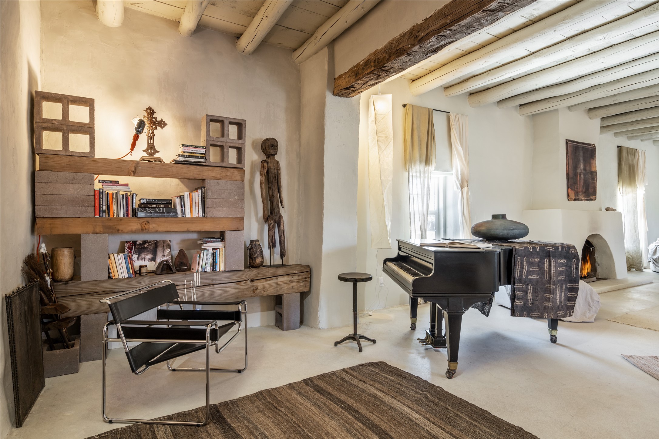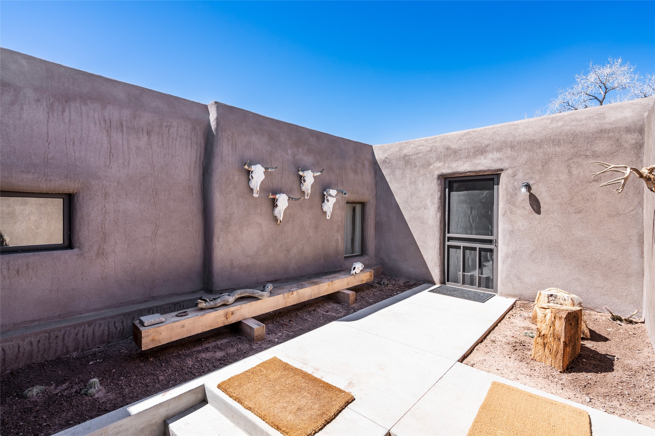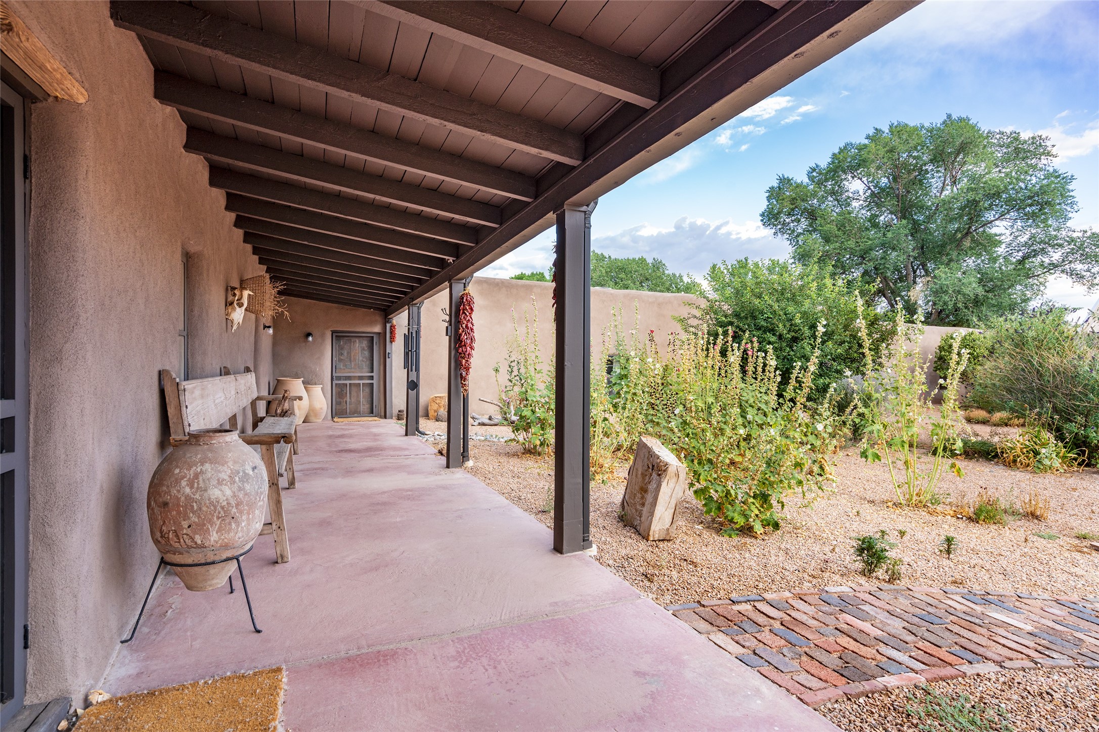 The stunning property at 4 Magdalen lies along the Galisteo Creek and is said to include the oldest home in the historic village. Previously owned by one of the founding families of Galisteo, it has been reverently renovated by the current owner who fell in love with the home, just like you will. The landmark home was partially built in the 1700s in the traditional pueblo style with adobe and rock walls, and viga ceilings. The collaborative remodel by the current owner and designer Patricia Larsen incorporates nature and light for a minimalist vibe. You enter the home under an expansive portal facing the courtyard that offers respite from the sun. The split floor plan includes 3 bedrooms, 2.5 baths, a guest kitchenette, versatile spaces that can be used for a home office or gym, a 2-car garage, and a grand room superb for entertaining. If you are looking for a zen experience when bathing, the primary bathroom is perfect with fixtures designed by John Pawson of By Cocoon. The home features 4 fireplaces, high end Viking and SMEG appliances, and is completely updated with new roof, new stucco, new electrical, new plumbing, radiant heating, and refinished interior walls and floors, providing the feeling of an old adobe with all the modern luxuries of today. Spectacular details include a door with painted designs by Fremont Ellis, a founding member of Los Cinco Pintores, a Santa Fe modernist art society. The small 3 room building said to be the oldest home in Galisteo sits on the edge of the courtyard, has electric and 2 fireplaces - could be converted to host guests. Included in the sale is .66 acres that the home and well are on, a combined 3.46 acre set of parcels connecting the home to the Galisteo Creek, and a .85 acre parcel along Hwy 41 off of the front of the home that is commercially viable. This property is gorgeous, rich with heritage and unique in that it borders the Galisteo Creek, water in NM! Experience it today.