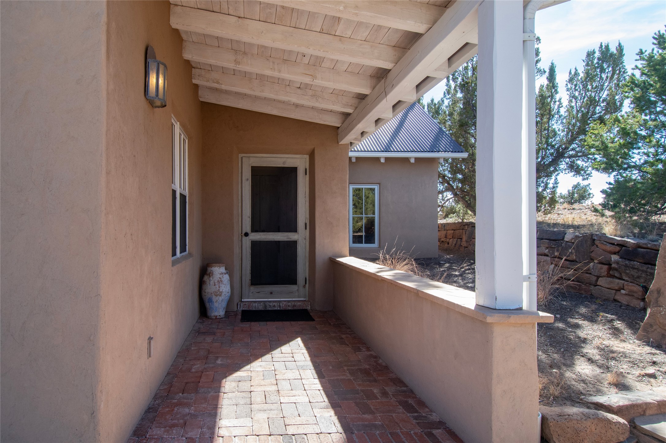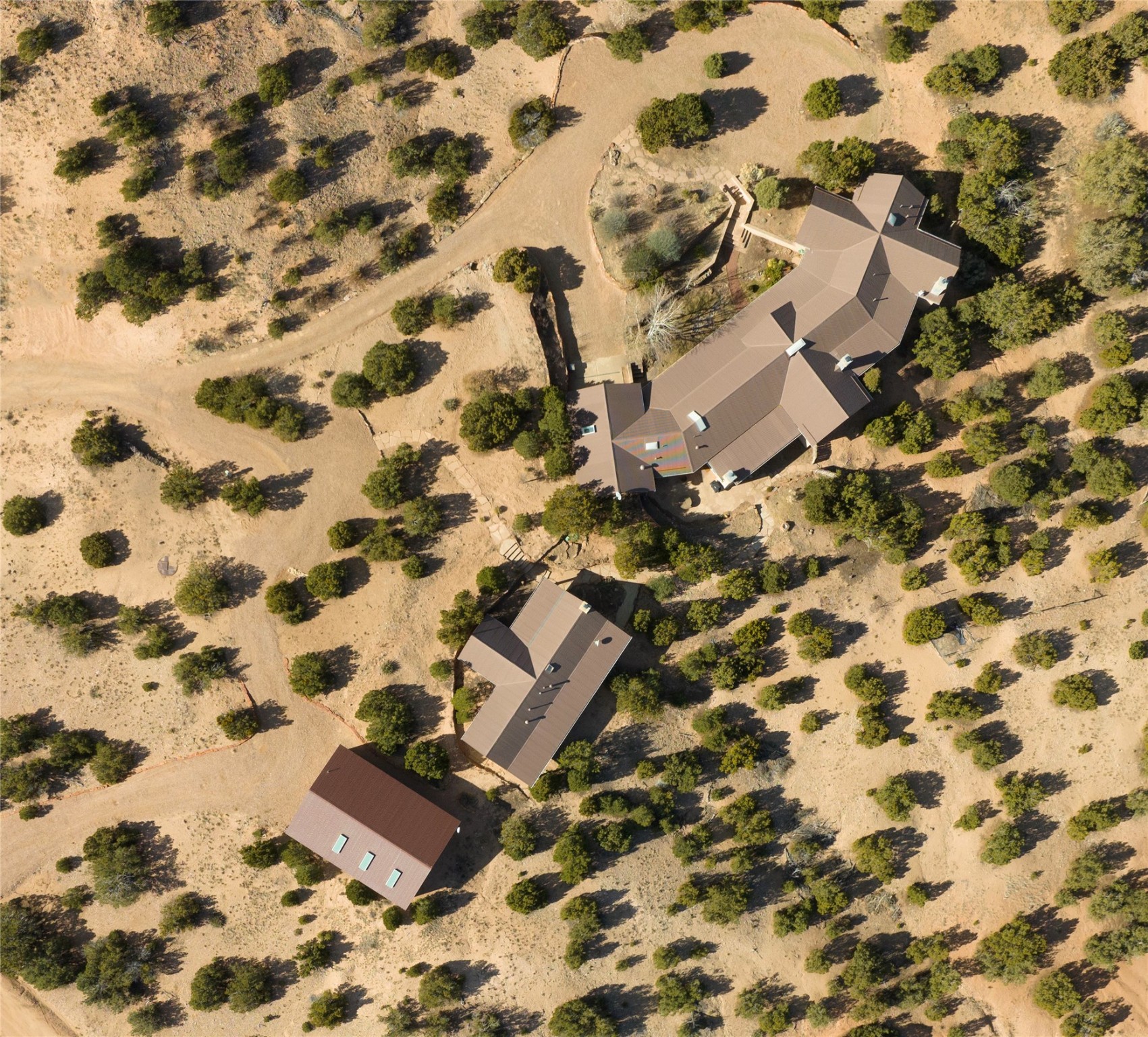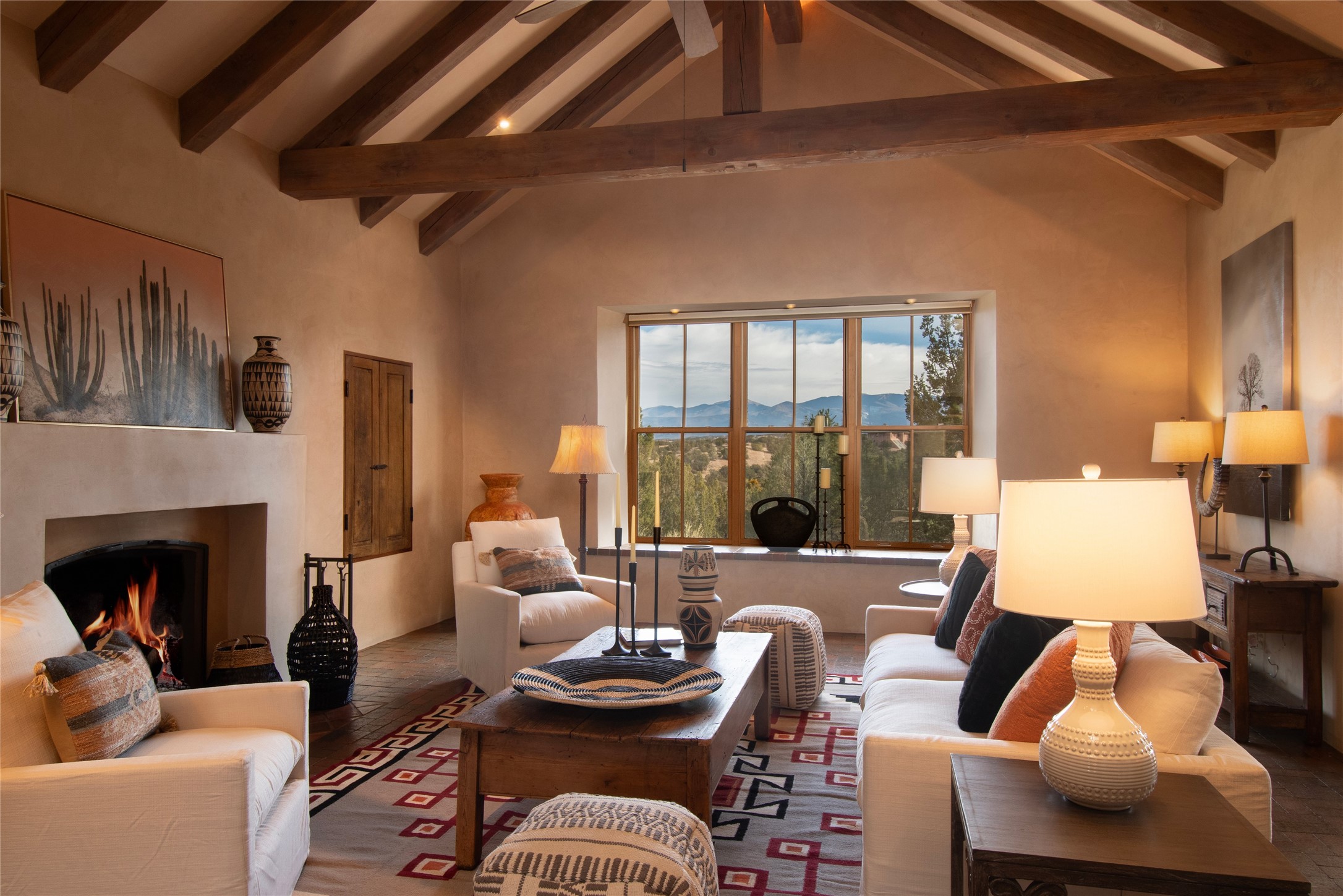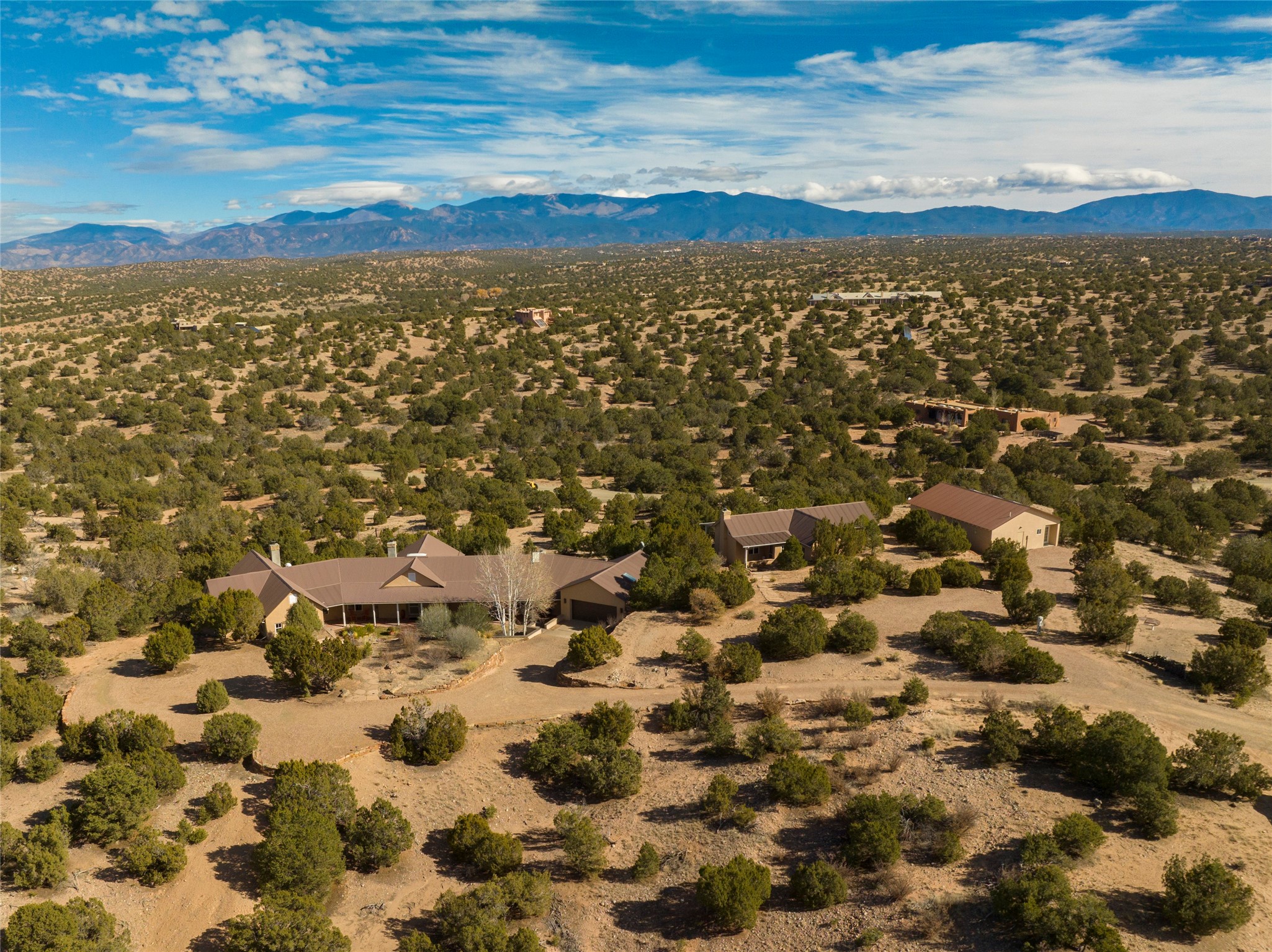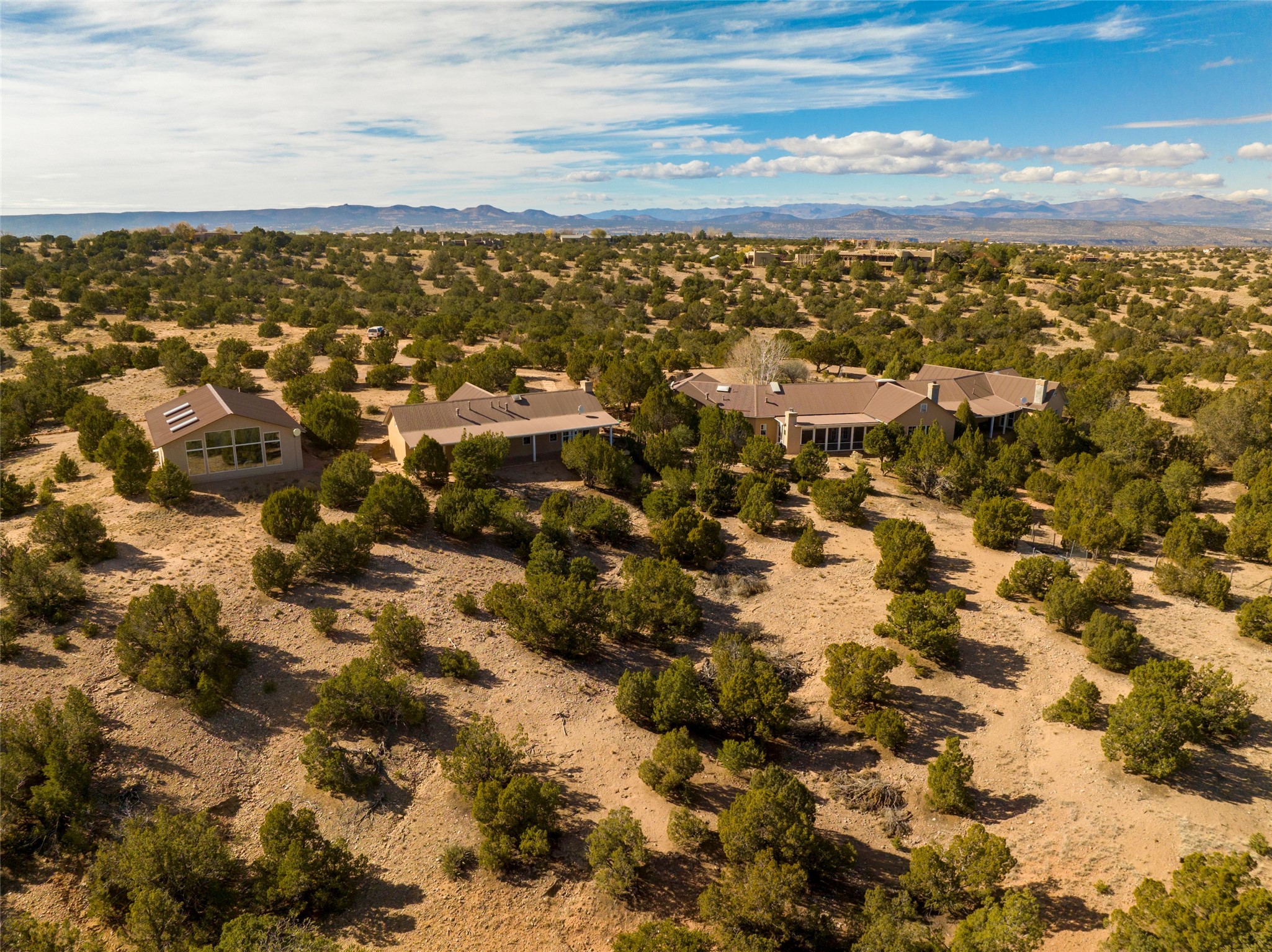 This Northern New Mexico home with detached studio & guest house sits on 13.879 acres in much-desired La Tierra Nueva. Architect, Ed Boniface and builder Tony Ivey's outstanding attention-to-detail is lovely inside and out. Single-level with some interior steps, the 3,288 sq. ft. main home features 2 bedrooms, 4 baths, and a portal running the full length of the front of the house, with expansive mountain views.Brick floors with radiant heating run throughout the home, and wooden vigas reach high into the pitched ceiling creating an inviting openness. A entry hall is open to the living room with its built-in cabinets and shelves, french doors, and a modern fireplace. Visually pleasing, this home has a subtle blending of traditional with a hint of contemporary, making it feel comfortable and original. State-of-the-art appliances and plenty of cabinet and counter space the kitchen features a built-in island with sink and can easily accommodate informal dining. The dining room and kitchen are adjacent to the living room and all have access to the dining portal. A mud room/laundry room and are to the right of the kitchen and lead to the attached 2-car garage. The other wing, to the left of the living room, houses a office, an ensuite bedroom, a powder room and the master suite with fireplace, walk-in closet and an over-sized double shower.The 1,874 sq. ft. detached guest house is as beautiful as the main house. The pitched roof is highlighted inside by wooden beams, making everything feel open and spacious. The guest house has a living room, 2 bedrooms, a full bath, and a portal for enjoying the view.A standalone 1,244 sq. ft. studio with 260 sq. ft. storage loft has huge windows, skylights and tall ceilings, and a big open space for various creative pursuits! This space could also be used for a wood shop, office, meditation room... or even a gym or weight room.This is truly a unique property offering privacy and quiet... and lots of versatility! This is a don't miss.