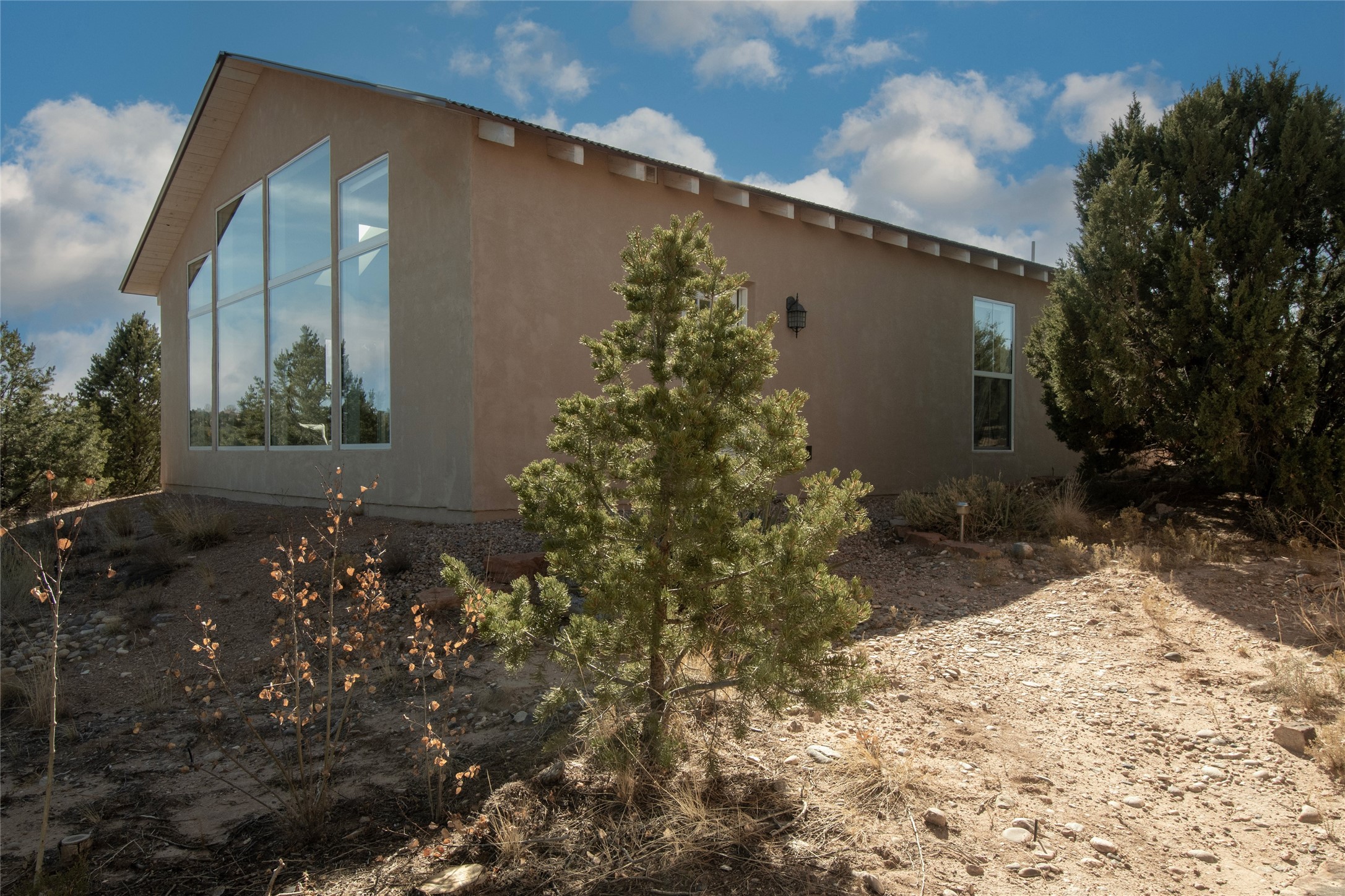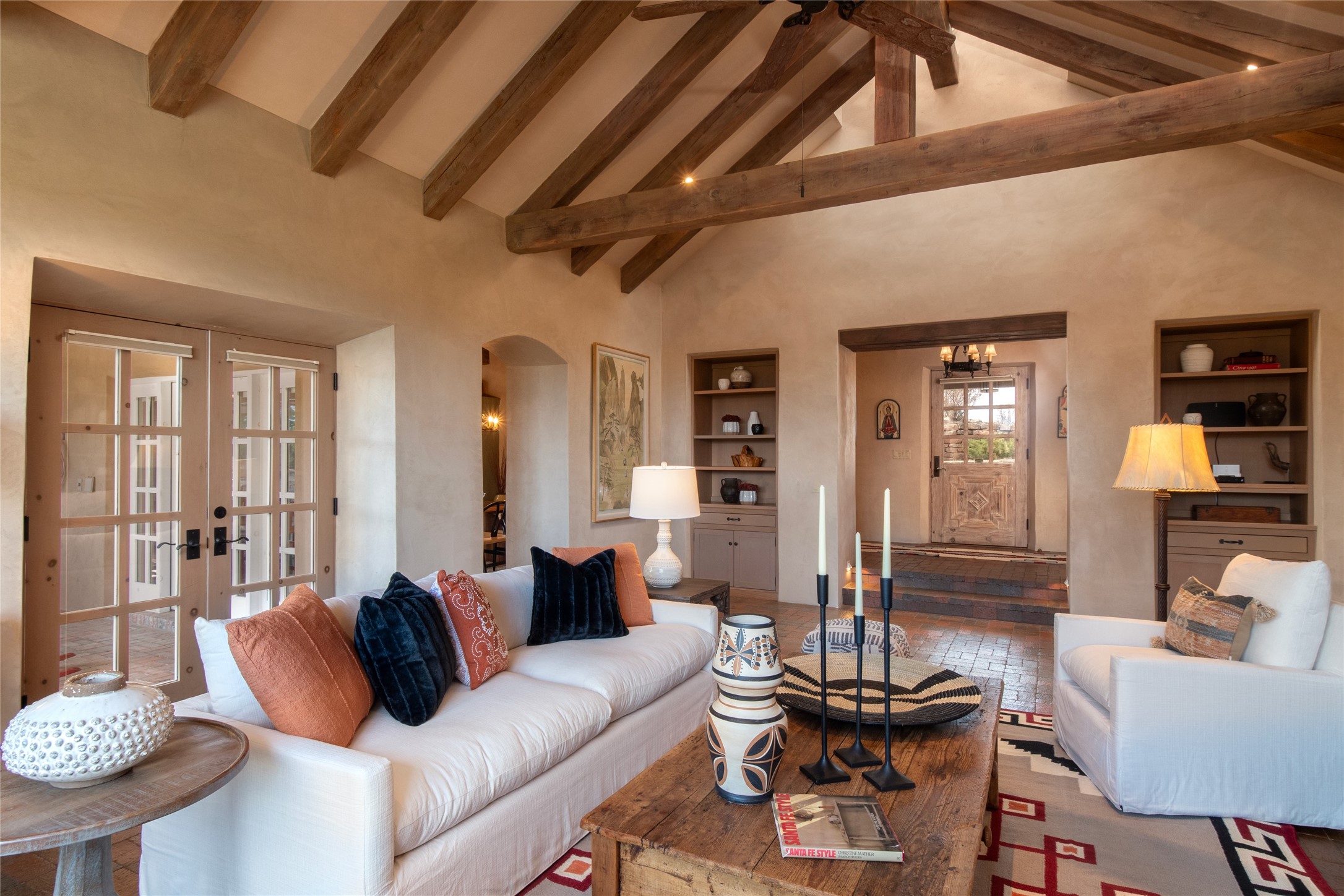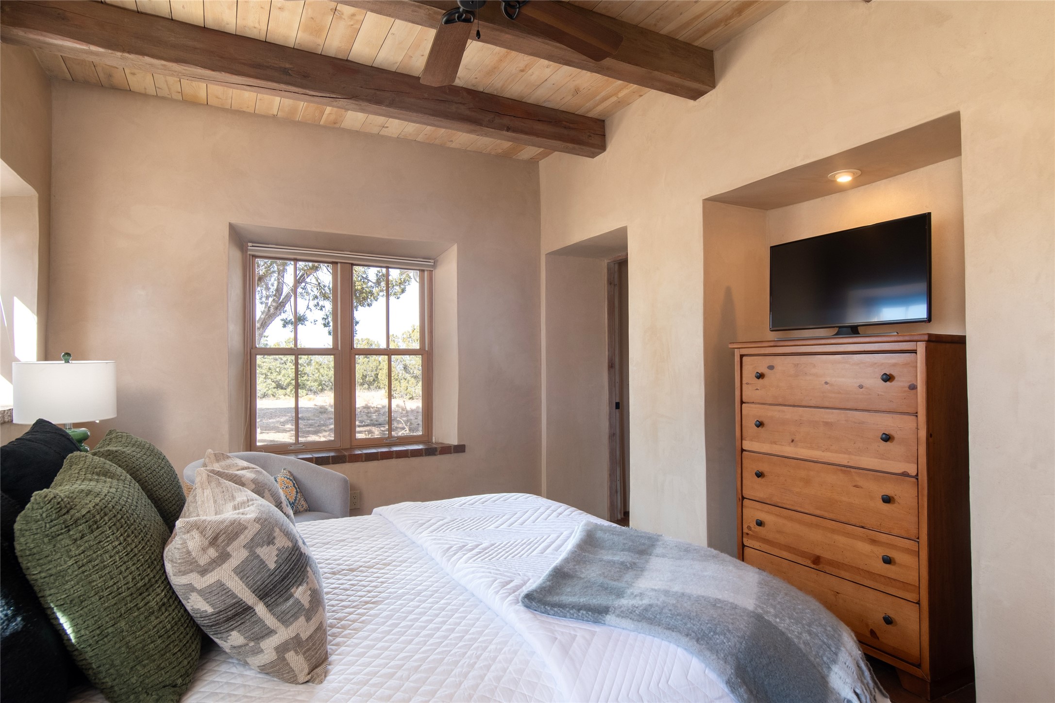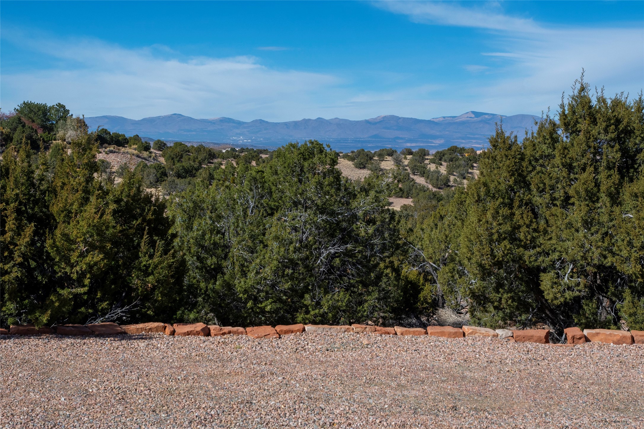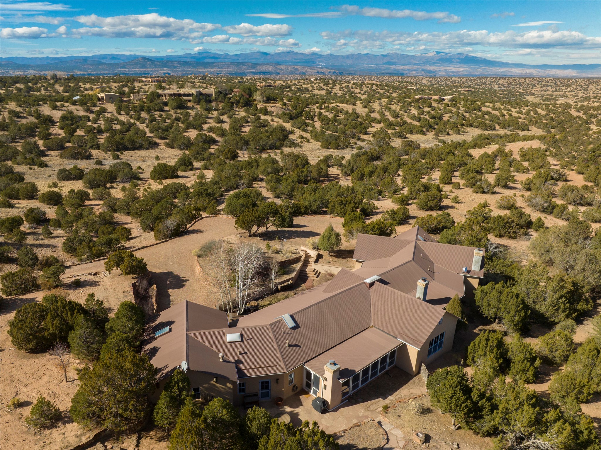This Northern New Mexico home with detached studio & guest house sits on 13.879 acres in much-desired La Tierra Nueva. Architect, Ed Boniface and builder Tony Ivey's outstanding attention-to-detail is lovely inside and out. Single-level with some interior steps, the 3,288 sq. ft. main home features 2 bedrooms, 4 baths, and a portal running the full length of the front of the house, with expansive mountain views.Brick floors with radiant heating run throughout the home, and wooden vigas reach high into the pitched ceiling creating an inviting openness. A entry hall is open to the living room with its built-in cabinets and shelves, french doors, and a modern fireplace. Visually pleasing, this home has a subtle blending of traditional with a hint of contemporary, making it feel comfortable and original. State-of-the-art appliances and plenty of cabinet and counter space the kitchen features a built-in island with sink and can easily accommodate informal dining. The dining room and kitchen are adjacent to the living room and all have access to the dining portal. A mud room/laundry room and are to the right of the kitchen and lead to the attached 2-car garage. The other wing, to the left of the living room, houses a office, an ensuite bedroom, a powder room and the master suite with fireplace, walk-in closet and an over-sized double shower.The 1,874 sq. ft. detached guest house is as beautiful as the main house. The pitched roof is highlighted inside by wooden beams, making everything feel open and spacious. The guest house has a living room, 2 bedrooms, a full bath, and a portal for enjoying the view.A standalone 1,244 sq. ft. studio with 260 sq. ft. storage loft has huge windows, skylights and tall ceilings, and a big open space for various creative pursuits! This space could also be used for a wood shop, office, meditation room... or even a gym or weight room.This is truly a unique property offering privacy and quiet... and lots of versatility! This is a don't miss.
