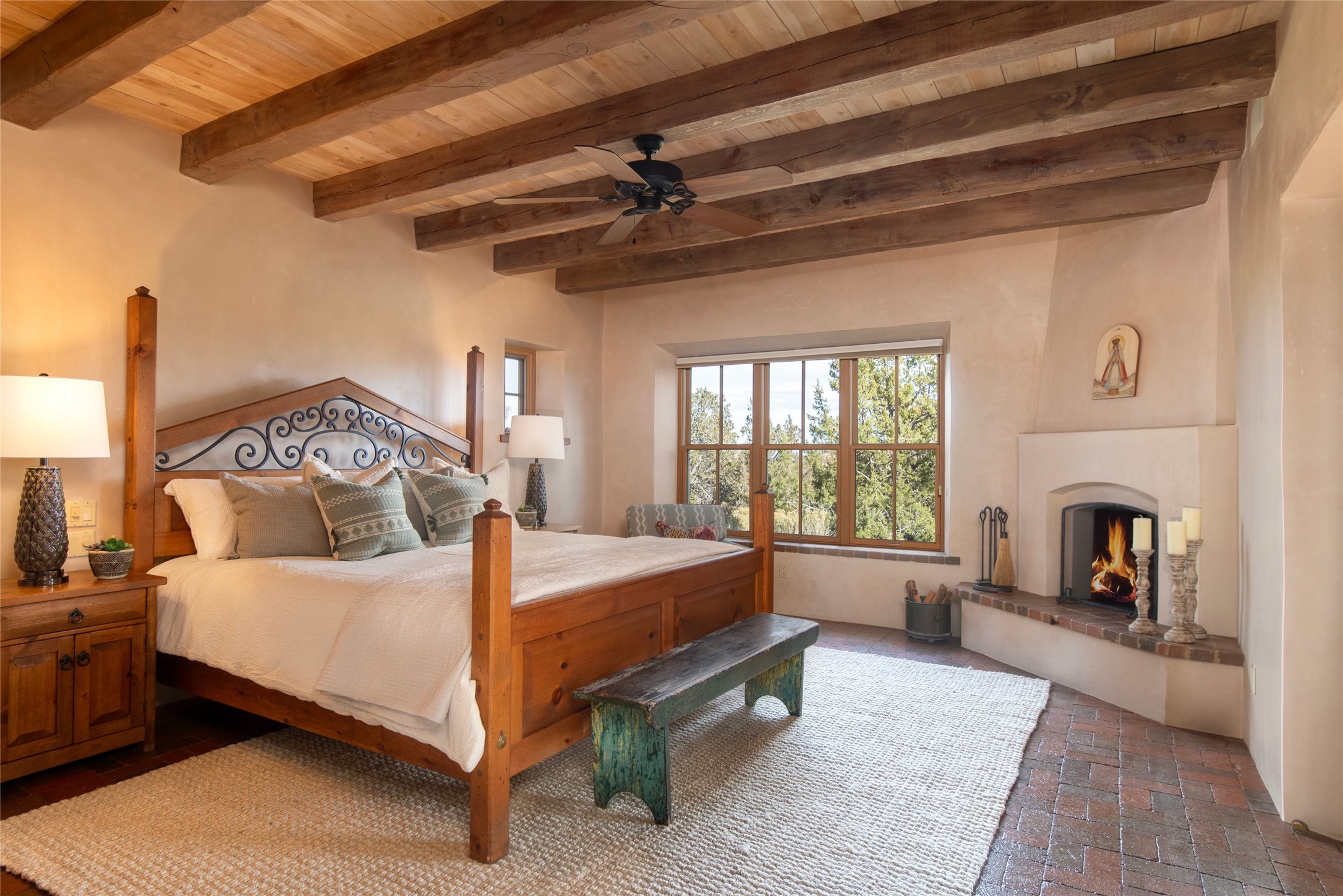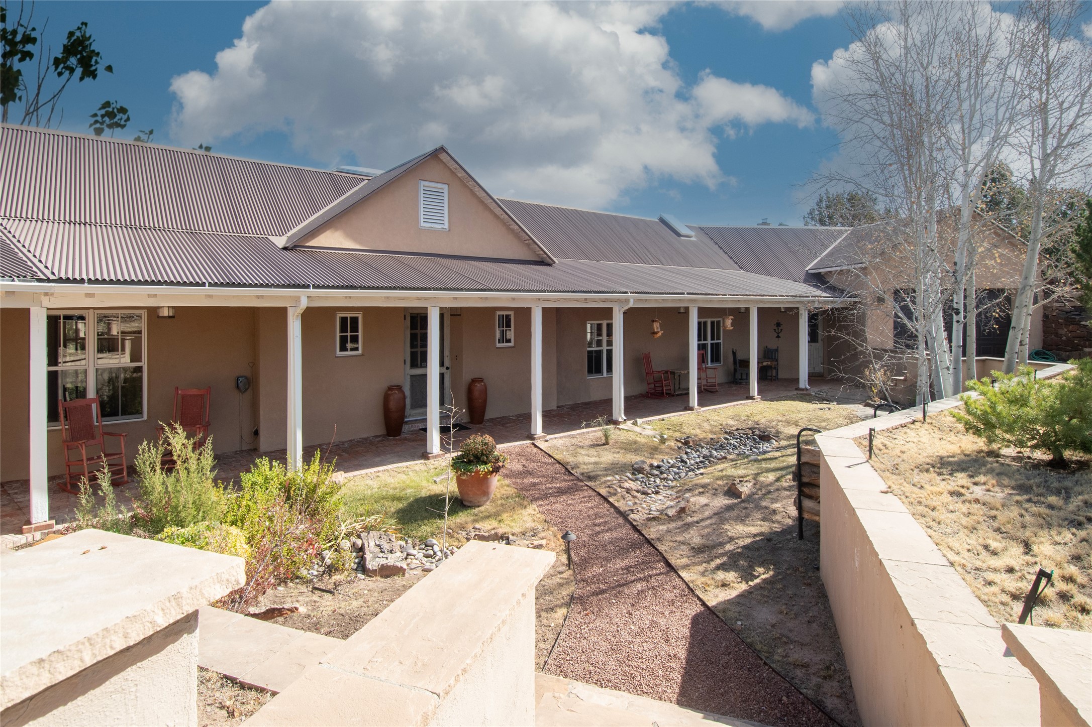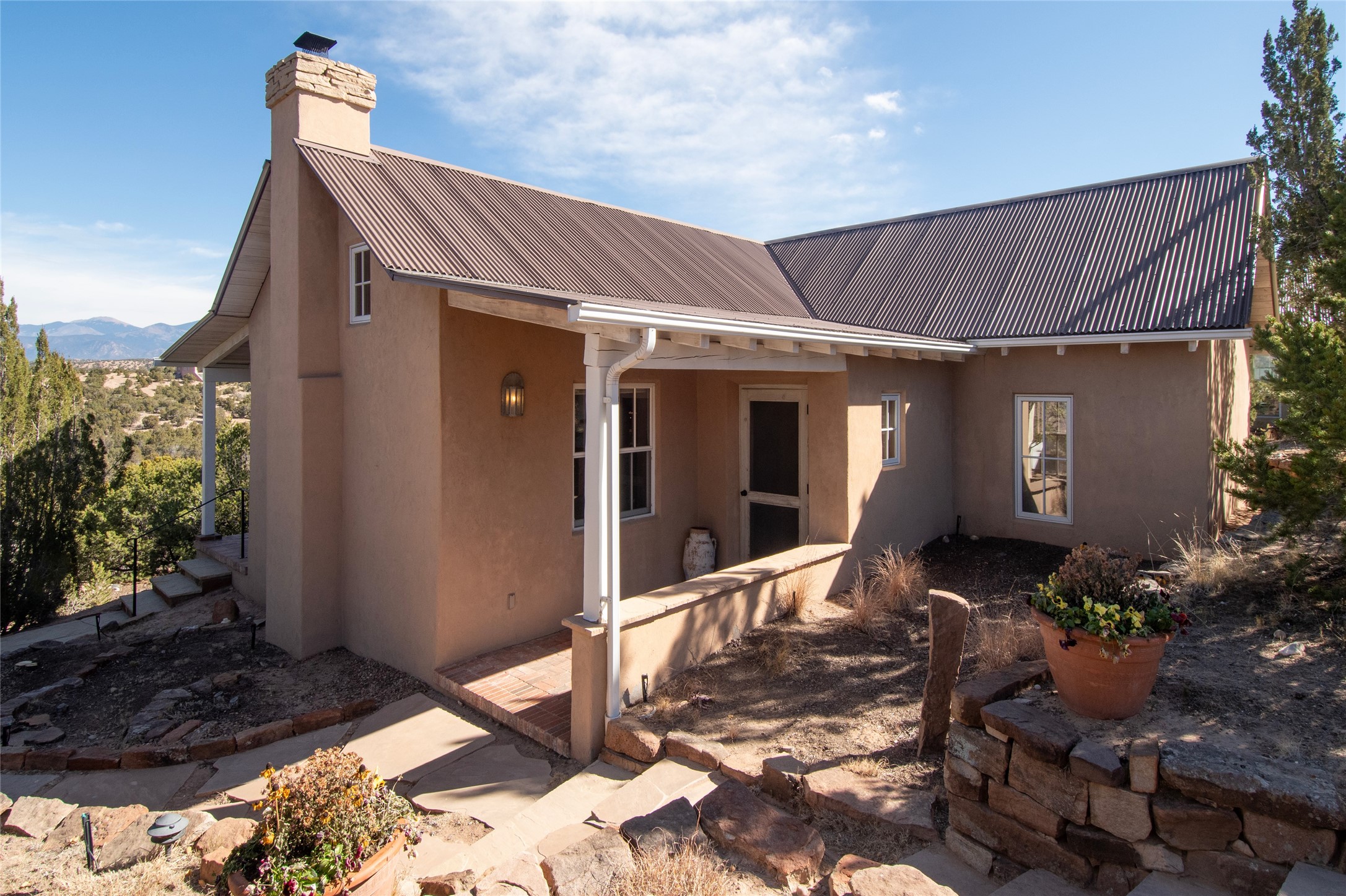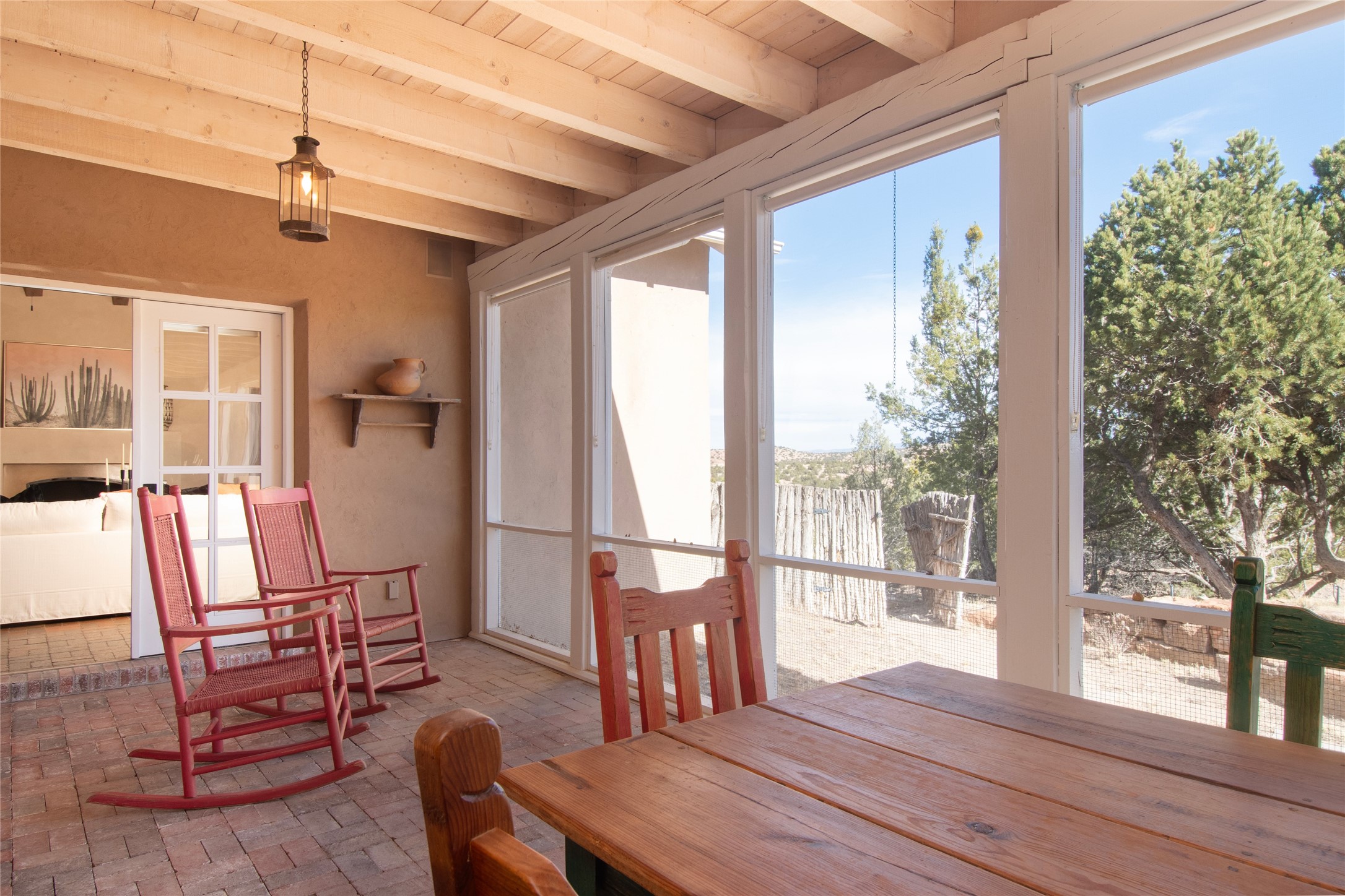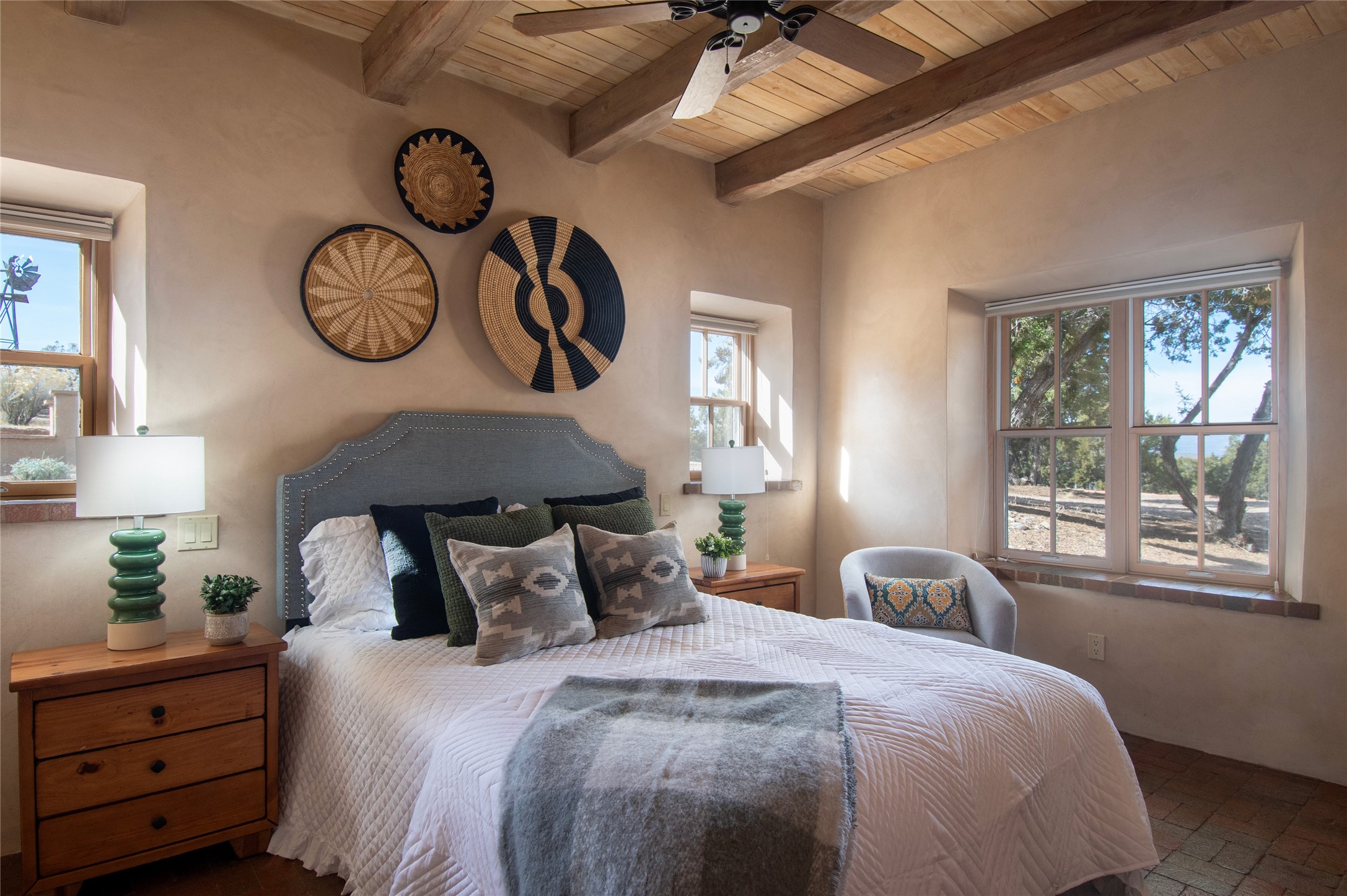 This Northern New Mexico home with detached studio & guest house sits on 13.879 acres in much-desired La Tierra Nueva. Architect, Ed Boniface and builder Tony Ivey's outstanding attention-to-detail is lovely inside and out. Single-level with some interior steps, the 3,288 sq. ft. main home features 2 bedrooms, 4 baths, and a portal running the full length of the front of the house, with expansive mountain views.Brick floors with radiant heating run throughout the home, and wooden vigas reach high into the pitched ceiling creating an inviting openness. A entry hall is open to the living room with its built-in cabinets and shelves, french doors, and a modern fireplace. Visually pleasing, this home has a subtle blending of traditional with a hint of contemporary, making it feel comfortable and original. State-of-the-art appliances and plenty of cabinet and counter space the kitchen features a built-in island with sink and can easily accommodate informal dining. The dining room and kitchen are adjacent to the living room and all have access to the dining portal. A mud room/laundry room and are to the right of the kitchen and lead to the attached 2-car garage. The other wing, to the left of the living room, houses a office, an ensuite bedroom, a powder room and the master suite with fireplace, walk-in closet and an over-sized double shower.The 1,874 sq. ft. detached guest house is as beautiful as the main house. The pitched roof is highlighted inside by wooden beams, making everything feel open and spacious. The guest house has a living room, 2 bedrooms, a full bath, and a portal for enjoying the view.A standalone 1,244 sq. ft. studio with 260 sq. ft. storage loft has huge windows, skylights and tall ceilings, and a big open space for various creative pursuits! This space could also be used for a wood shop, office, meditation room... or even a gym or weight room.This is truly a unique property offering privacy and quiet... and lots of versatility! This is a don't miss.