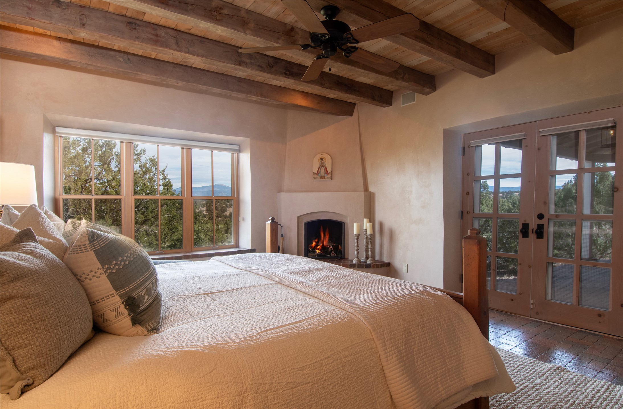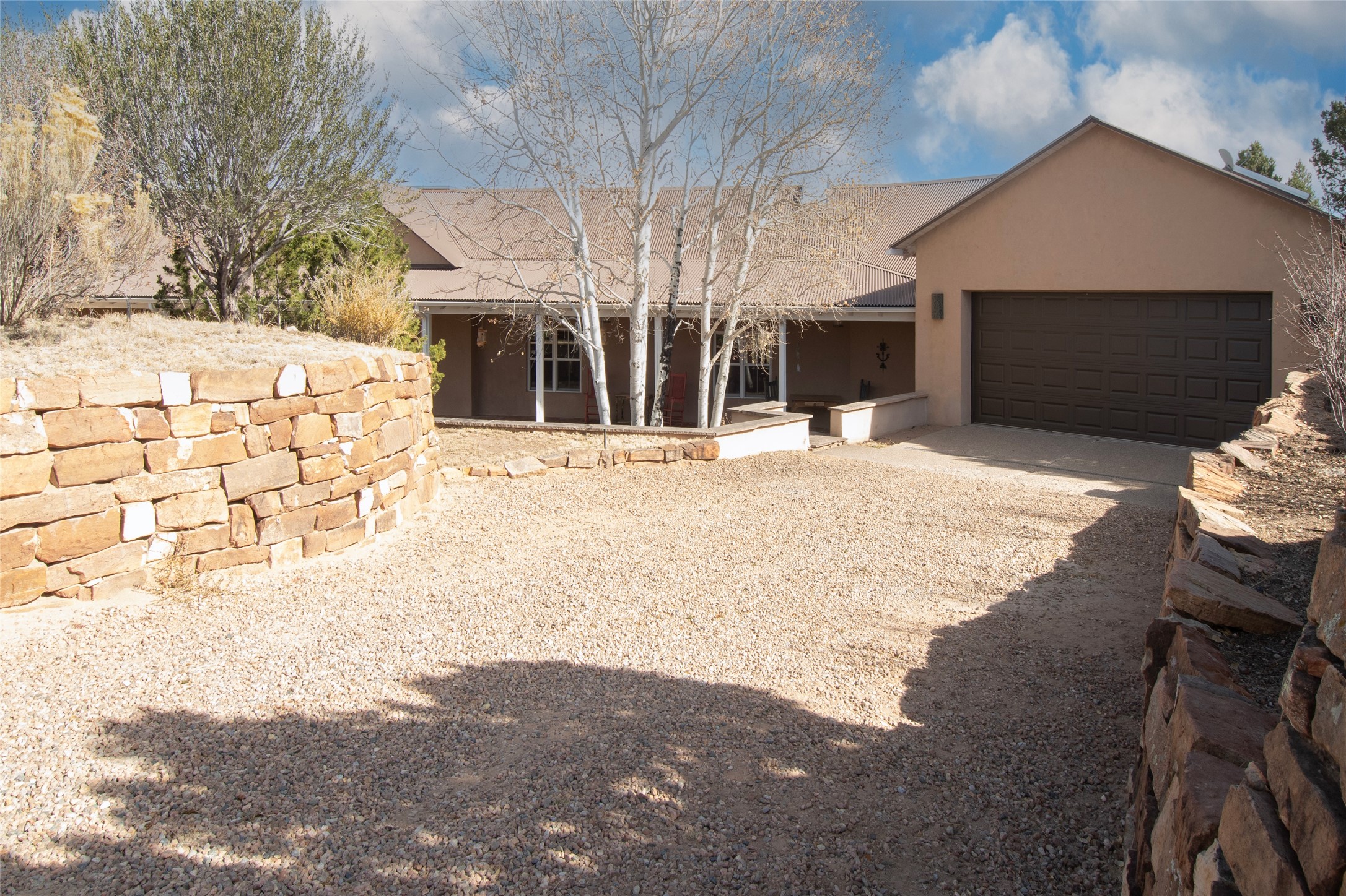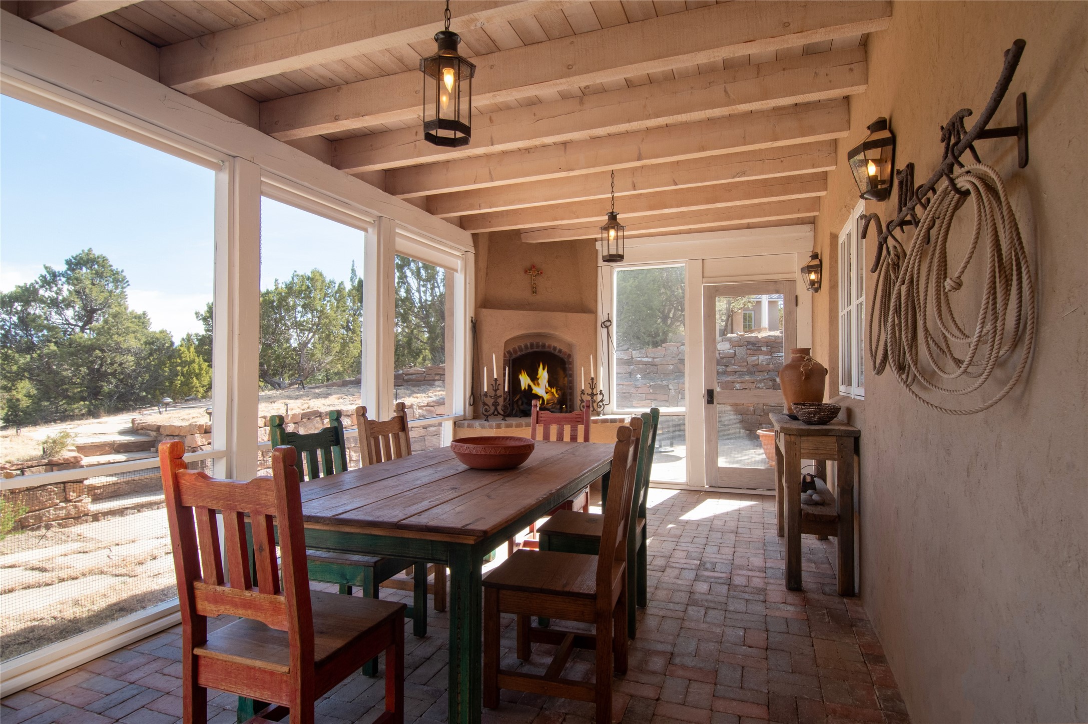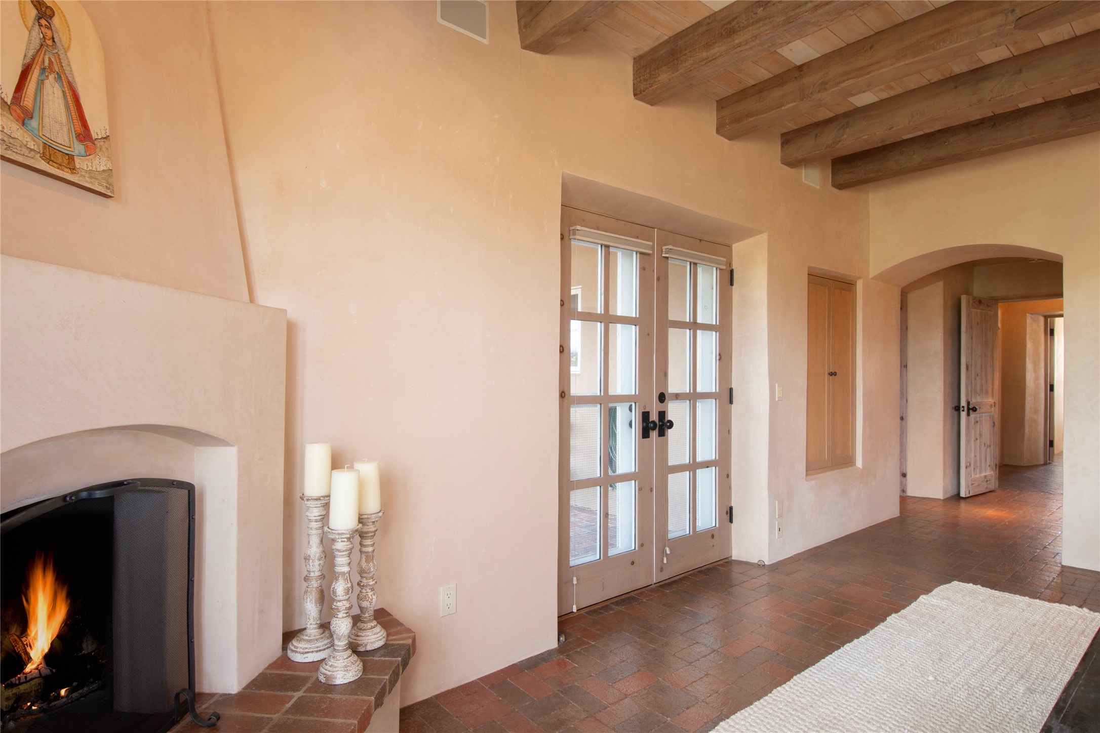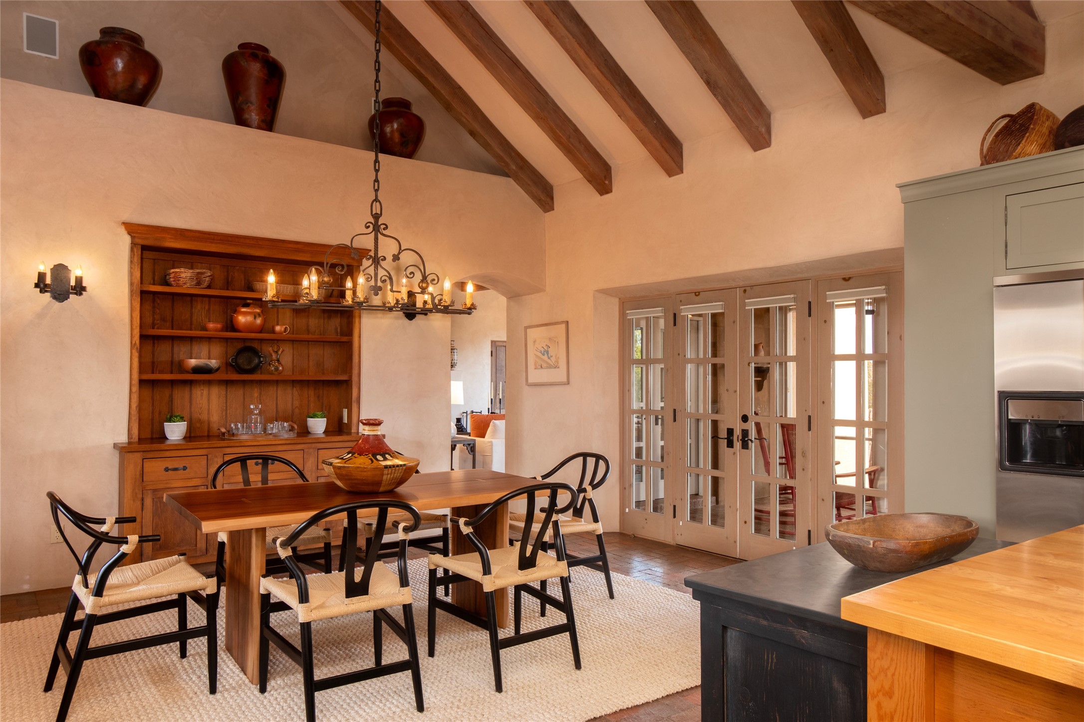 This Northern New Mexico home with detached studio & guest house sits on 13.879 acres in much-desired La Tierra Nueva. Architect, Ed Boniface and builder Tony Ivey's outstanding attention-to-detail is lovely inside and out. Single-level with some interior steps, the 3,288 sq. ft. main home features 2 bedrooms, 4 baths, and a portal running the full length of the front of the house, with expansive mountain views.Brick floors with radiant heating run throughout the home, and wooden vigas reach high into the pitched ceiling creating an inviting openness. A entry hall is open to the living room with its built-in cabinets and shelves, french doors, and a modern fireplace. Visually pleasing, this home has a subtle blending of traditional with a hint of contemporary, making it feel comfortable and original. State-of-the-art appliances and plenty of cabinet and counter space the kitchen features a built-in island with sink and can easily accommodate informal dining. The dining room and kitchen are adjacent to the living room and all have access to the dining portal. A mud room/laundry room and are to the right of the kitchen and lead to the attached 2-car garage. The other wing, to the left of the living room, houses a office, an ensuite bedroom, a powder room and the master suite with fireplace, walk-in closet and an over-sized double shower.The 1,874 sq. ft. detached guest house is as beautiful as the main house. The pitched roof is highlighted inside by wooden beams, making everything feel open and spacious. The guest house has a living room, 2 bedrooms, a full bath, and a portal for enjoying the view.A standalone 1,244 sq. ft. studio with 260 sq. ft. storage loft has huge windows, skylights and tall ceilings, and a big open space for various creative pursuits! This space could also be used for a wood shop, office, meditation room... or even a gym or weight room.This is truly a unique property offering privacy and quiet... and lots of versatility! This is a don't miss.