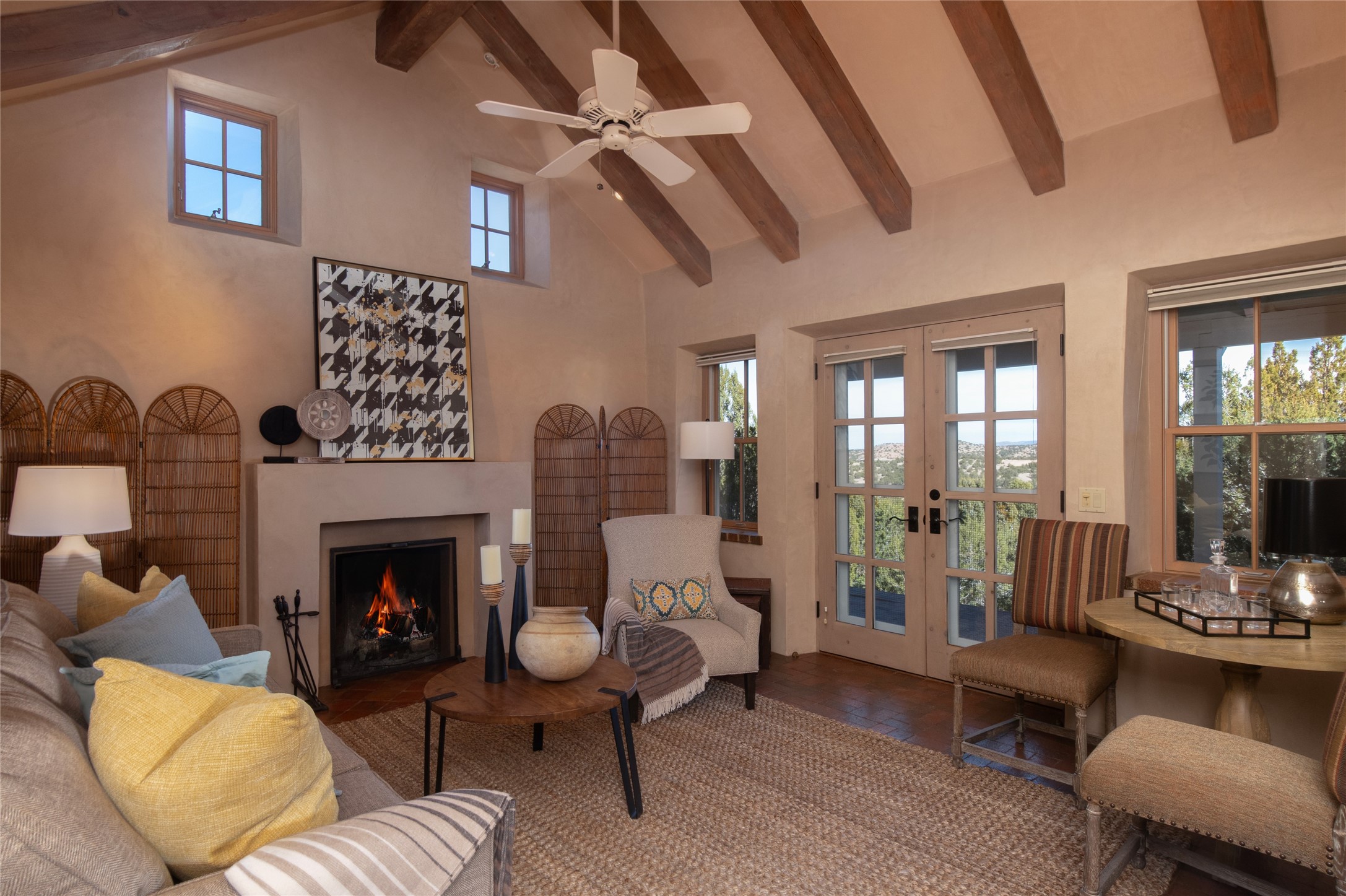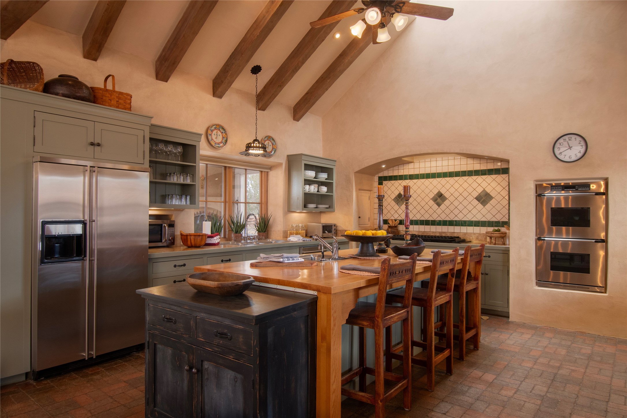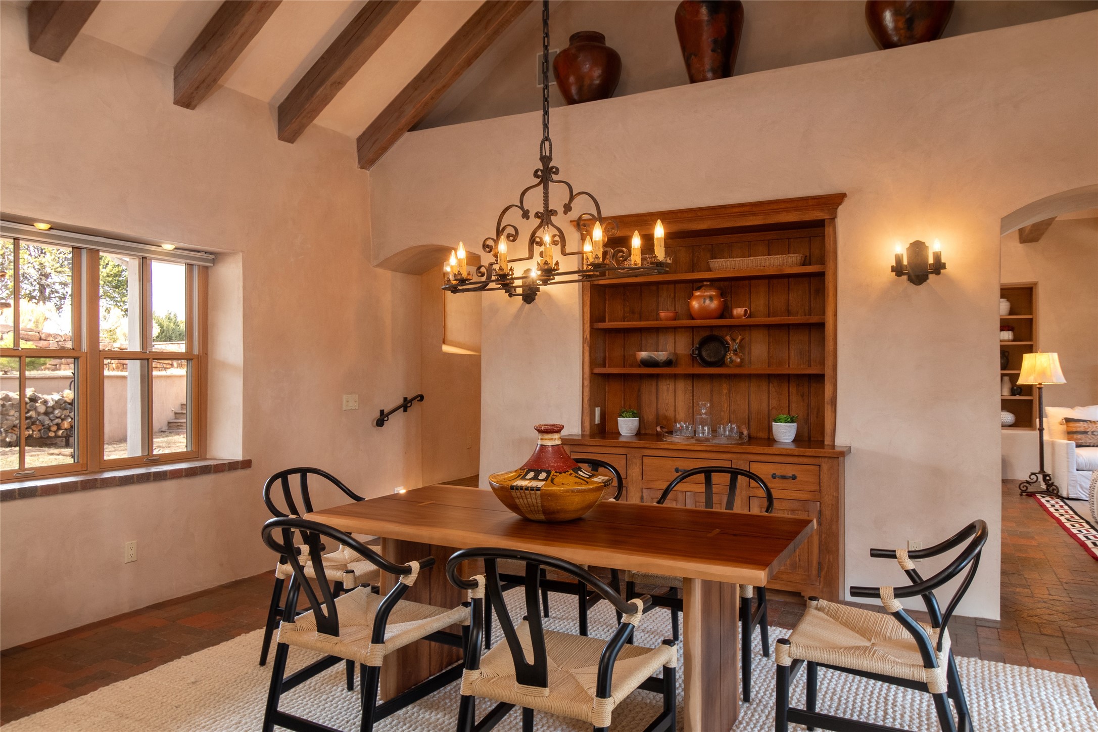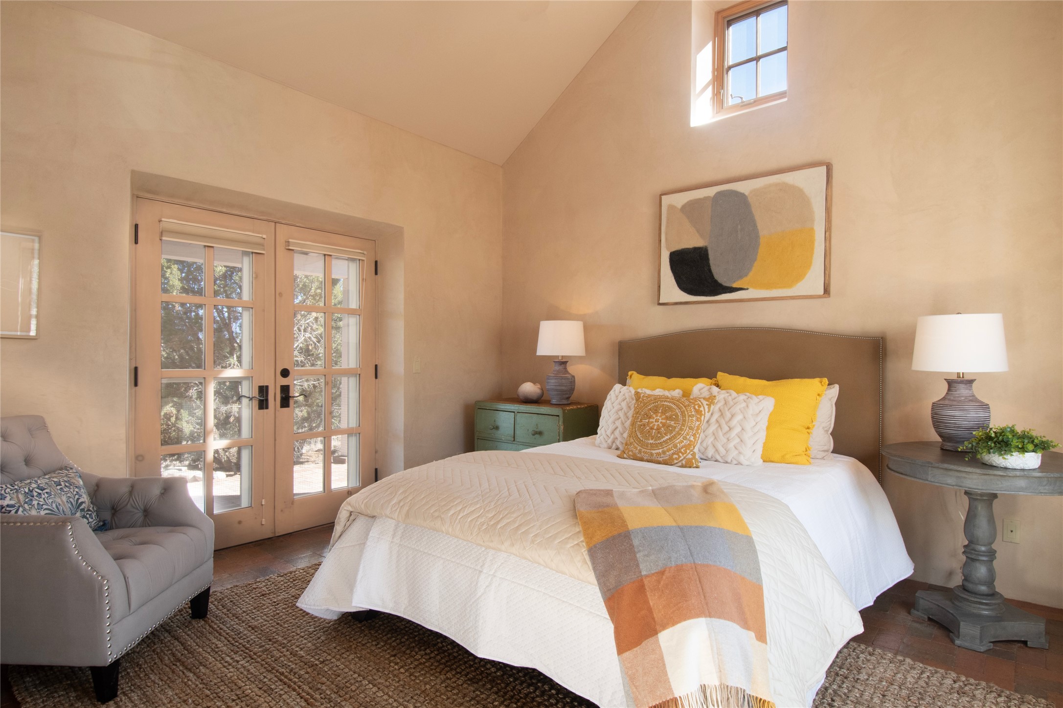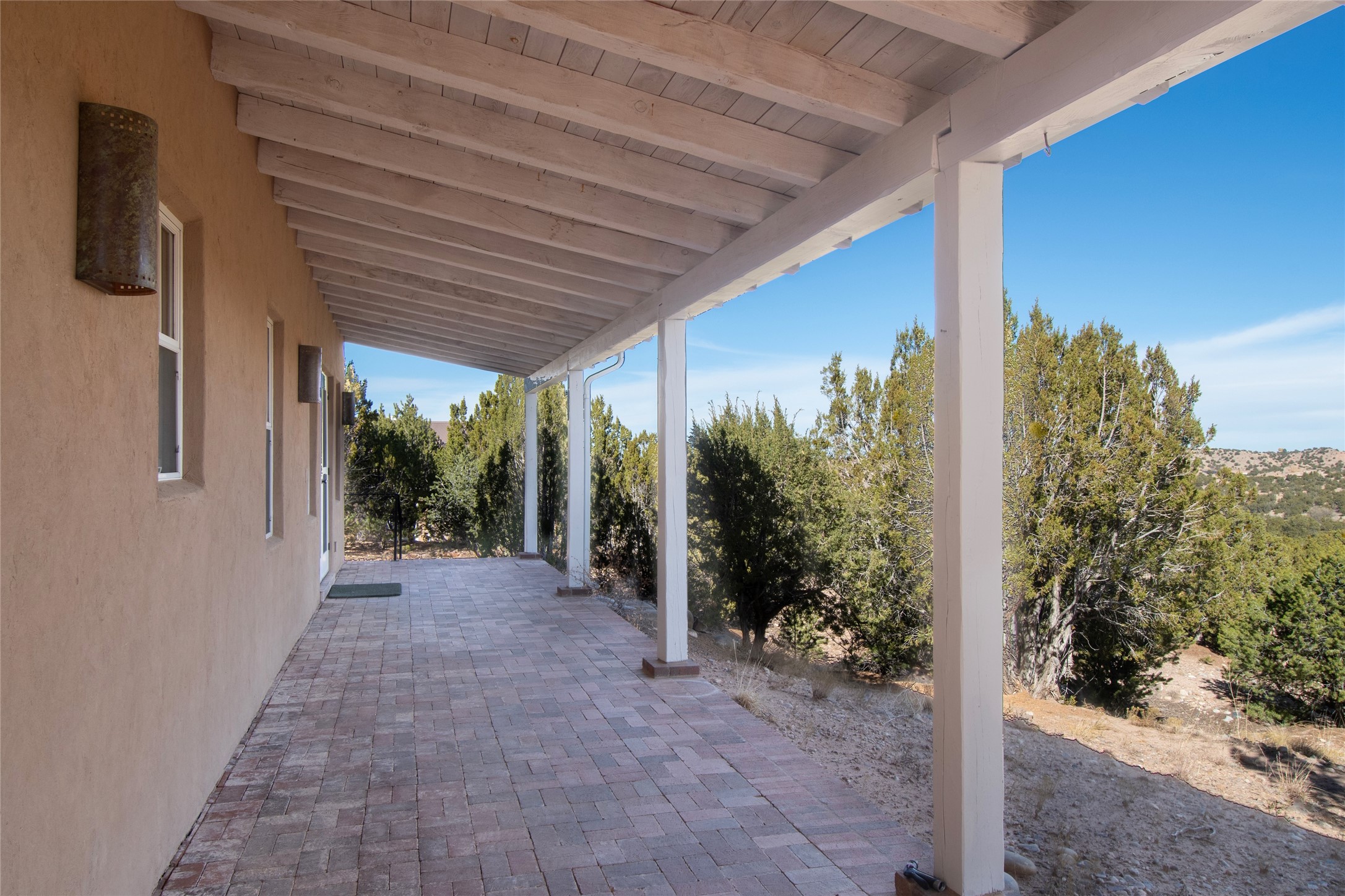 This Northern New Mexico home with detached studio & guest house sits on 13.879 acres in much-desired La Tierra Nueva. Architect, Ed Boniface and builder Tony Ivey's outstanding attention-to-detail is lovely inside and out. Single-level with some interior steps, the 3,288 sq. ft. main home features 2 bedrooms, 4 baths, and a portal running the full length of the front of the house, with expansive mountain views.Brick floors with radiant heating run throughout the home, and wooden vigas reach high into the pitched ceiling creating an inviting openness. A entry hall is open to the living room with its built-in cabinets and shelves, french doors, and a modern fireplace. Visually pleasing, this home has a subtle blending of traditional with a hint of contemporary, making it feel comfortable and original. State-of-the-art appliances and plenty of cabinet and counter space the kitchen features a built-in island with sink and can easily accommodate informal dining. The dining room and kitchen are adjacent to the living room and all have access to the dining portal. A mud room/laundry room and are to the right of the kitchen and lead to the attached 2-car garage. The other wing, to the left of the living room, houses a office, an ensuite bedroom, a powder room and the master suite with fireplace, walk-in closet and an over-sized double shower.The 1,874 sq. ft. detached guest house is as beautiful as the main house. The pitched roof is highlighted inside by wooden beams, making everything feel open and spacious. The guest house has a living room, 2 bedrooms, a full bath, and a portal for enjoying the view.A standalone 1,244 sq. ft. studio with 260 sq. ft. storage loft has huge windows, skylights and tall ceilings, and a big open space for various creative pursuits! This space could also be used for a wood shop, office, meditation room... or even a gym or weight room.This is truly a unique property offering privacy and quiet... and lots of versatility! This is a don't miss.