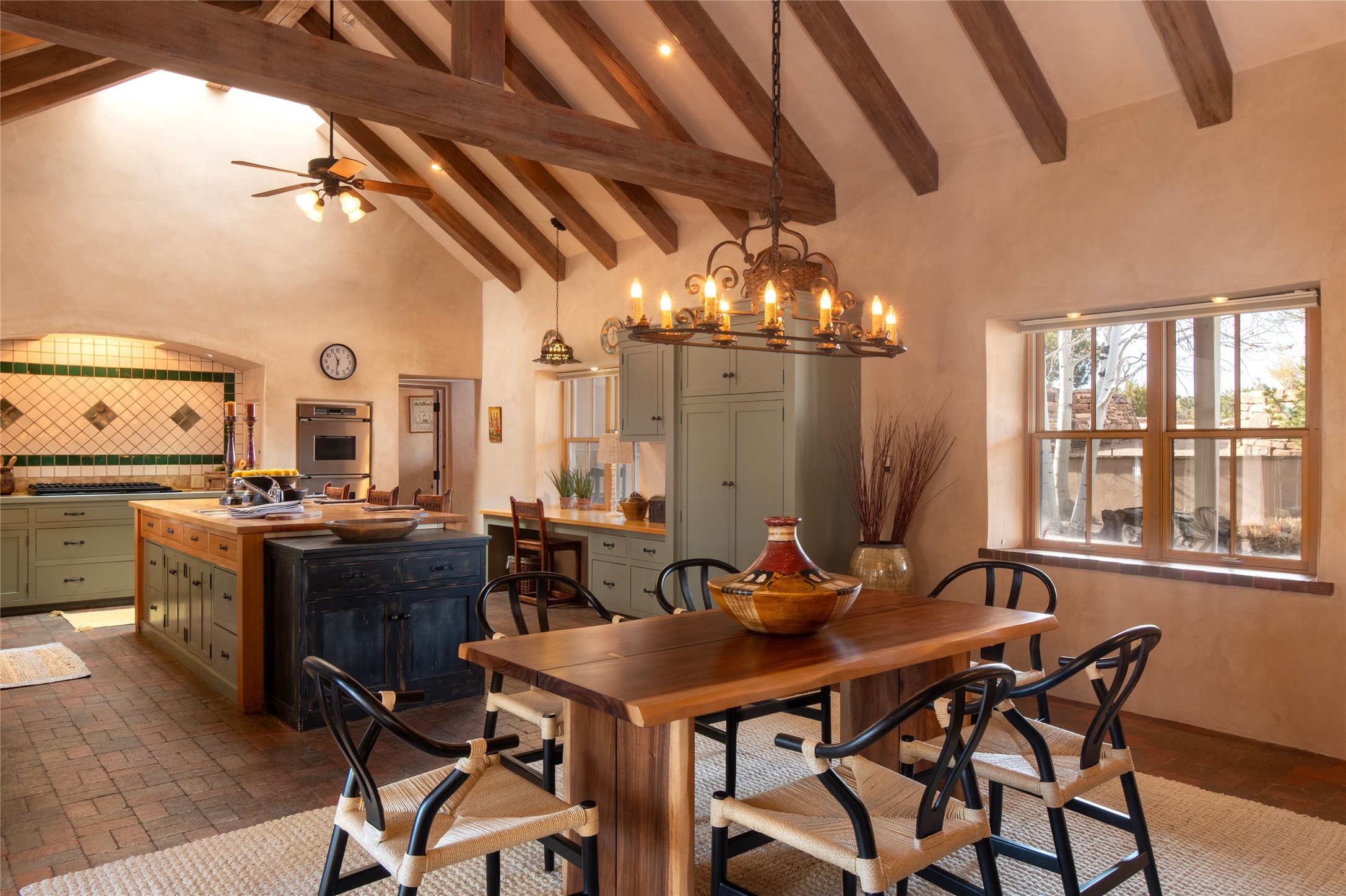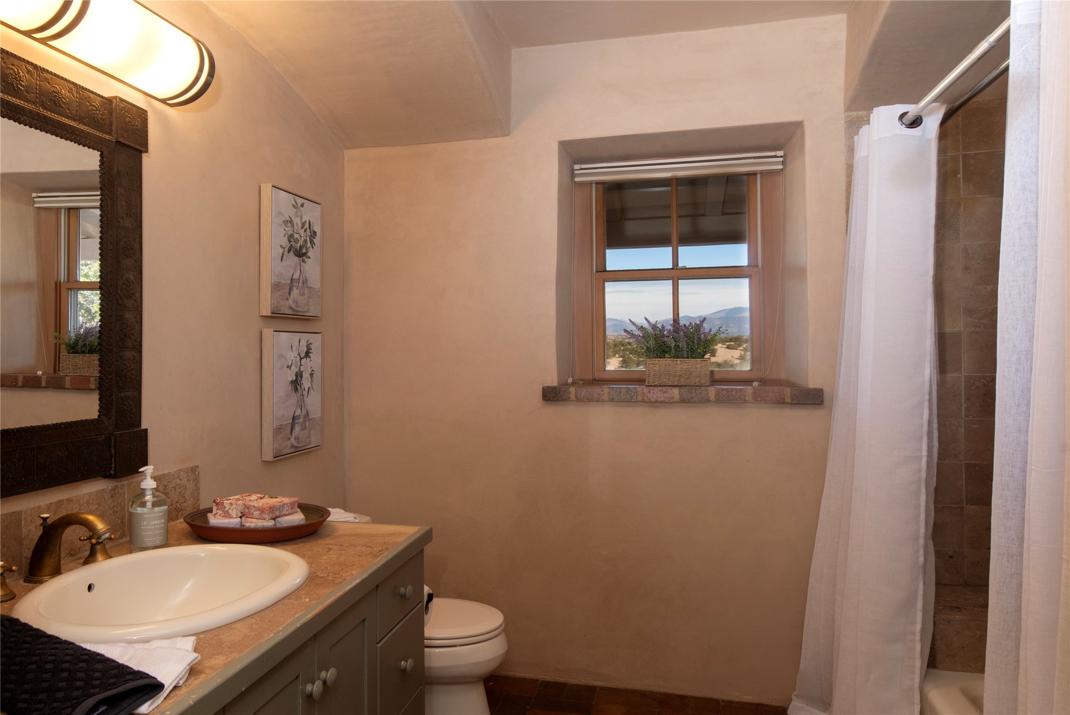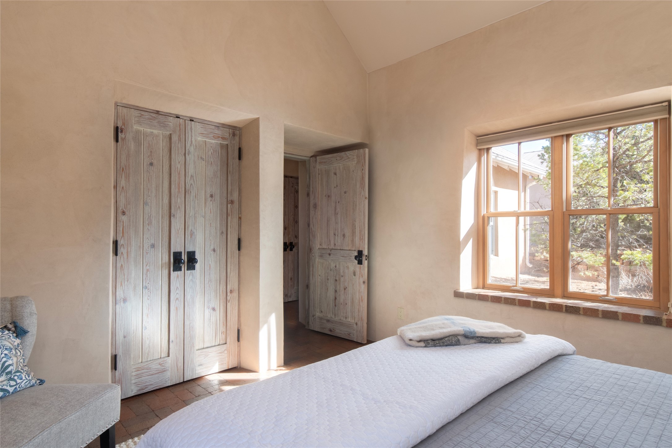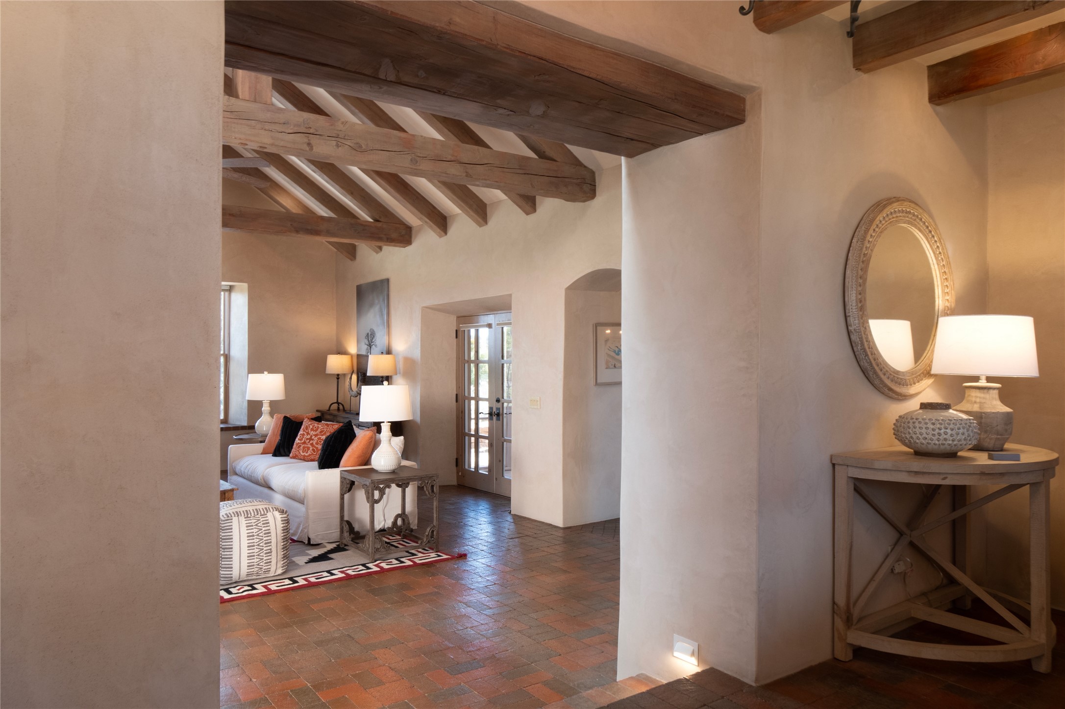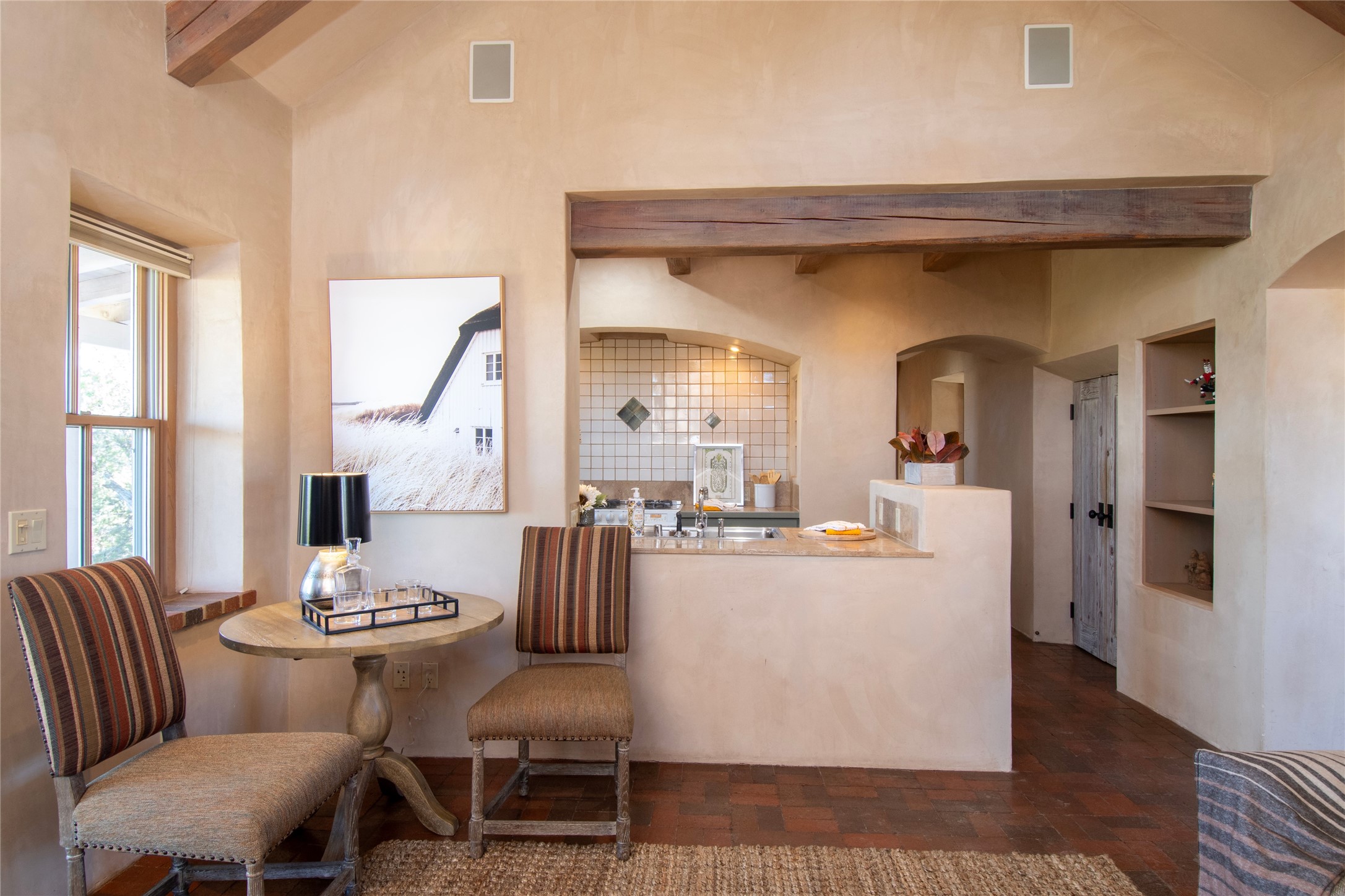 This Northern New Mexico home with detached studio & guest house sits on 13.879 acres in much-desired La Tierra Nueva. Architect, Ed Boniface and builder Tony Ivey's outstanding attention-to-detail is lovely inside and out. Single-level with some interior steps, the 3,288 sq. ft. main home features 2 bedrooms, 4 baths, and a portal running the full length of the front of the house, with expansive mountain views.Brick floors with radiant heating run throughout the home, and wooden vigas reach high into the pitched ceiling creating an inviting openness. A entry hall is open to the living room with its built-in cabinets and shelves, french doors, and a modern fireplace. Visually pleasing, this home has a subtle blending of traditional with a hint of contemporary, making it feel comfortable and original. State-of-the-art appliances and plenty of cabinet and counter space the kitchen features a built-in island with sink and can easily accommodate informal dining. The dining room and kitchen are adjacent to the living room and all have access to the dining portal. A mud room/laundry room and are to the right of the kitchen and lead to the attached 2-car garage. The other wing, to the left of the living room, houses a office, an ensuite bedroom, a powder room and the master suite with fireplace, walk-in closet and an over-sized double shower.The 1,874 sq. ft. detached guest house is as beautiful as the main house. The pitched roof is highlighted inside by wooden beams, making everything feel open and spacious. The guest house has a living room, 2 bedrooms, a full bath, and a portal for enjoying the view.A standalone 1,244 sq. ft. studio with 260 sq. ft. storage loft has huge windows, skylights and tall ceilings, and a big open space for various creative pursuits! This space could also be used for a wood shop, office, meditation room... or even a gym or weight room.This is truly a unique property offering privacy and quiet... and lots of versatility! This is a don't miss.