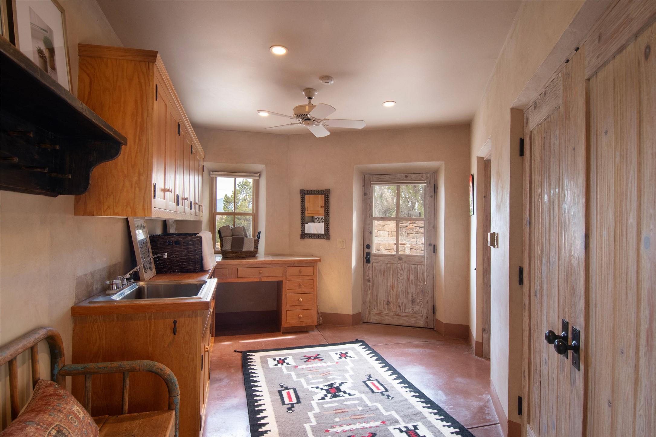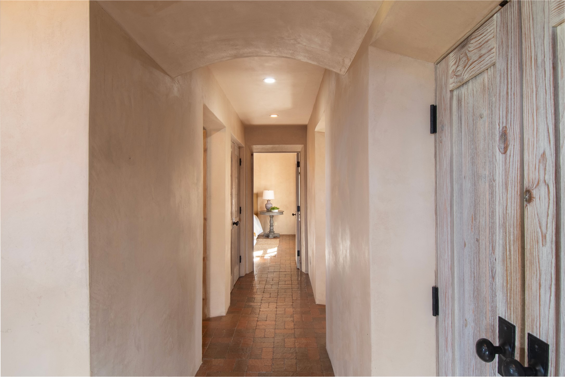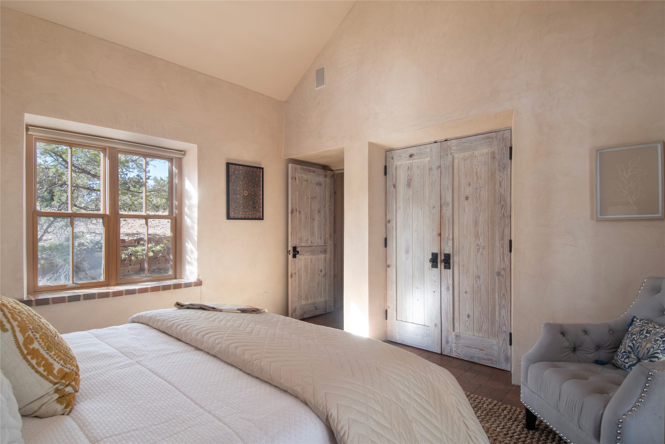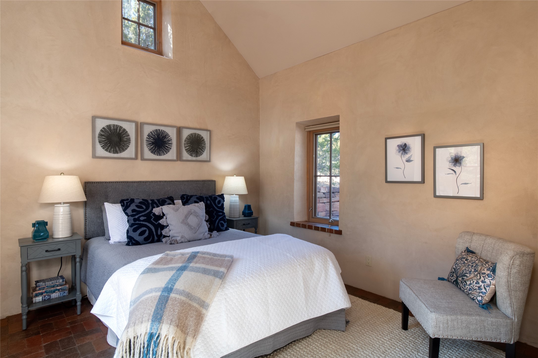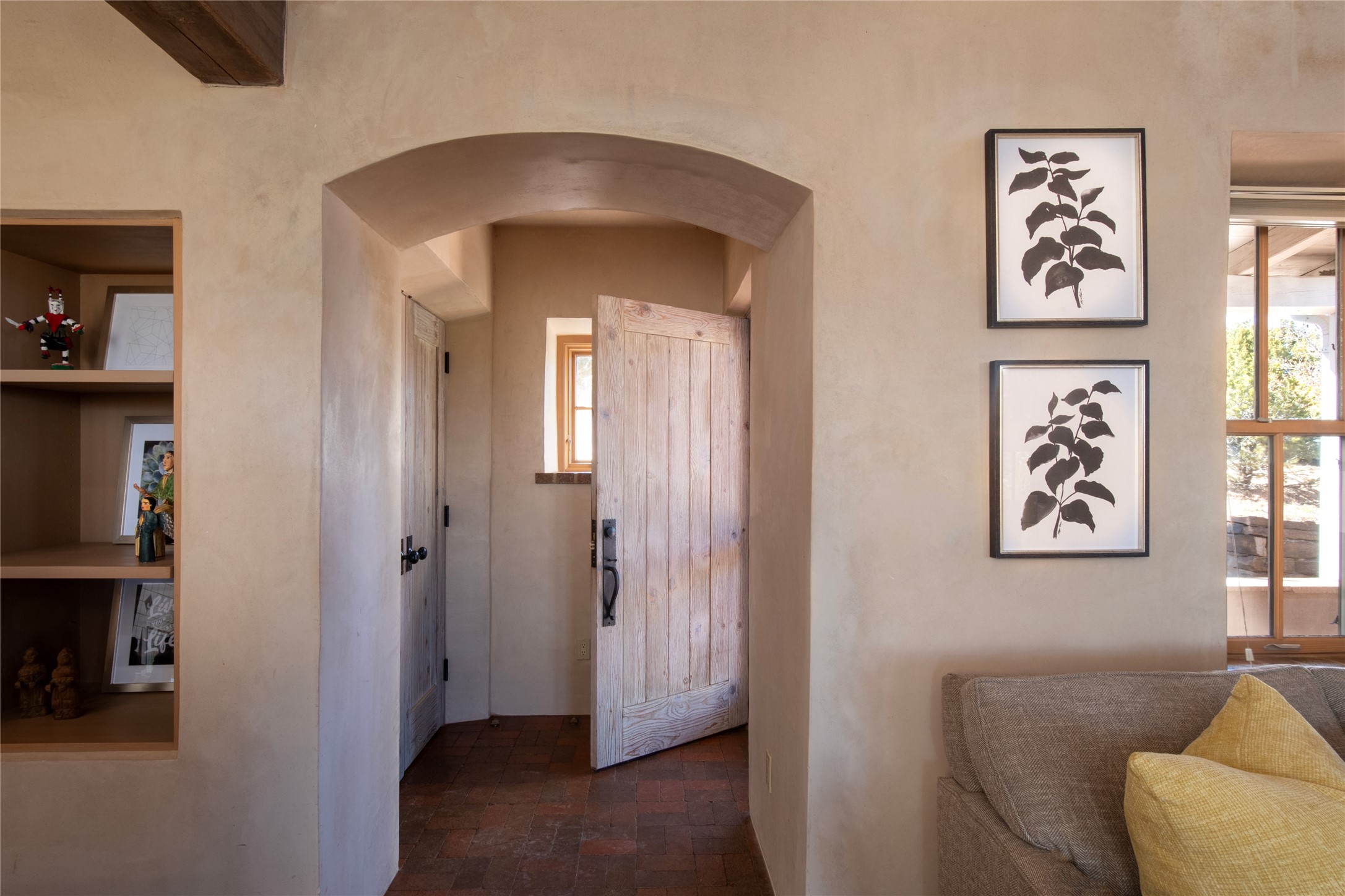 This Northern New Mexico home with detached studio & guest house sits on 13.879 acres in much-desired La Tierra Nueva. Architect, Ed Boniface and builder Tony Ivey's outstanding attention-to-detail is lovely inside and out. Single-level with some interior steps, the 3,288 sq. ft. main home features 2 bedrooms, 4 baths, and a portal running the full length of the front of the house, with expansive mountain views.Brick floors with radiant heating run throughout the home, and wooden vigas reach high into the pitched ceiling creating an inviting openness. A entry hall is open to the living room with its built-in cabinets and shelves, french doors, and a modern fireplace. Visually pleasing, this home has a subtle blending of traditional with a hint of contemporary, making it feel comfortable and original. State-of-the-art appliances and plenty of cabinet and counter space the kitchen features a built-in island with sink and can easily accommodate informal dining. The dining room and kitchen are adjacent to the living room and all have access to the dining portal. A mud room/laundry room and are to the right of the kitchen and lead to the attached 2-car garage. The other wing, to the left of the living room, houses a office, an ensuite bedroom, a powder room and the master suite with fireplace, walk-in closet and an over-sized double shower.The 1,874 sq. ft. detached guest house is as beautiful as the main house. The pitched roof is highlighted inside by wooden beams, making everything feel open and spacious. The guest house has a living room, 2 bedrooms, a full bath, and a portal for enjoying the view.A standalone 1,244 sq. ft. studio with 260 sq. ft. storage loft has huge windows, skylights and tall ceilings, and a big open space for various creative pursuits! This space could also be used for a wood shop, office, meditation room... or even a gym or weight room.This is truly a unique property offering privacy and quiet... and lots of versatility! This is a don't miss.