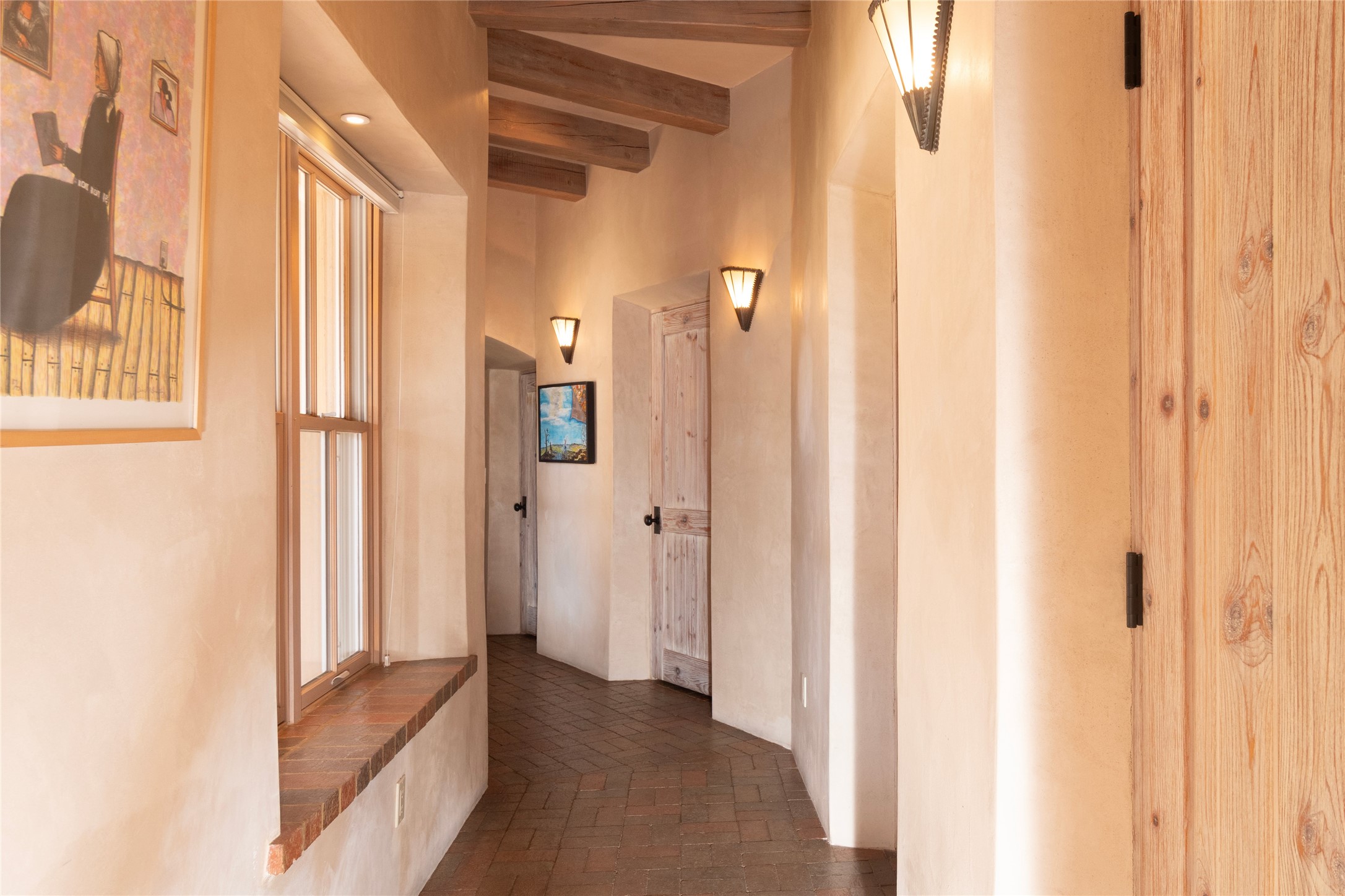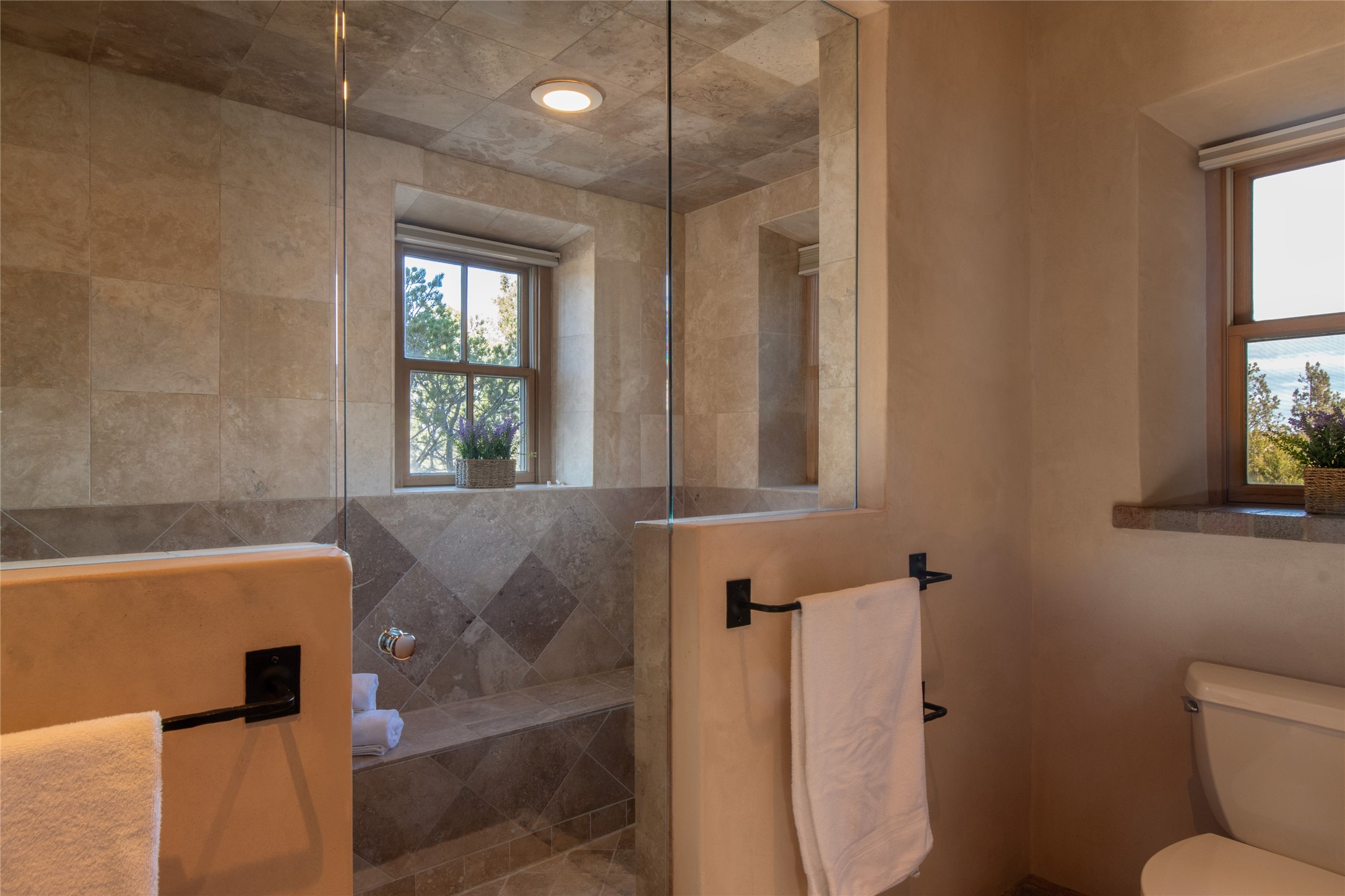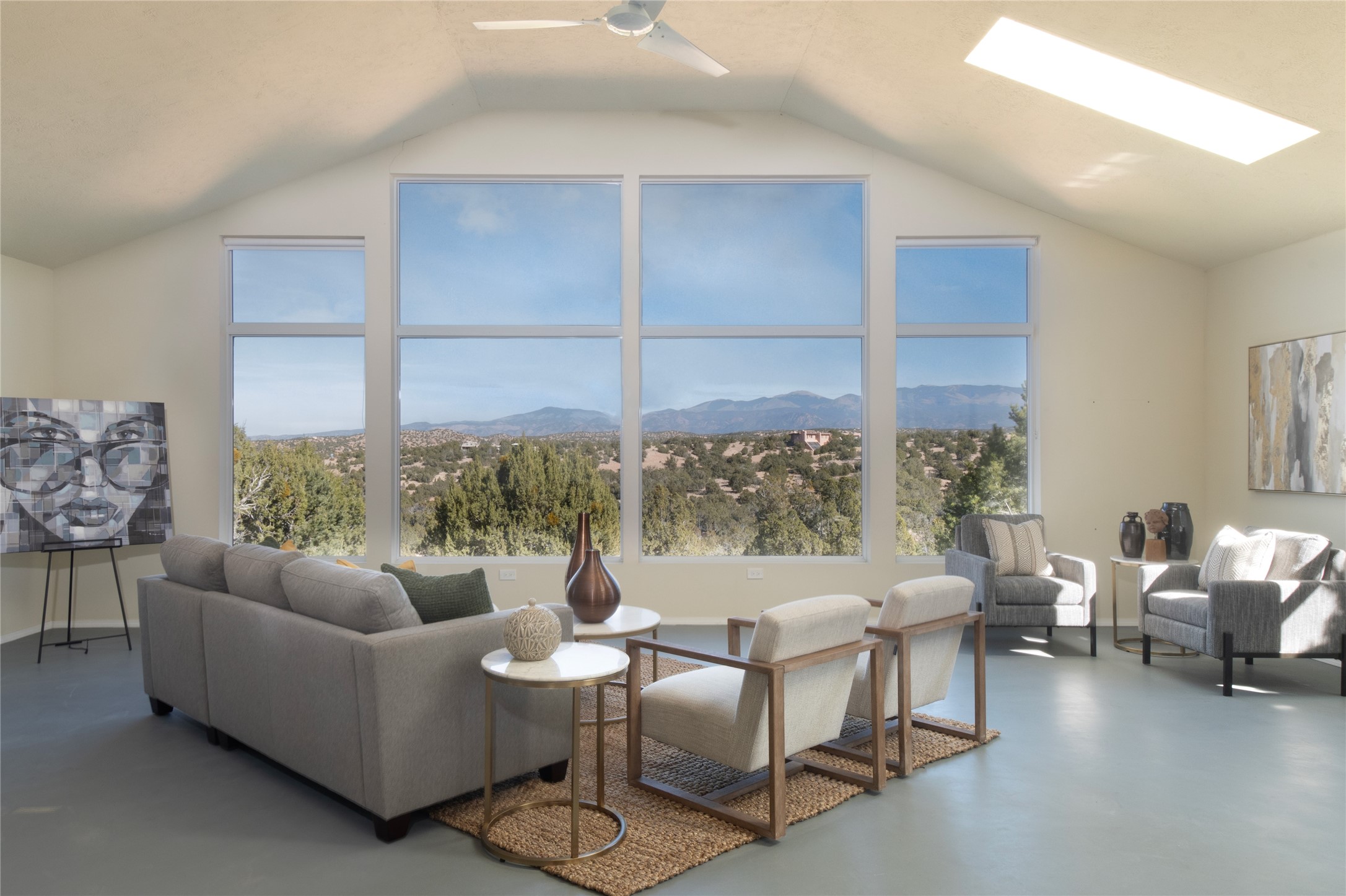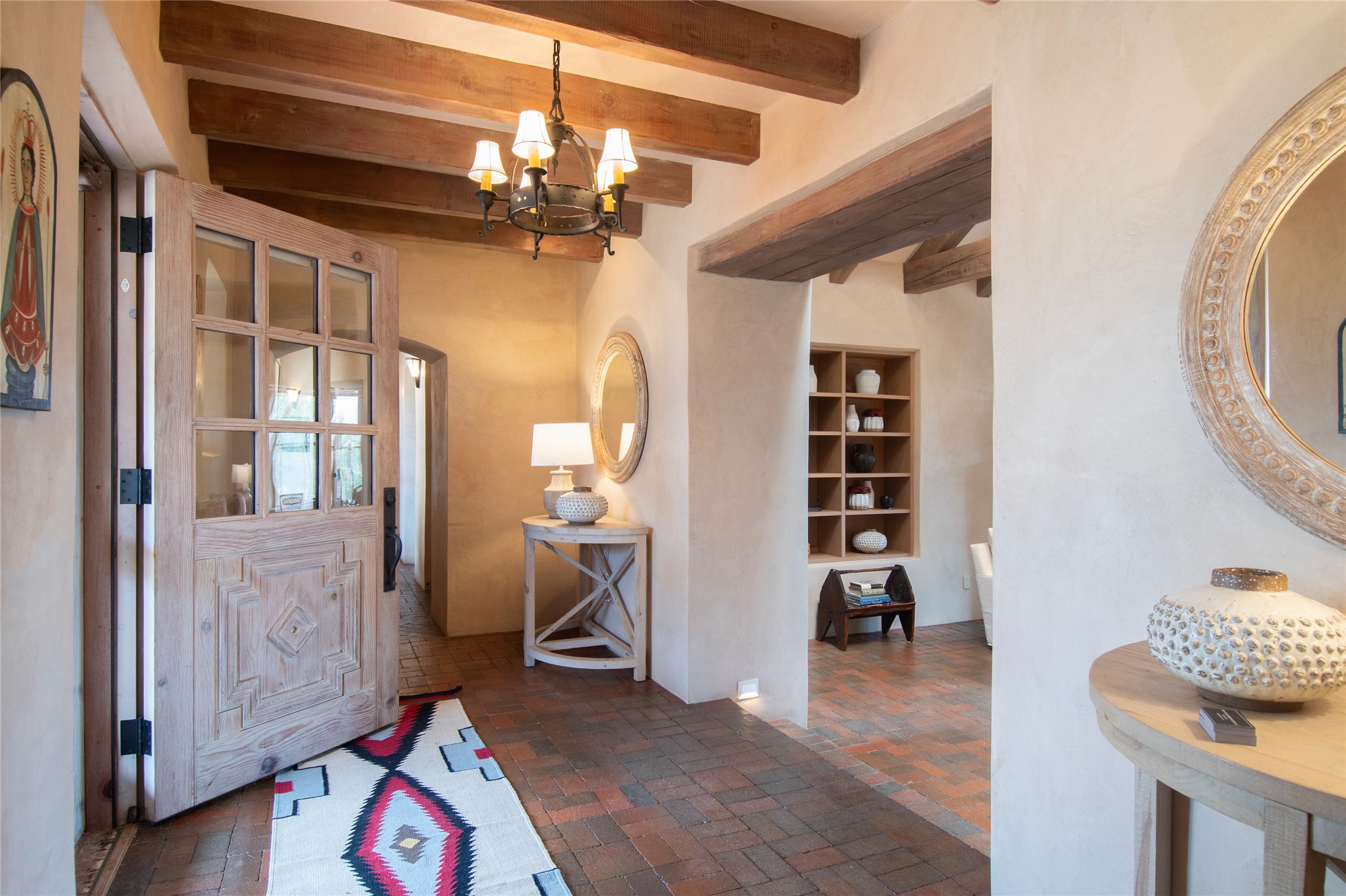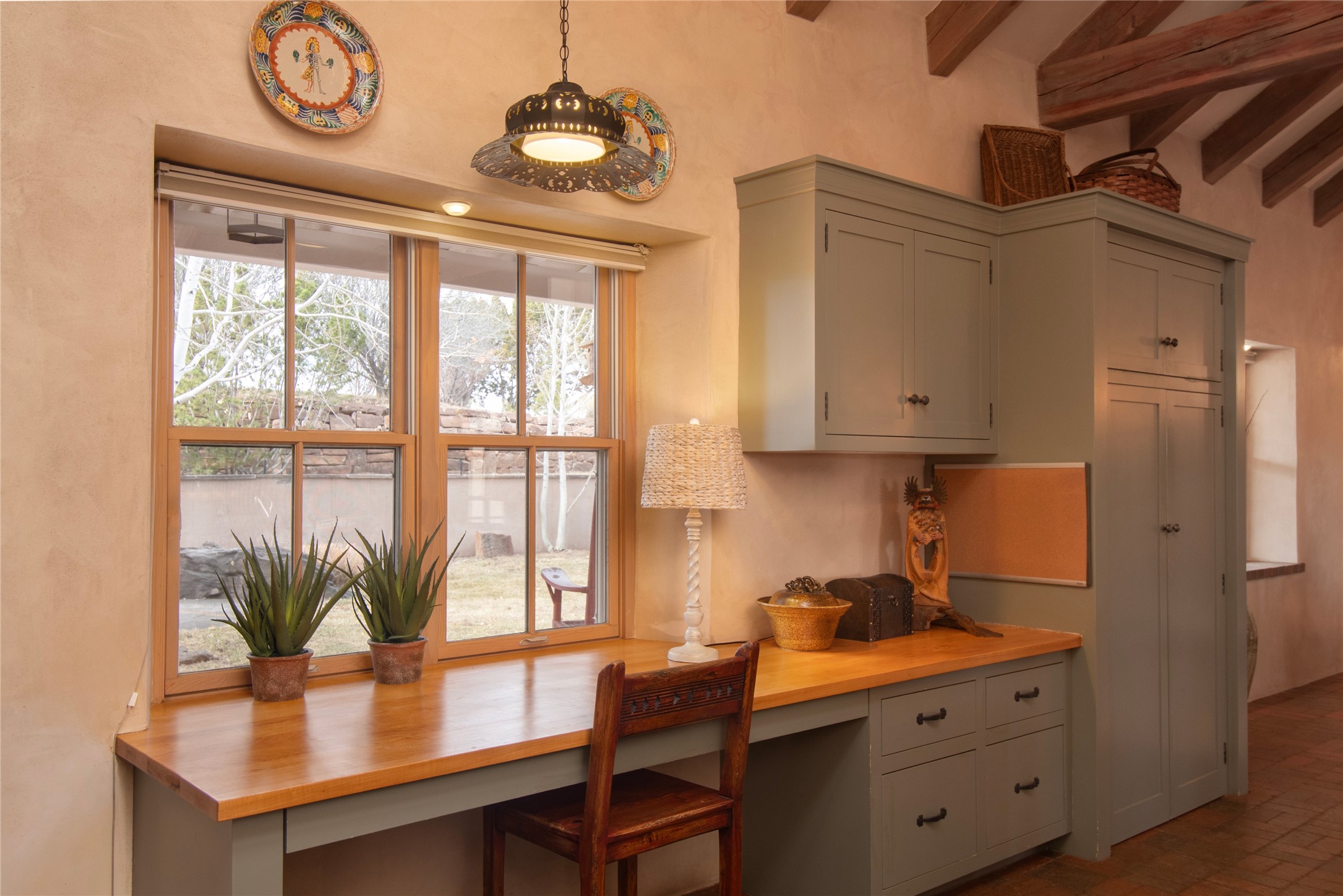 This Northern New Mexico home with detached studio & guest house sits on 13.879 acres in much-desired La Tierra Nueva. Architect, Ed Boniface and builder Tony Ivey's outstanding attention-to-detail is lovely inside and out. Single-level with some interior steps, the 3,288 sq. ft. main home features 2 bedrooms, 4 baths, and a portal running the full length of the front of the house, with expansive mountain views.Brick floors with radiant heating run throughout the home, and wooden vigas reach high into the pitched ceiling creating an inviting openness. A entry hall is open to the living room with its built-in cabinets and shelves, french doors, and a modern fireplace. Visually pleasing, this home has a subtle blending of traditional with a hint of contemporary, making it feel comfortable and original. State-of-the-art appliances and plenty of cabinet and counter space the kitchen features a built-in island with sink and can easily accommodate informal dining. The dining room and kitchen are adjacent to the living room and all have access to the dining portal. A mud room/laundry room and are to the right of the kitchen and lead to the attached 2-car garage. The other wing, to the left of the living room, houses a office, an ensuite bedroom, a powder room and the master suite with fireplace, walk-in closet and an over-sized double shower.The 1,874 sq. ft. detached guest house is as beautiful as the main house. The pitched roof is highlighted inside by wooden beams, making everything feel open and spacious. The guest house has a living room, 2 bedrooms, a full bath, and a portal for enjoying the view.A standalone 1,244 sq. ft. studio with 260 sq. ft. storage loft has huge windows, skylights and tall ceilings, and a big open space for various creative pursuits! This space could also be used for a wood shop, office, meditation room... or even a gym or weight room.This is truly a unique property offering privacy and quiet... and lots of versatility! This is a don't miss.
