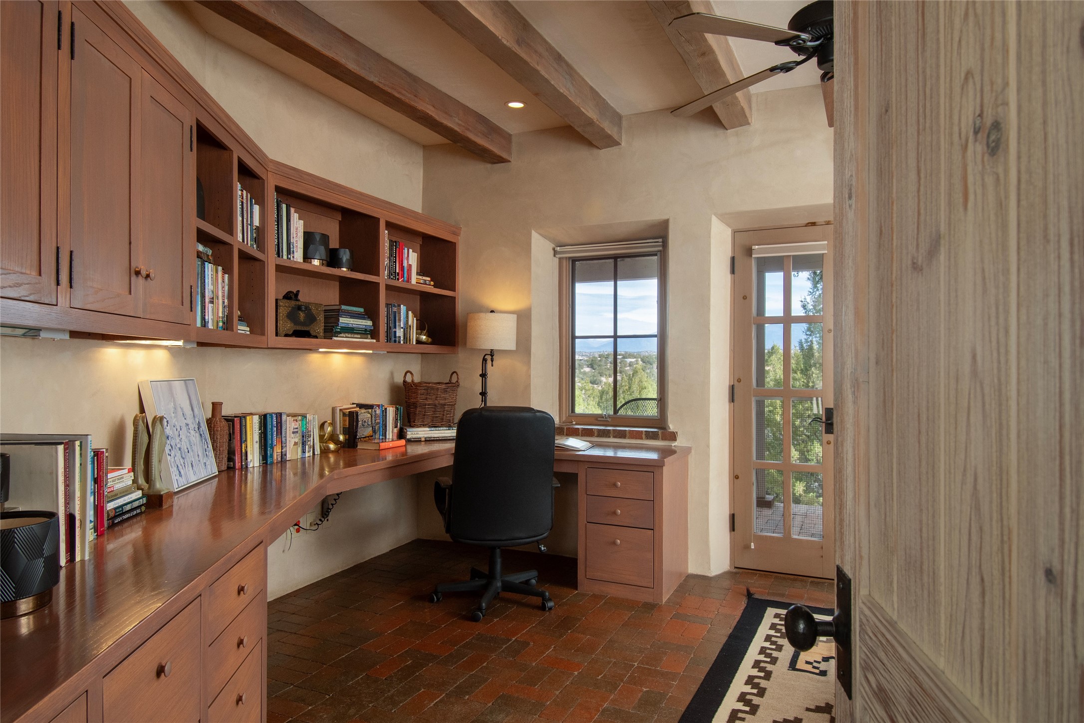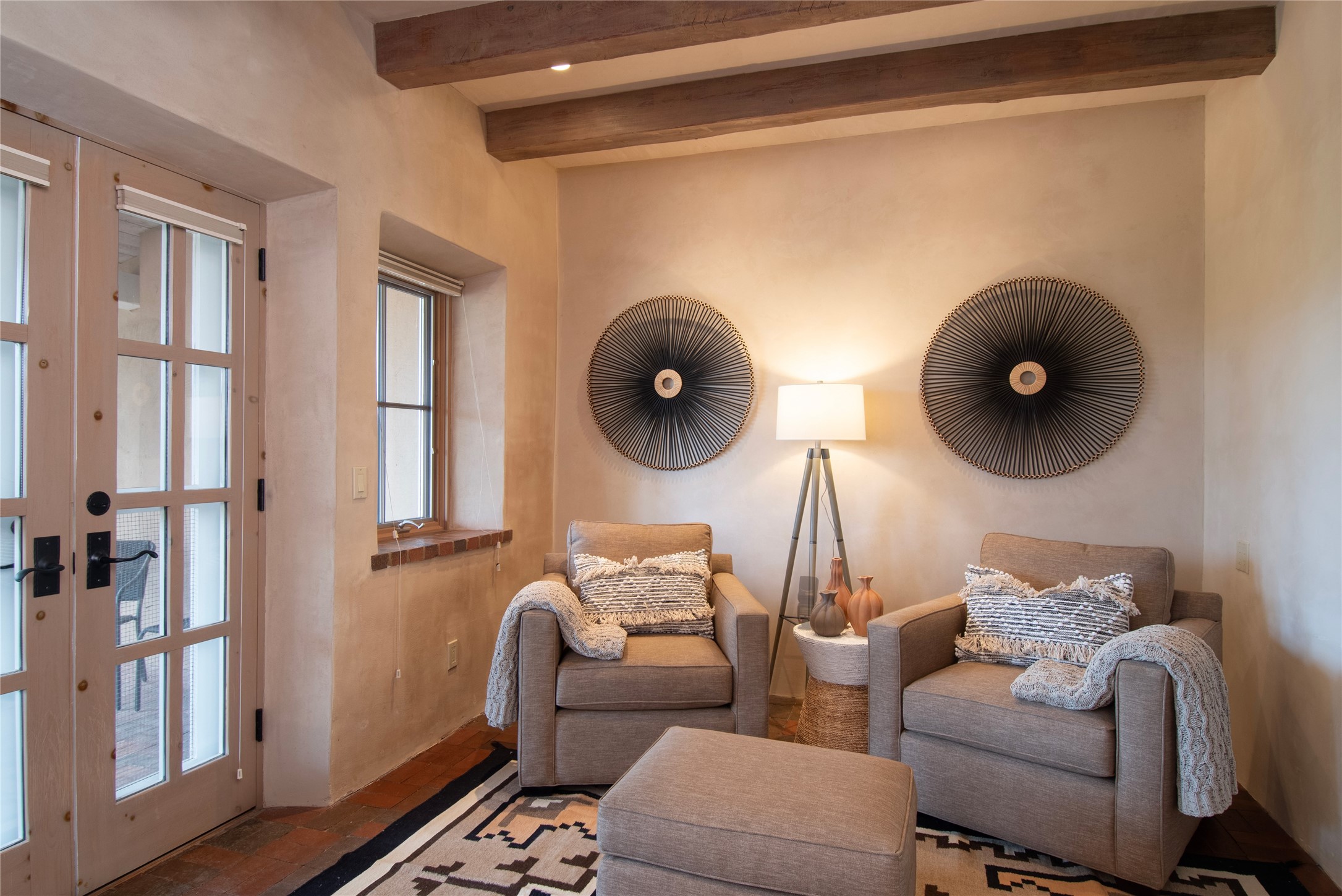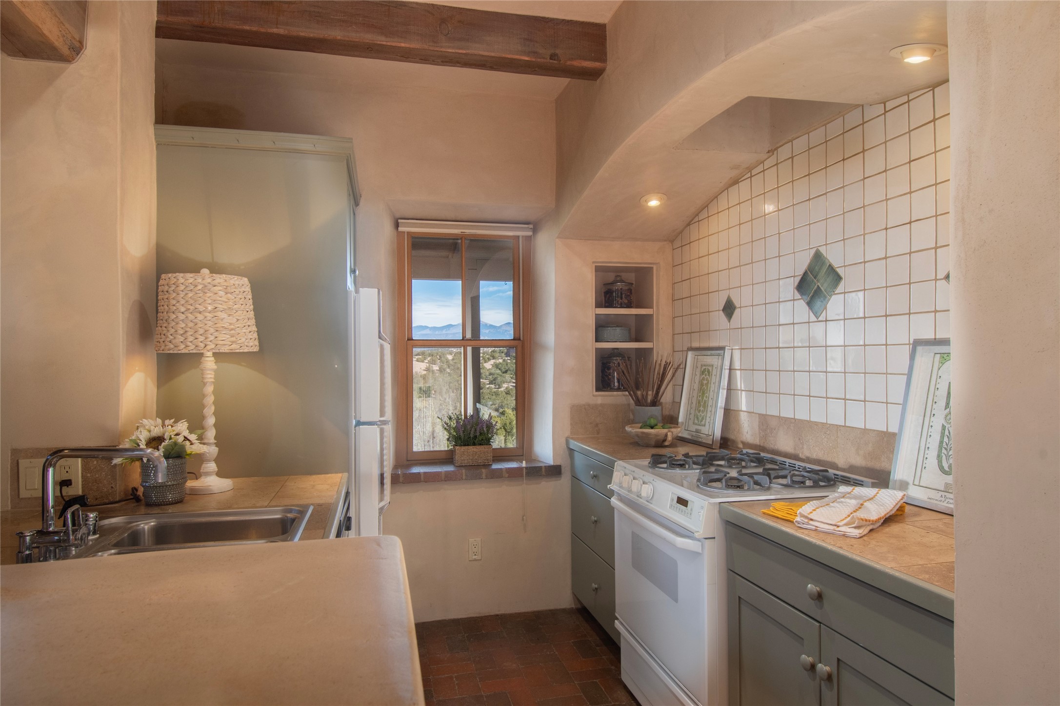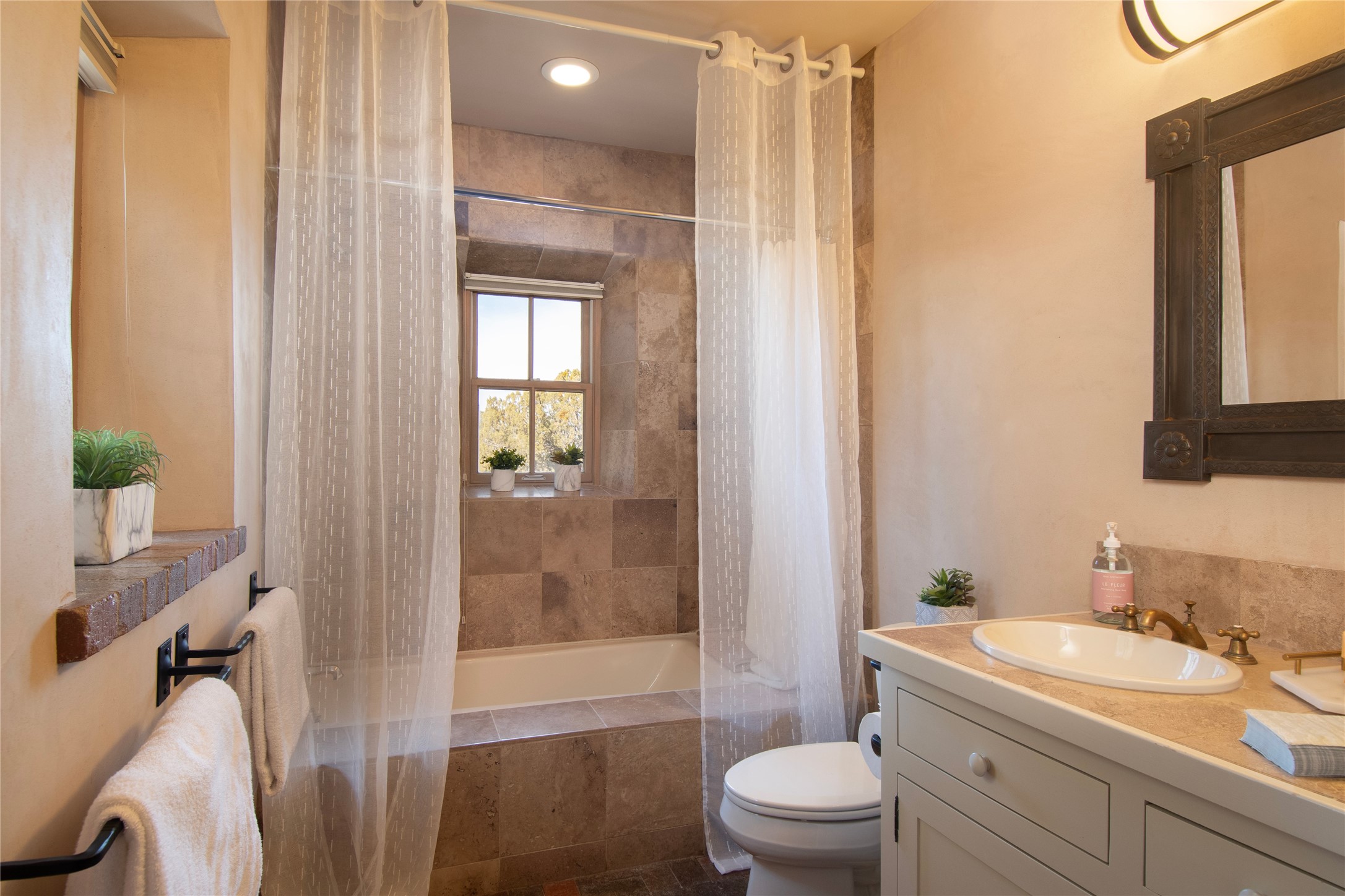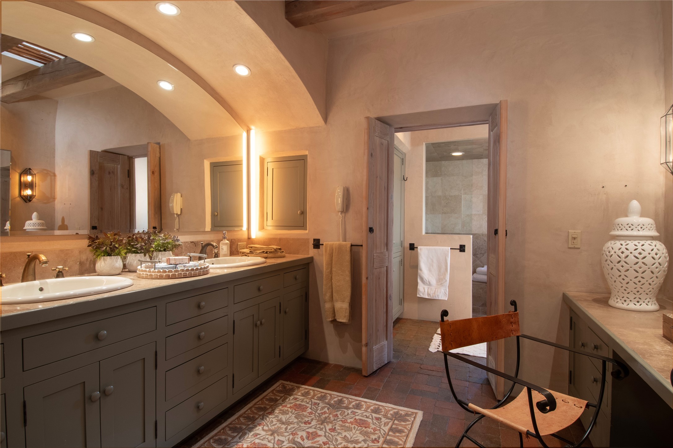 This Northern New Mexico home with detached studio & guest house sits on 13.879 acres in much-desired La Tierra Nueva. Architect, Ed Boniface and builder Tony Ivey's outstanding attention-to-detail is lovely inside and out. Single-level with some interior steps, the 3,288 sq. ft. main home features 2 bedrooms, 4 baths, and a portal running the full length of the front of the house, with expansive mountain views.Brick floors with radiant heating run throughout the home, and wooden vigas reach high into the pitched ceiling creating an inviting openness. A entry hall is open to the living room with its built-in cabinets and shelves, french doors, and a modern fireplace. Visually pleasing, this home has a subtle blending of traditional with a hint of contemporary, making it feel comfortable and original. State-of-the-art appliances and plenty of cabinet and counter space the kitchen features a built-in island with sink and can easily accommodate informal dining. The dining room and kitchen are adjacent to the living room and all have access to the dining portal. A mud room/laundry room and are to the right of the kitchen and lead to the attached 2-car garage. The other wing, to the left of the living room, houses a office, an ensuite bedroom, a powder room and the master suite with fireplace, walk-in closet and an over-sized double shower.The 1,874 sq. ft. detached guest house is as beautiful as the main house. The pitched roof is highlighted inside by wooden beams, making everything feel open and spacious. The guest house has a living room, 2 bedrooms, a full bath, and a portal for enjoying the view.A standalone 1,244 sq. ft. studio with 260 sq. ft. storage loft has huge windows, skylights and tall ceilings, and a big open space for various creative pursuits! This space could also be used for a wood shop, office, meditation room... or even a gym or weight room.This is truly a unique property offering privacy and quiet... and lots of versatility! This is a don't miss.