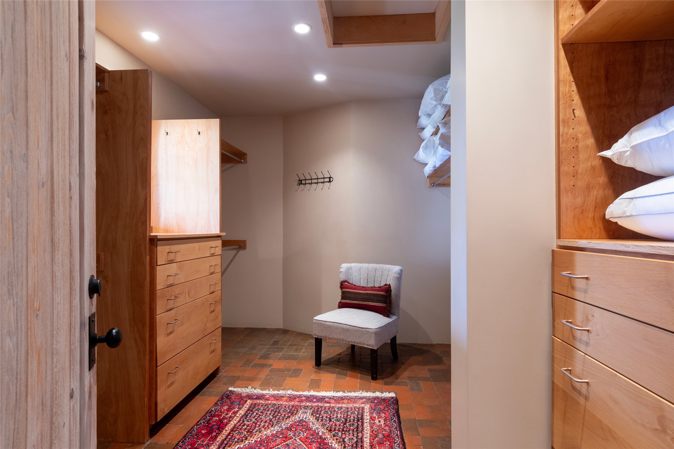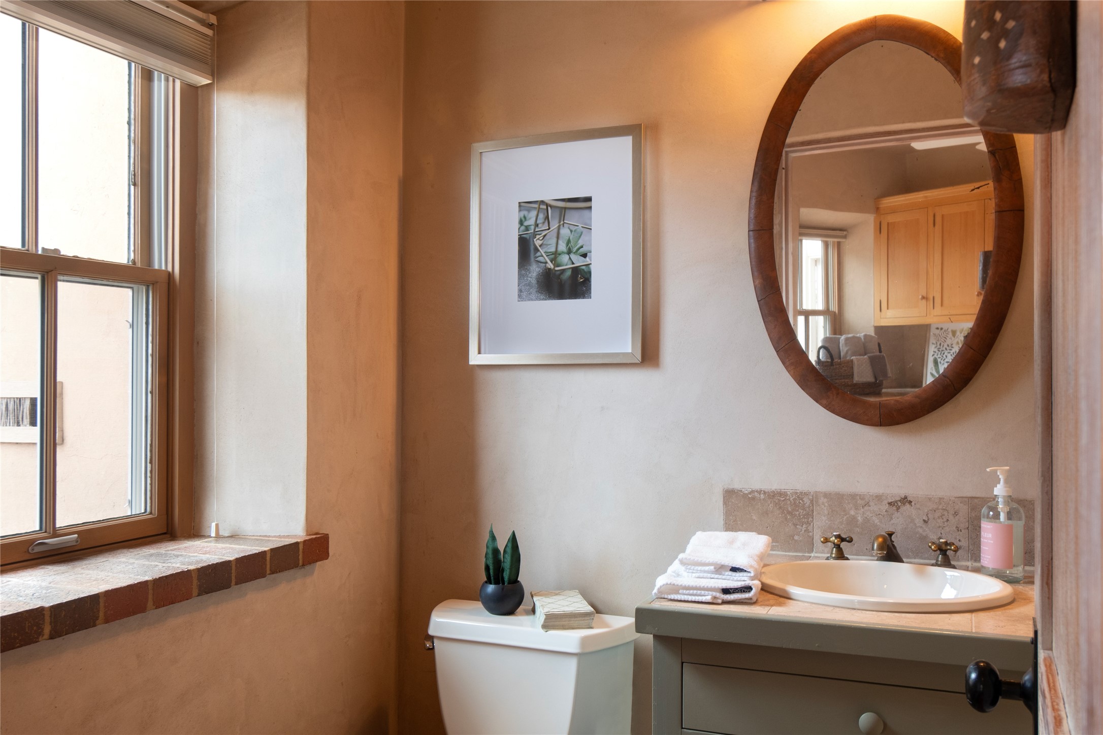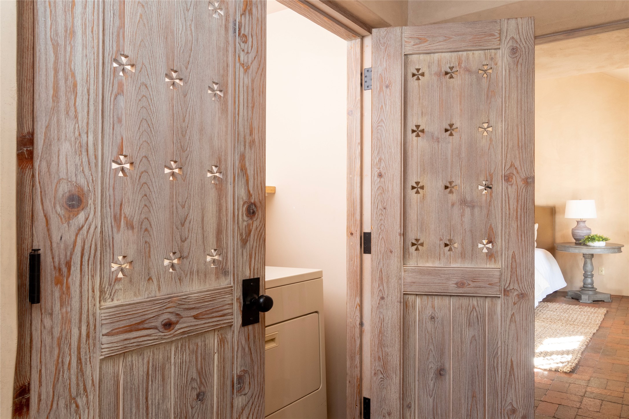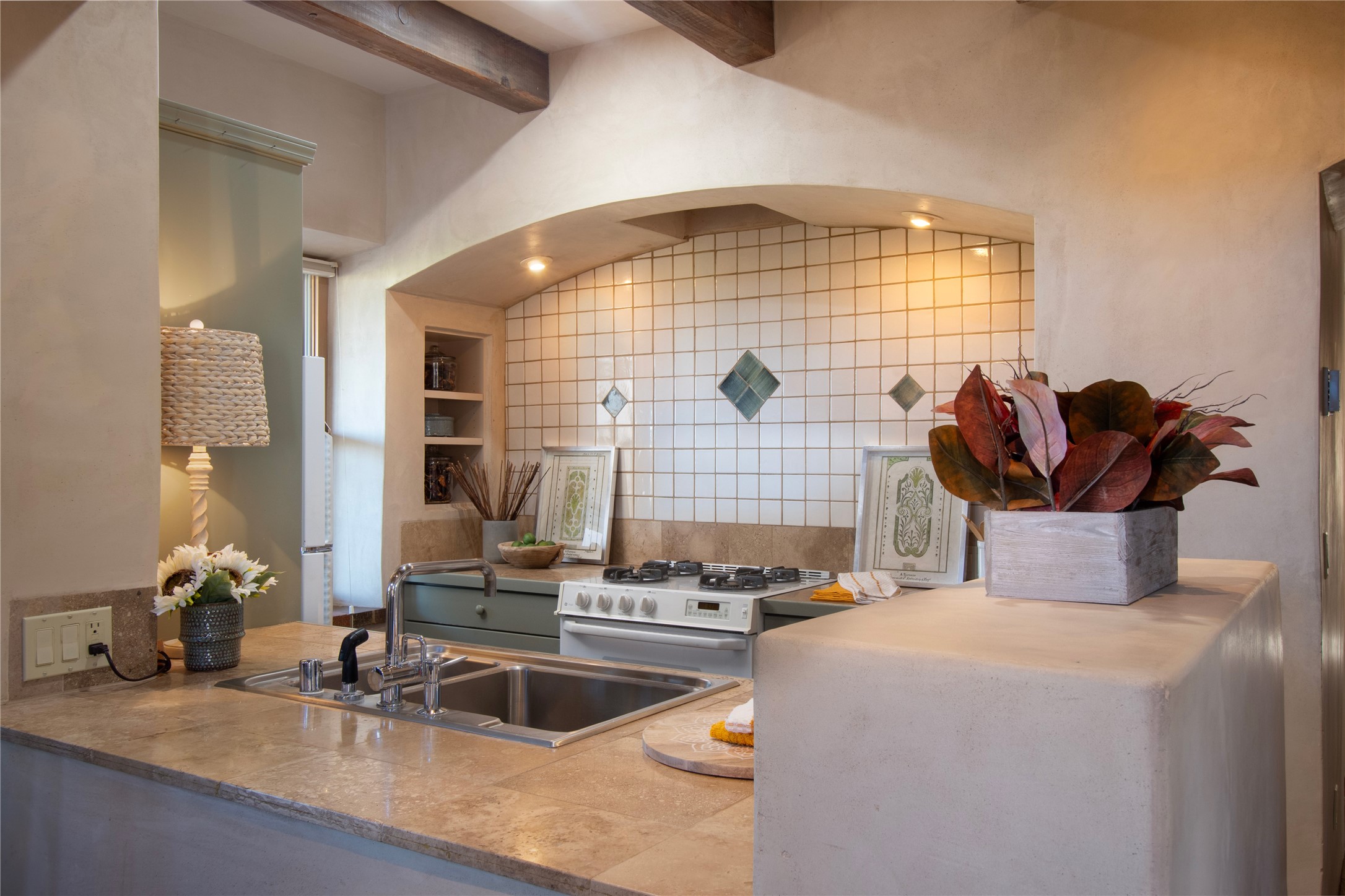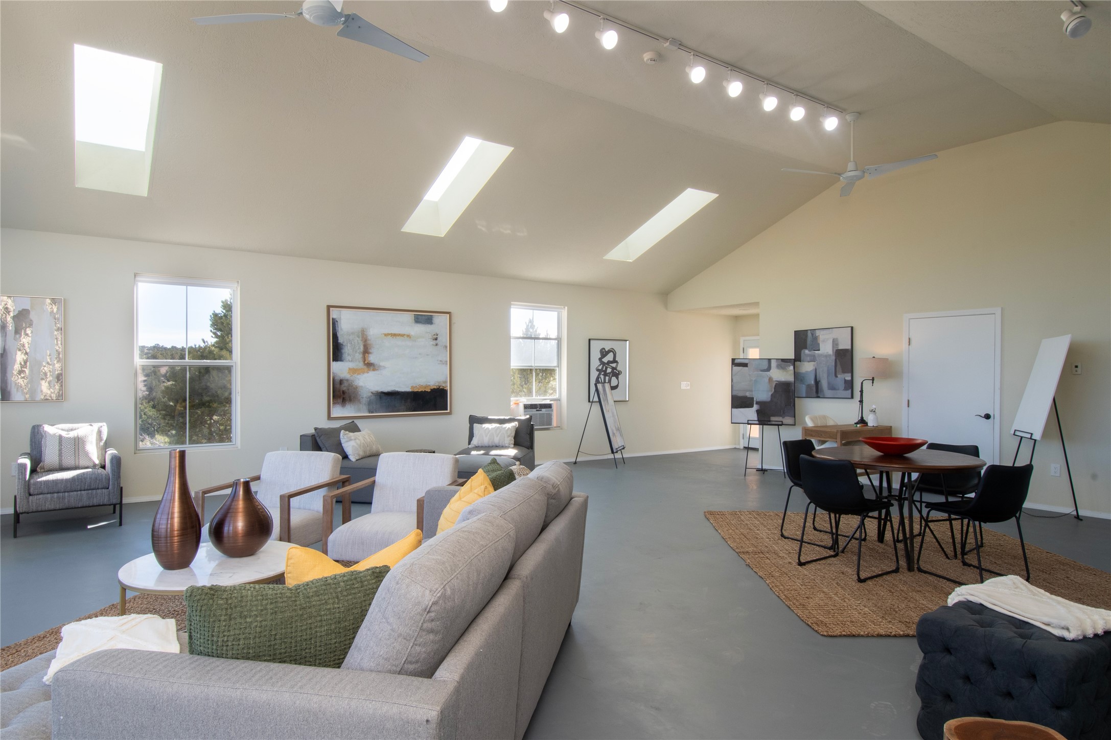 This Northern New Mexico home with detached studio & guest house sits on 13.879 acres in much-desired La Tierra Nueva. Architect, Ed Boniface and builder Tony Ivey's outstanding attention-to-detail is lovely inside and out. Single-level with some interior steps, the 3,288 sq. ft. main home features 2 bedrooms, 4 baths, and a portal running the full length of the front of the house, with expansive mountain views.Brick floors with radiant heating run throughout the home, and wooden vigas reach high into the pitched ceiling creating an inviting openness. A entry hall is open to the living room with its built-in cabinets and shelves, french doors, and a modern fireplace. Visually pleasing, this home has a subtle blending of traditional with a hint of contemporary, making it feel comfortable and original. State-of-the-art appliances and plenty of cabinet and counter space the kitchen features a built-in island with sink and can easily accommodate informal dining. The dining room and kitchen are adjacent to the living room and all have access to the dining portal. A mud room/laundry room and are to the right of the kitchen and lead to the attached 2-car garage. The other wing, to the left of the living room, houses a office, an ensuite bedroom, a powder room and the master suite with fireplace, walk-in closet and an over-sized double shower.The 1,874 sq. ft. detached guest house is as beautiful as the main house. The pitched roof is highlighted inside by wooden beams, making everything feel open and spacious. The guest house has a living room, 2 bedrooms, a full bath, and a portal for enjoying the view.A standalone 1,244 sq. ft. studio with 260 sq. ft. storage loft has huge windows, skylights and tall ceilings, and a big open space for various creative pursuits! This space could also be used for a wood shop, office, meditation room... or even a gym or weight room.This is truly a unique property offering privacy and quiet... and lots of versatility! This is a don't miss.