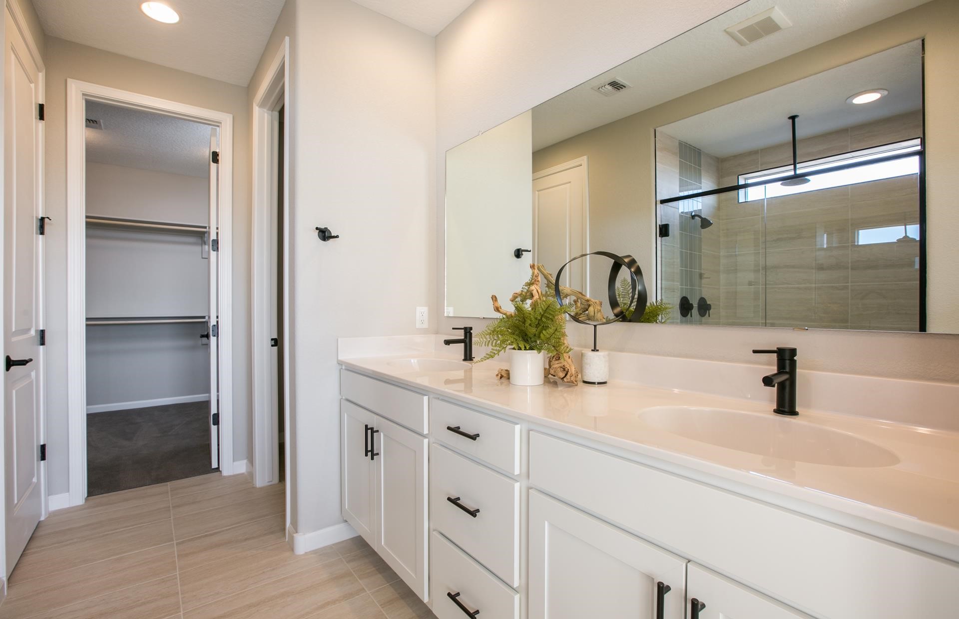 This "Tifton Walk" home layout features a long entry way with the secondary bedrooms in the front of the home and the owner's suite in the back. A full two car garage with a garage hobby package that includes additional outlets and fluorescent lights, and a garage service door that connects to the backyard. This home is located on a private home site and includes an extended covered patio that makes enjoying the outdoors even better! The owner's suite features a bay window, a door separating the bedroom and bathroom, large walk-in closet, double sink vanity, and a separate freestanding white tub with a walk-in shower. The kitchen will have white cabinets with quartz countertops and upgraded grey tile flooring. This upgraded chef kitchen package includes a built-in gas cooktop, hood vent, built in microwave and oven. The kitchen island is a spacious and multifunctional space with plenty of room to enjoy! This home is in the Pulte Homes community Colibri that has easy access to HWY 599 and I25. Colibri features community parks, walking trails, and beautifully landscaped common areas maintained by the HOA