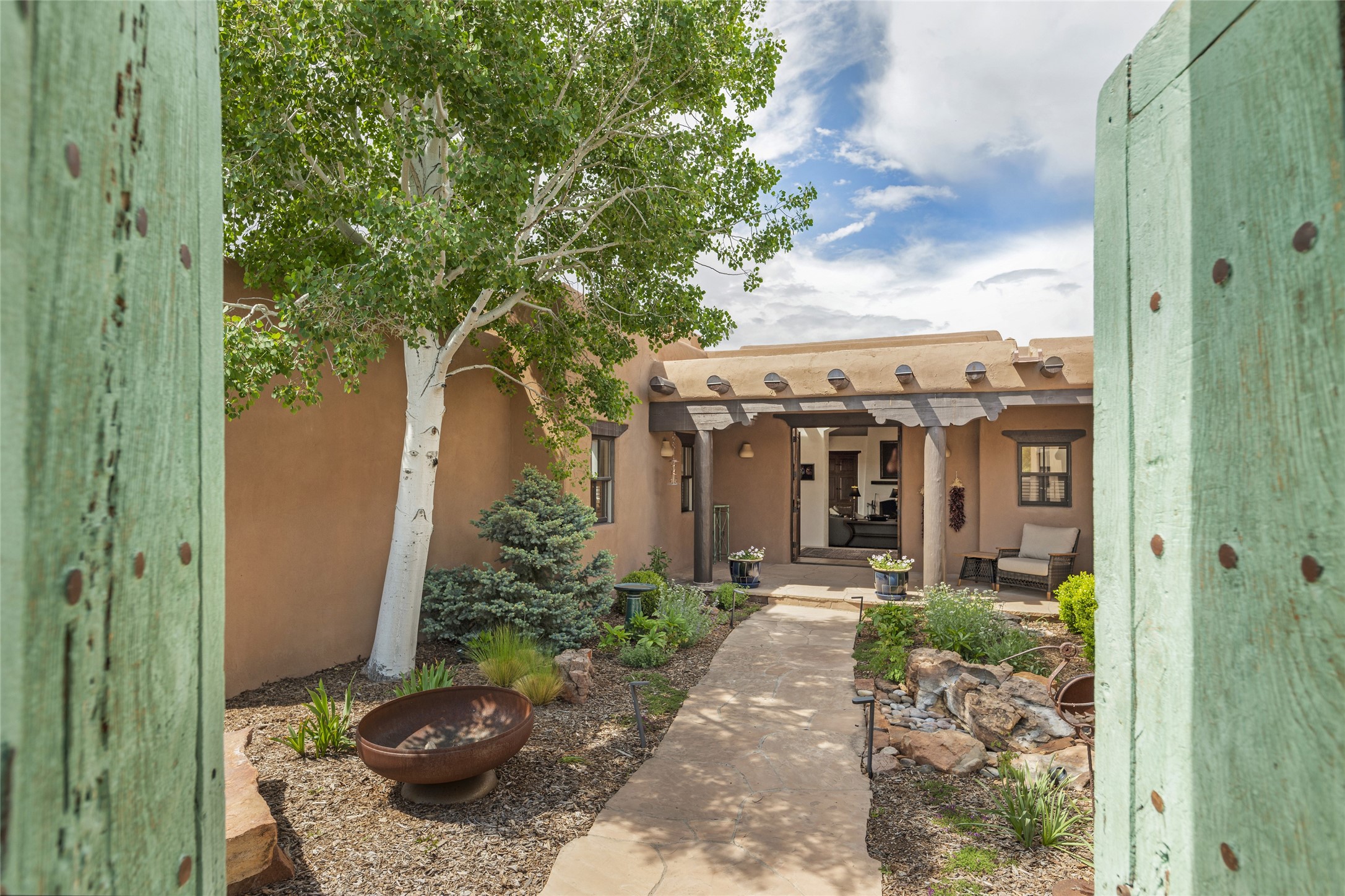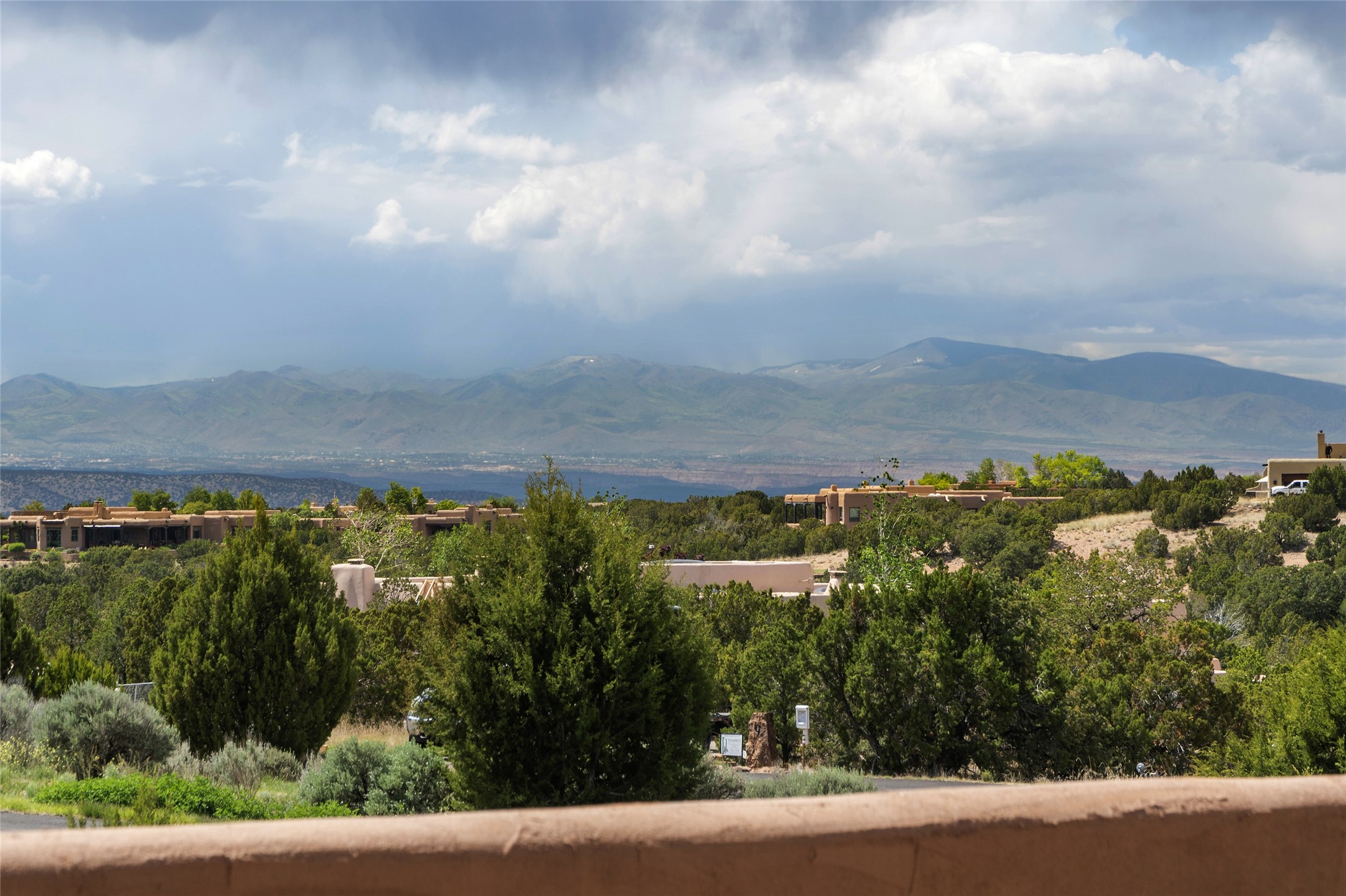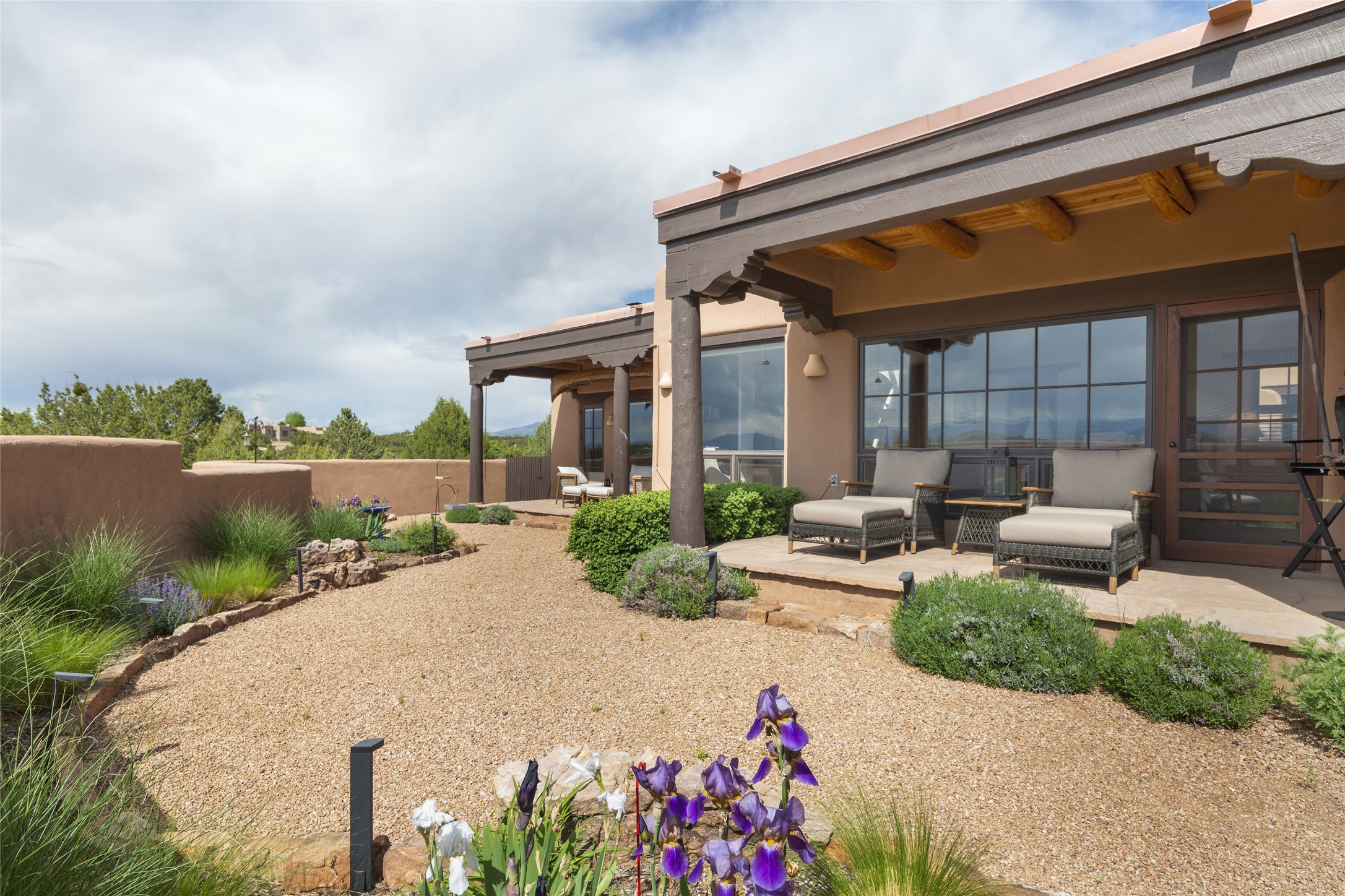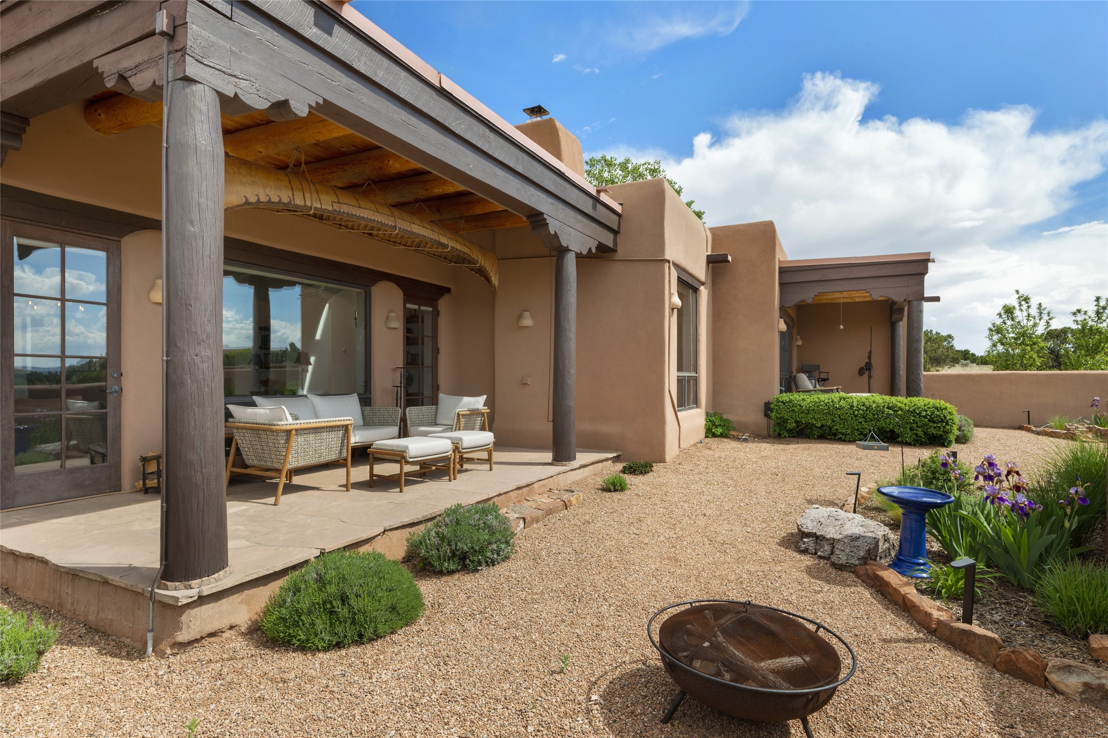MOUNTAIN VIEWS EAST AND WEST! Welcome to your jewel box of a home in the exclusive Las Campanas community of Santa Fe. This stunning 3 bedroom, 3.5 bathroom single level home on an elevated lot offers unparalleled views of the majestic Sangre de Cristo & Jemez mountains, and the serene high desert landscape. A spacious and elegant floor plan, featuring plaster walls, high ceilings, abundant natural light, and a cook's kitchen with stone and quartz countertops, stainless steel appliances, plus sunny breakfast nook. The formal dining area is perfect for hosting family and friends, while the cozy living room boasts a fireplace and a wall of windows that showcase the breathtaking scenery. The owner's suite is a true retreat, with a walk-in closet, a spa-like bathroom, and a private portal where you can relax and enjoy the sunsets. The other two bedrooms are also generous in size and feature views and en-suite bathrooms. The outdoor living space is equally impressive, with three portals and courtyards that offer different perspectives of the stunning surroundings. The backyard is beautifully landscaped with native plants and flowers and has plenty of room for entertaining or gardening. This home is located in a core location in the coveted Las Campanas subdivision, which offers 24-hour security for homeowners, and offers private club members amenities such as golf, tennis, fitness center, spa, equestrian center, and fine dining. You will also appreciate the proximity to downtown Santa Fe, where you can explore the rich culture, history, and art of the City Different. This home is a rare opportunity to own a piece of paradise in one of the most desirable locations in New Mexico. Easy lock and leave. Don't miss this chance to make it yours!