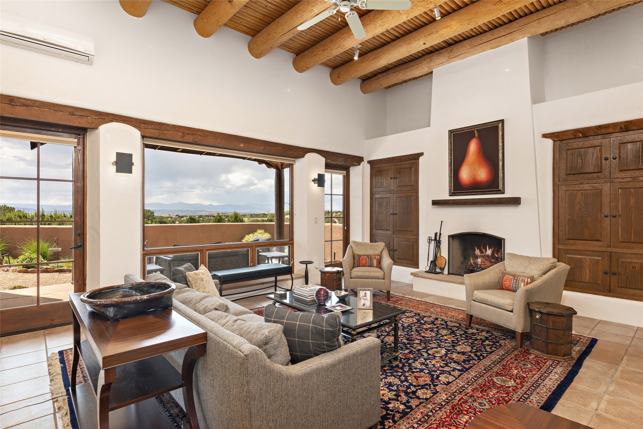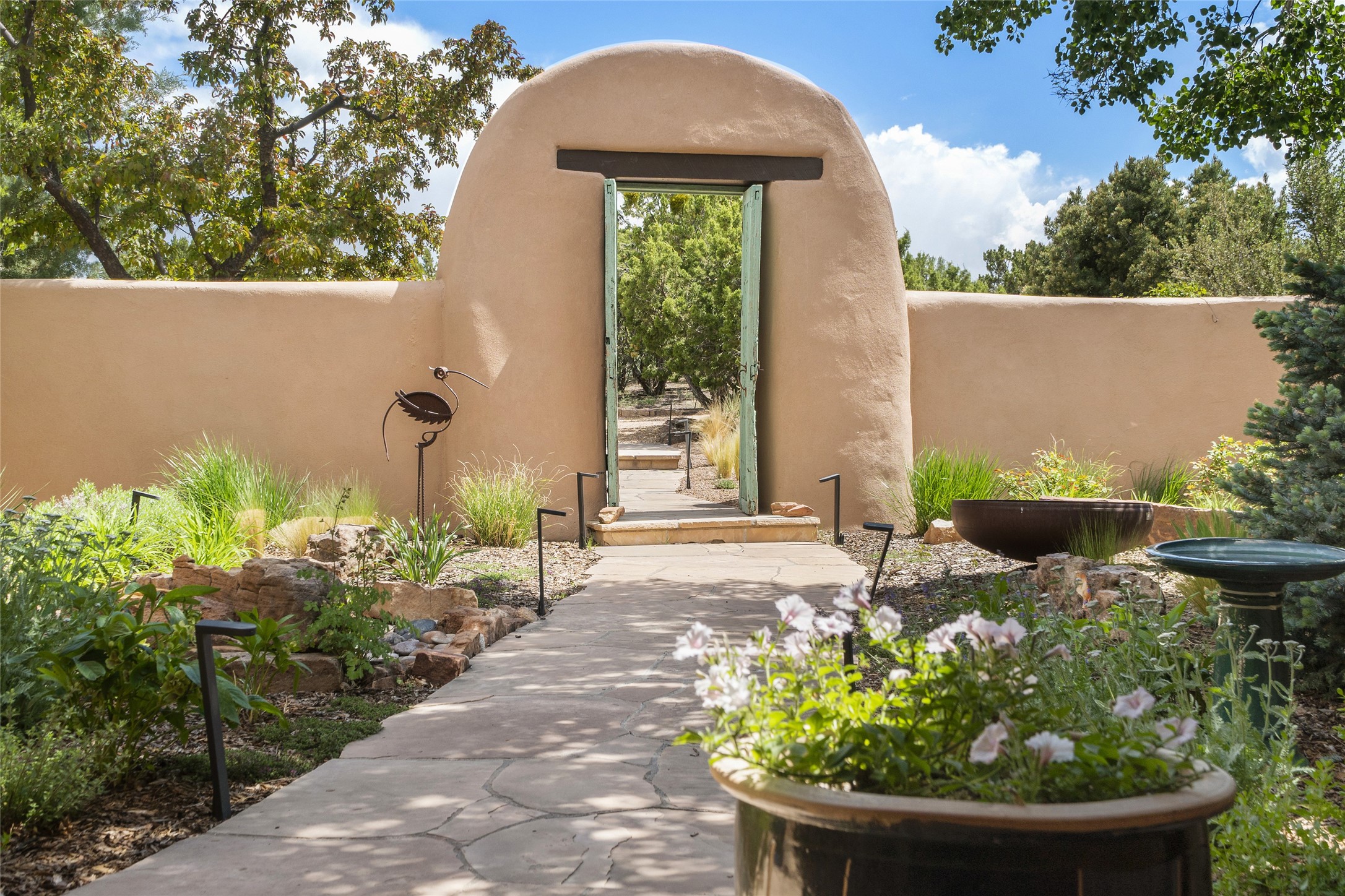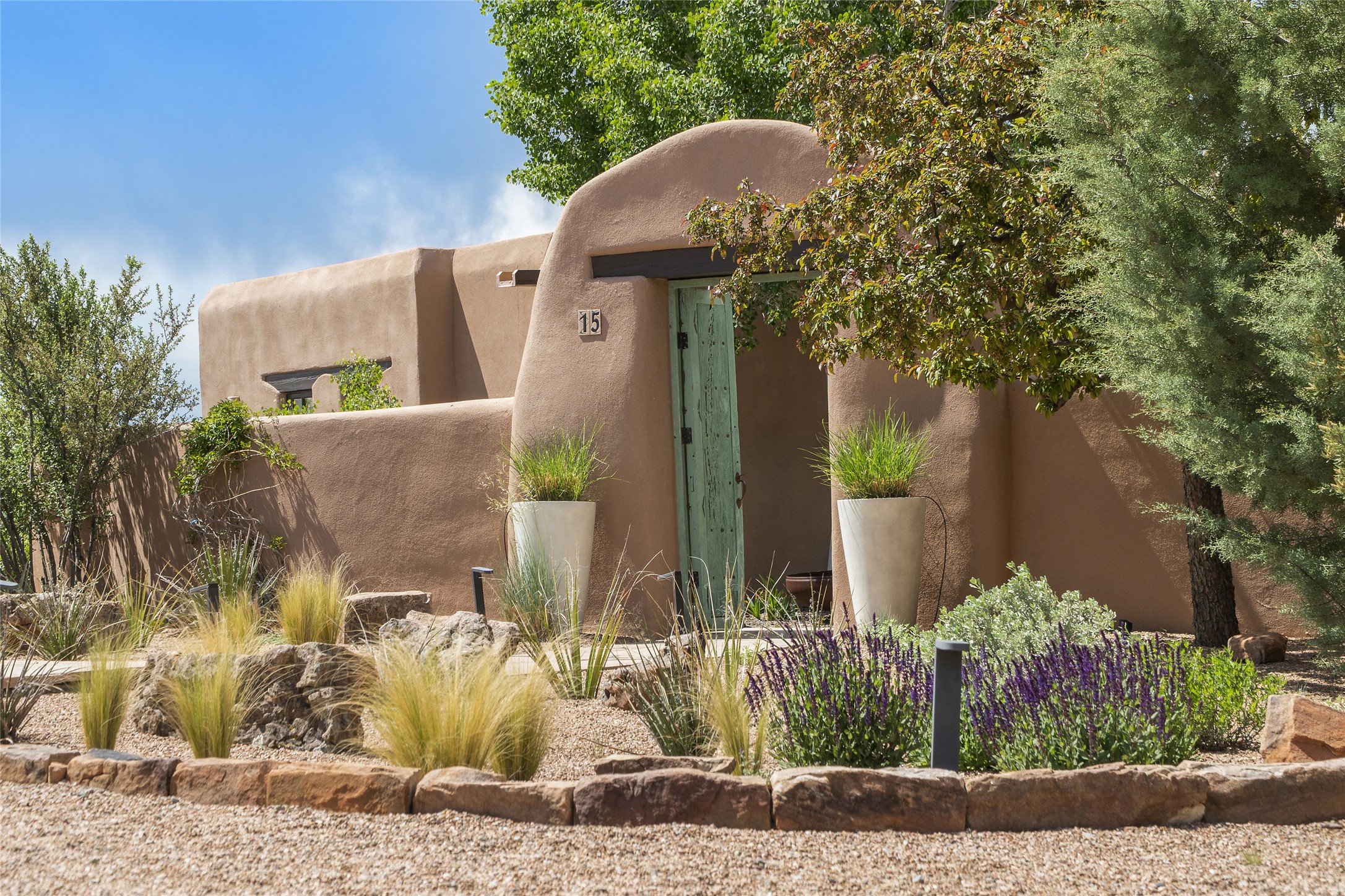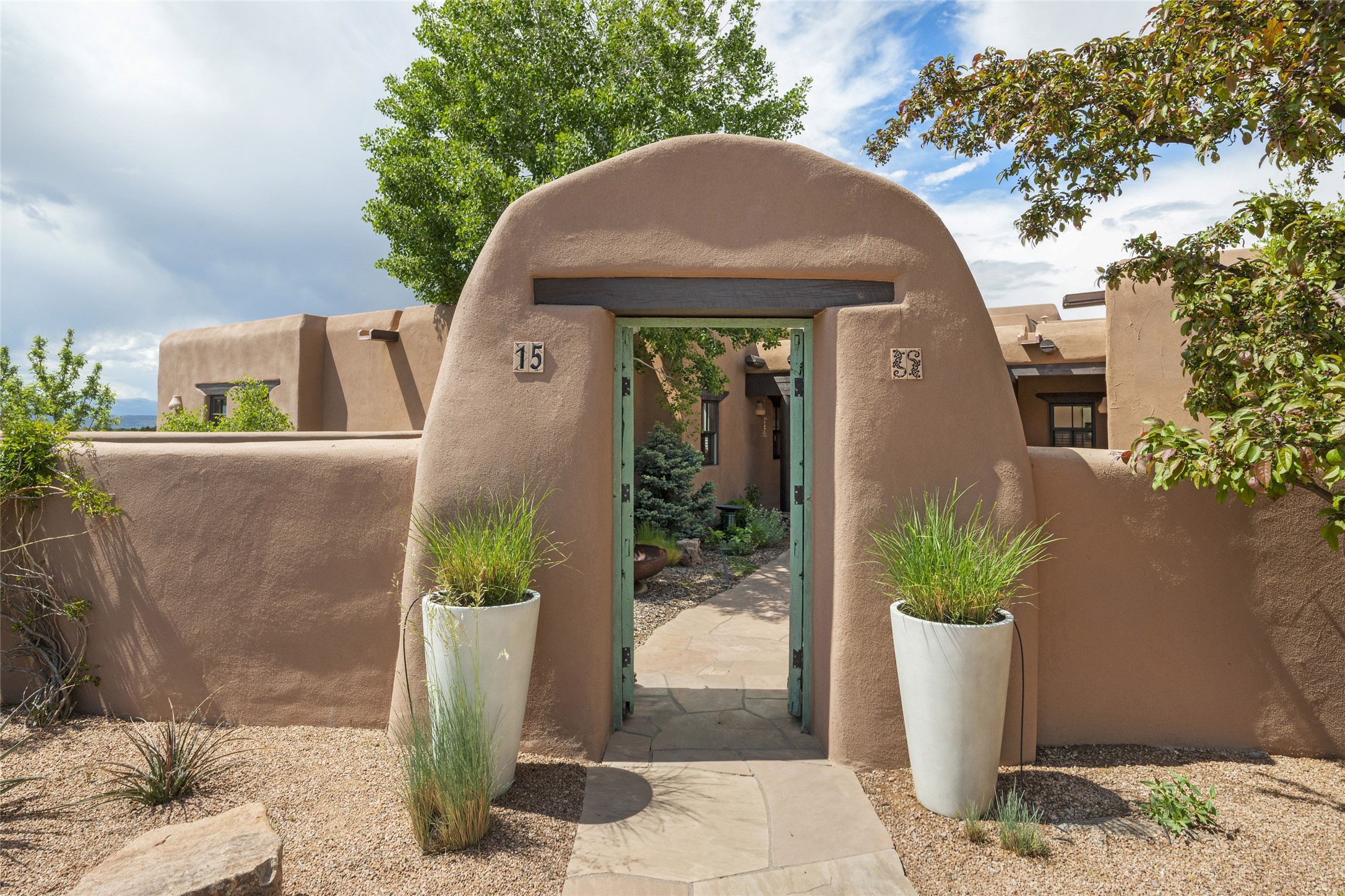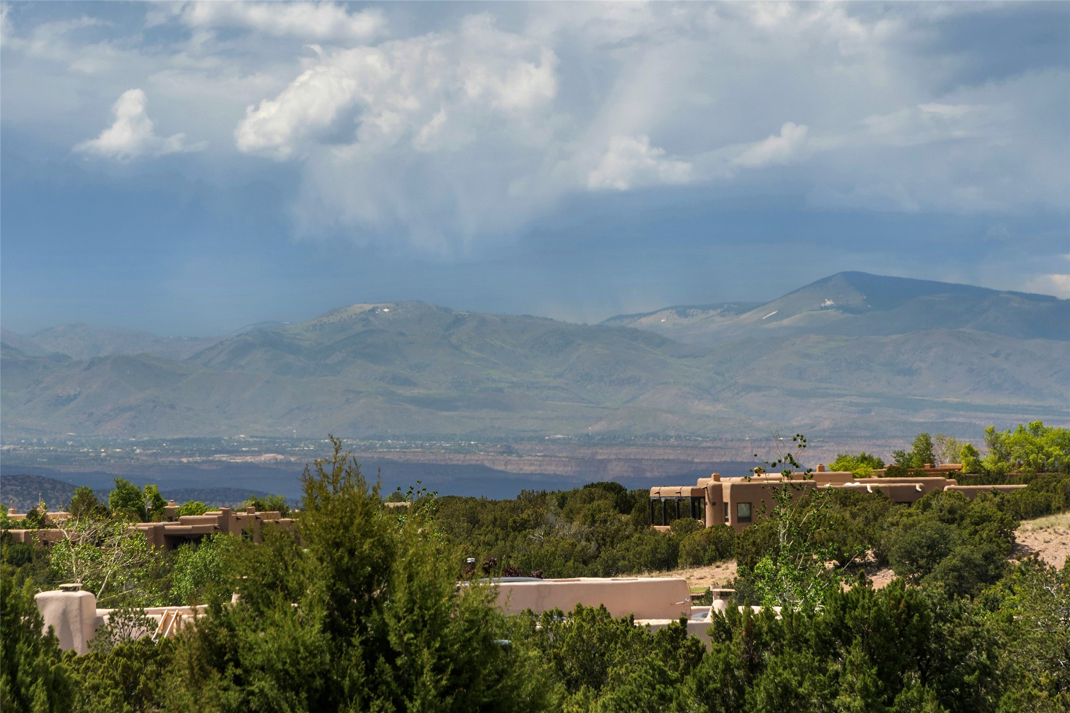 MOUNTAIN VIEWS EAST AND WEST! Welcome to your jewel box of a home in the exclusive Las Campanas community of Santa Fe. This stunning 3 bedroom, 3.5 bathroom single level home on an elevated lot offers unparalleled views of the majestic Sangre de Cristo & Jemez mountains, and the serene high desert landscape. A spacious and elegant floor plan, featuring plaster walls, high ceilings, abundant natural light, and a cook's kitchen with stone and quartz countertops, stainless steel appliances, plus sunny breakfast nook. The formal dining area is perfect for hosting family and friends, while the cozy living room boasts a fireplace and a wall of windows that showcase the breathtaking scenery. The owner's suite is a true retreat, with a walk-in closet, a spa-like bathroom, and a private portal where you can relax and enjoy the sunsets. The other two bedrooms are also generous in size and feature views and en-suite bathrooms. The outdoor living space is equally impressive, with three portals and courtyards that offer different perspectives of the stunning surroundings. The backyard is beautifully landscaped with native plants and flowers and has plenty of room for entertaining or gardening. This home is located in a core location in the coveted Las Campanas subdivision, which offers 24-hour security for homeowners, and offers private club members amenities such as golf, tennis, fitness center, spa, equestrian center, and fine dining. You will also appreciate the proximity to downtown Santa Fe, where you can explore the rich culture, history, and art of the City Different. This home is a rare opportunity to own a piece of paradise in one of the most desirable locations in New Mexico. Easy lock and leave. Don't miss this chance to make it yours!